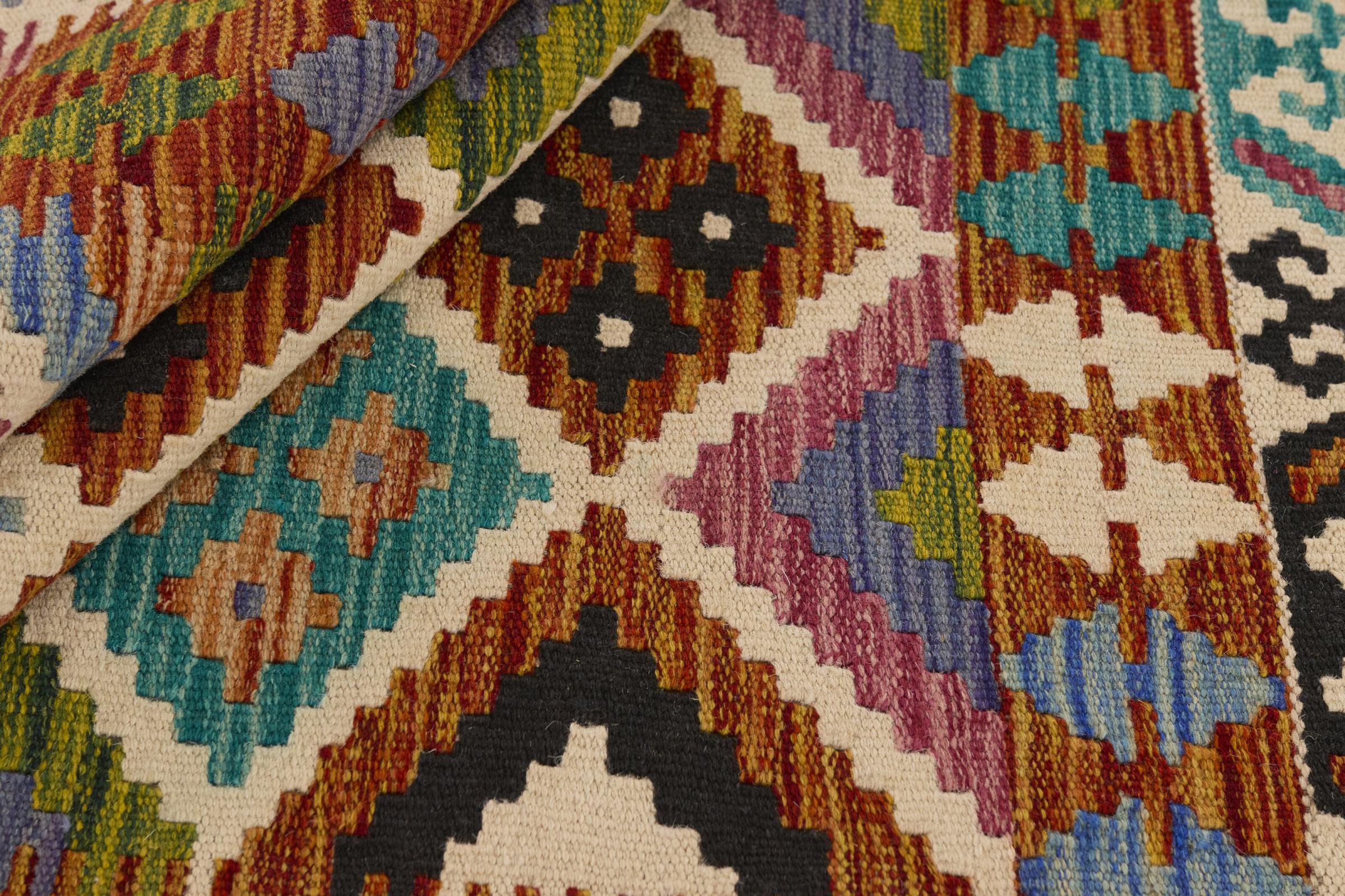 Denne håndvævede afghanske kelim er smuk takket være dens mangefacetterede farver og typiske mønster. Det er vævet i hånden i Afghanistan af 100 % fåreuld. Det er derfor uden tvivl mere robust og holdbart end maskinproducerede tæpper. Denne kelim har også sin helt egen karakter. Et unikt stykke til dig og dit hjem, som du ikke finder igen på præcis samme måde.