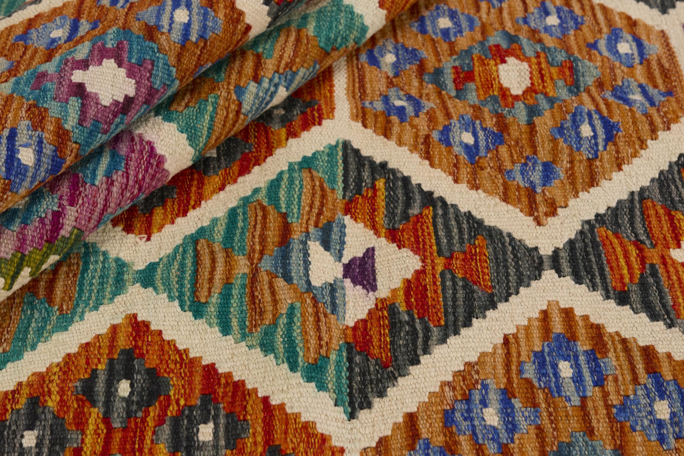 Denne håndvævede afghanske kelim er smuk takket være dens mangefacetterede farver og typiske mønster. Det er vævet i hånden i Afghanistan af 100 % fåreuld. Det er derfor uden tvivl mere robust og holdbart end maskinproducerede tæpper. Denne kelim har også sin helt egen karakter. Et unikt stykke til dig og dit hjem, som du ikke finder igen på præcis samme måde.