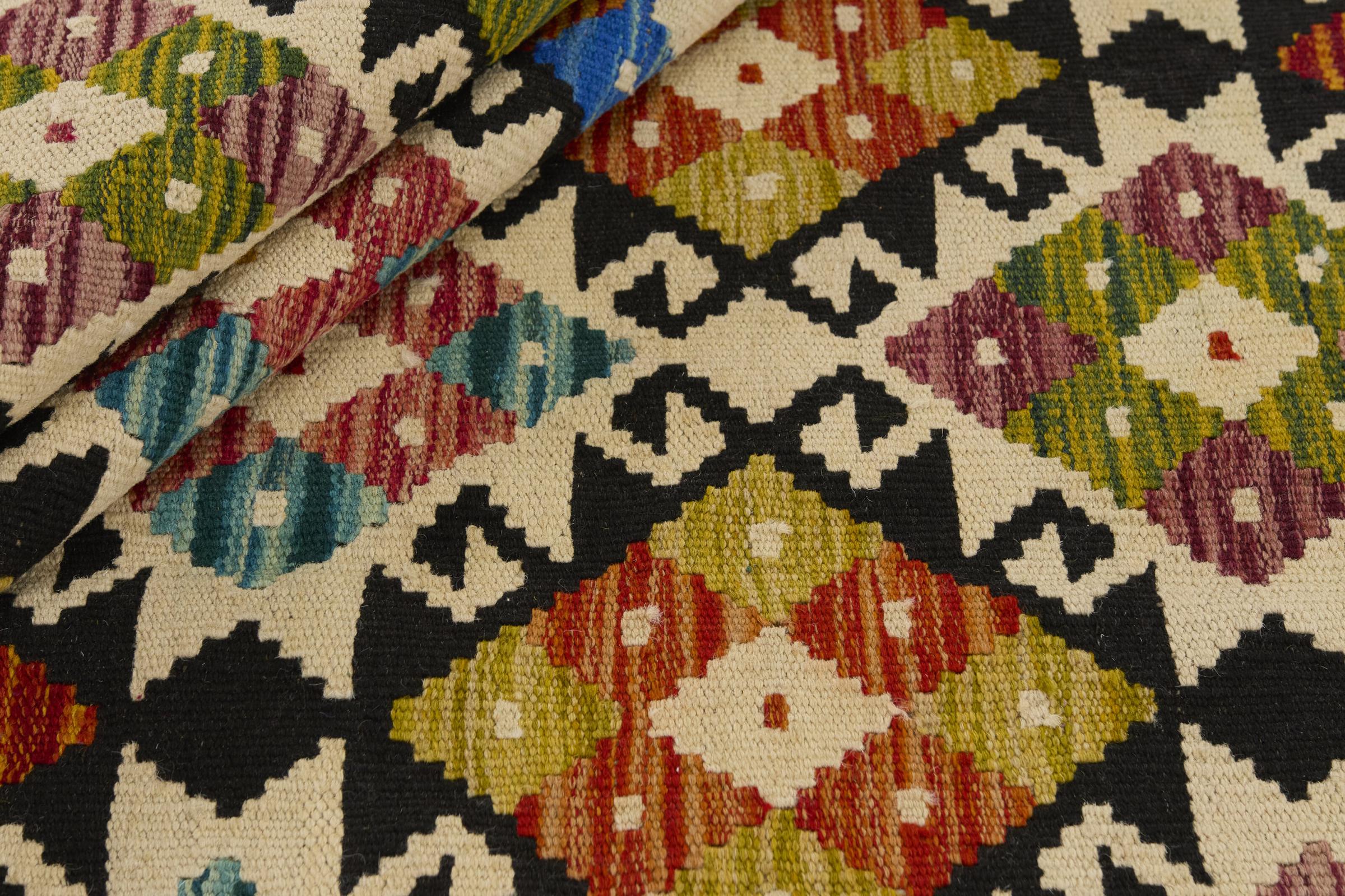 Denne håndvævede afghanske kelim er smuk takket være dens mangefacetterede farver og typiske mønster. Det er vævet i hånden i Afghanistan af 100 % fåreuld. Det er derfor uden tvivl mere robust og holdbart end maskinproducerede tæpper. Denne kelim har også sin helt egen karakter. Et unikt stykke til dig og dit hjem, som du ikke finder igen på præcis samme måde.