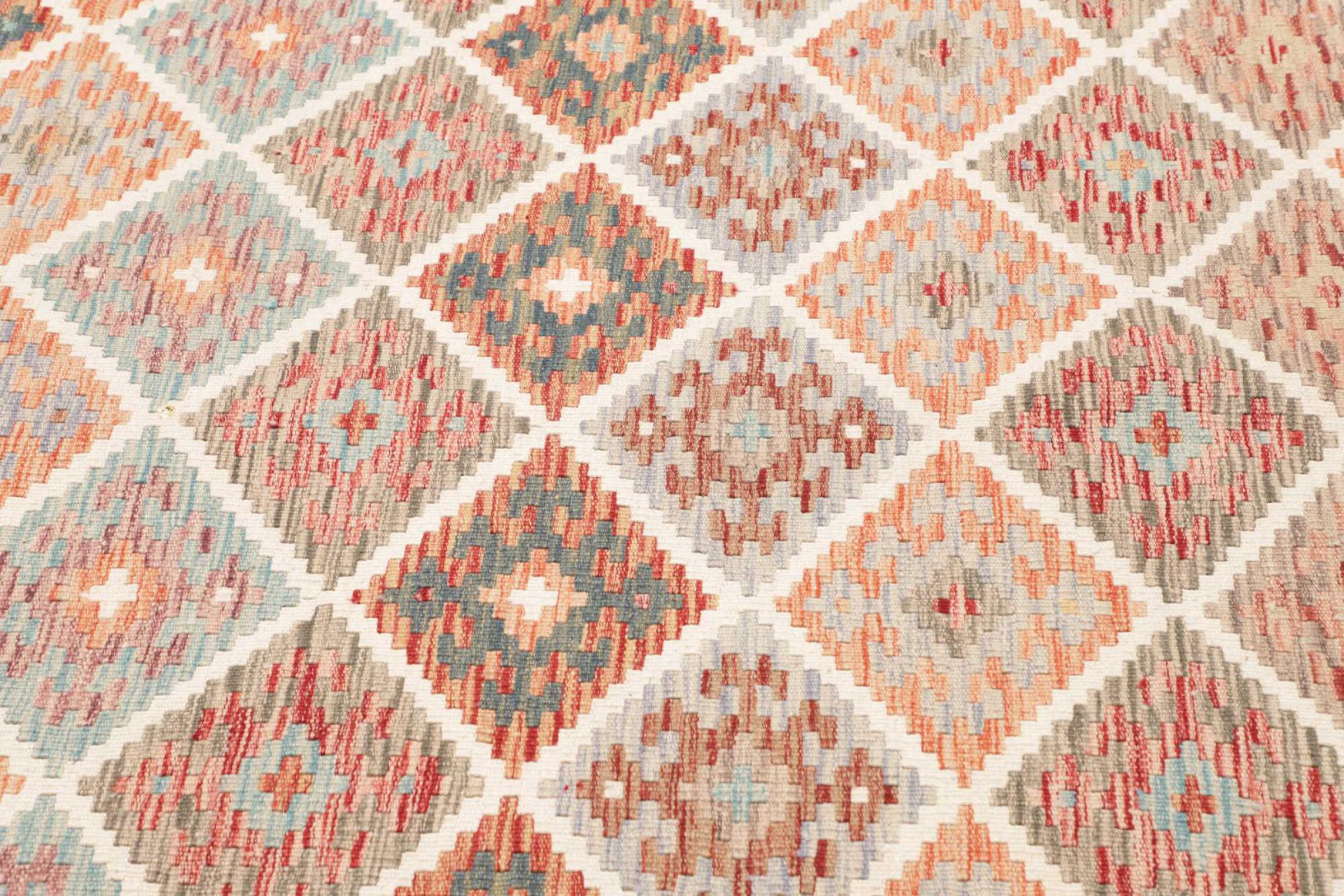 Denne håndvævede afghanske kelim er smuk takket være dens mangefacetterede farver og typiske mønster. Det er vævet i hånden i Afghanistan af 100 % fåreuld. Det er derfor uden tvivl mere robust og holdbart end maskinproducerede tæpper. Denne kelim har også sin helt egen karakter. Et unikt stykke til dig og dit hjem, som du ikke finder igen på præcis samme måde.