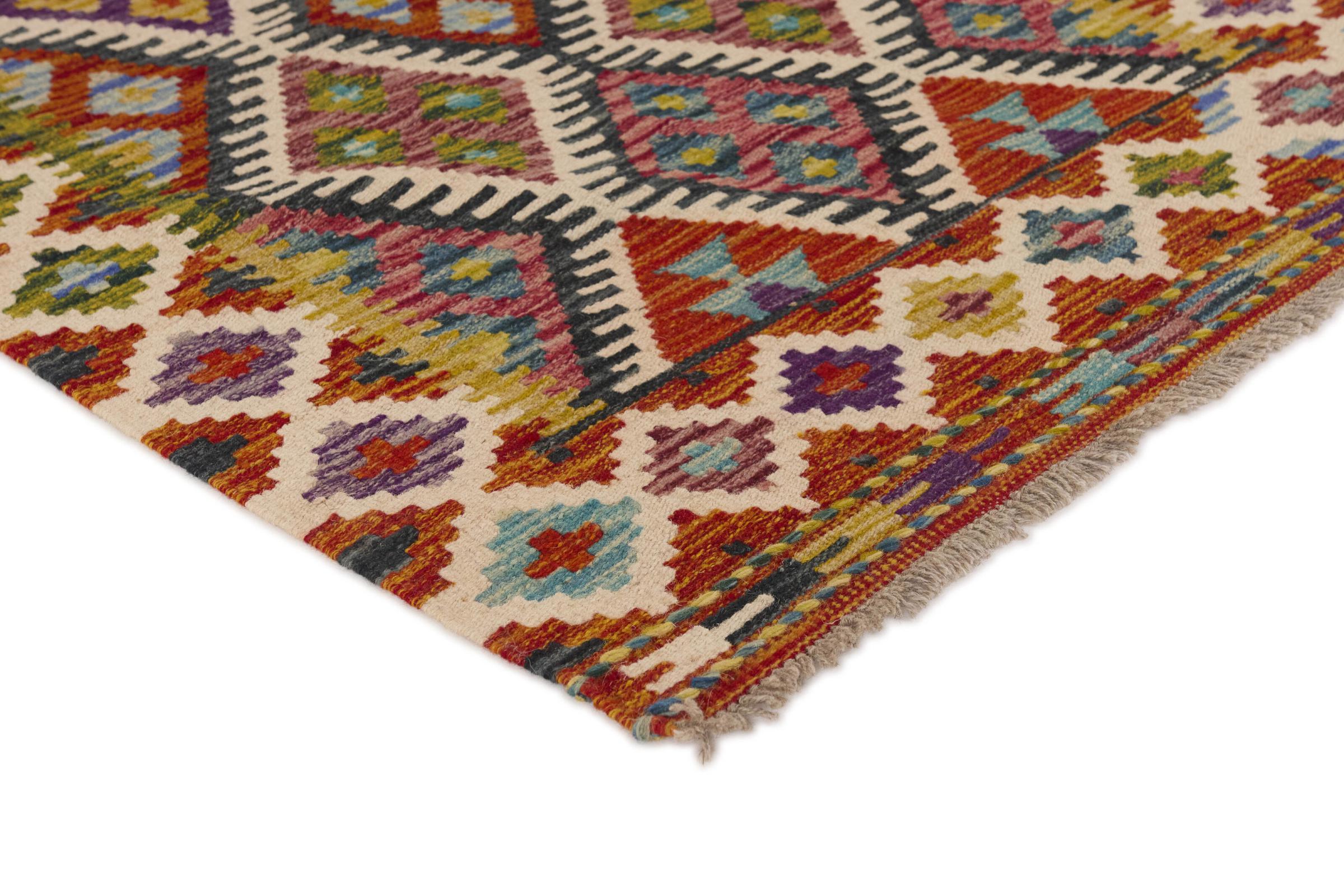 Denne håndvævede afghanske kelim er smuk takket være dens mangefacetterede farver og typiske mønster. Det er vævet i hånden i Afghanistan af 100 % fåreuld. Det er derfor uden tvivl mere robust og holdbart end maskinproducerede tæpper. Denne kelim har også sin helt egen karakter. Et unikt stykke til dig og dit hjem, som du ikke finder igen på præcis samme måde.