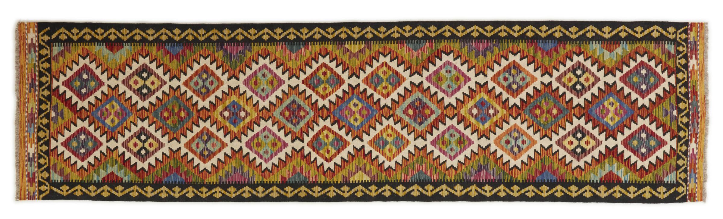 Denne håndvævede afghanske kelim er smuk takket være dens mangefacetterede farver og typiske mønster. Det er vævet i hånden i Afghanistan af 100 % fåreuld. Det er derfor uden tvivl mere robust og holdbart end maskinproducerede tæpper. Denne kelim har også sin helt egen karakter. Et unikt stykke til dig og dit hjem, som du ikke finder igen på præcis samme måde.