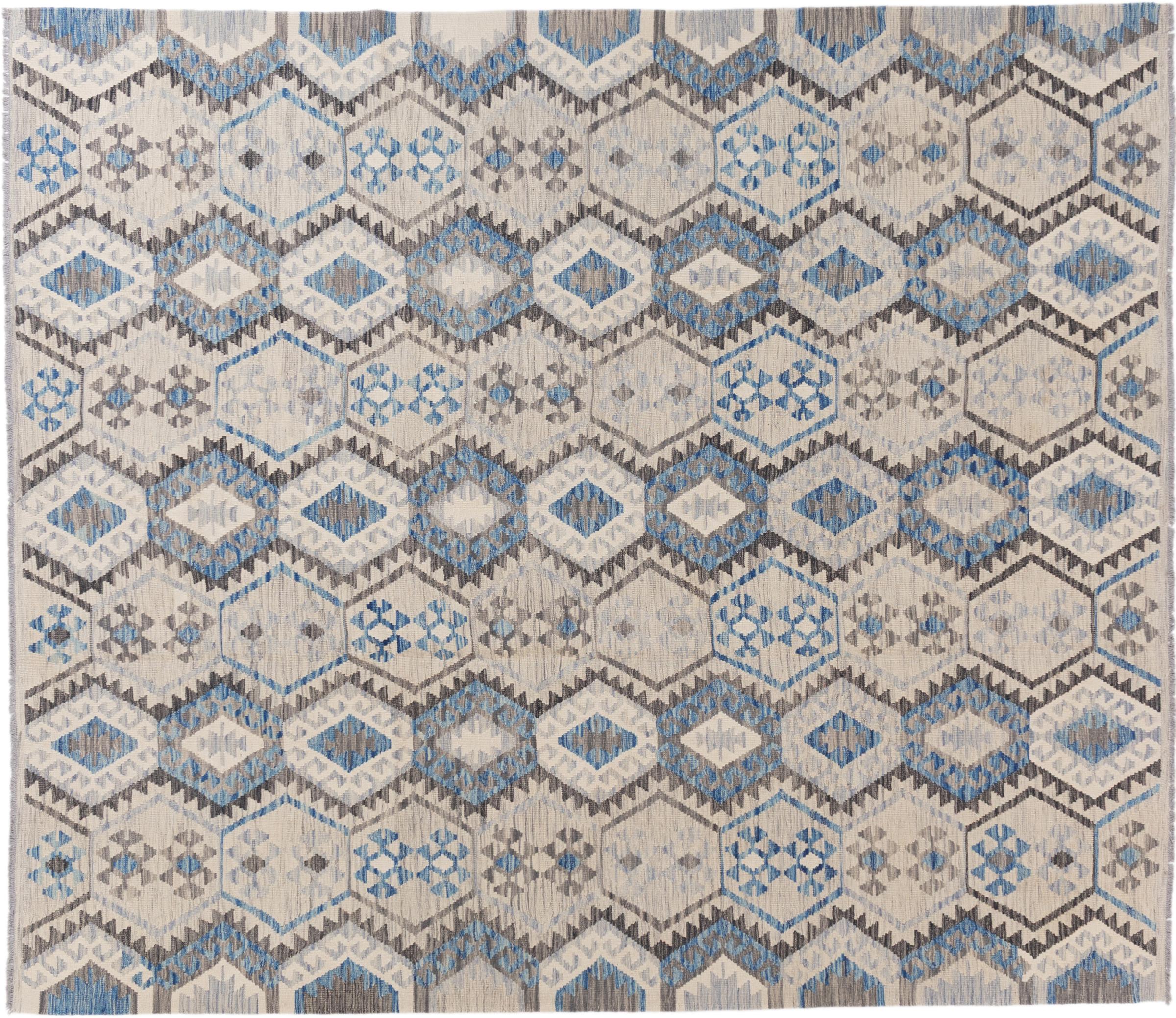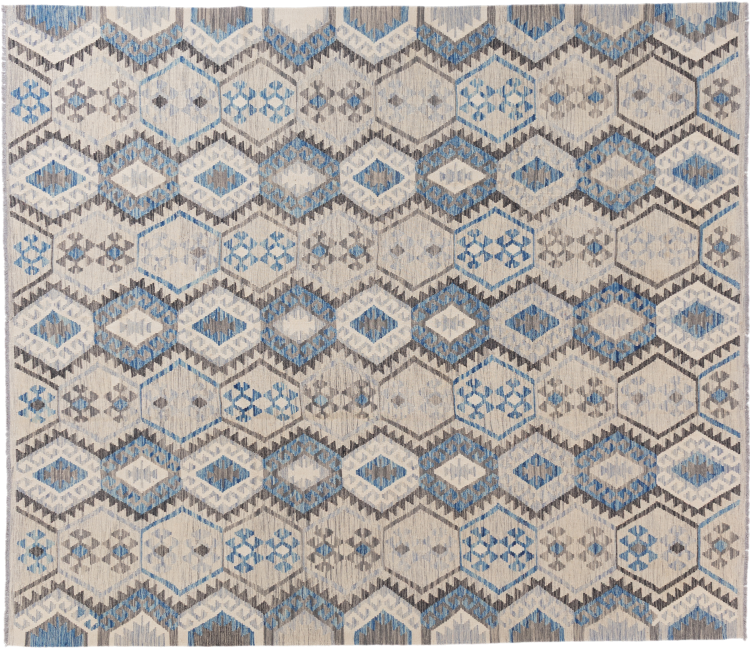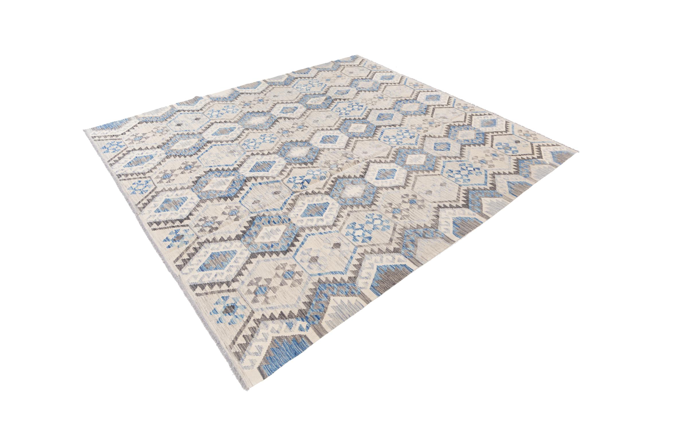 Tæppe-nr.: 2942500050370 Størrelse: 295x259 cm Tykkelse: ca. 3 mm Forarbejdelse: Håndvævet Luv: Håndspunden uld Kæde: Uld Oprindelse: Afghanistan Alder: Ny Vægt: ca. 11 kg Også kendt som Kilim, Qilim, Chilim, Afgan, Afghán Antal på lager: Unik - Kun 1 tilbage på lager