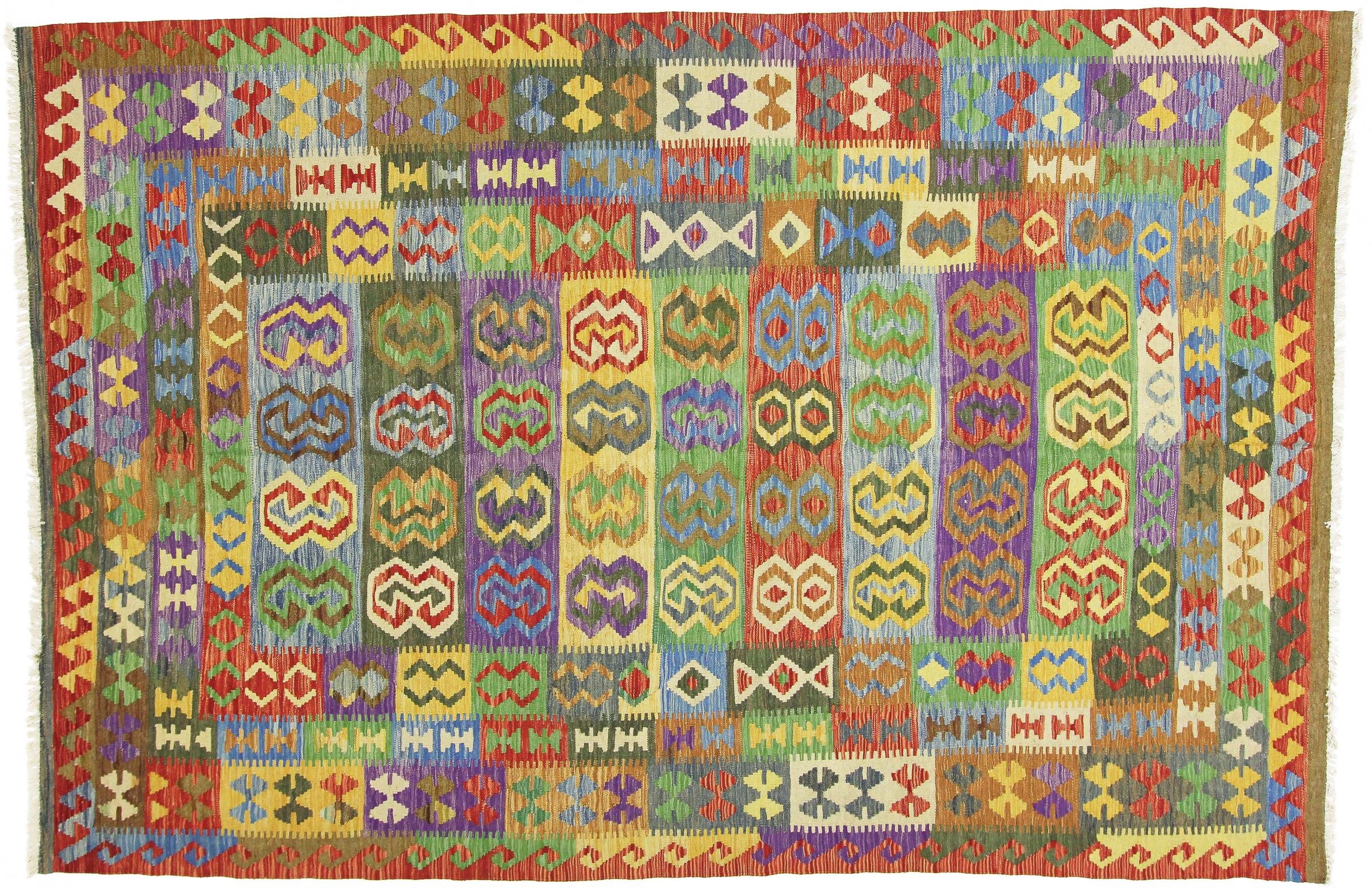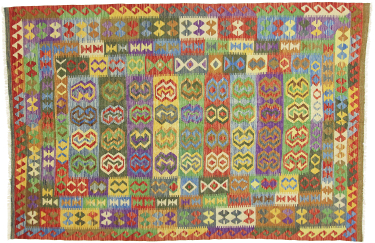 Tæppe-nr.: 73568002399716 Størrelse: 301x199 cm Tykkelse: ca. 3 mm Forarbejdelse: Håndvævet Luv: Uld Kæde: Uld Oprindelse: Afghanistan Alder: Ny Vægt: ca. 9 kg Også kendt som Kilim, Qilim, Chilim, Afgan, Afghán Antal på lager: Unik