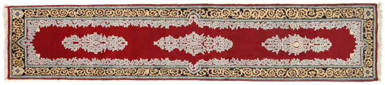 Tæppe-nr.: 16790300422542 Størrelse: 397x91 cm Tykkelse: ca. 12 mm Knuder: 128 000 - 160 000 / m² Forarbejdelse: Knyttet i hånden Luv: Håndspunden uld Kæde: Bomuld Oprindelse: Persien / Iran Alder: Ny Vægt: ca. 13 kg Antal på lager: Unik - Kun 1 tilbage på lager