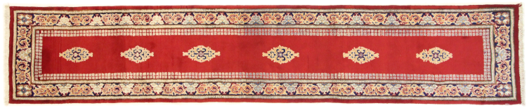 Tæppe-nr.: 167921002176399 Størrelse: 402x82 cm Tykkelse: ca. 12 mm Knuder: 128 000 - 160 000 / m² Forarbejdelse: Knyttet i hånden Luv: Håndspunden uld Kæde: Bomuld Oprindelse: Persien / Iran Alder: Ny Vægt: ca. 12 kg Antal på lager: Unik - Kun 1 tilbage på lager