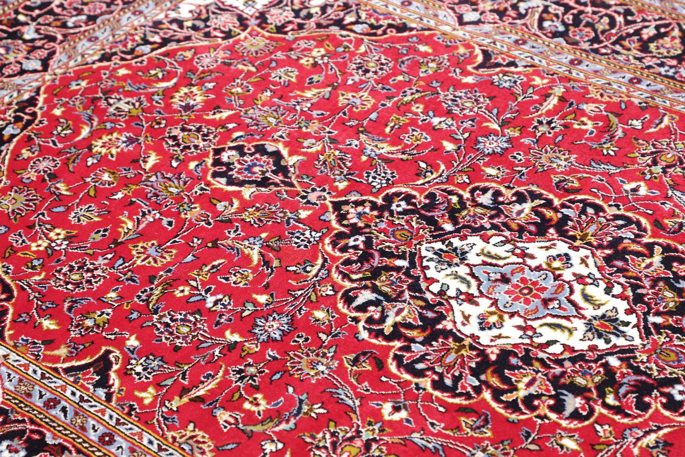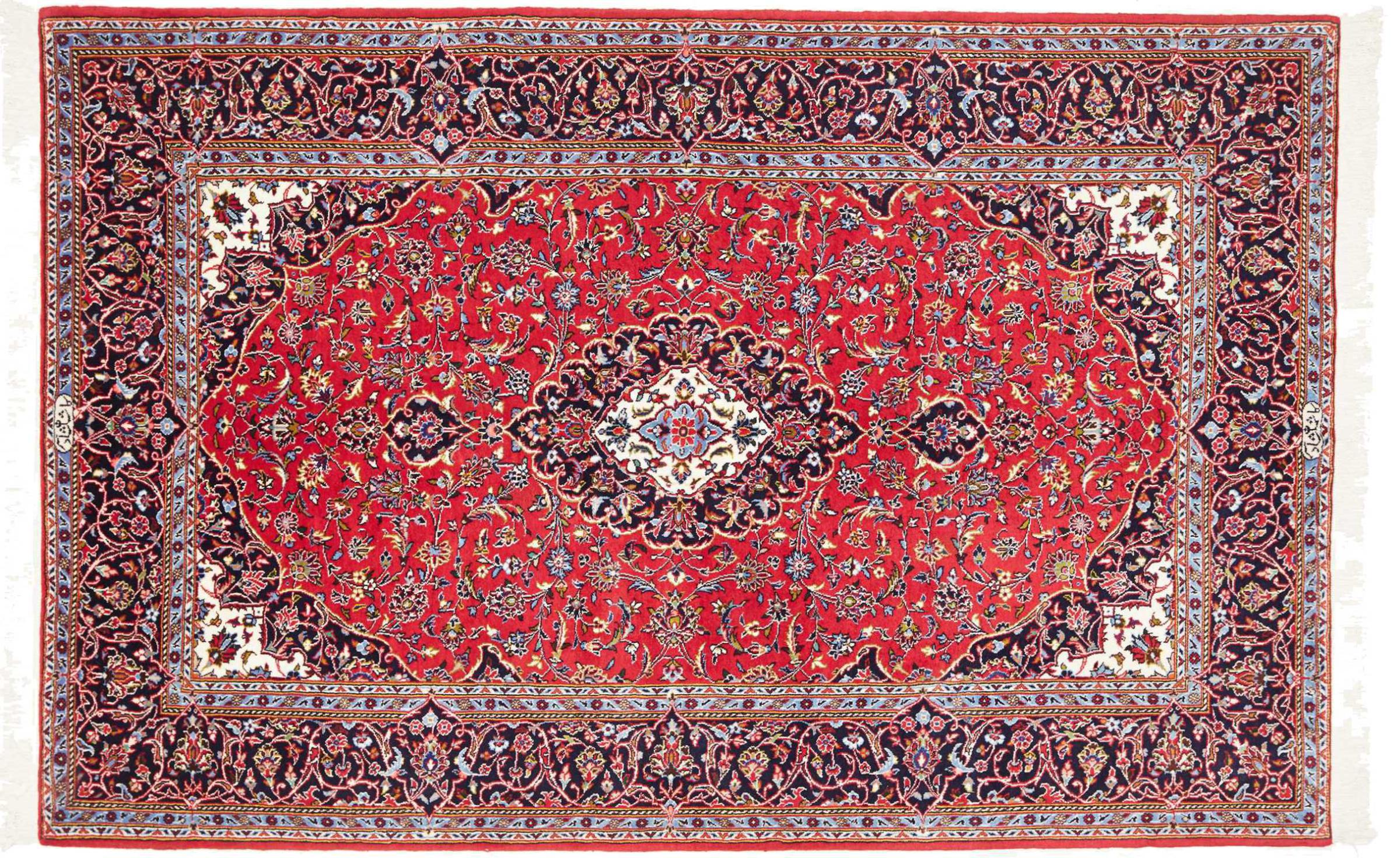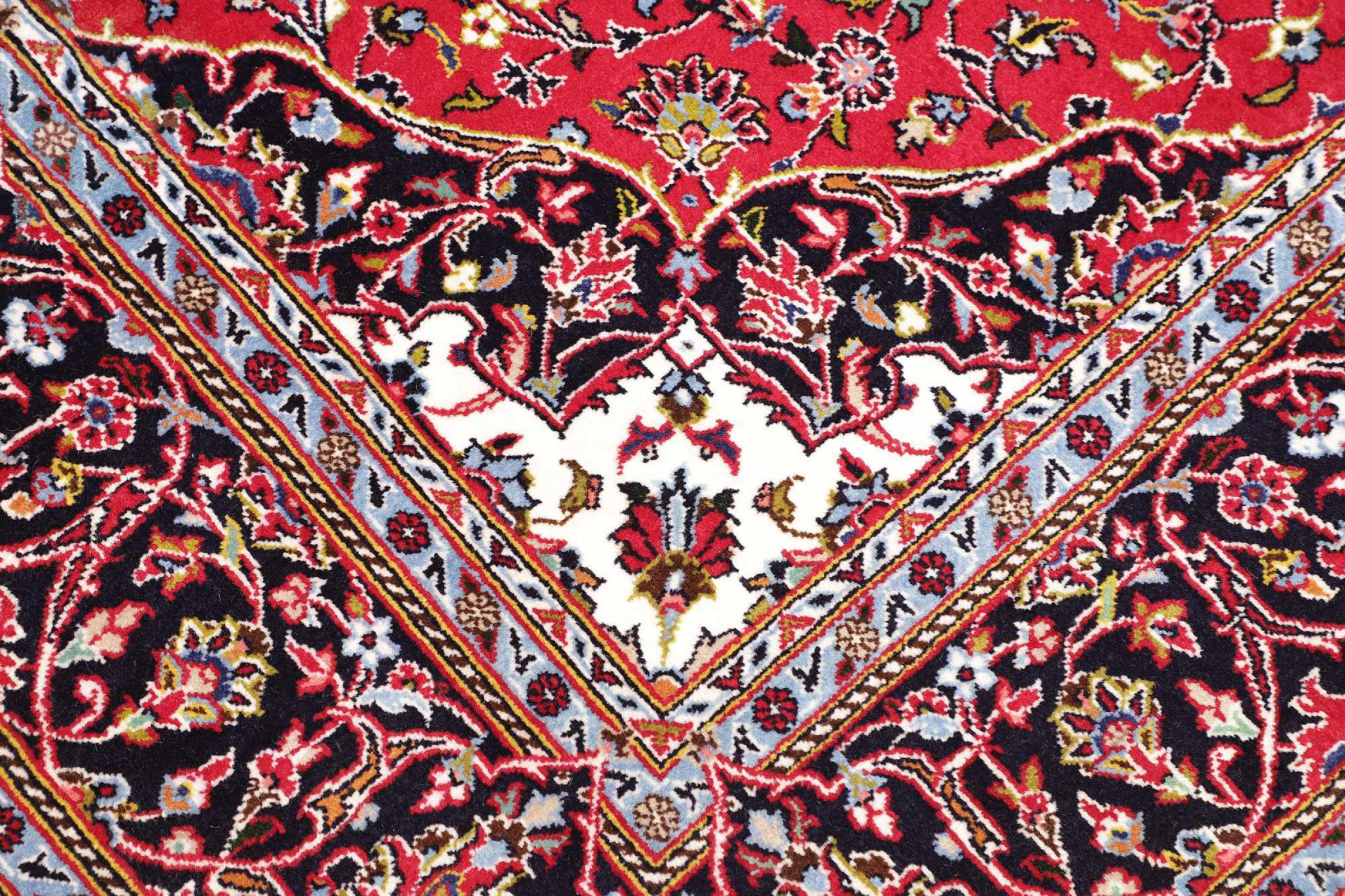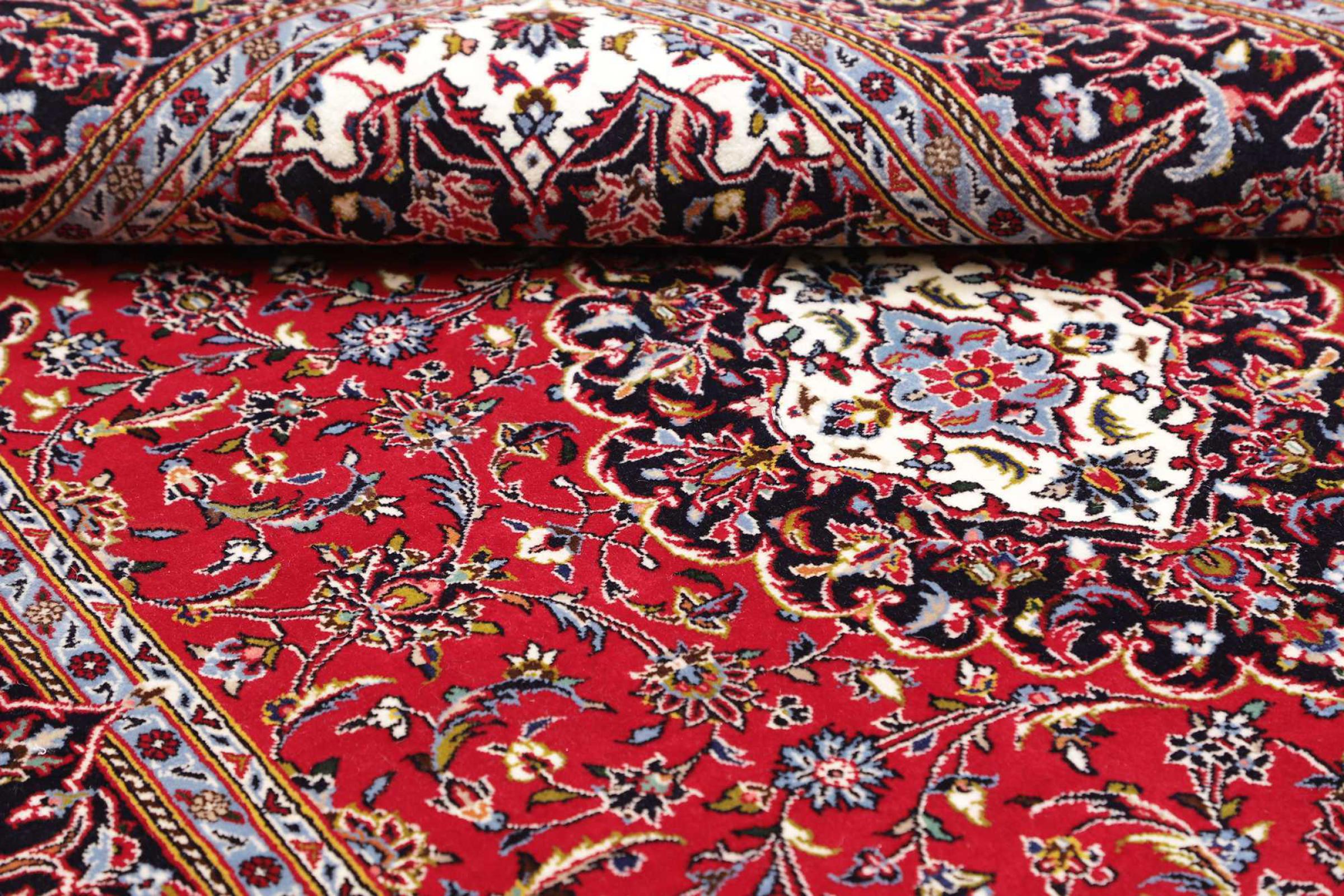 Dette tæppe fra Kashan (Keshan) er holdt i sit meget traditionelle og typiske persiske design med smukke ornamenter. Kashan tæpper er meget populære på grund af deres usædvanligt elegante design. Disse tæpper stammer fra Kashan, en by på den gamle Silkevej. Dette tæppe er blevet knyttet i hånden af højkvalitets fåreuld og vil være et unikt højdepunkt i dit hjem.
