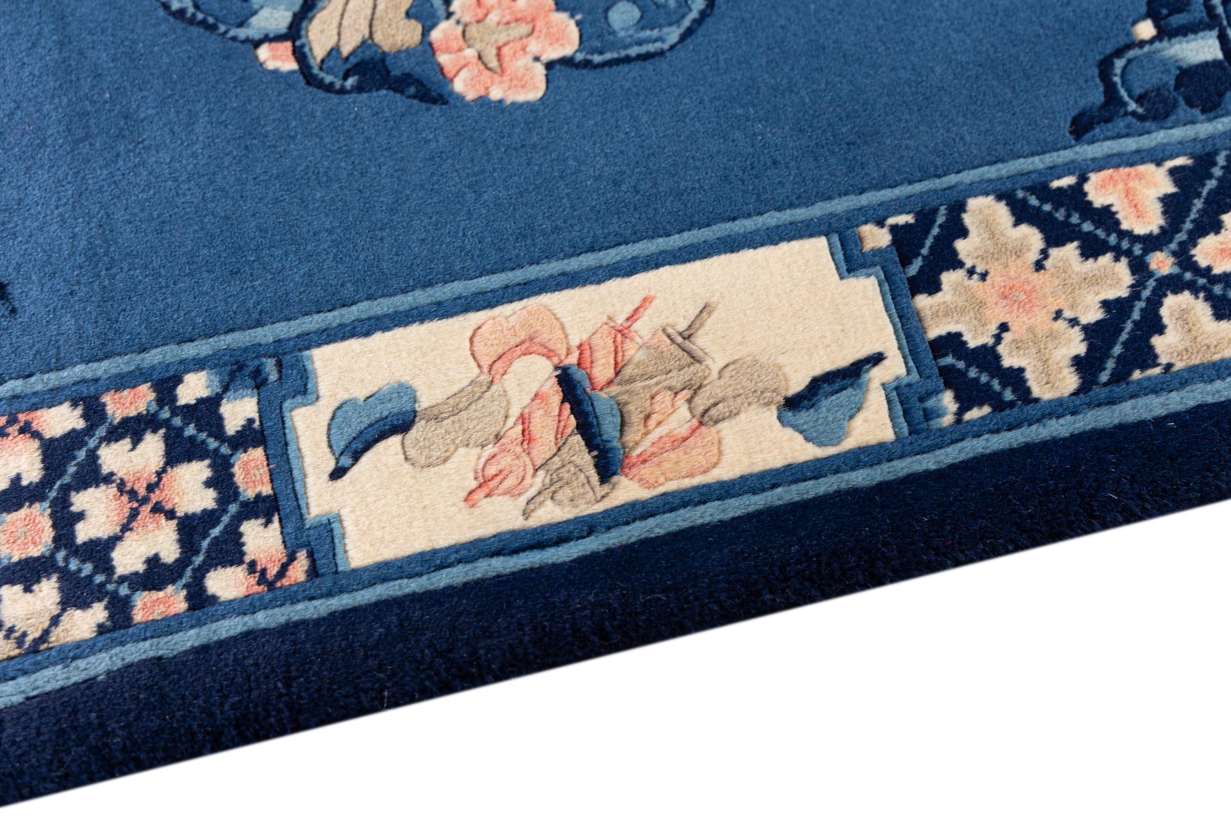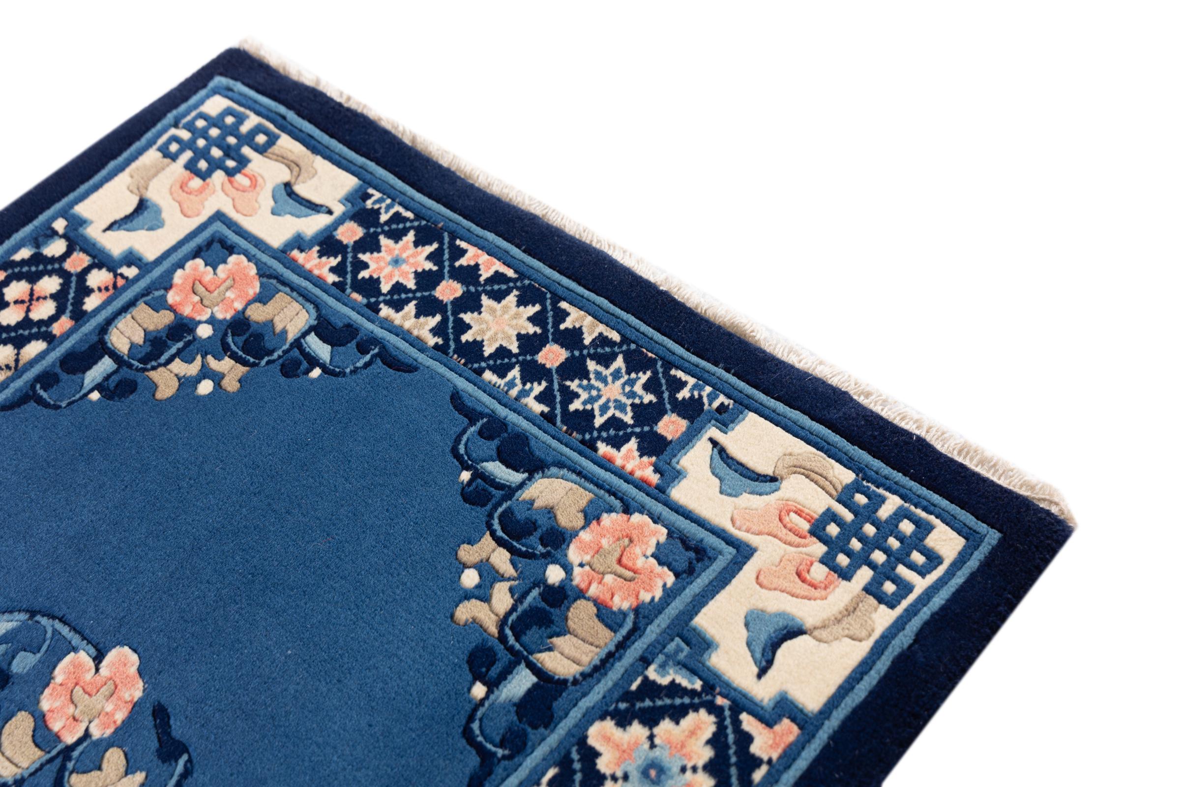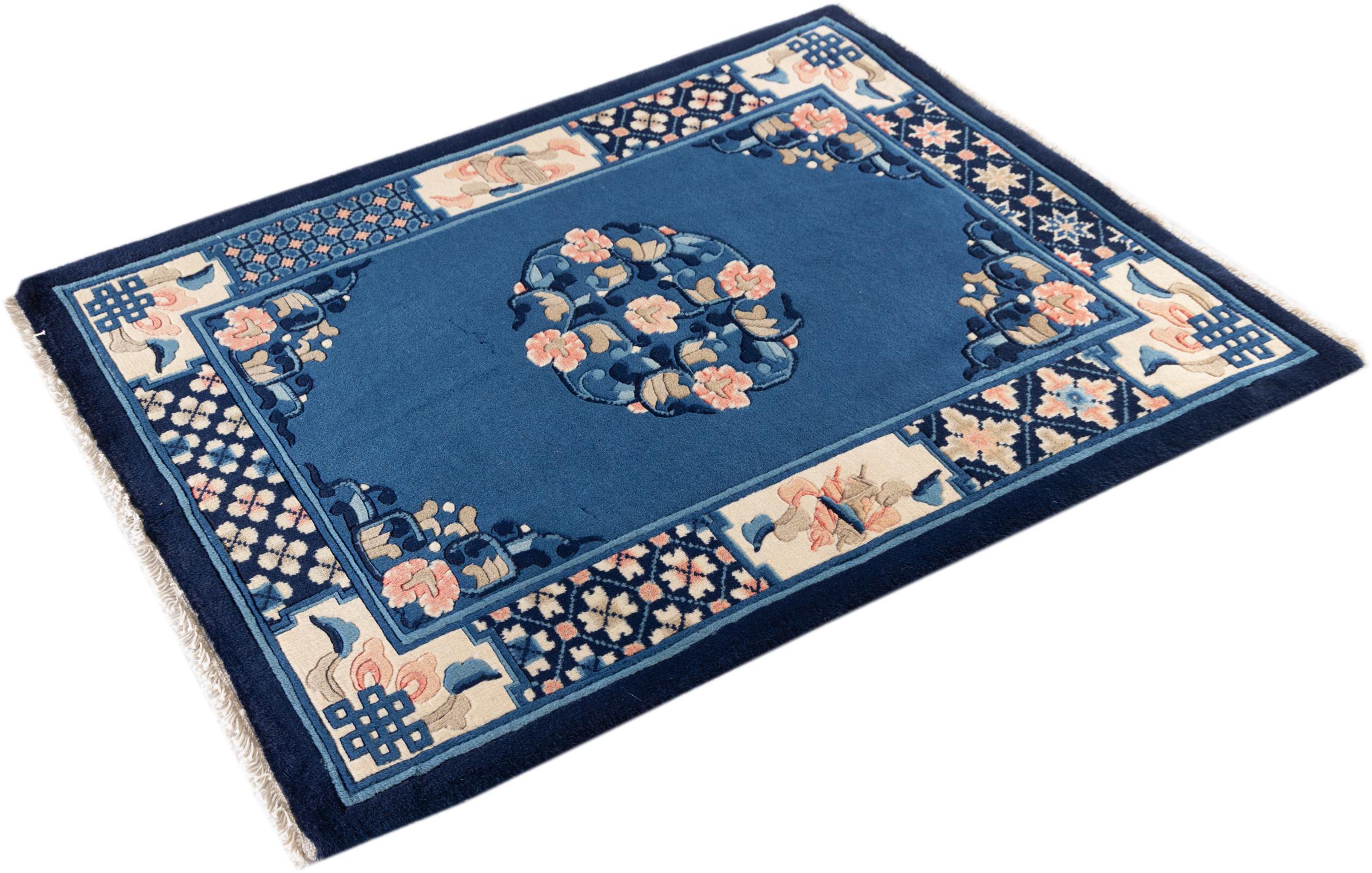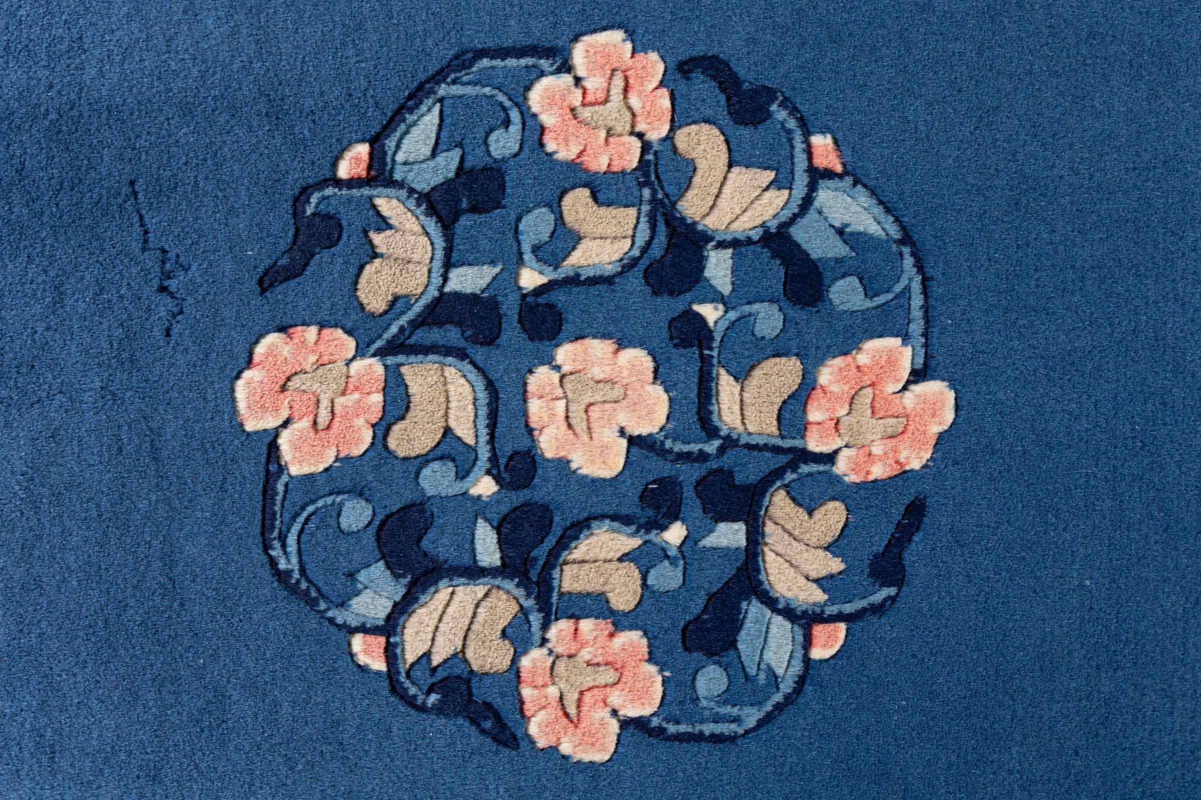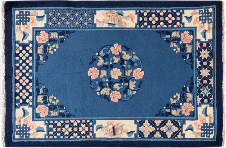 Dette tæppe er håndknyttet af uld i Kina. Kina har en århundreder gammel kultur for tæppevævning. Traditionelt blev der vævet motiver, som også kan findes på kinesisk porcelæn. Det drejer sig om typiske planter, dyr og i sjældne tilfælde drager. Nu væves der også persiske ornamenter.