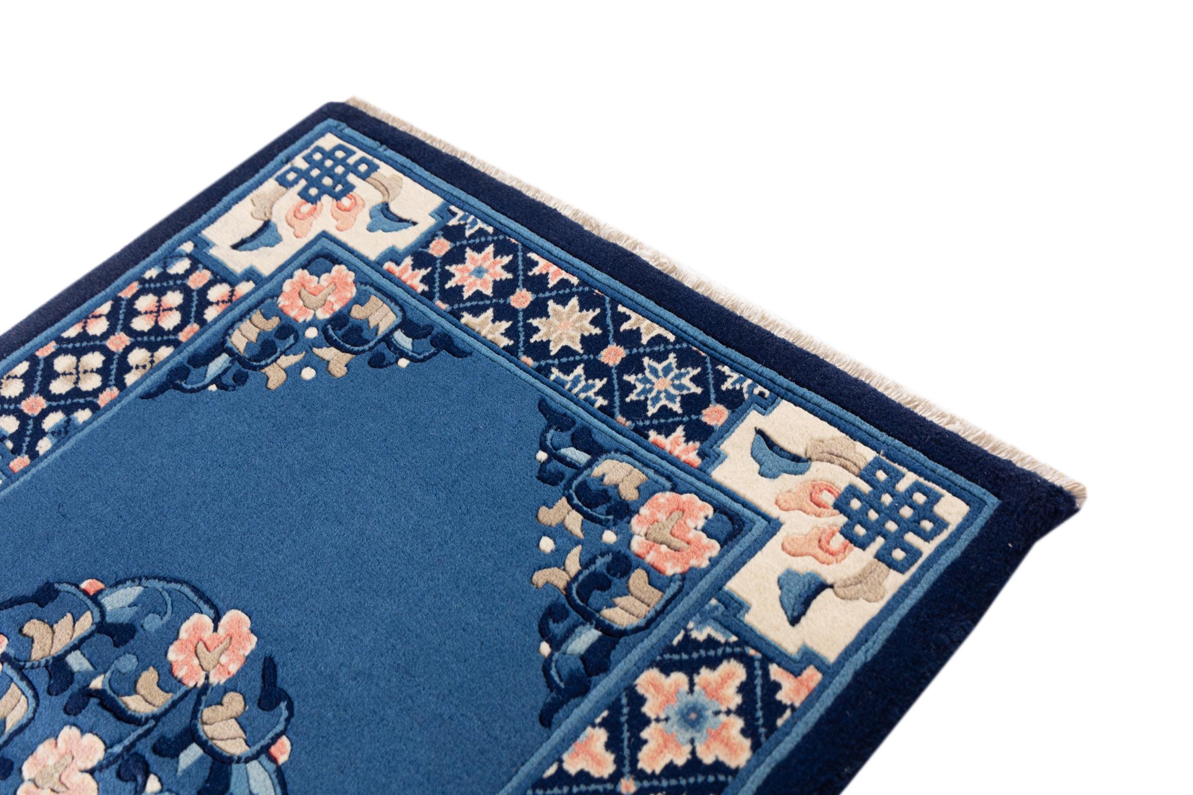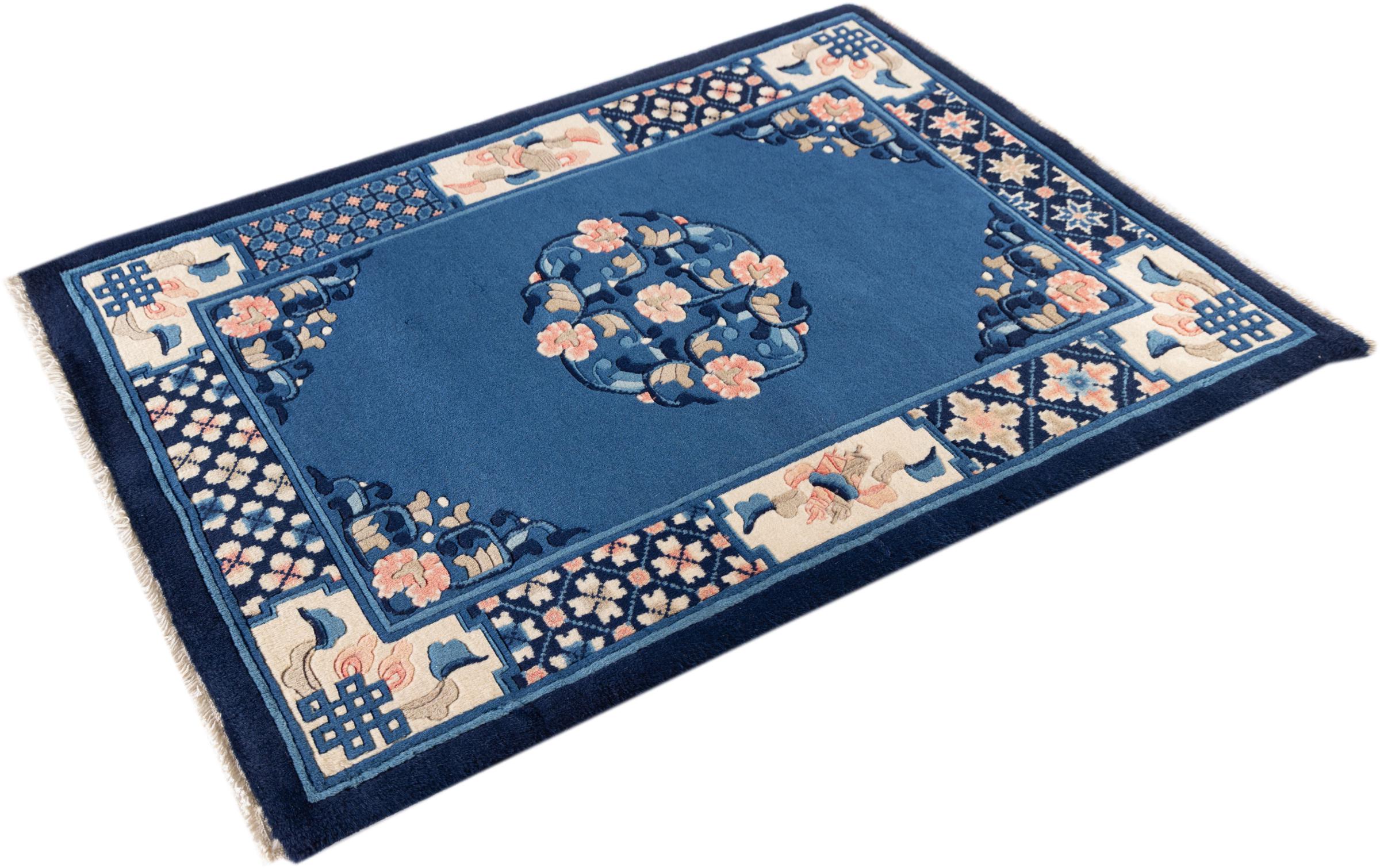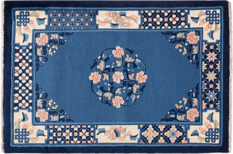 Dette tæppe er håndknyttet af uld i Kina. Kina har en århundreder gammel kultur for tæppevævning. Traditionelt blev der vævet motiver, som også kan findes på kinesisk porcelæn. Det drejer sig om typiske planter, dyr og i sjældne tilfælde drager. Nu væves der også persiske ornamenter.