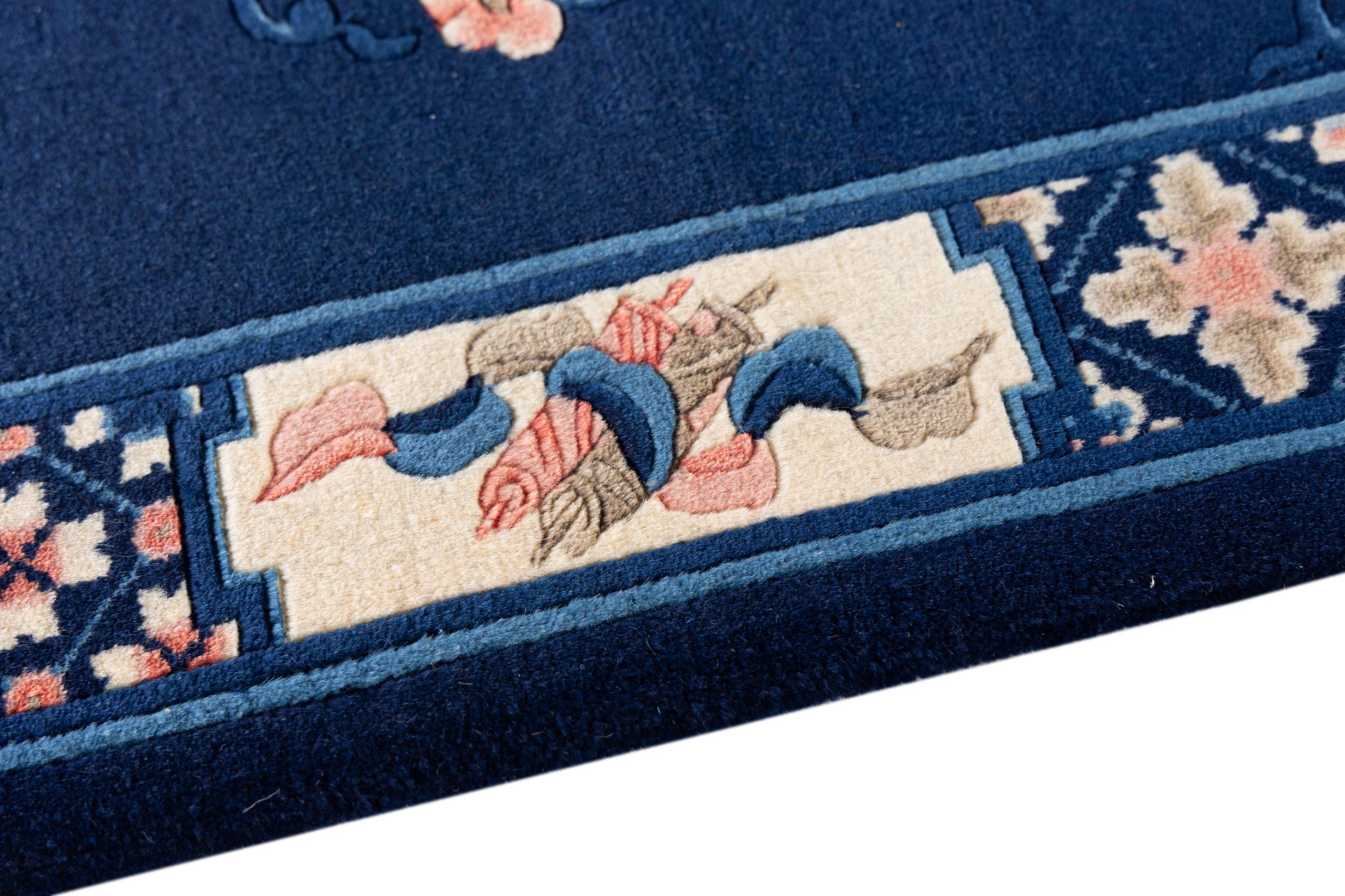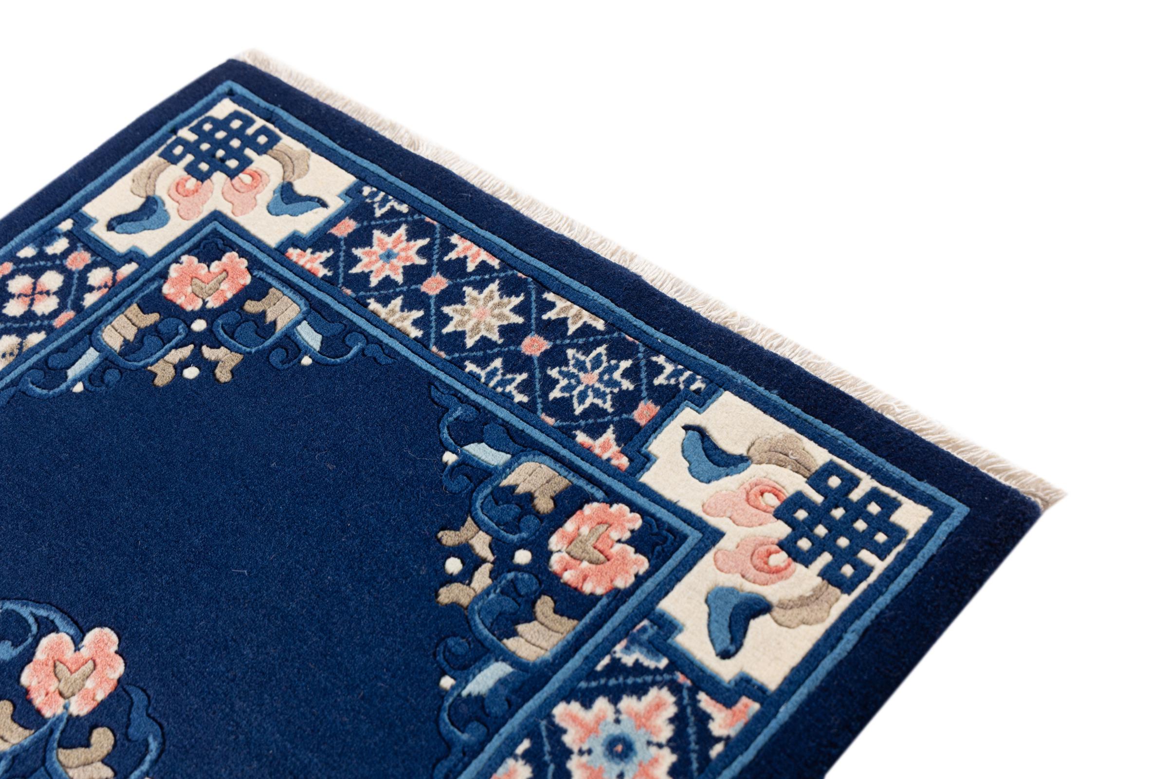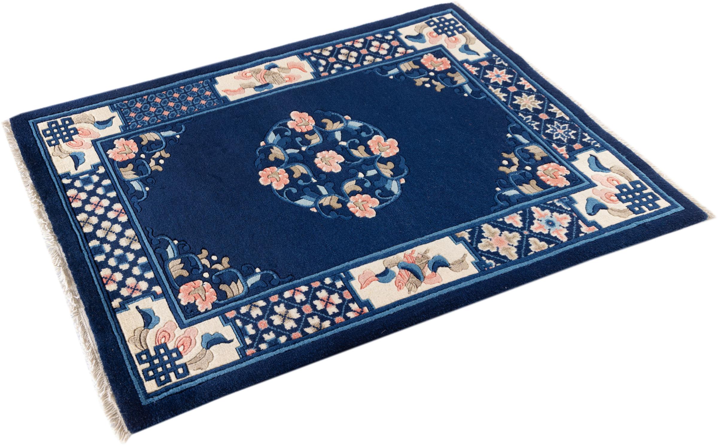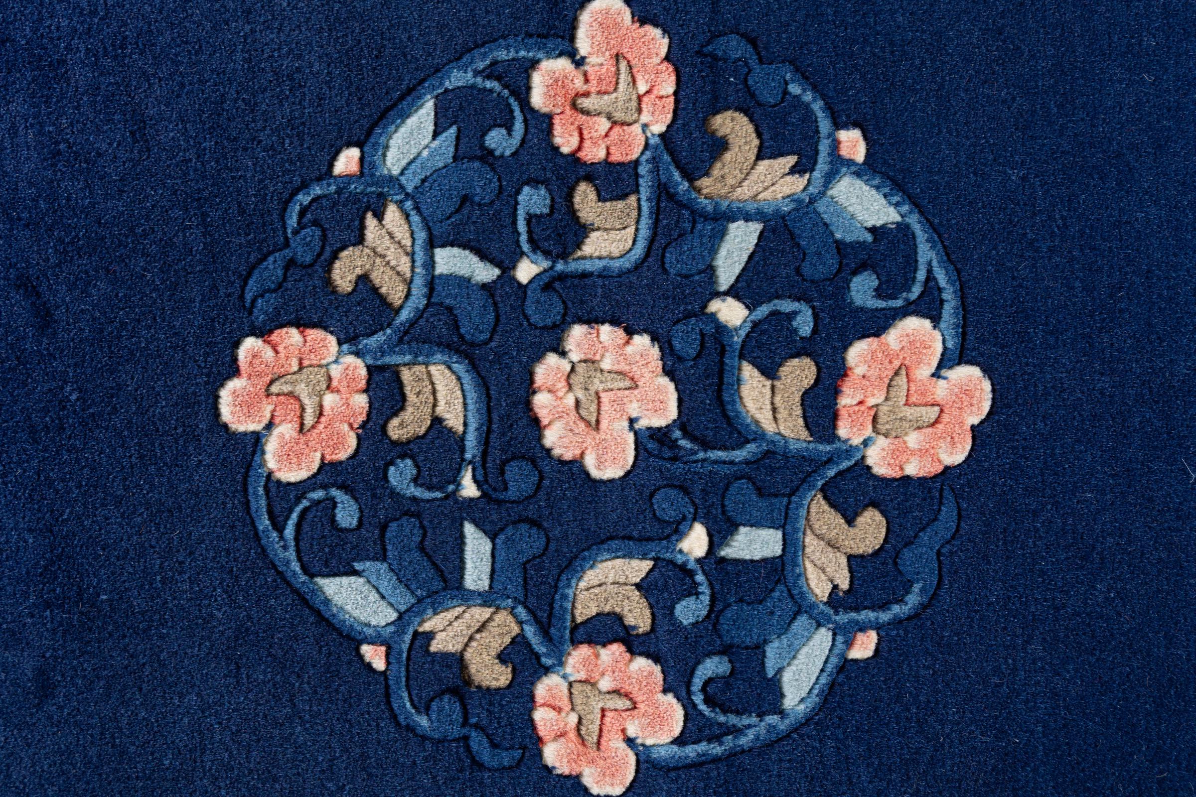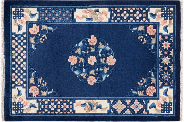 Dette tæppe er håndknyttet af uld i Kina. Kina har en århundreder gammel kultur for tæppevævning. Traditionelt blev der vævet motiver, som også kan findes på kinesisk porcelæn. Det drejer sig om typiske planter, dyr og i sjældne tilfælde drager. Nu væves der også persiske ornamenter.
