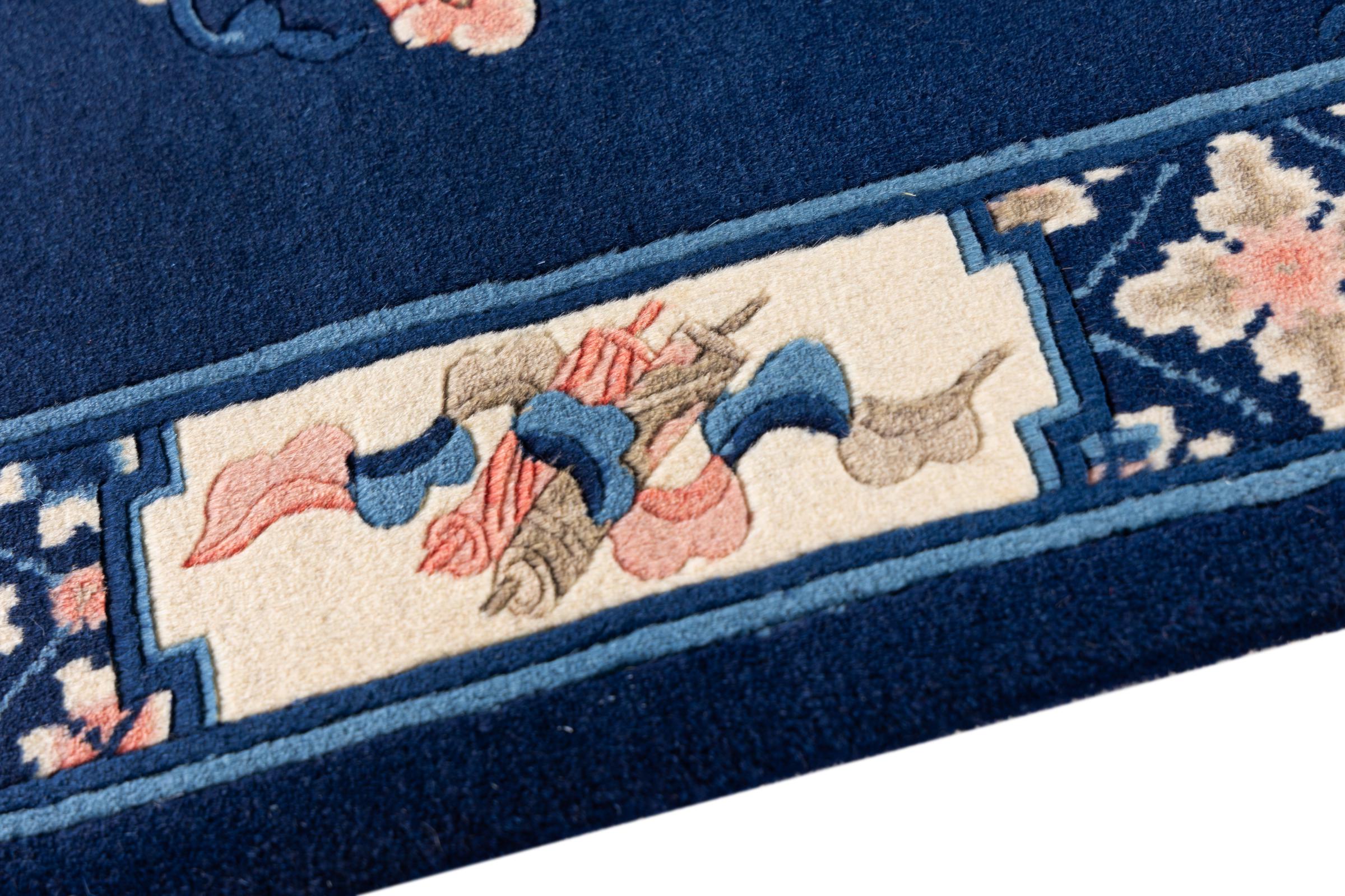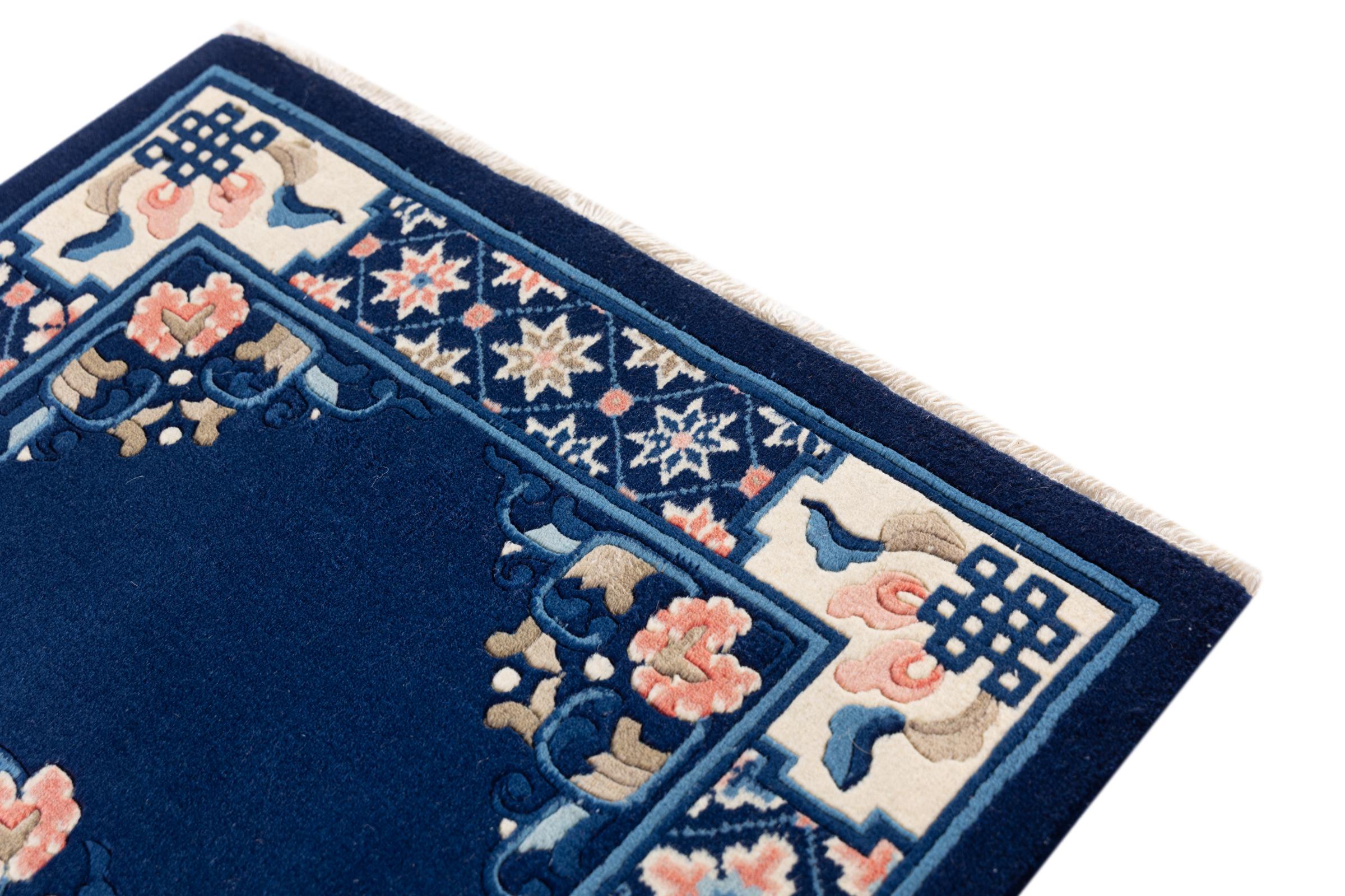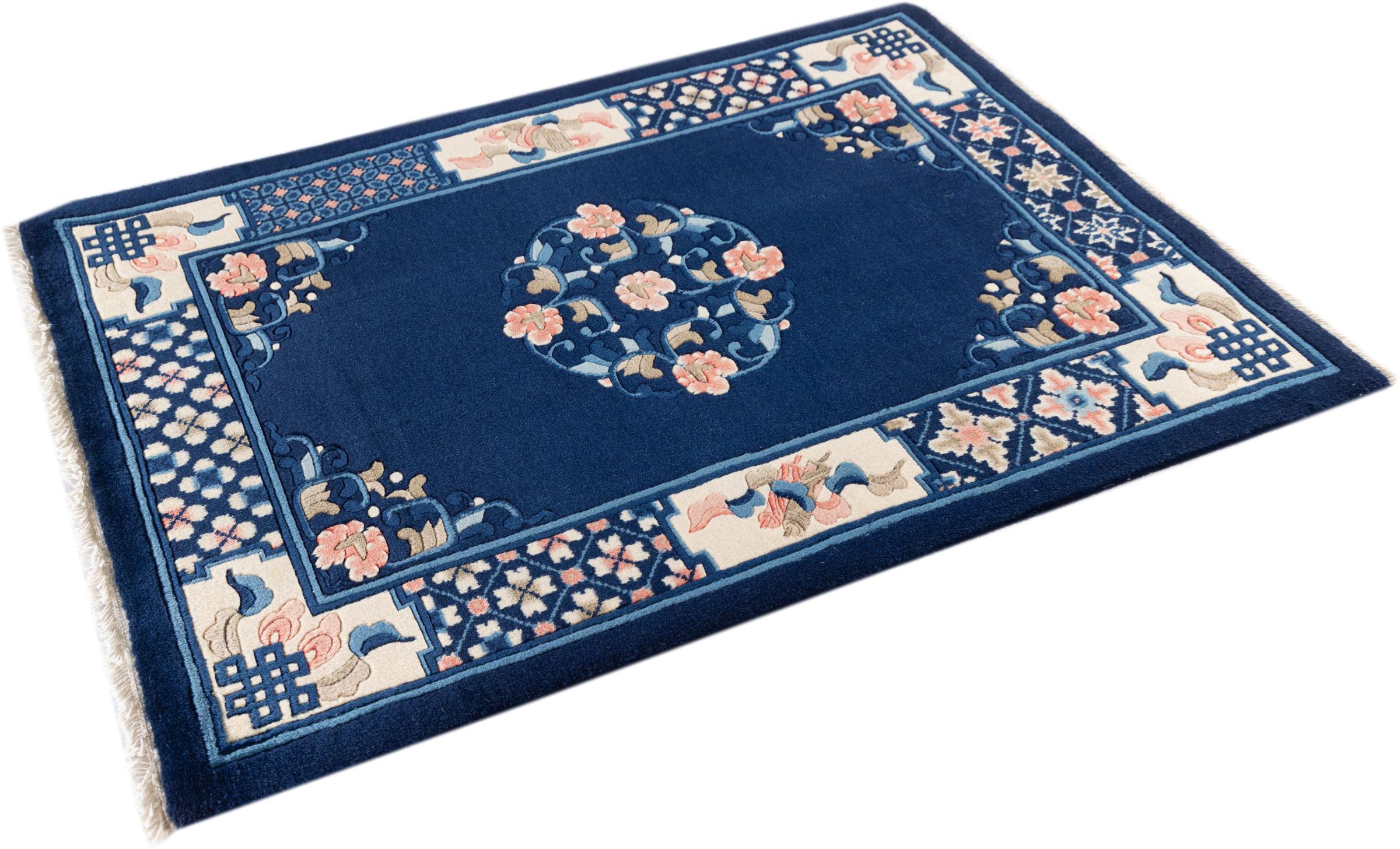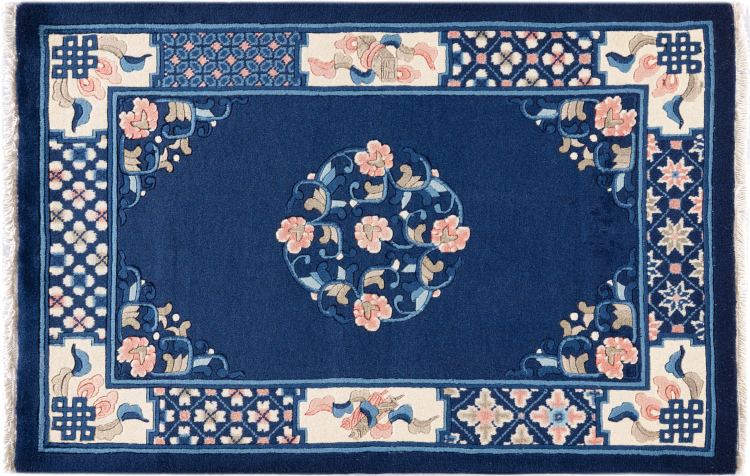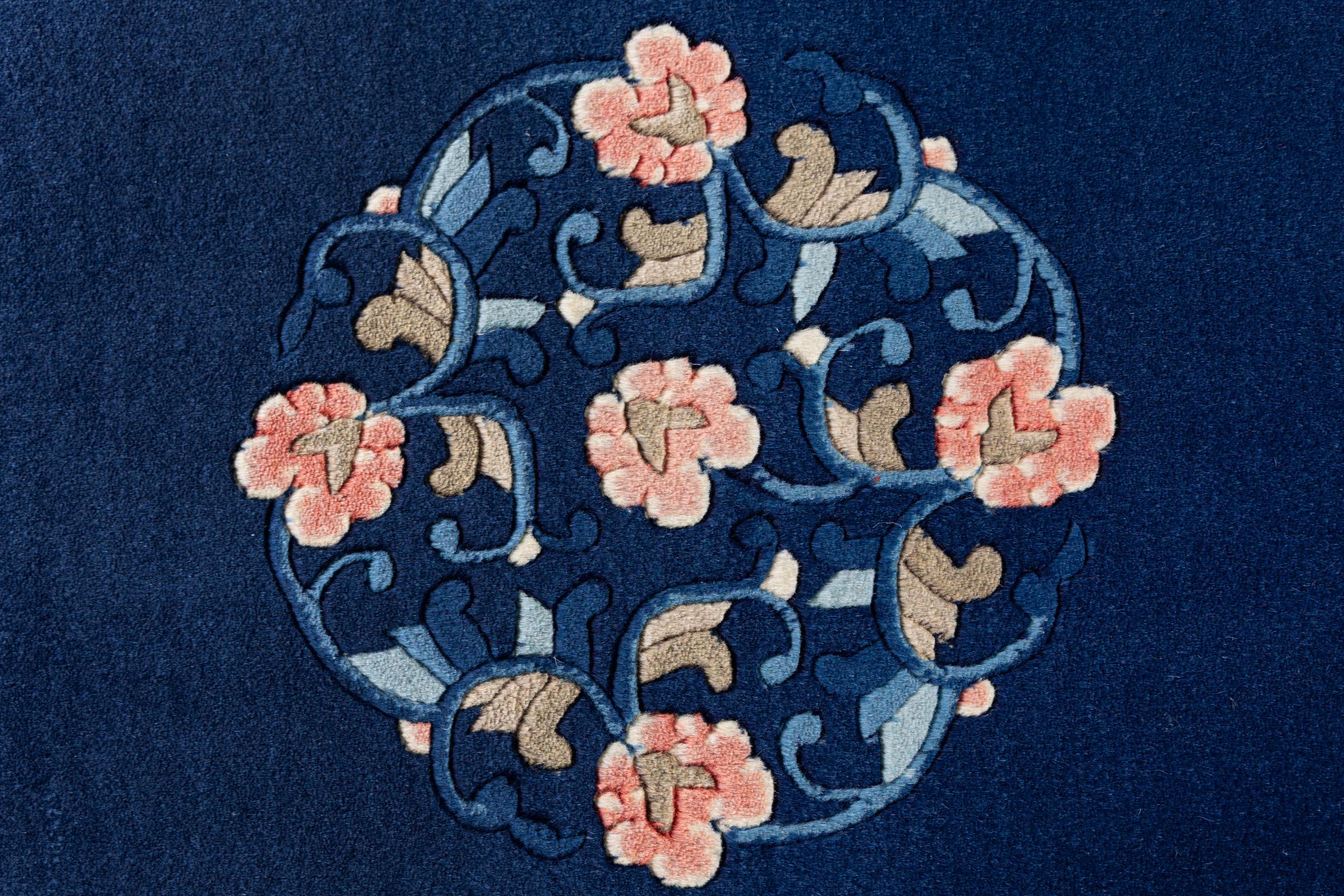 Dette tæppe er håndknyttet af uld i Kina. Kina har en århundreder gammel kultur for tæppevævning. Traditionelt blev der vævet motiver, som også kan findes på kinesisk porcelæn. Det drejer sig om typiske planter, dyr og i sjældne tilfælde drager. Nu væves der også persiske ornamenter.