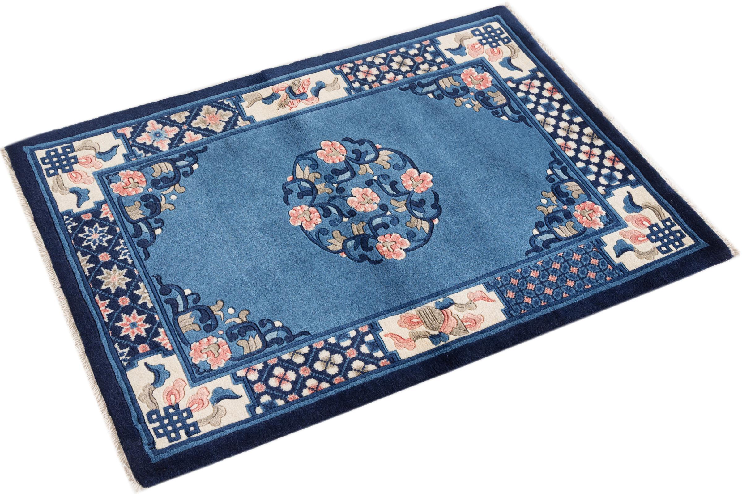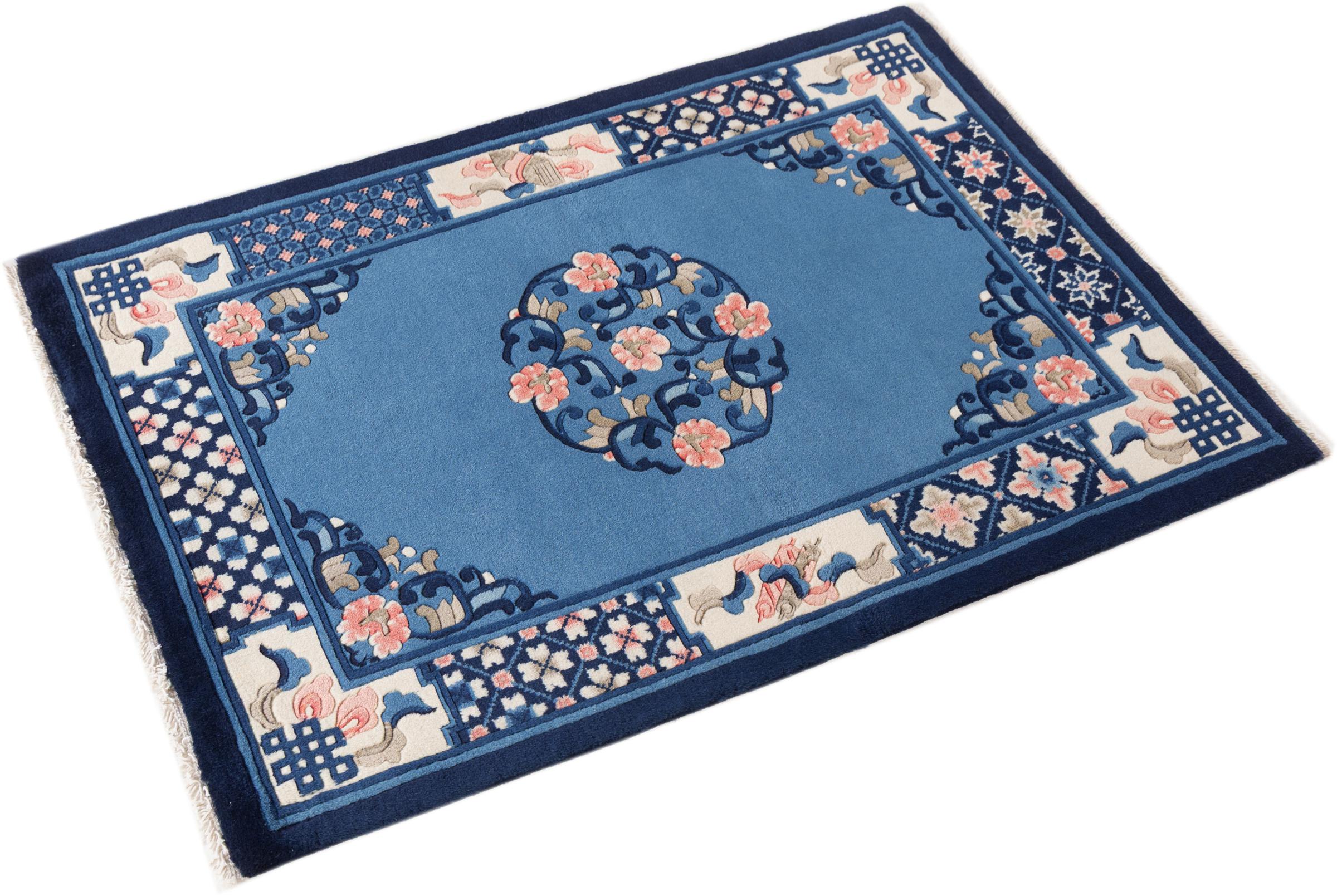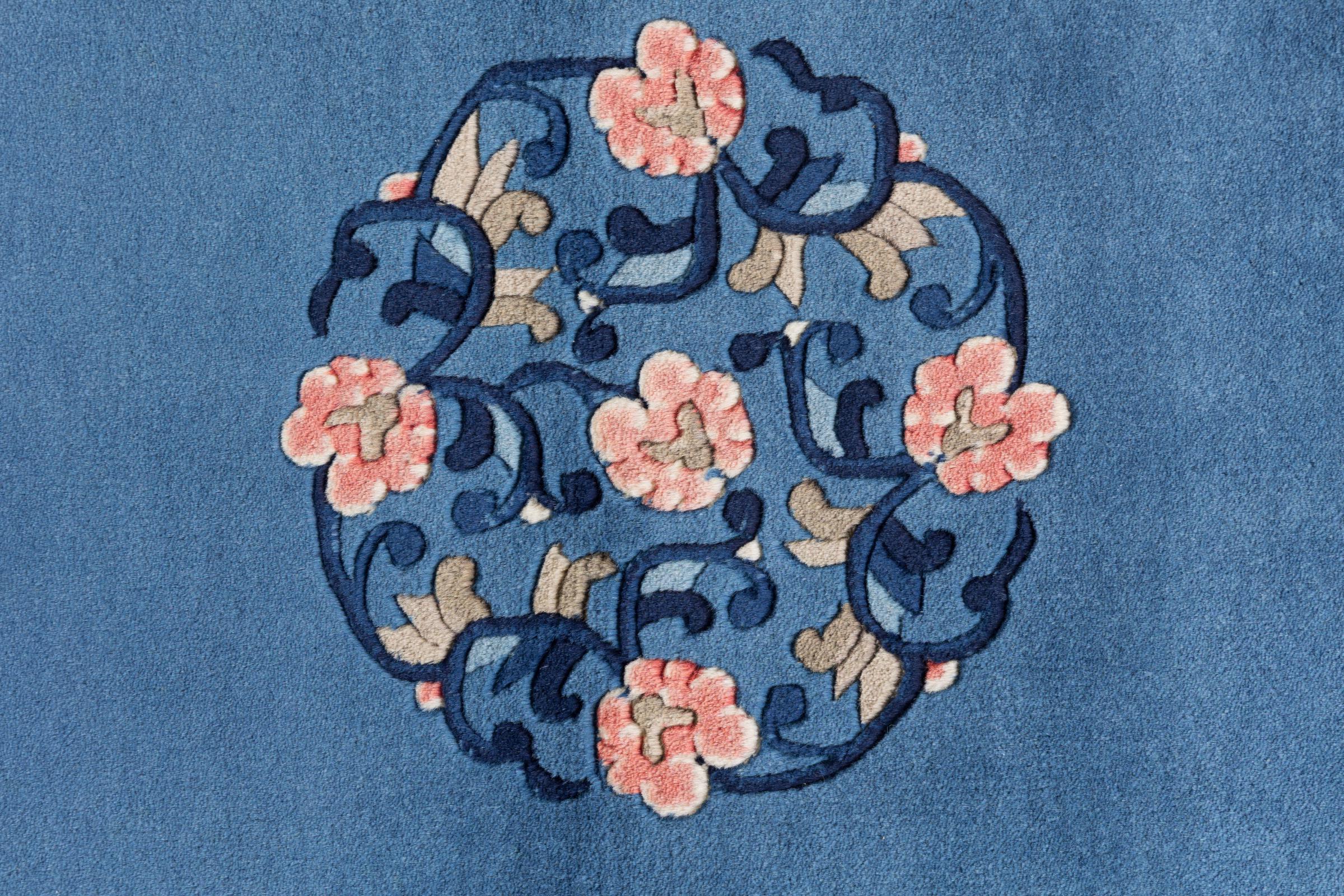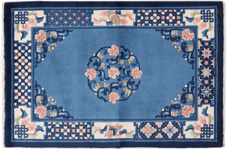 Dette tæppe er håndknyttet af uld i Kina. Kina har en århundreder gammel kultur for tæppevævning. Traditionelt blev der vævet motiver, som også kan findes på kinesisk porcelæn. Det drejer sig om typiske planter, dyr og i sjældne tilfælde drager. Nu væves der også persiske ornamenter.