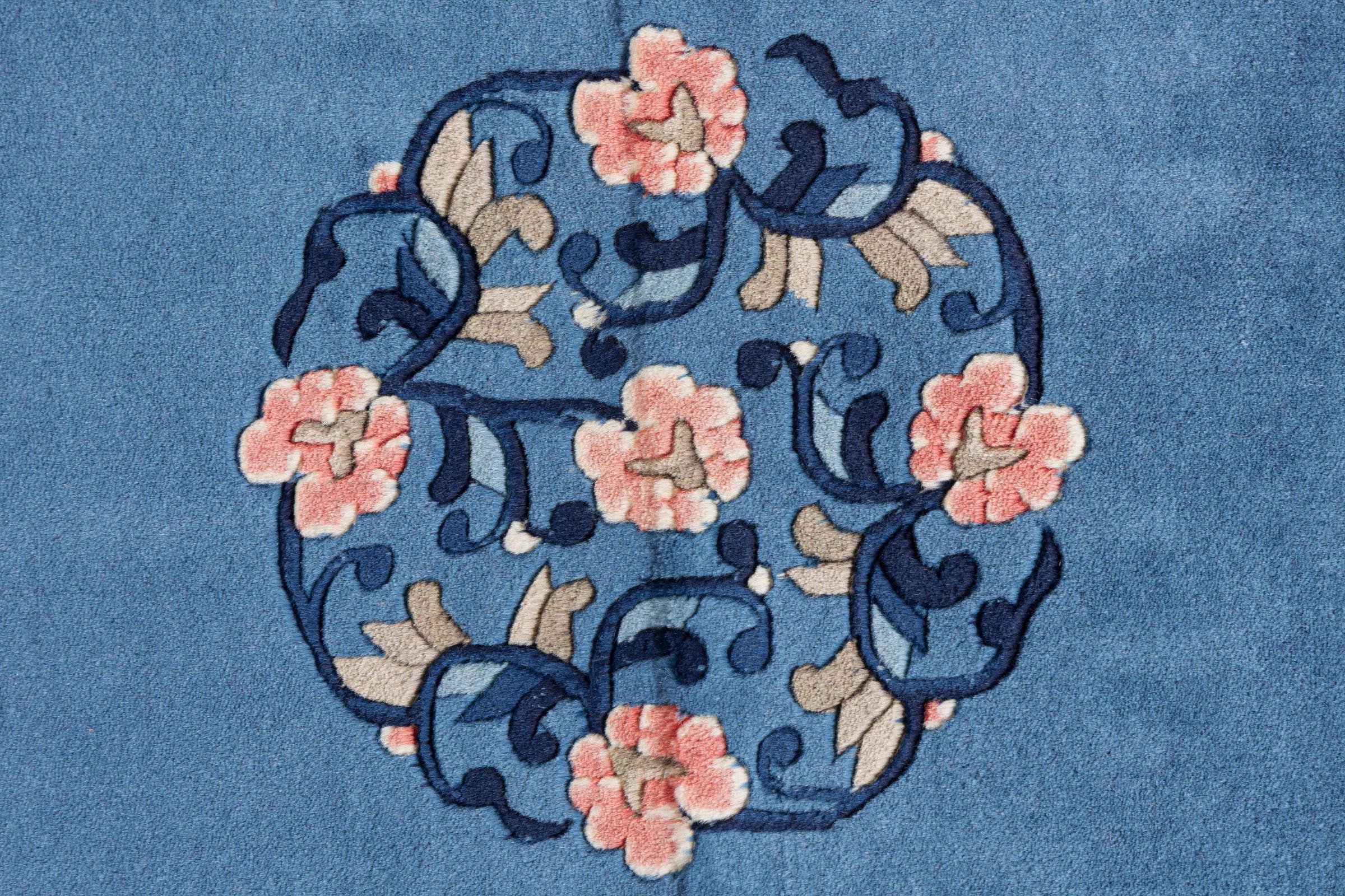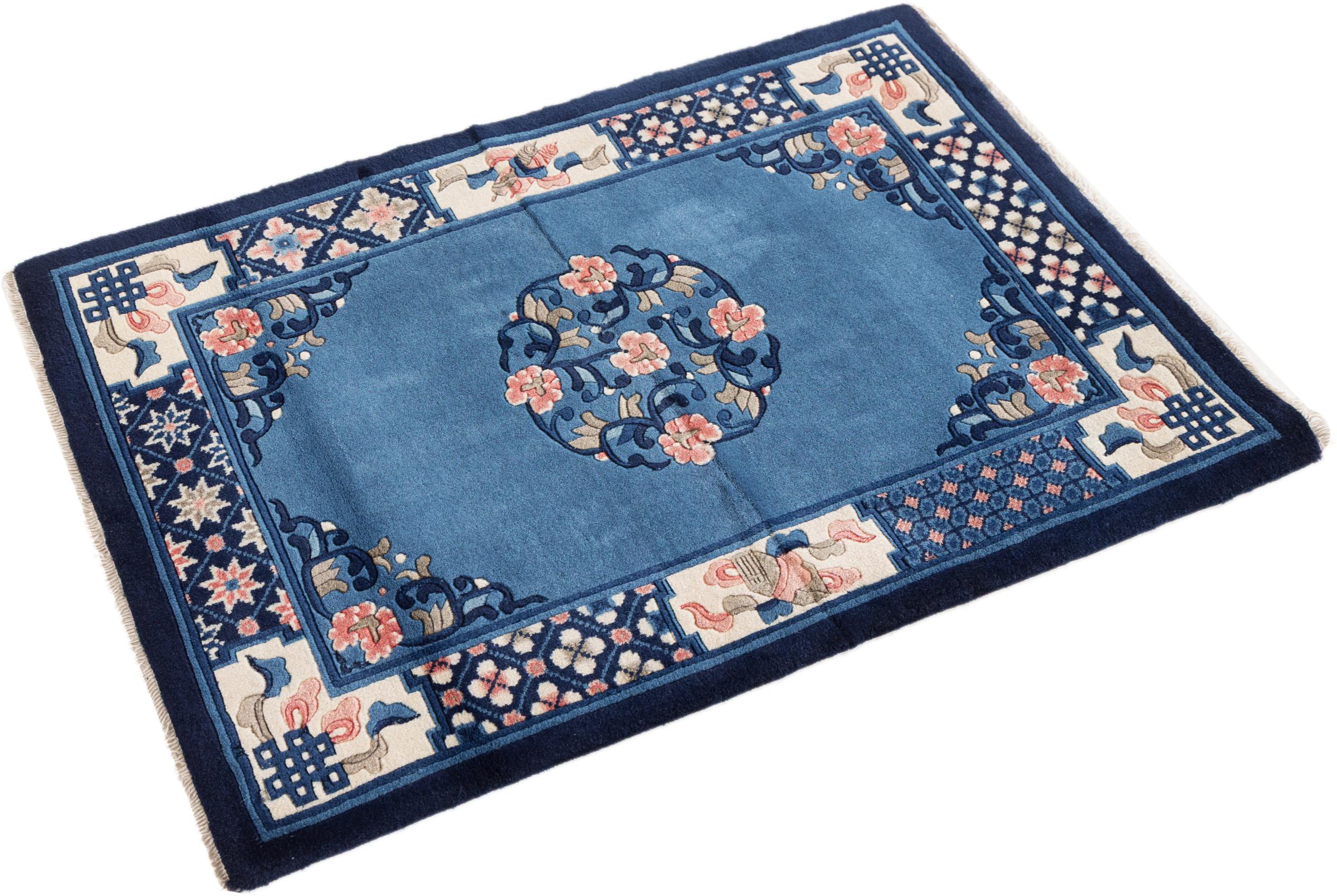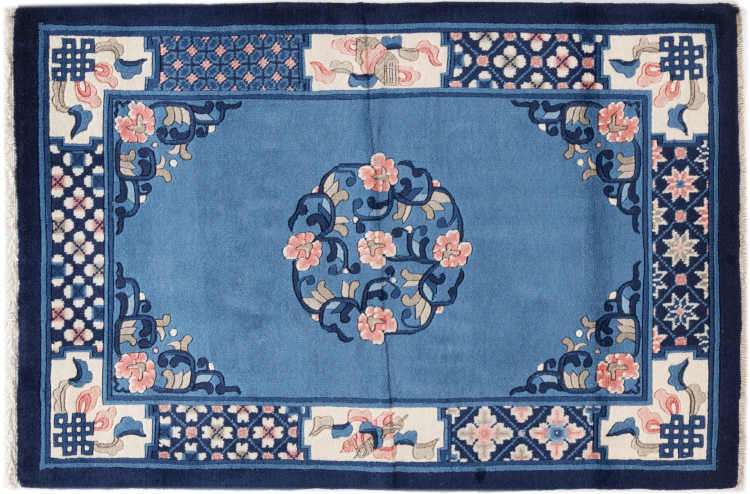 Dette tæppe er håndknyttet af uld i Kina. Kina har en århundreder gammel kultur for tæppevævning. Traditionelt blev der vævet motiver, som også kan findes på kinesisk porcelæn. Det drejer sig om typiske planter, dyr og i sjældne tilfælde drager. Nu væves der også persiske ornamenter.
