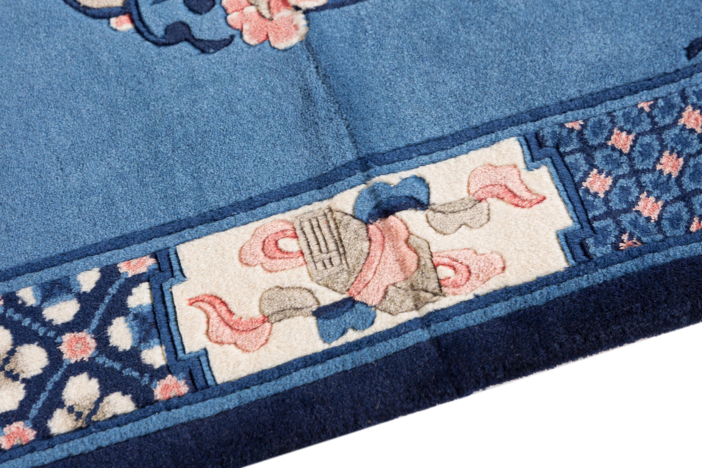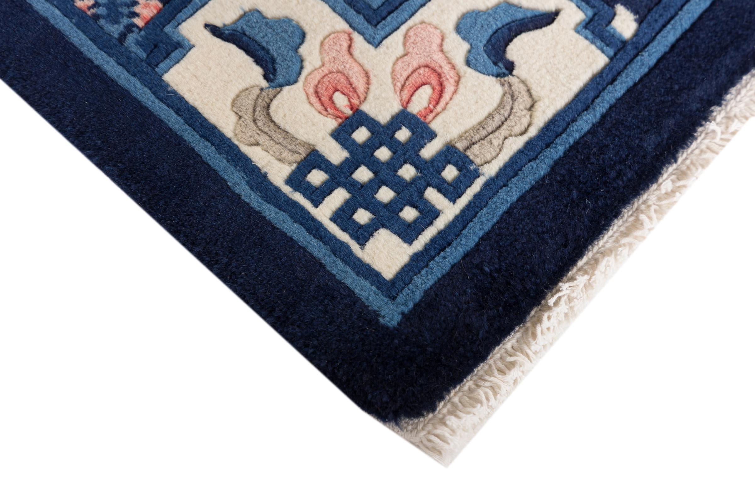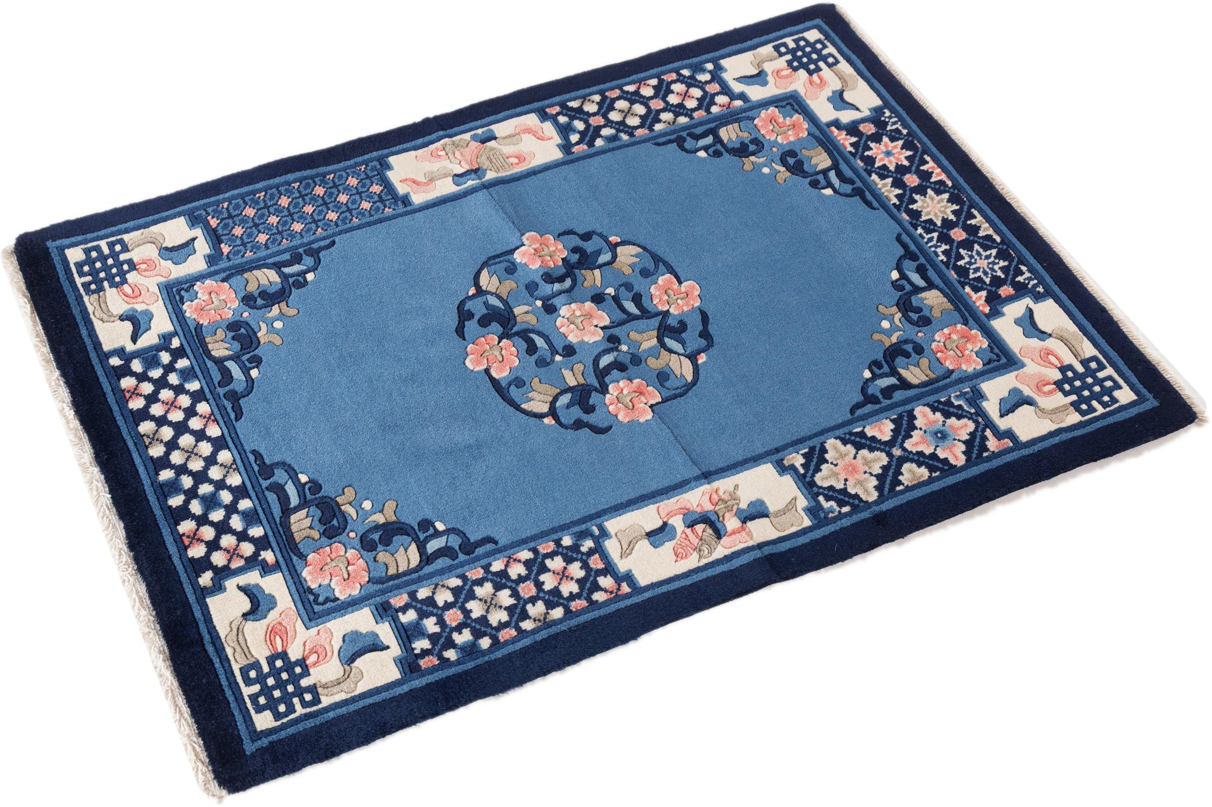 Dette tæppe er håndknyttet af uld i Kina. Kina har en århundreder gammel kultur for tæppevævning. Traditionelt blev der vævet motiver, som også kan findes på kinesisk porcelæn. Det drejer sig om typiske planter, dyr og i sjældne tilfælde drager. Nu væves der også persiske ornamenter.