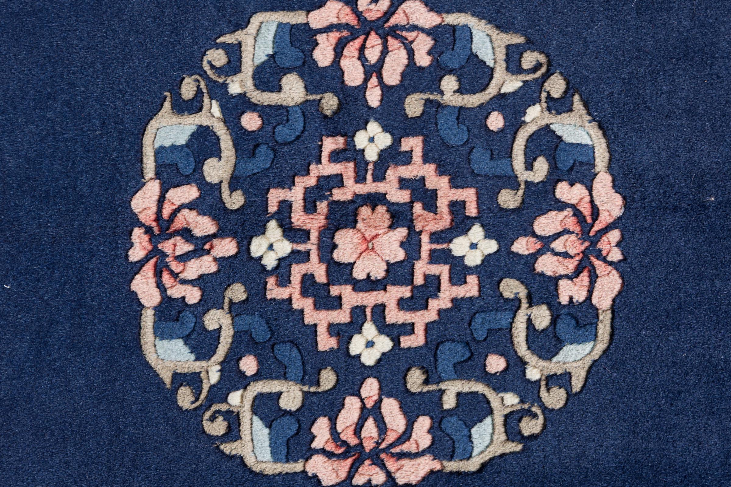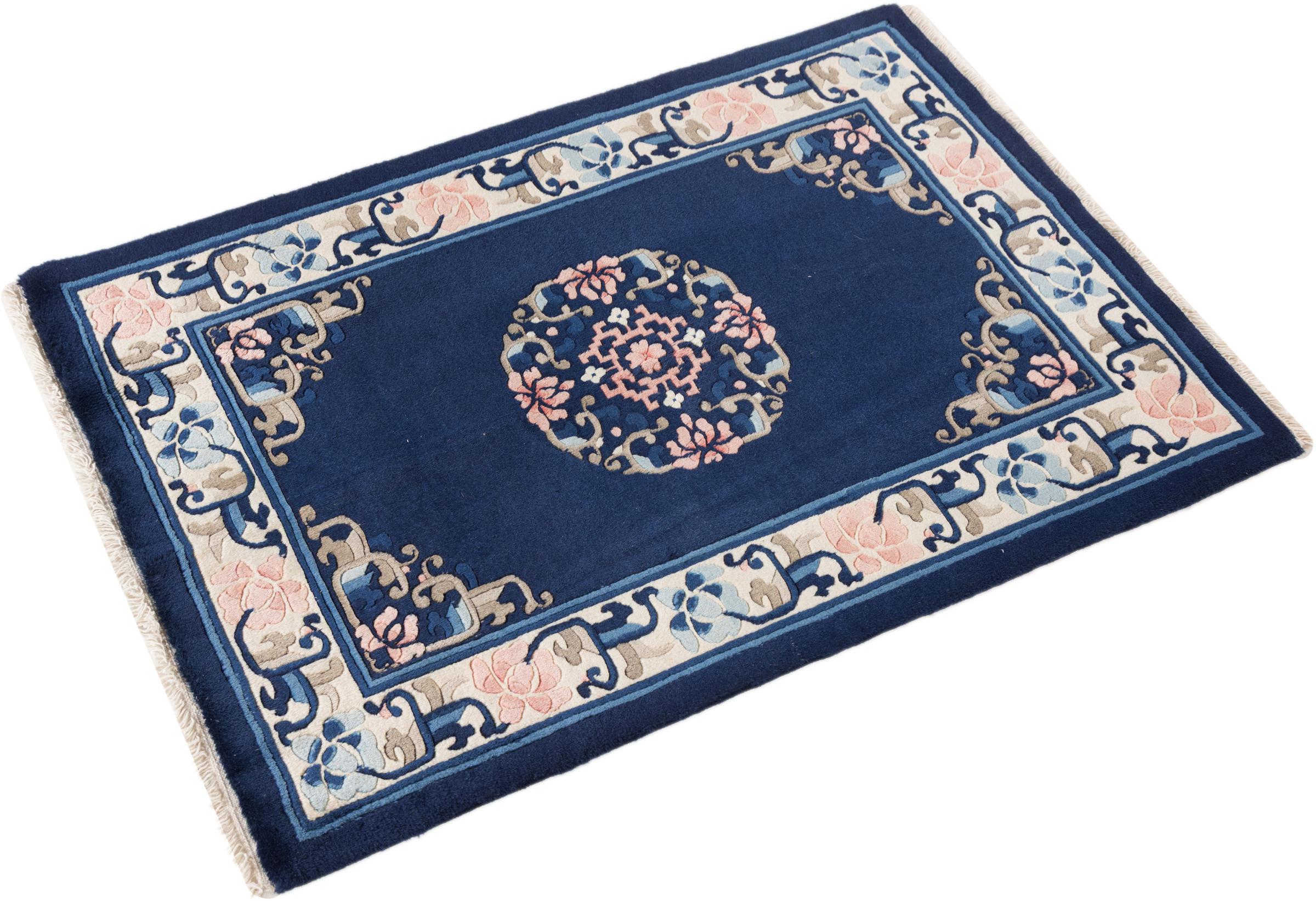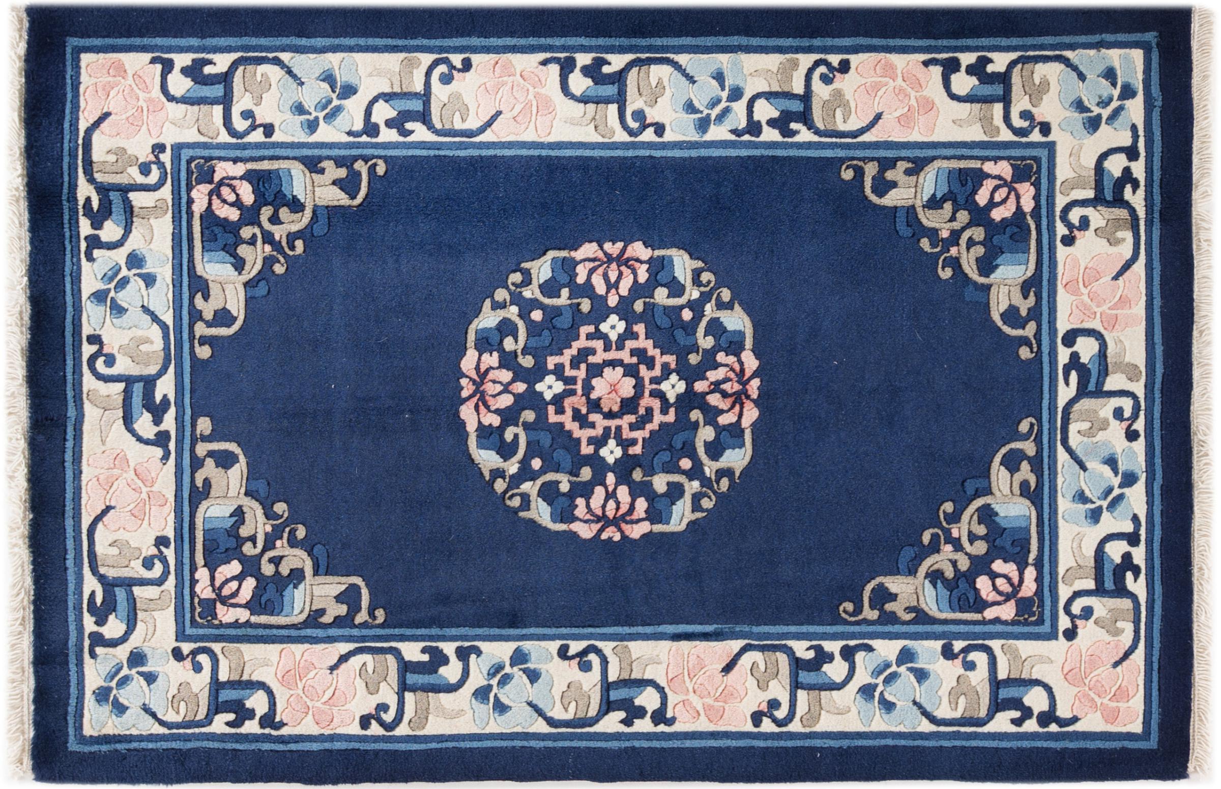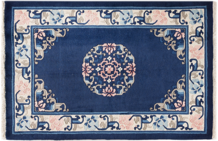 Dette tæppe er håndknyttet af uld i Kina. Kina har en århundreder gammel kultur for tæppevævning. Traditionelt blev der vævet motiver, som også kan findes på kinesisk porcelæn. Det drejer sig om typiske planter, dyr og i sjældne tilfælde drager. Nu væves der også persiske ornamenter.