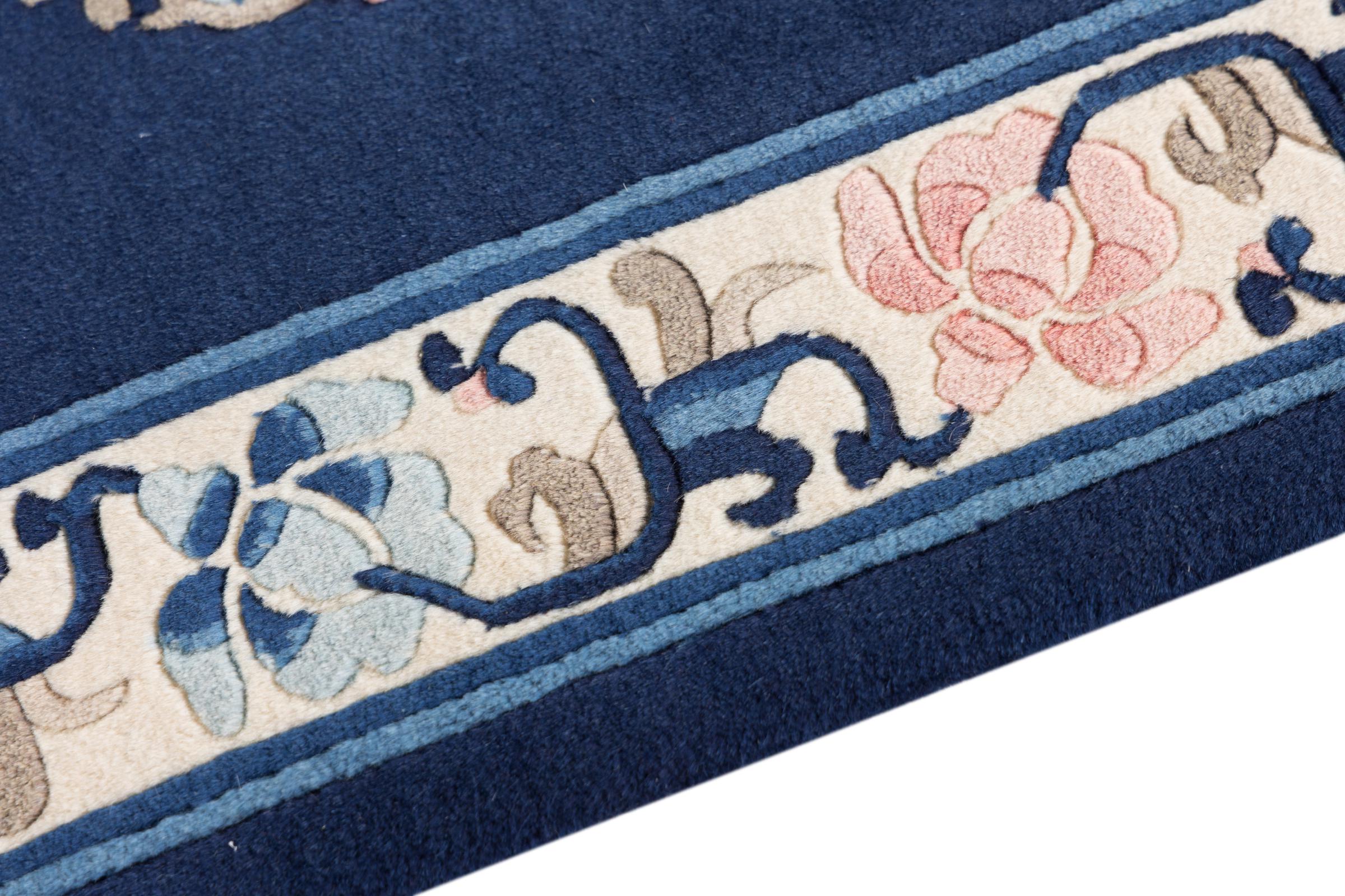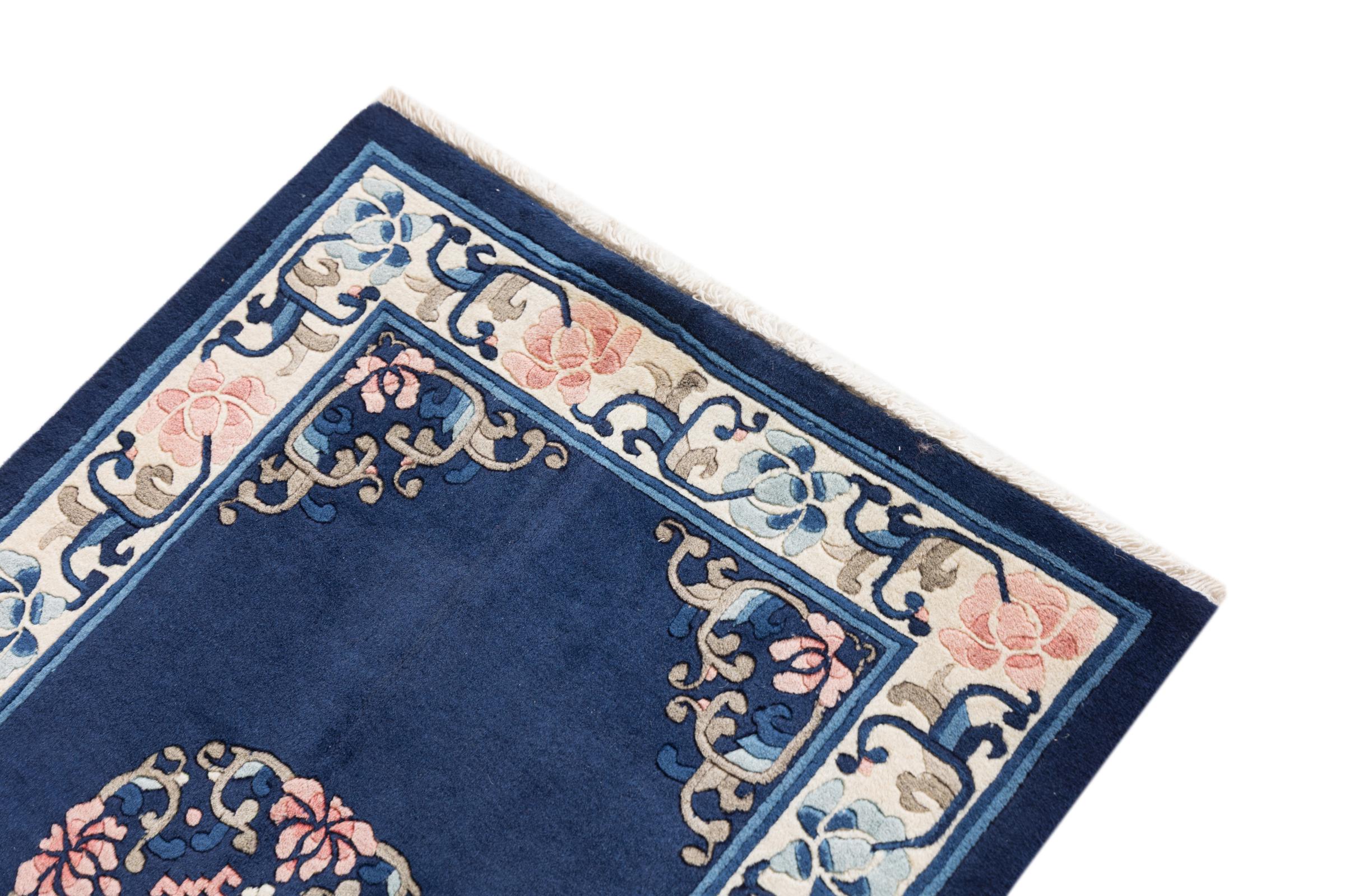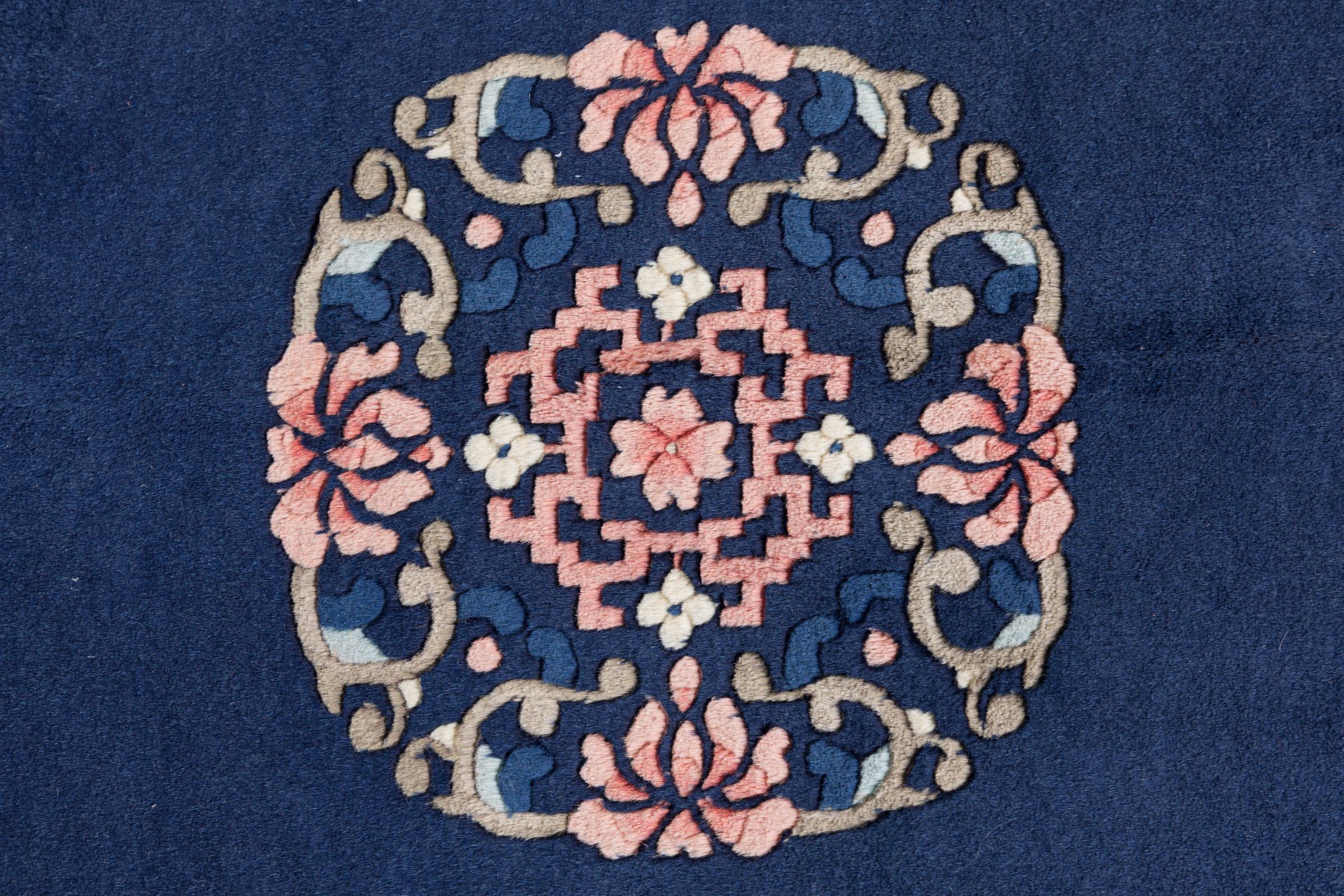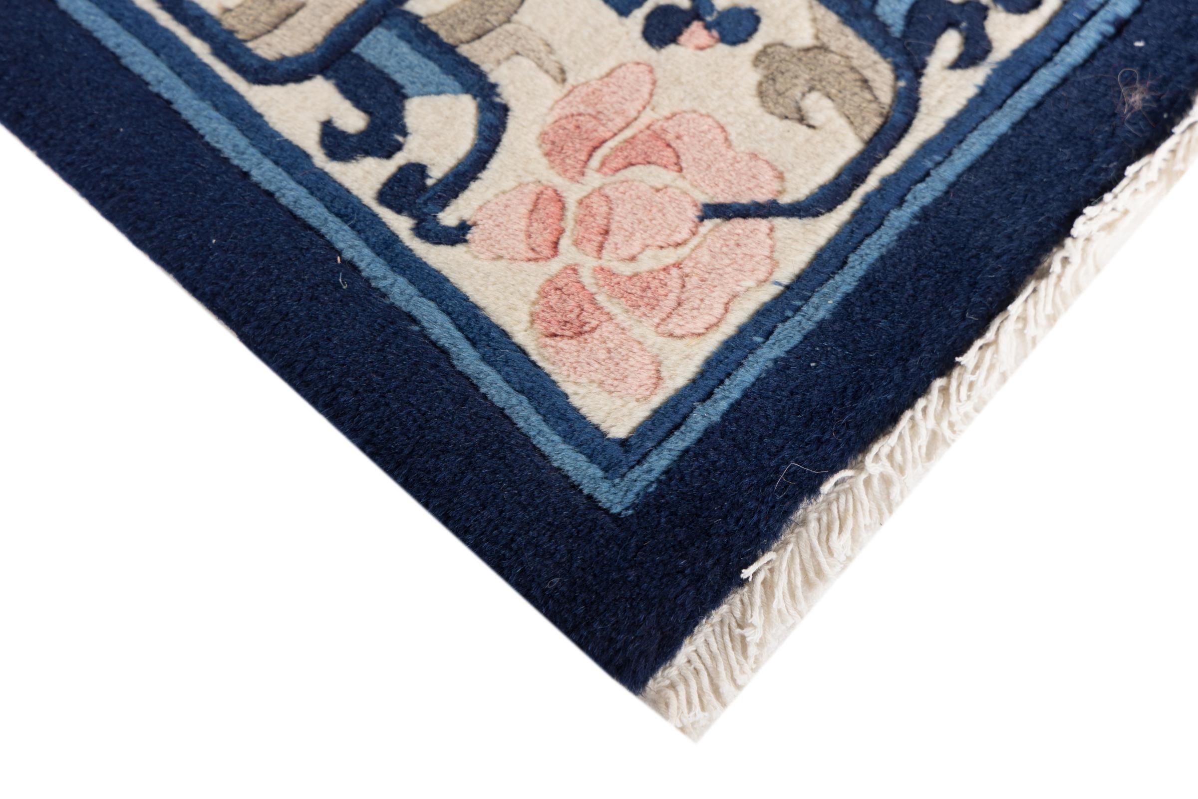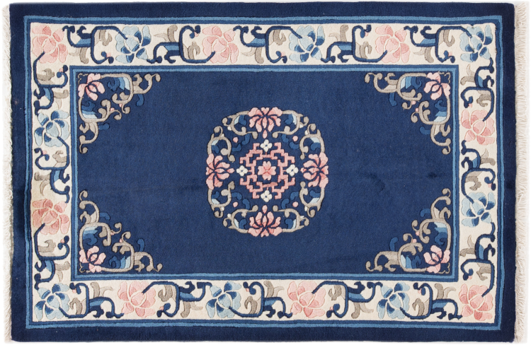 Dette tæppe er håndknyttet af uld i Kina. Kina har en århundreder gammel kultur for tæppevævning. Traditionelt blev der vævet motiver, som også kan findes på kinesisk porcelæn. Det drejer sig om typiske planter, dyr og i sjældne tilfælde drager. Nu væves der også persiske ornamenter.