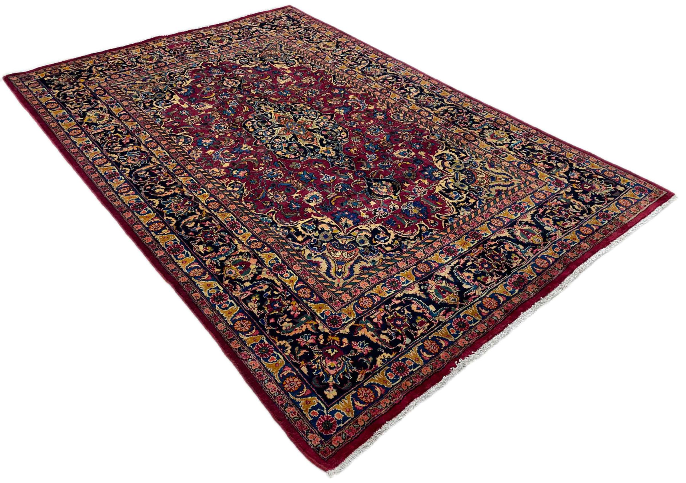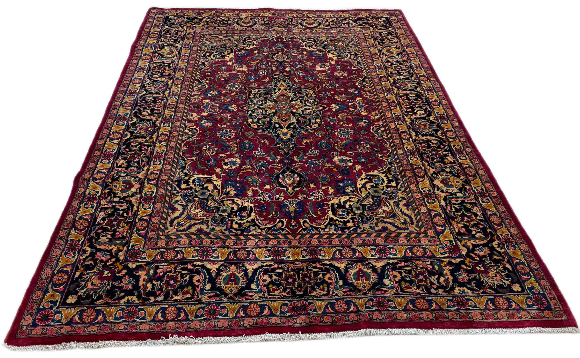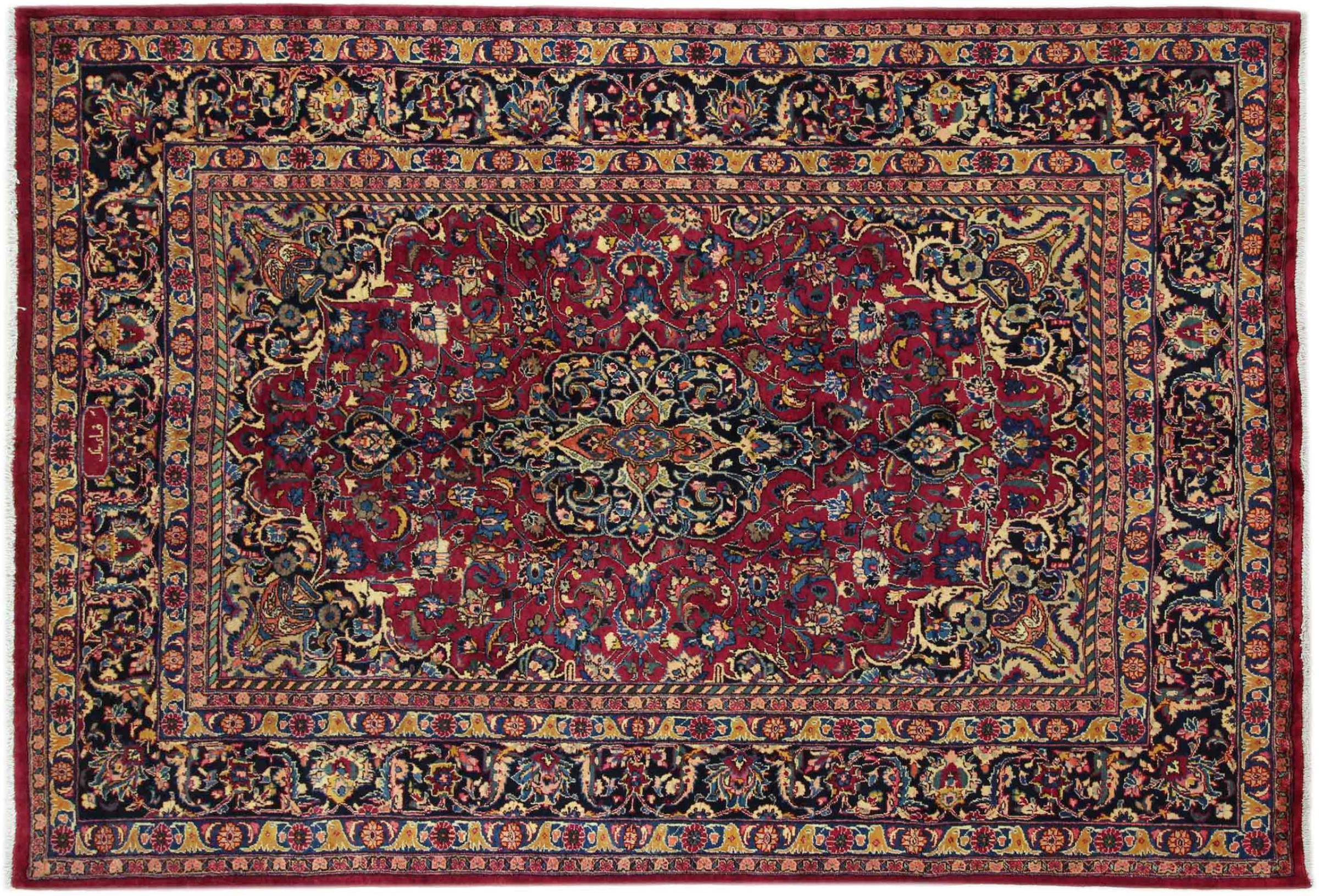 Dette tæppe fra Mashhad, en af de største byer i Iran, er håndknyttet af ren naturuld. Millioner af mennesker valfarter hvert år til denne hellige persiske by. Mashhad-tæpper er kendt for deres usædvanlige størrelser og uld af ekstremt høj kvalitet.