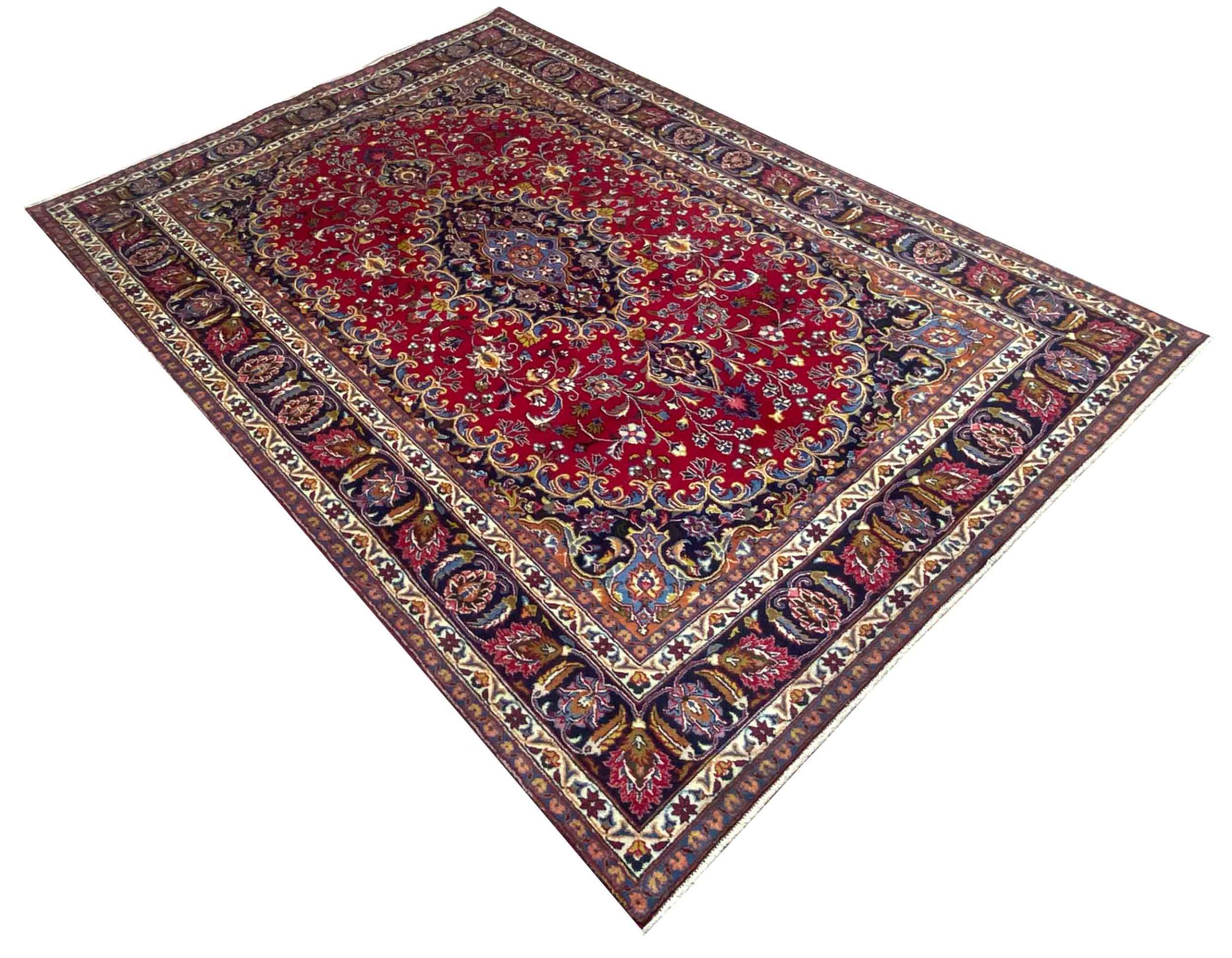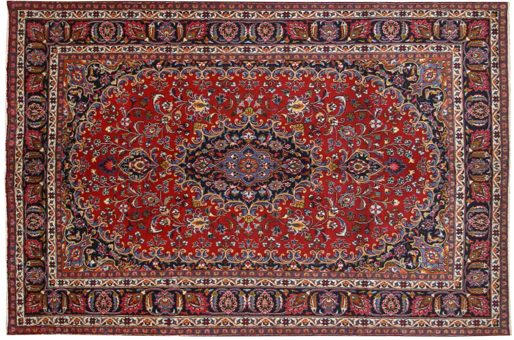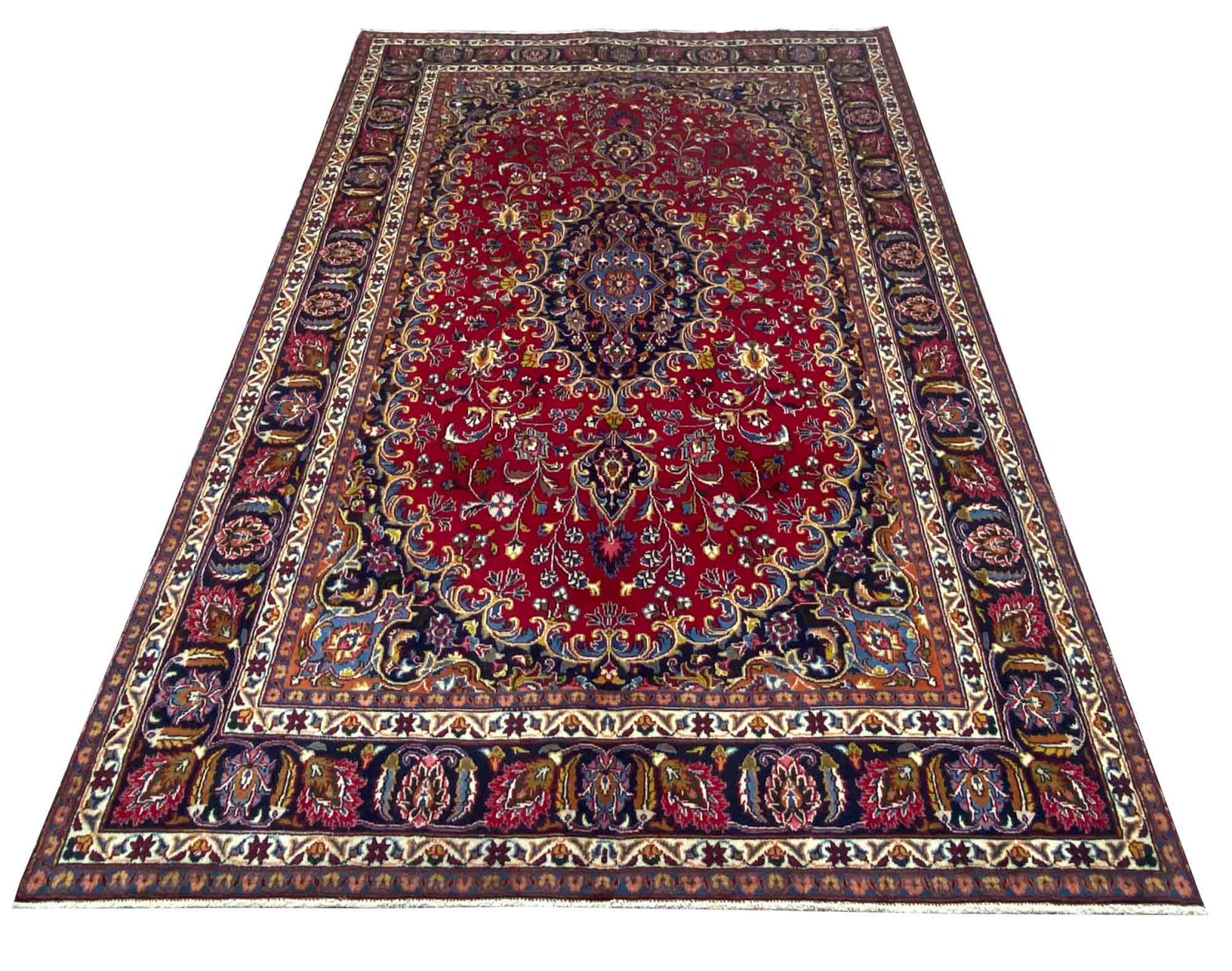Dette tæppe fra Mashhad, en af de største byer i Iran, er håndknyttet af ren naturuld. Millioner af mennesker valfarter hvert år til denne hellige persiske by. Mashhad-tæpper er kendt for deres usædvanlige størrelser og uld af ekstremt høj kvalitet.