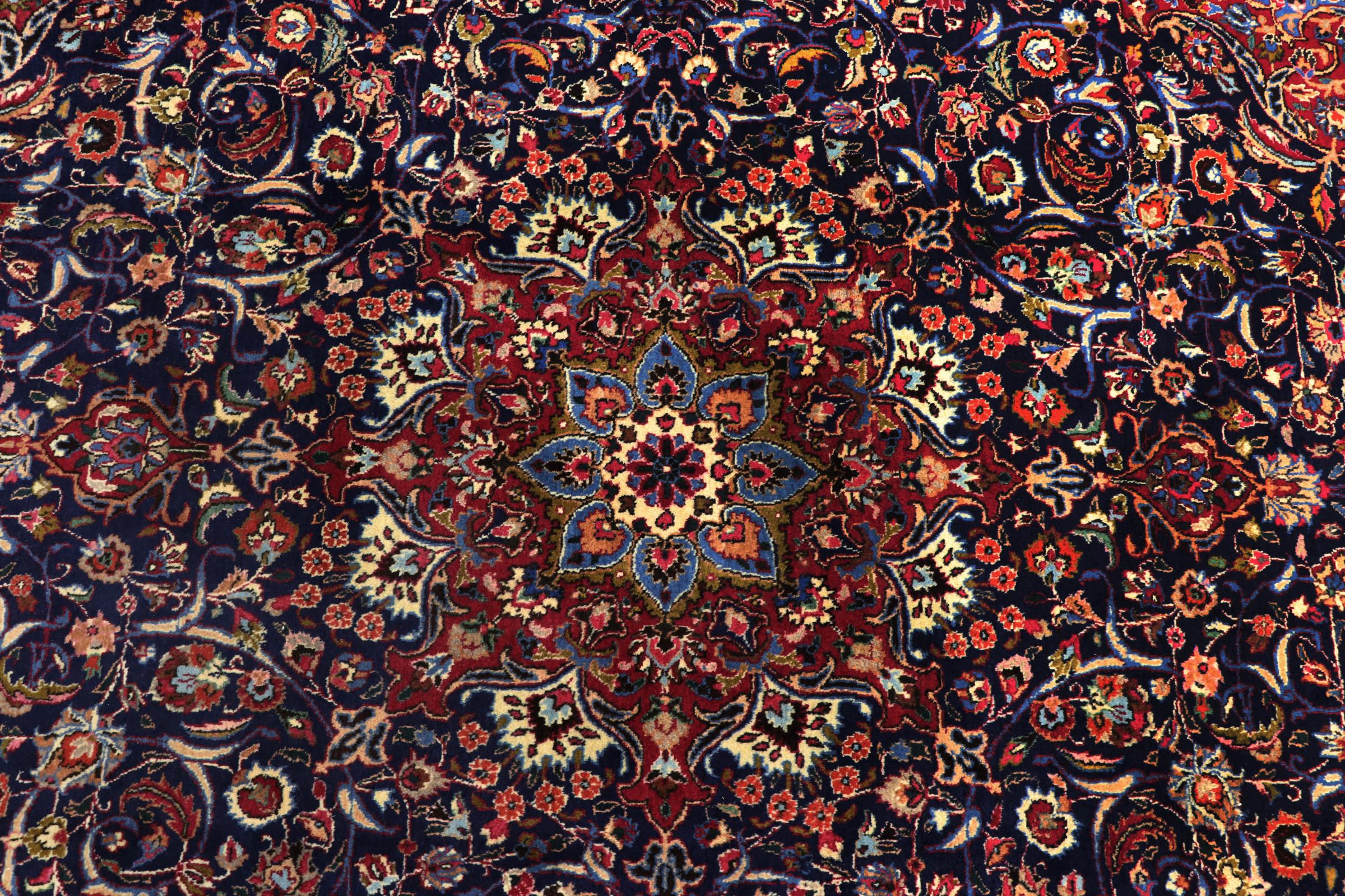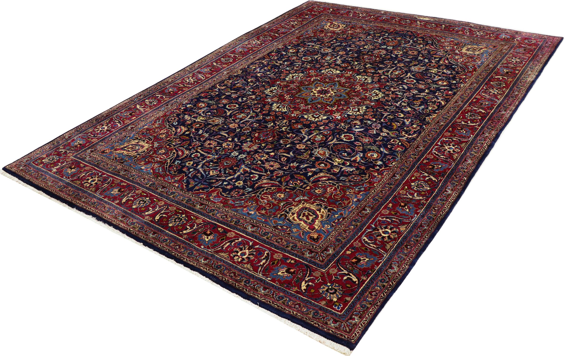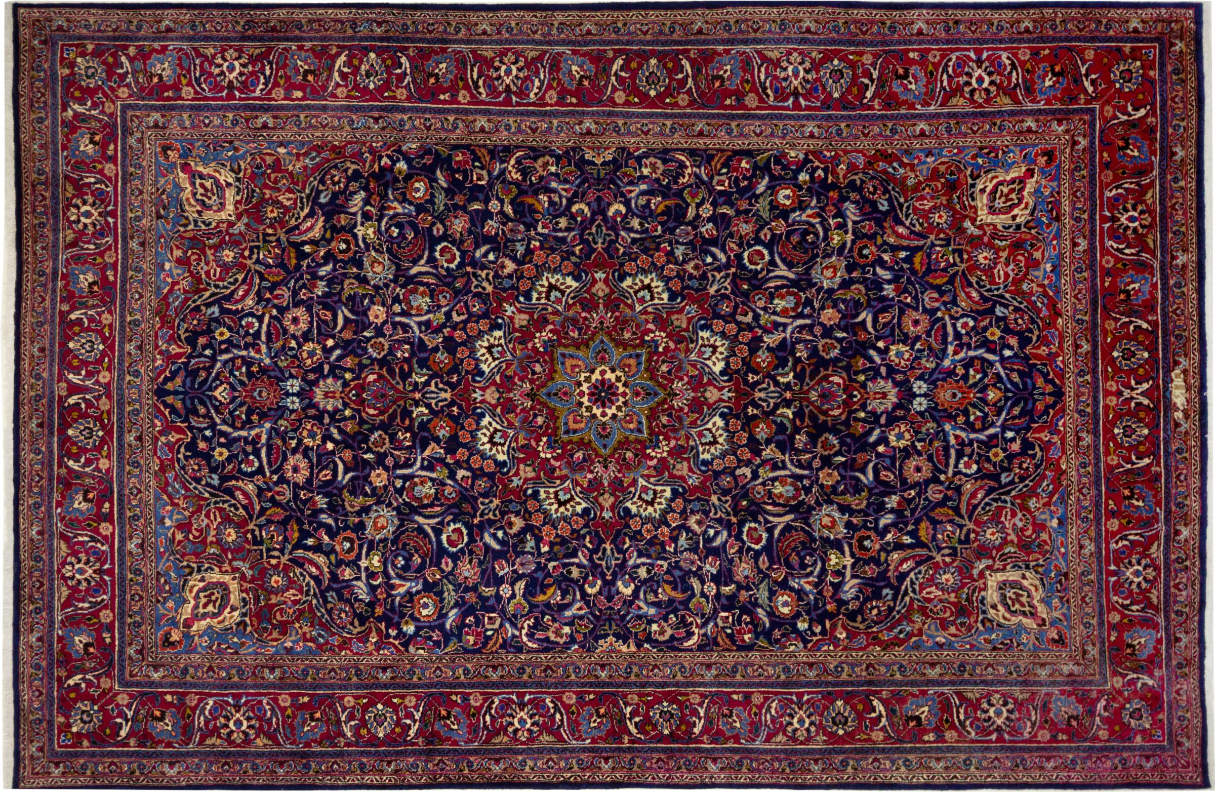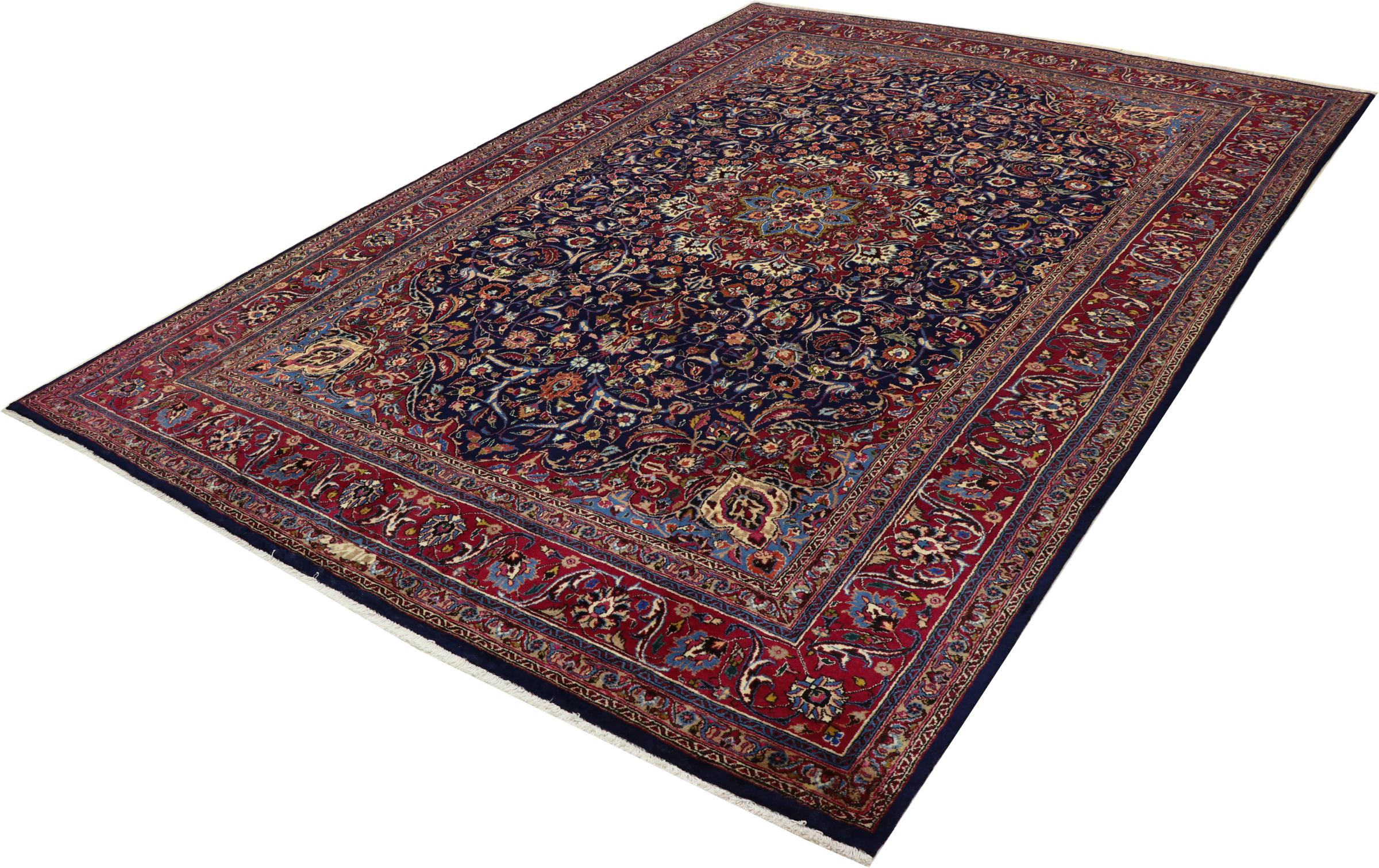 Dette tæppe fra Mashhad, en af de største byer i Iran, er håndknyttet af ren naturuld. Millioner af mennesker valfarter hvert år til denne hellige persiske by. Mashhad-tæpper er kendt for deres usædvanlige størrelser og uld af ekstremt høj kvalitet.