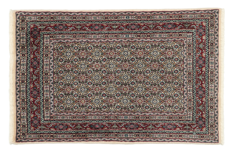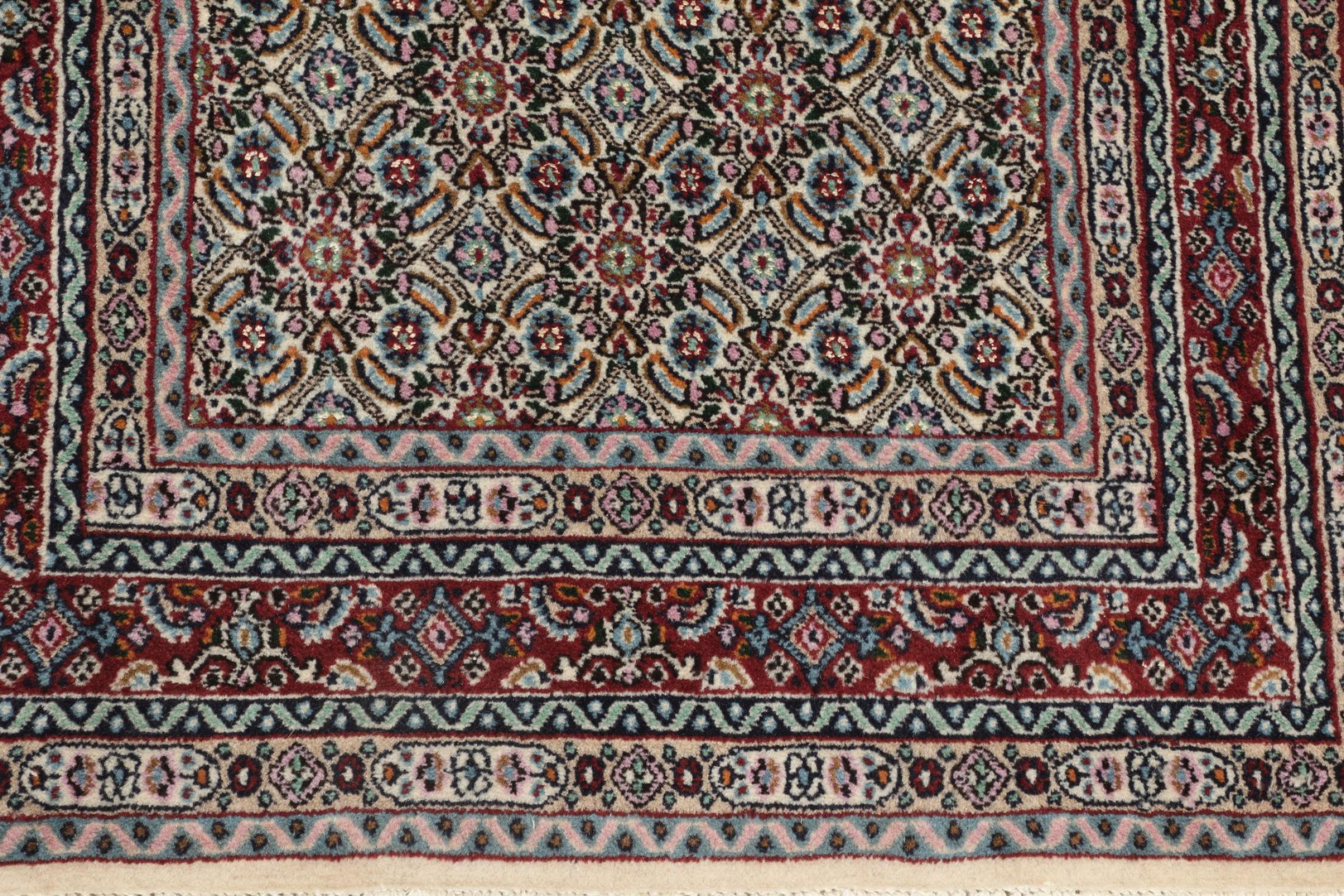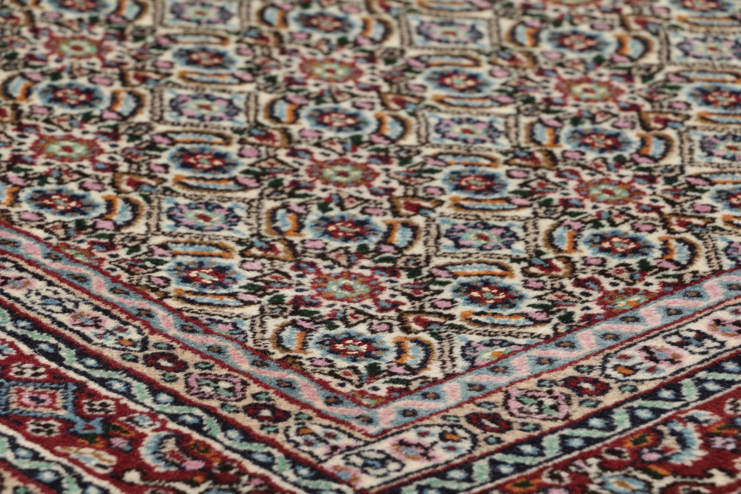 Dette tæppe fra Moud, en by 300 km syd for Mashhad, er imponerende ved første øjekast. Det typiske Herati-mønster eller havedesign værdsættes af kendere og elskere af ægte persiske tæpper. Hvis du leder efter et håndlavet tæppe af fin kvalitet med et meget unikt og karakteristisk design, er denne type tæppe det helt rigtige for dig.