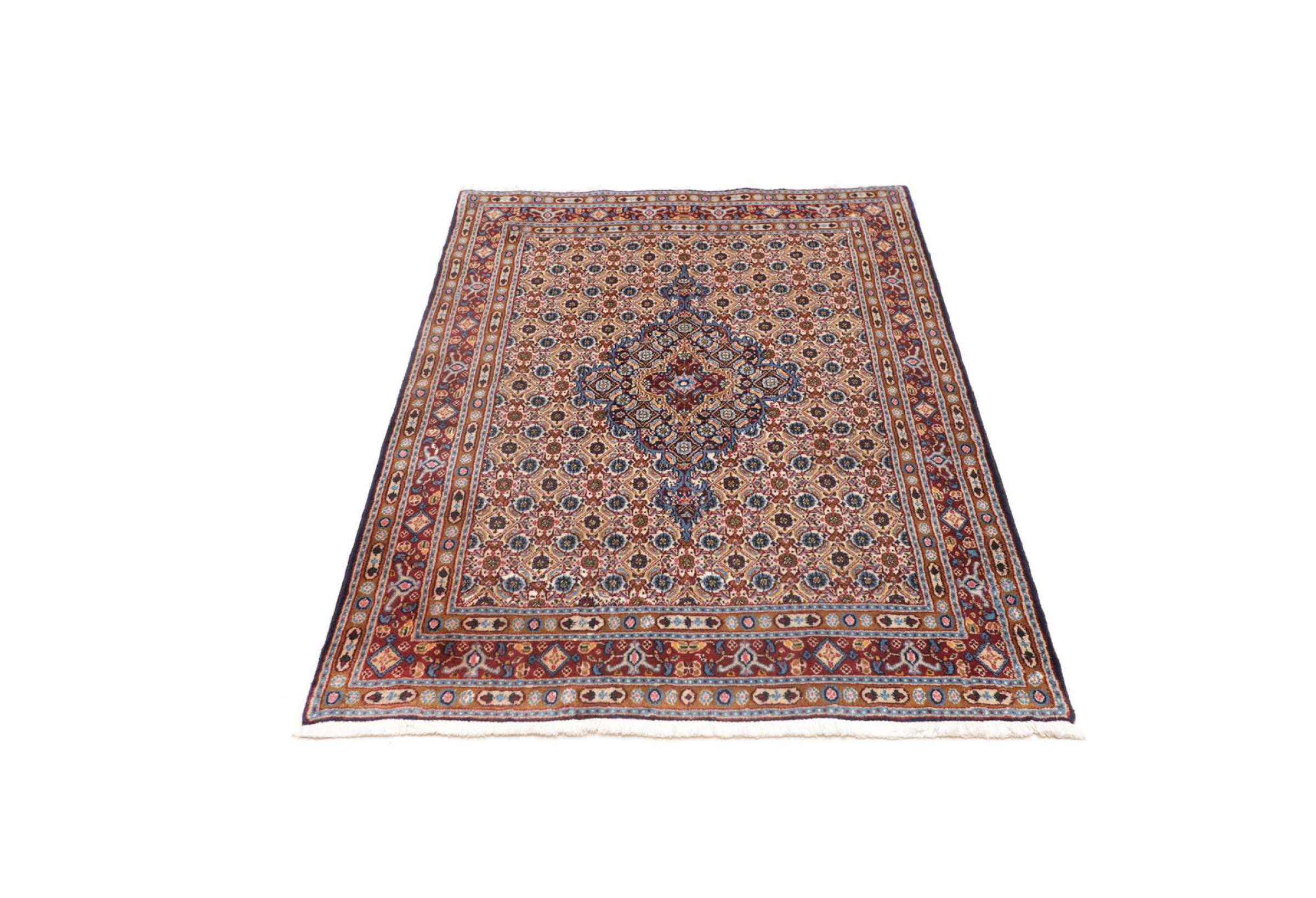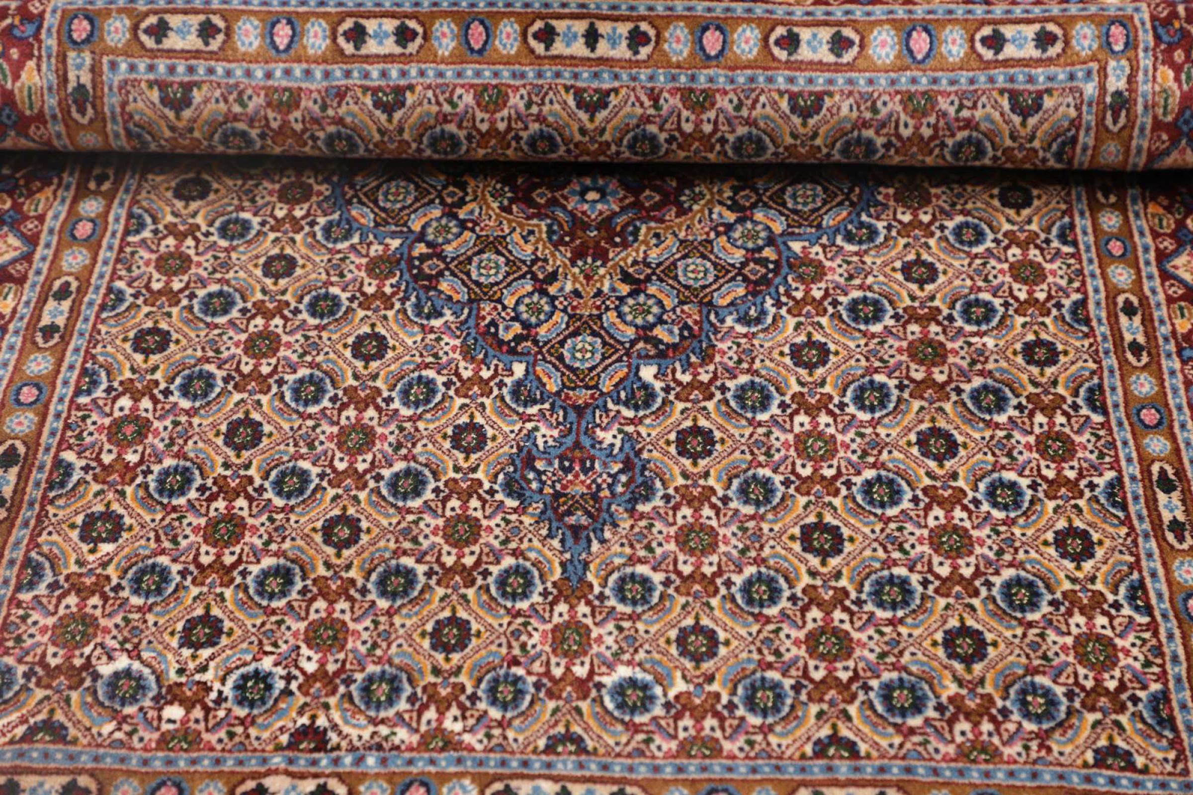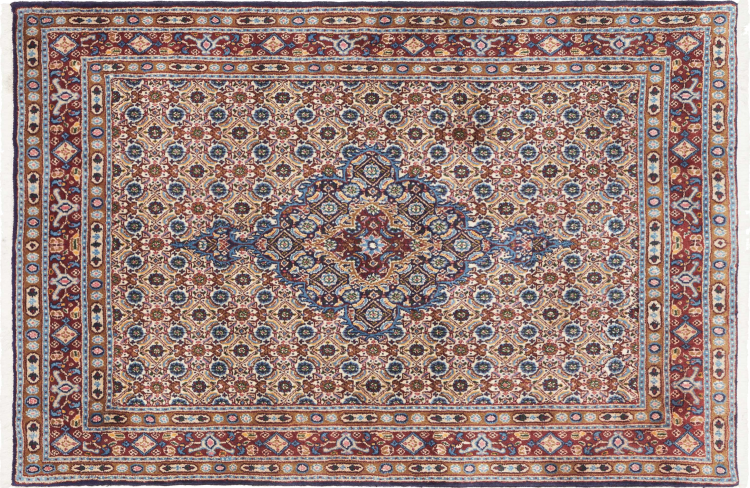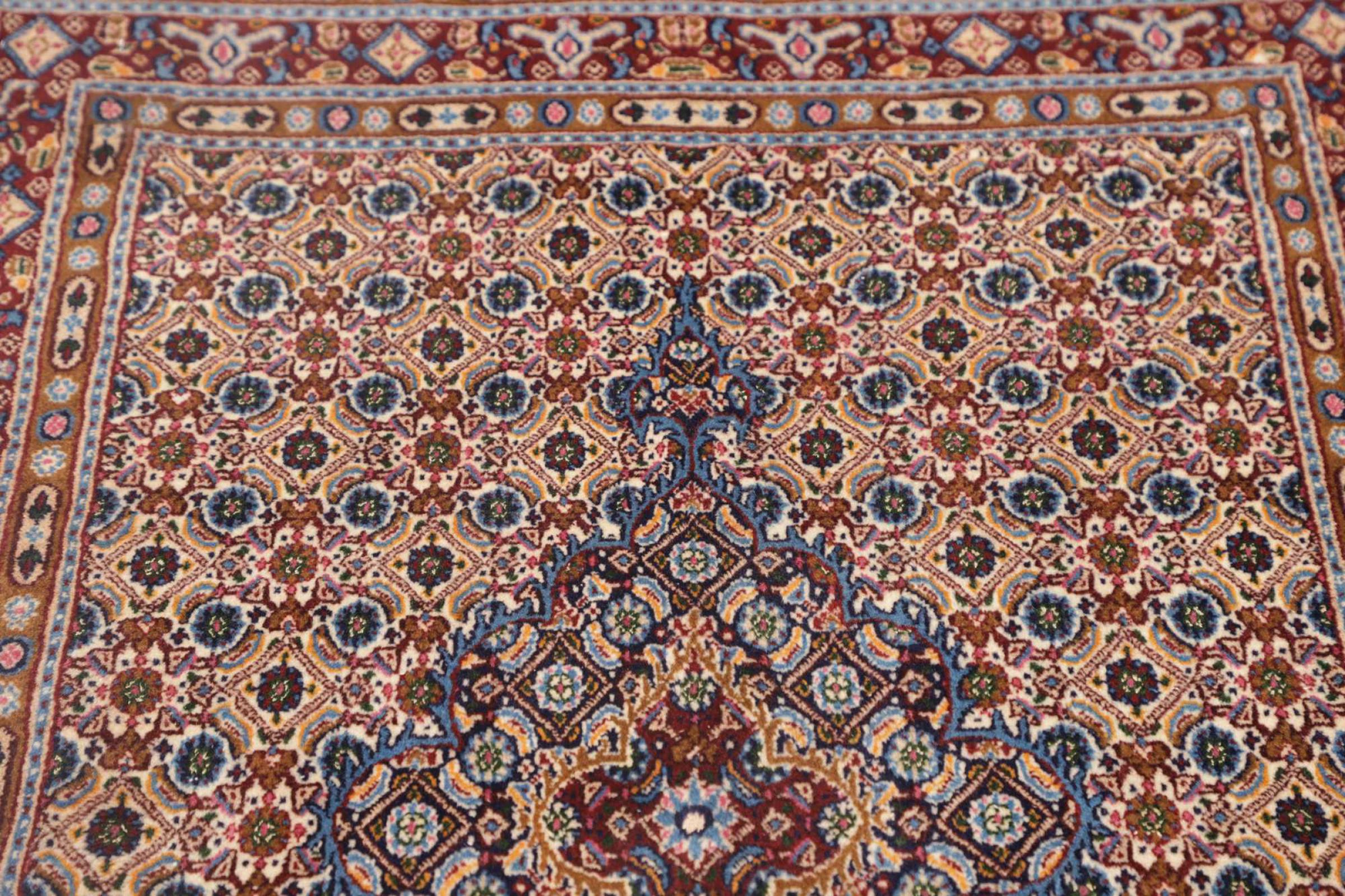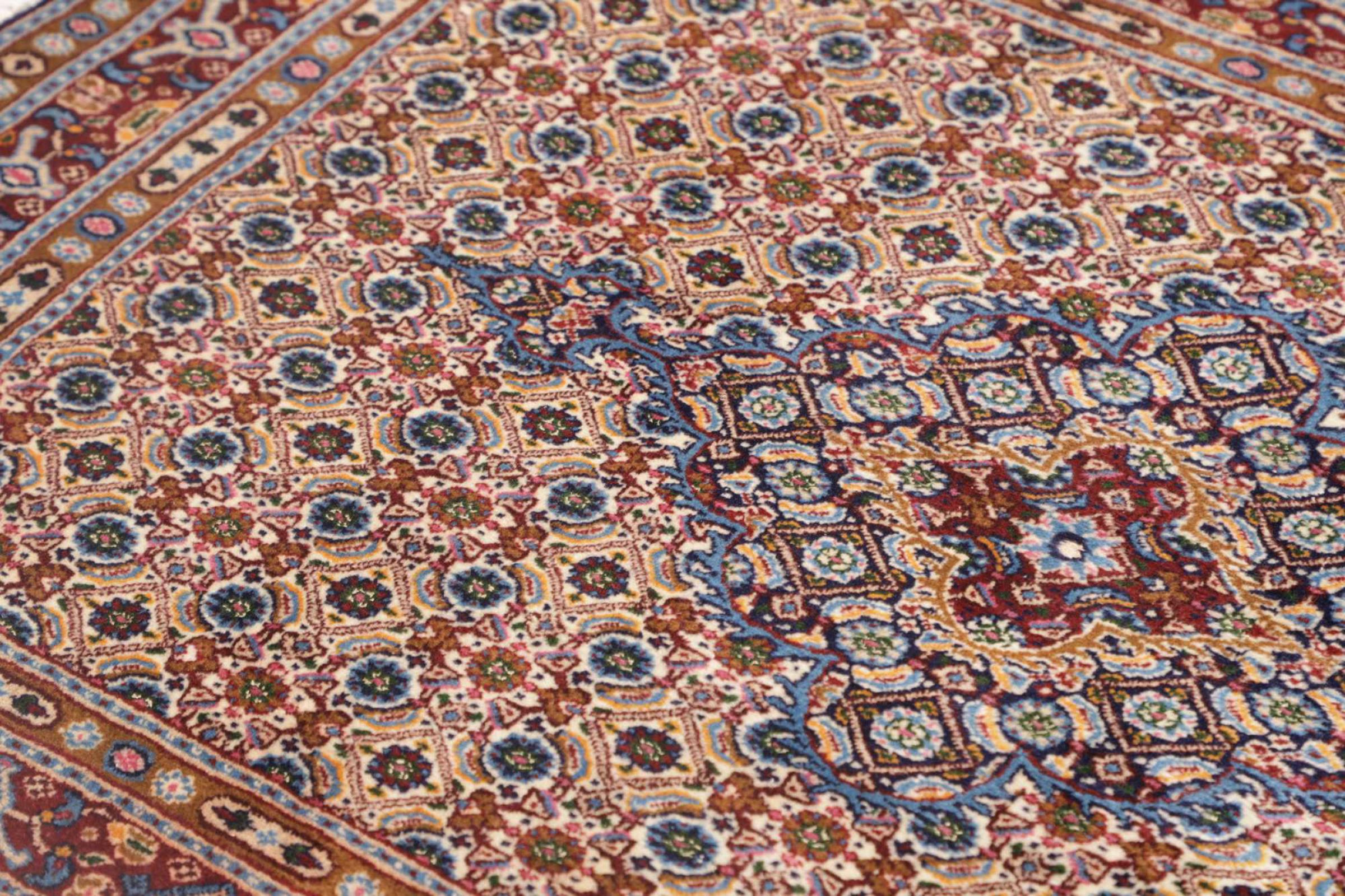 Dette tæppe fra Moud, en by 300 km syd for Mashhad, er imponerende ved første øjekast. Det typiske Herati-mønster eller havedesign værdsættes af kendere og elskere af ægte persiske tæpper. Hvis du leder efter et håndlavet tæppe af fin kvalitet med et meget unikt og karakteristisk design, er denne type tæppe det helt rigtige for dig.