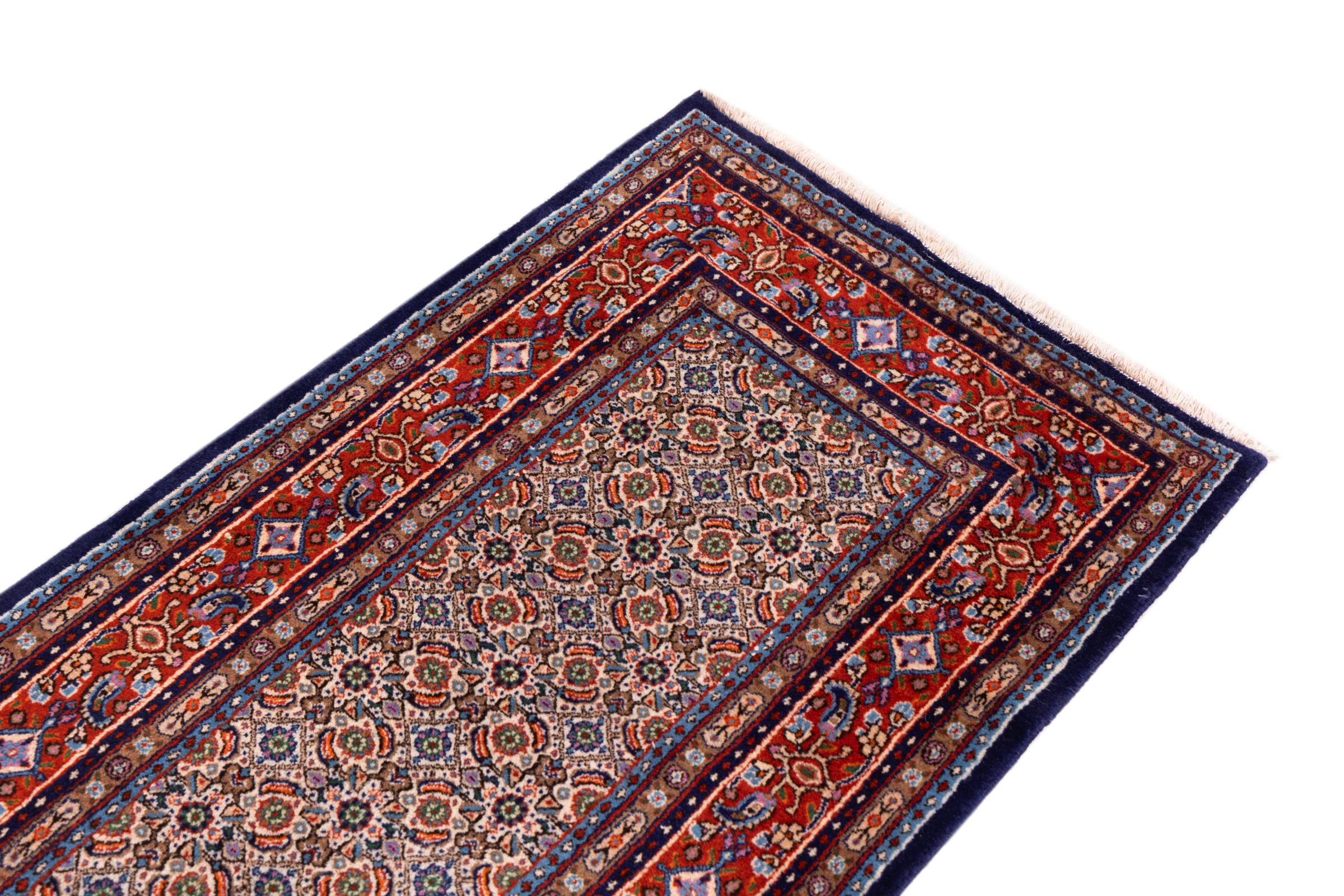 Dette tæppe fra Moud, en by 300 km syd for Mashhad, er imponerende ved første øjekast. Det typiske Herati-mønster eller havedesign værdsættes af kendere og elskere af ægte persiske tæpper. Hvis du leder efter et håndlavet tæppe af fin kvalitet med et meget unikt og karakteristisk design, er denne type tæppe det helt rigtige for dig.