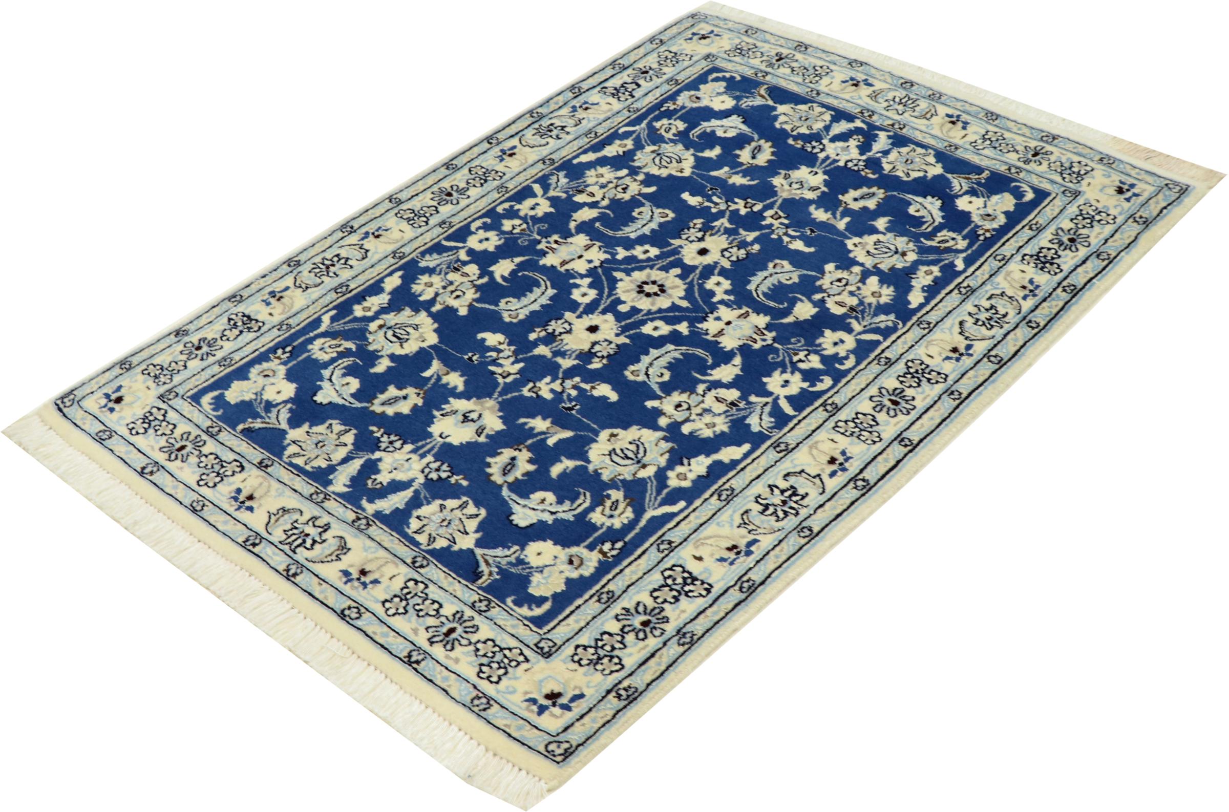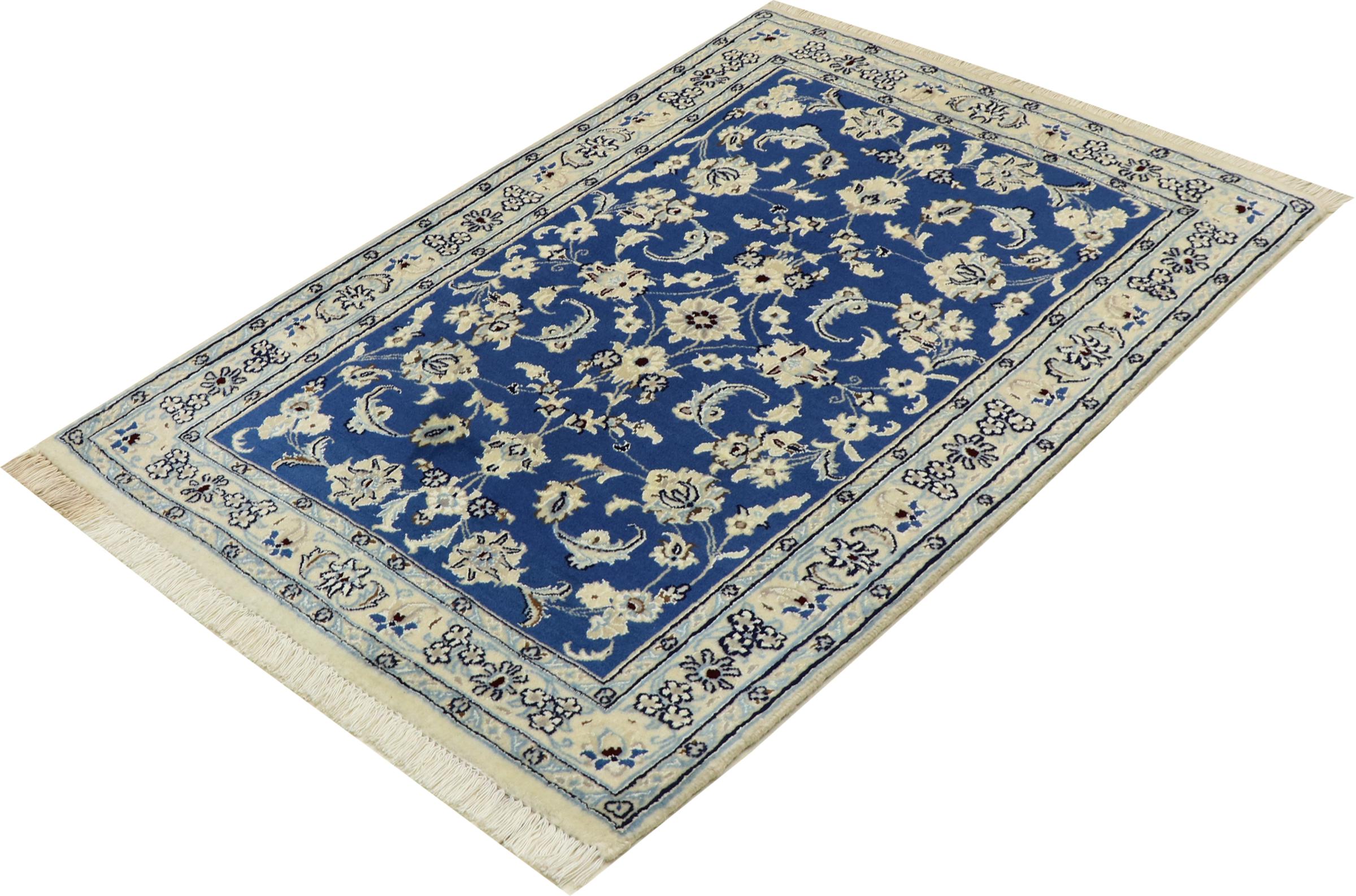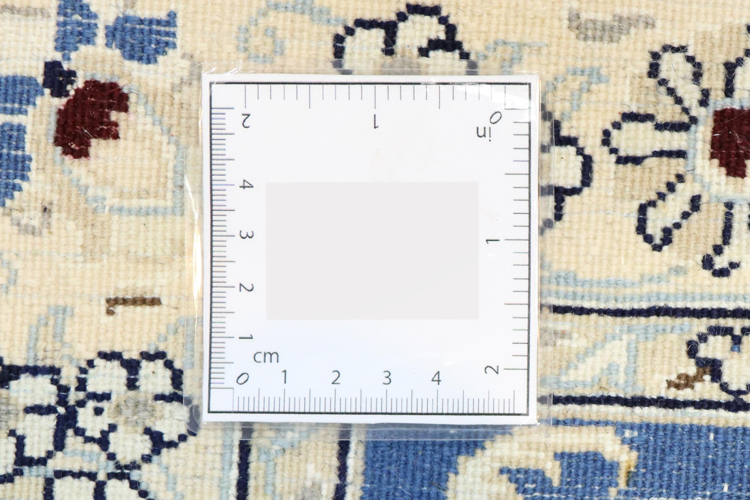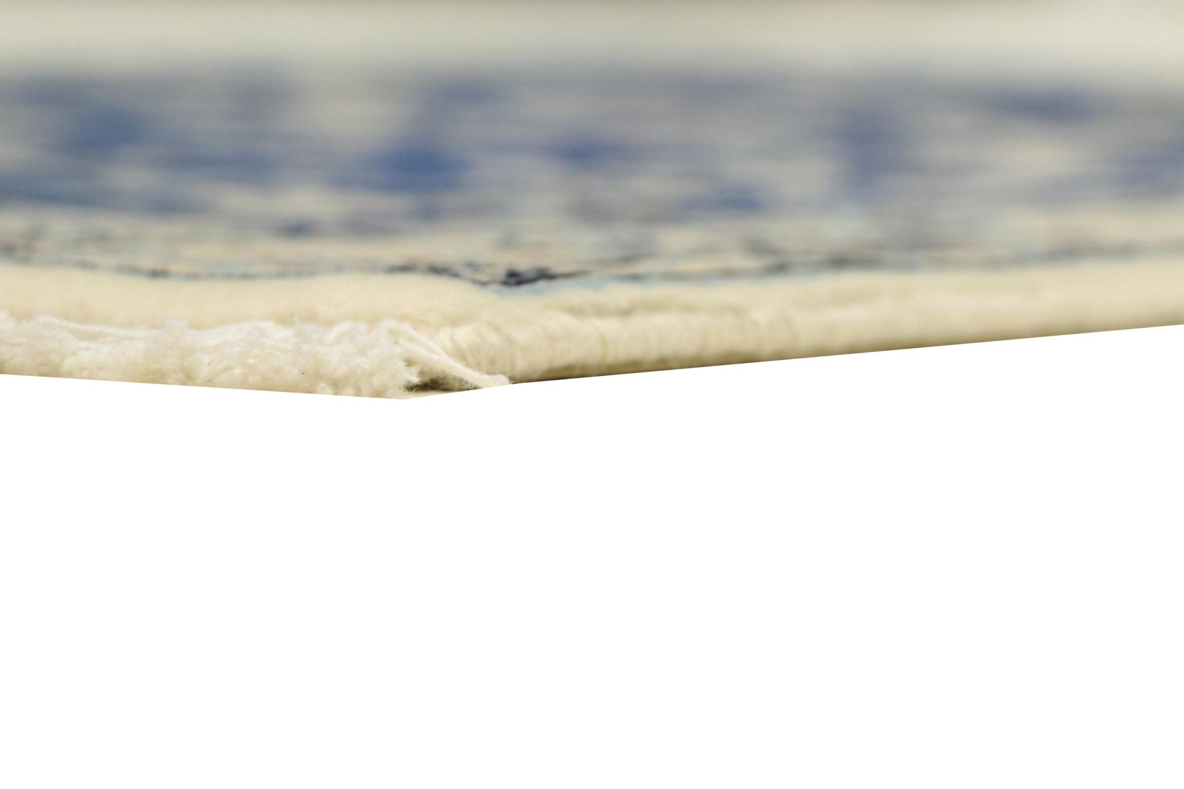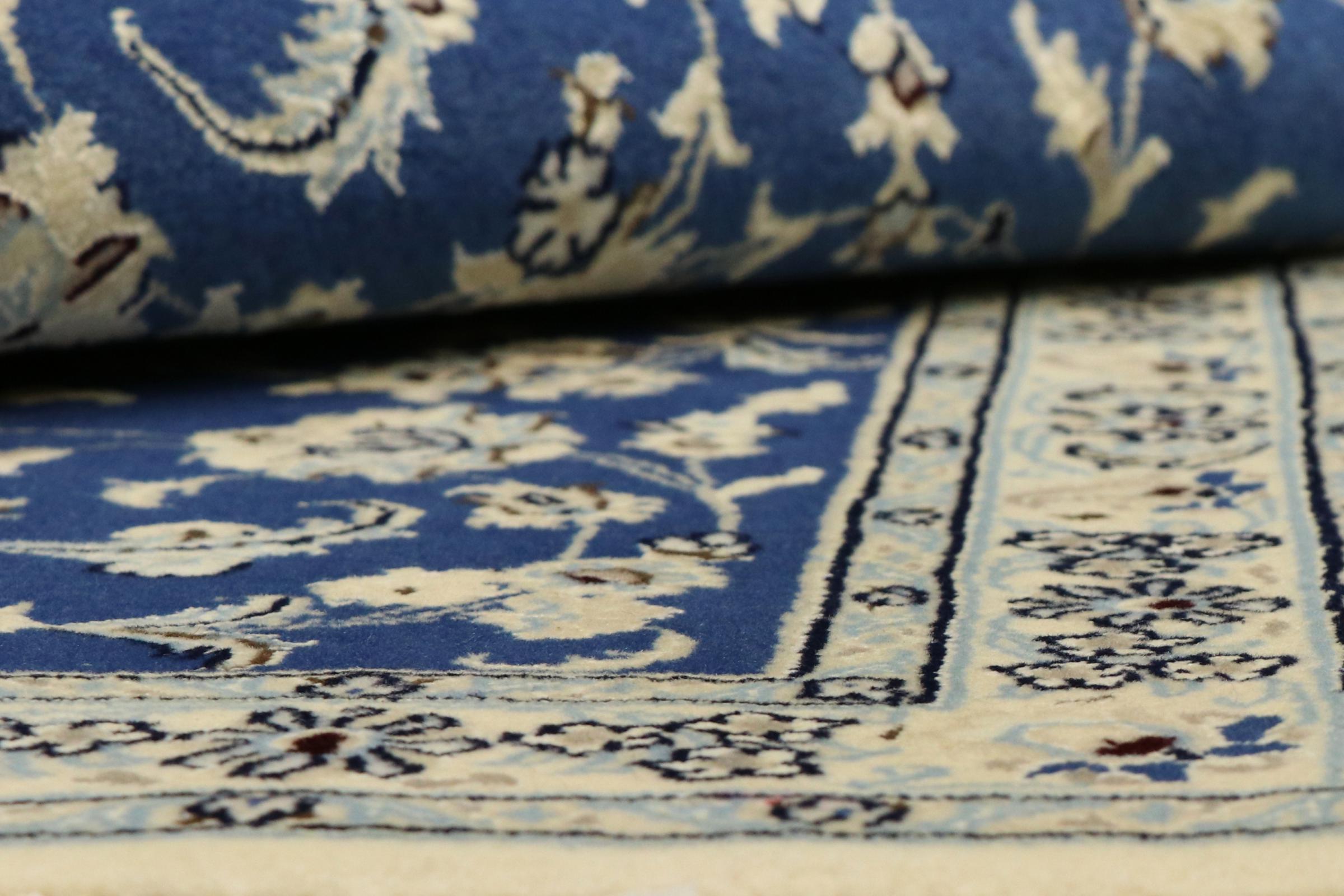 Dette Nain-tæppe er klassificeret 9La. Den fremragende kvalitet, det smukke orientalske design med sine buede mønstre glæder enhver køber. Dette persiske tæppe blev håndknyttet af højkvalitets uld og natursilke i byen Nain, som ligger i den vestlige udkant af Dasht-e-Kavir-ørkenen. 9La Nain er væsentligt finere end en 12La og viser allerede smukke detaljer.