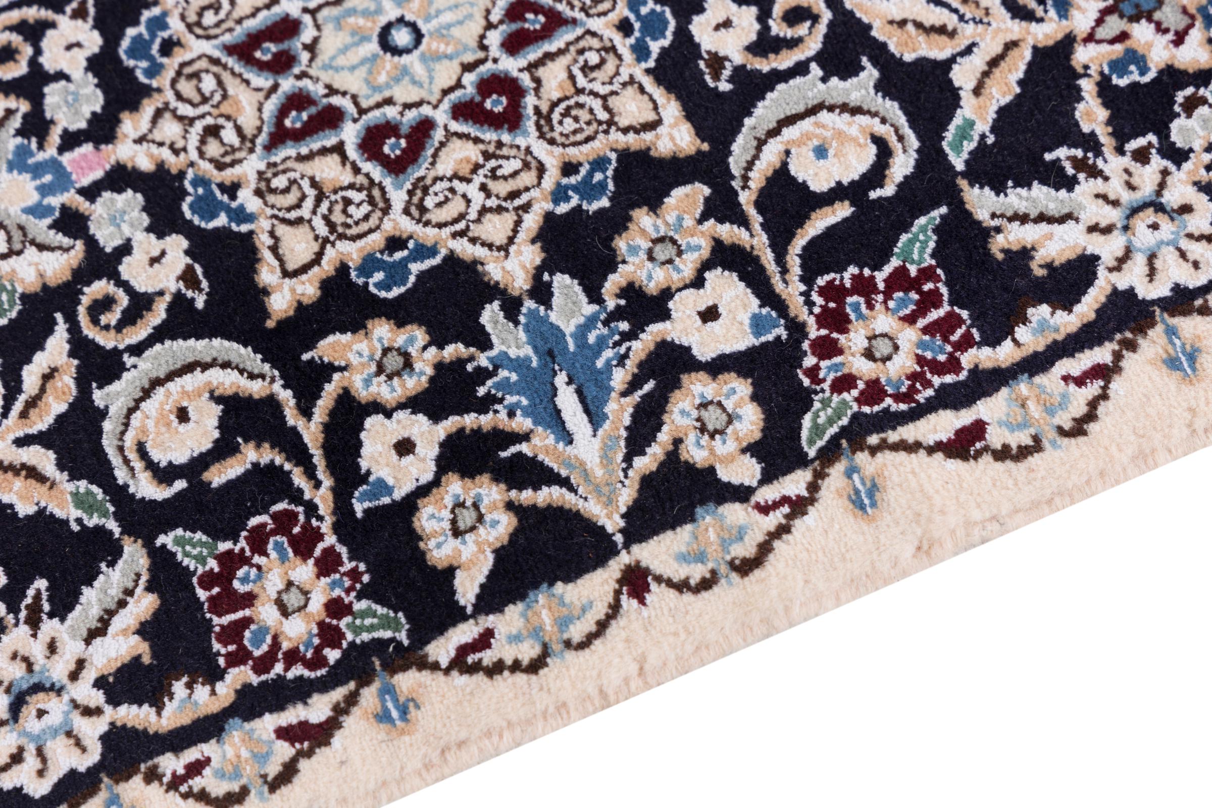 Dette Nain-tæppe er klassificeret 9La. Den fremragende kvalitet, det smukke orientalske design med sine buede mønstre glæder enhver køber. Dette persiske tæppe blev håndknyttet af højkvalitets uld og natursilke i byen Nain, som ligger i den vestlige udkant af Dasht-e-Kavir-ørkenen. 9La Nain er væsentligt finere end en 12La og viser allerede smukke detaljer.