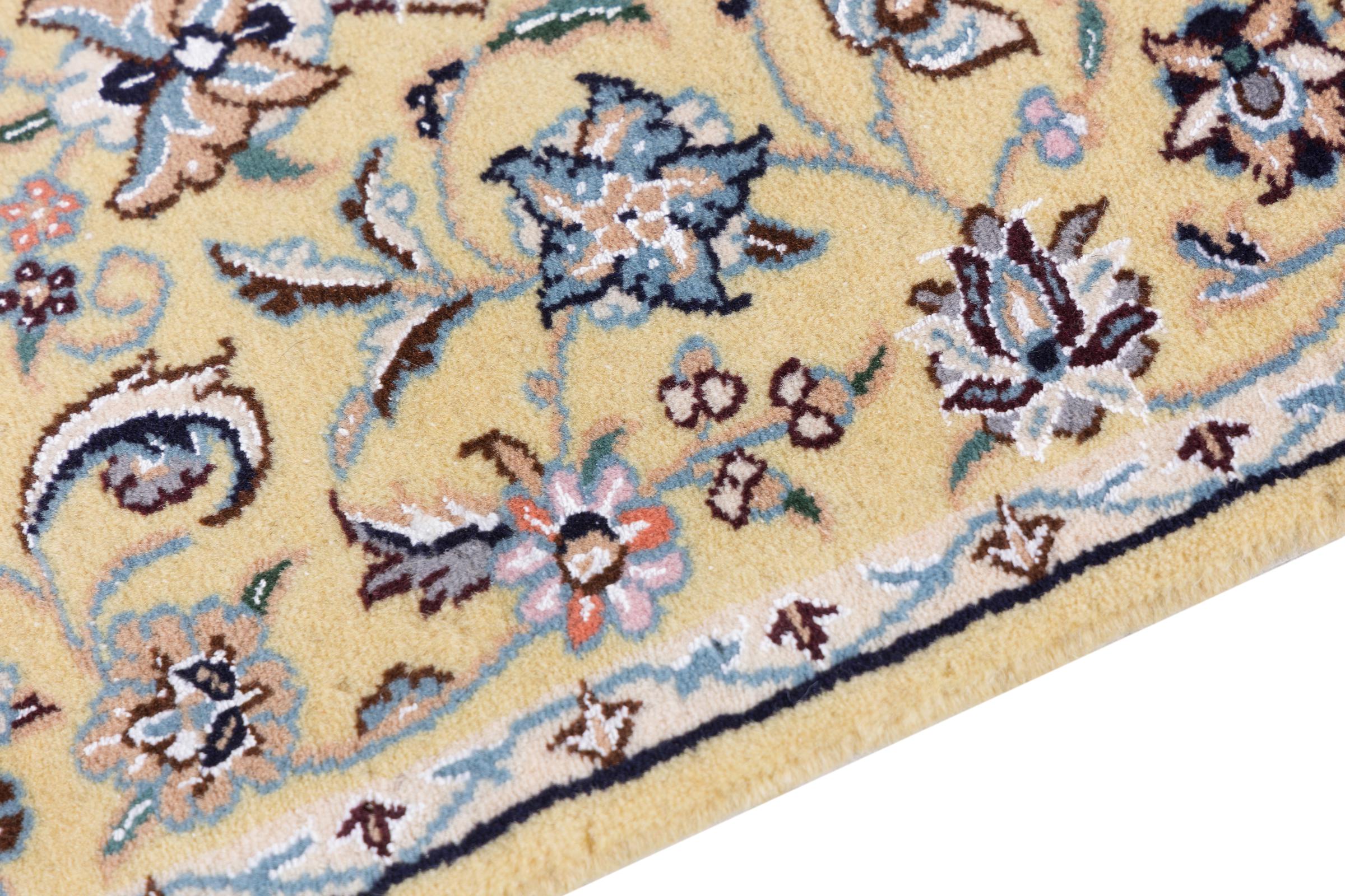 Dette Nain-tæppe er klassificeret 9La. Den fremragende kvalitet, det smukke orientalske design med sine buede mønstre glæder enhver køber. Dette persiske tæppe blev håndknyttet af højkvalitets uld og natursilke i byen Nain, som ligger i den vestlige udkant af Dasht-e-Kavir-ørkenen. 9La Nain er væsentligt finere end en 12La og viser allerede smukke detaljer.