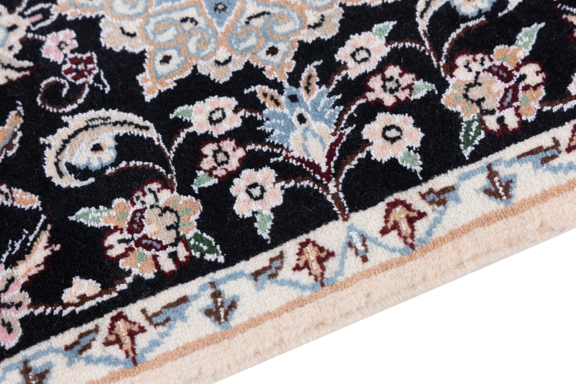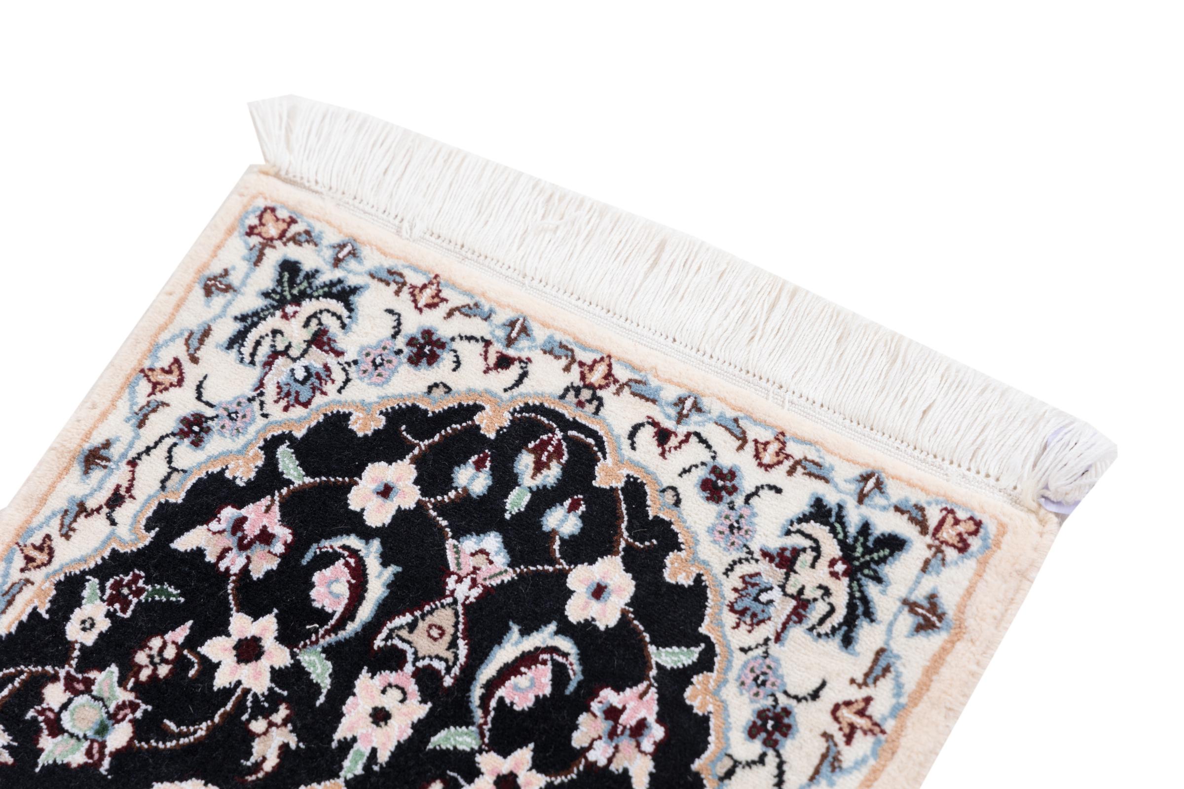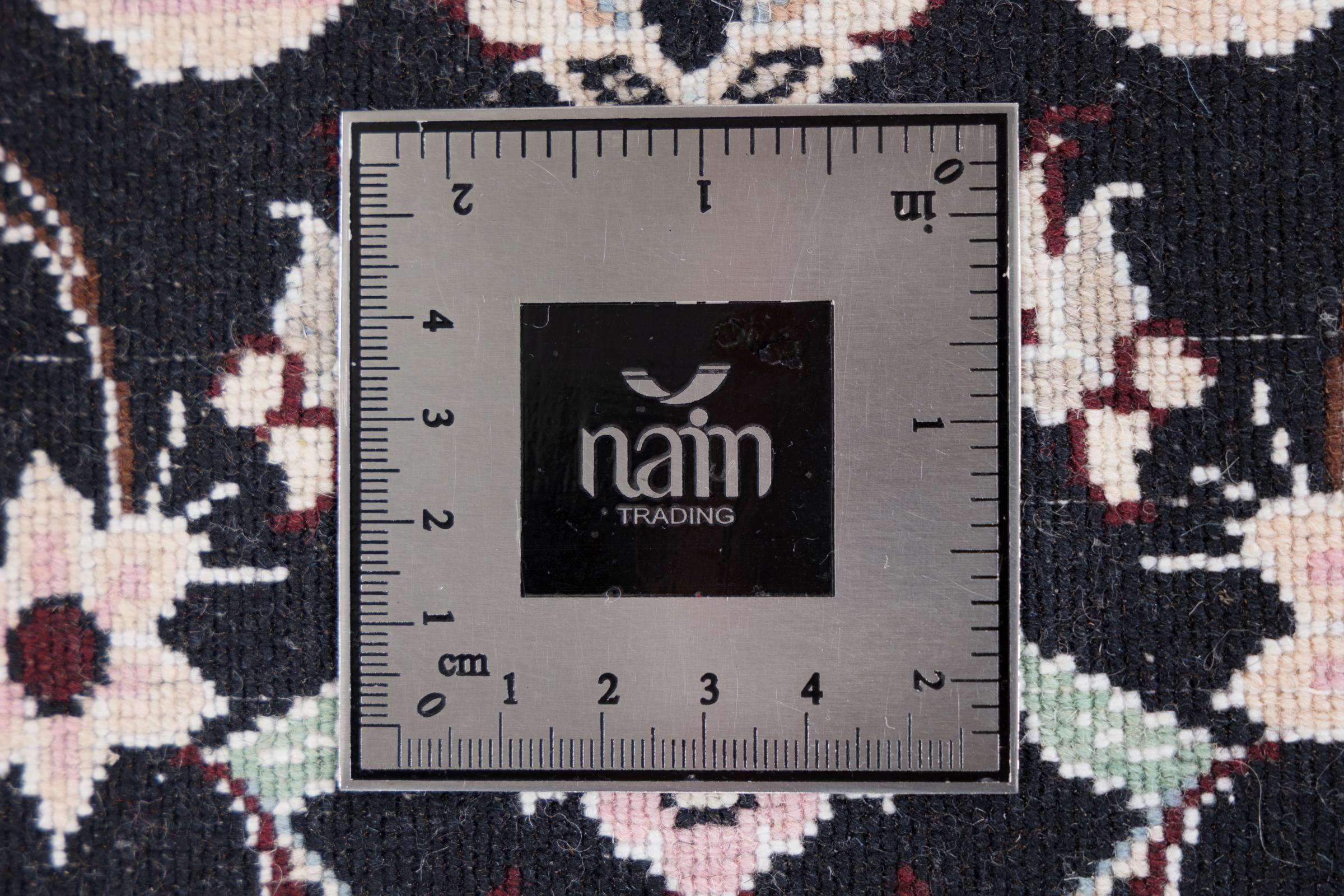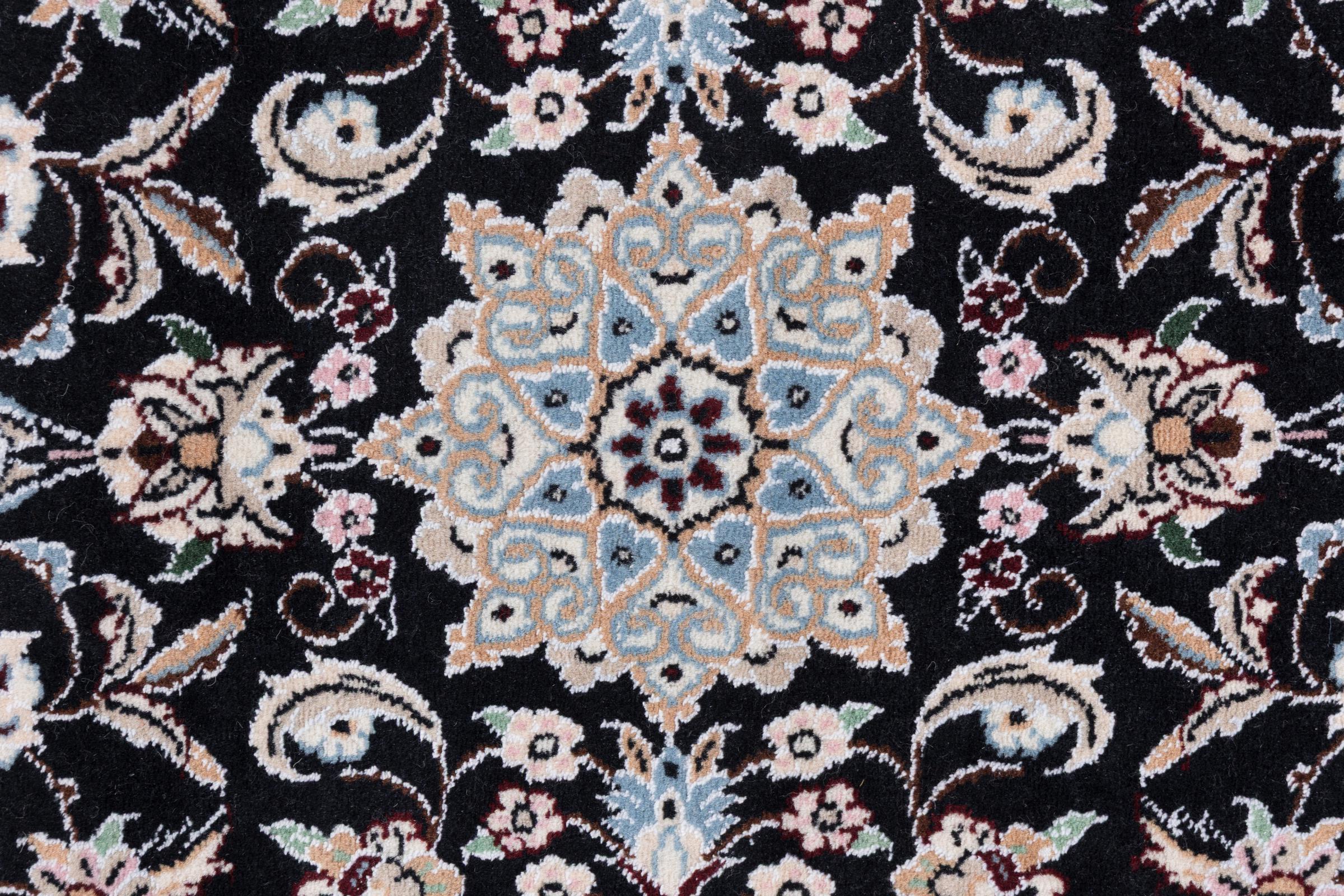 Dette Nain-tæppe er klassificeret 9La. Den fremragende kvalitet, det smukke orientalske design med sine buede mønstre glæder enhver køber. Dette persiske tæppe blev håndknyttet af højkvalitets uld og natursilke i byen Nain, som ligger i den vestlige udkant af Dasht-e-Kavir-ørkenen. 9La Nain er væsentligt finere end en 12La og viser allerede smukke detaljer.