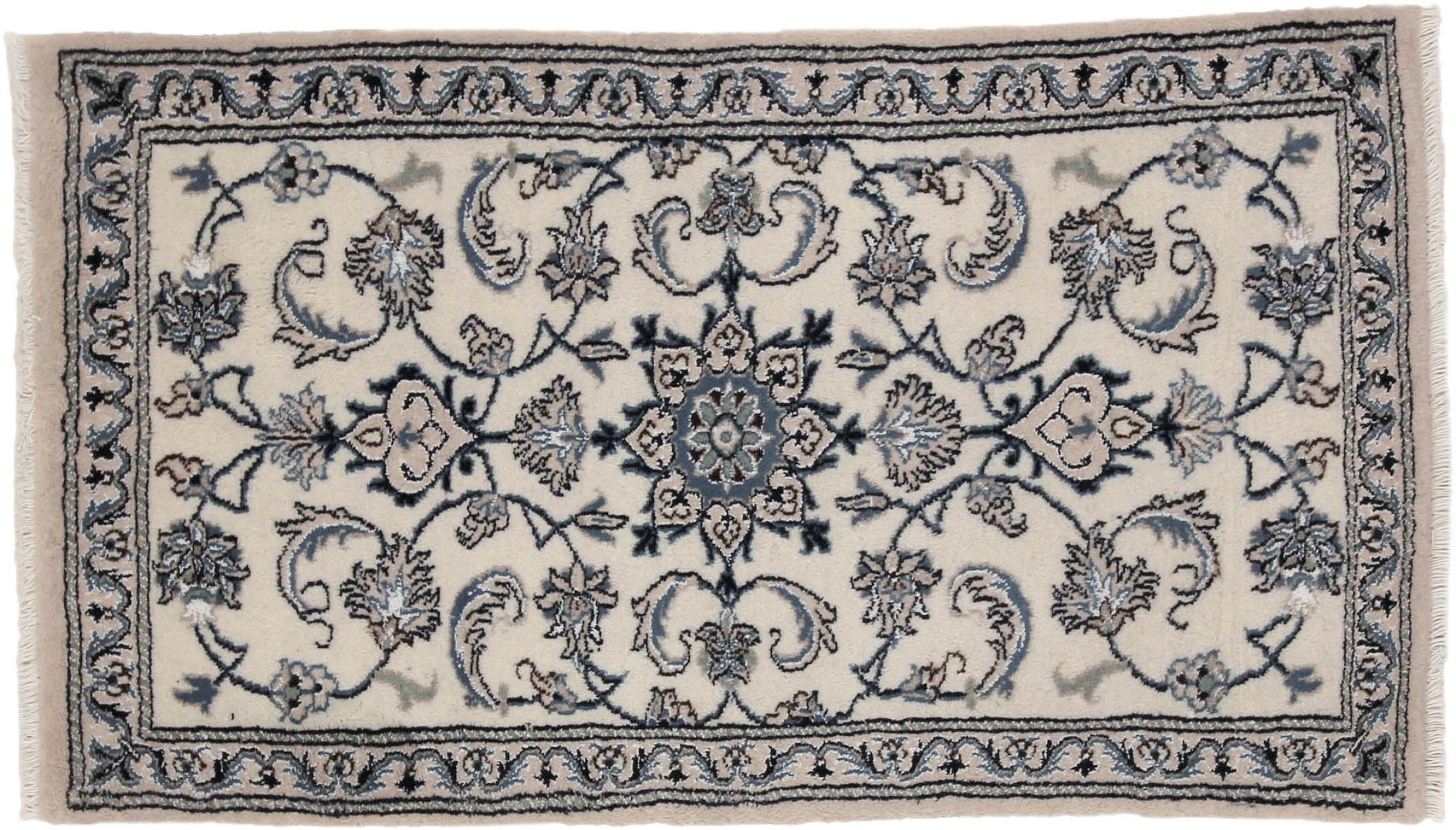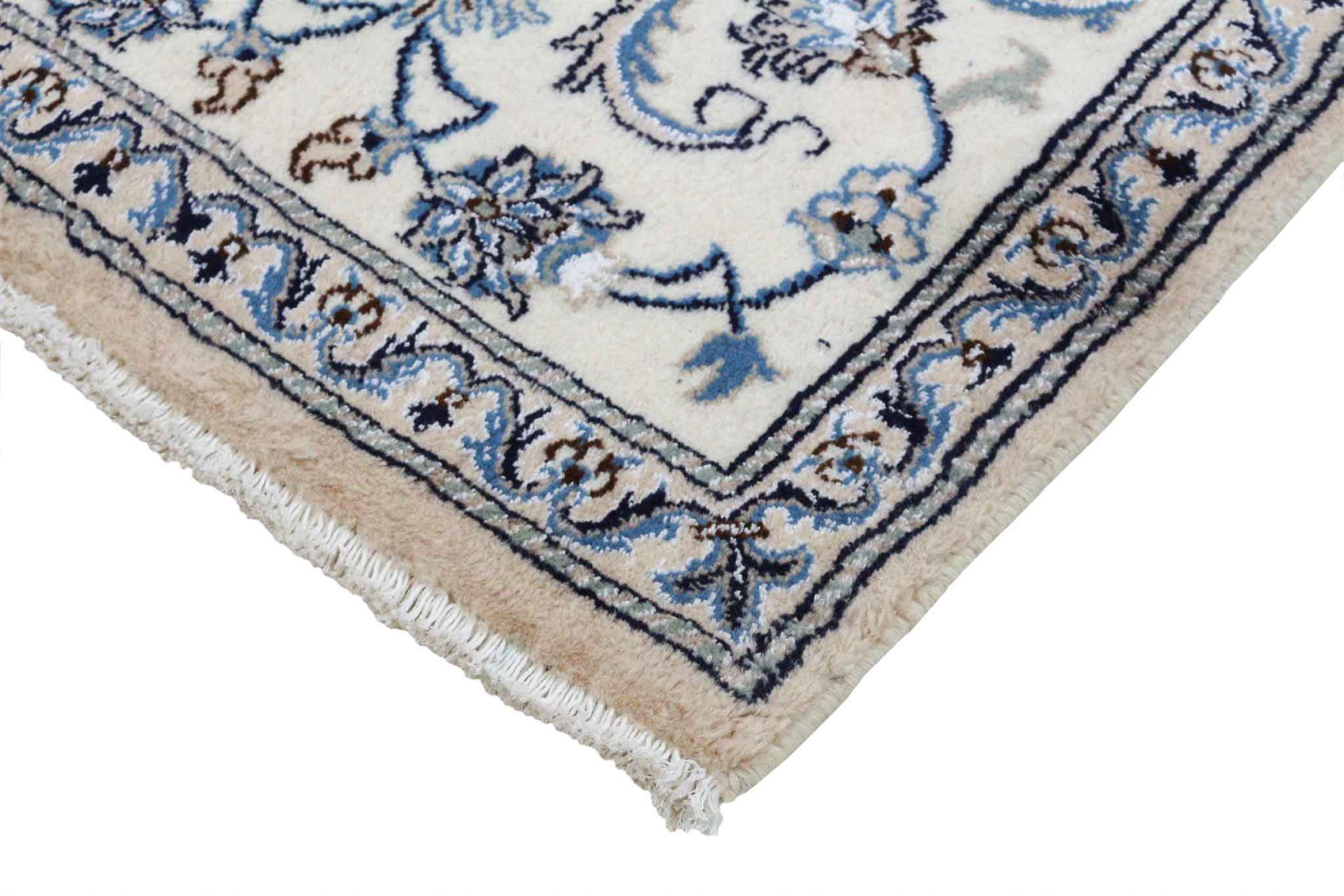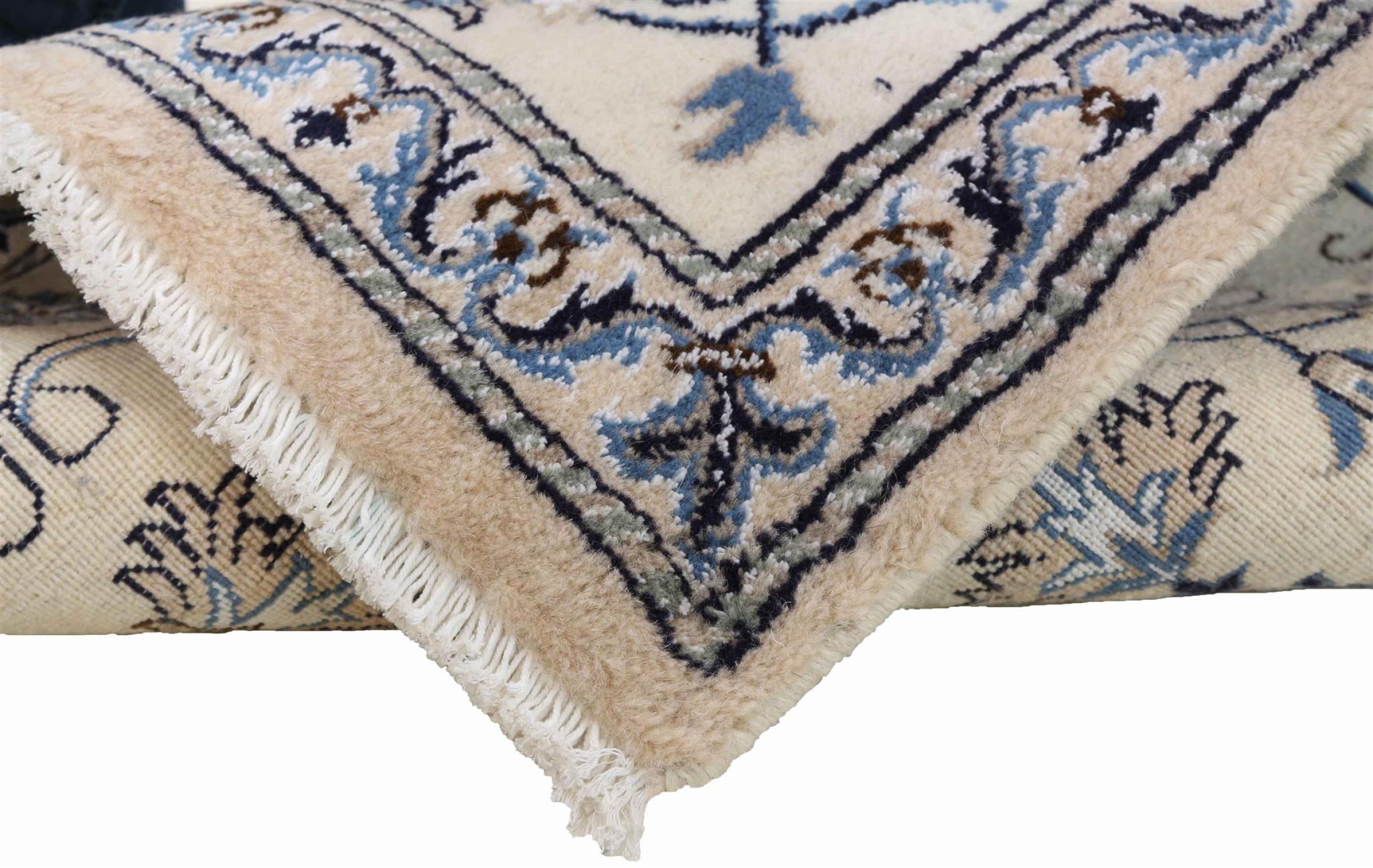 Dette Nain tæppe er vurderet til 12La. Det ser elegant og ædelt ud i sit typiske Nain-farveskema. Dette persiske tæppe blev håndknyttet af højkvalitets uld og natursilke i byen Nain, som ligger i den vestlige udkant af Dasht-e-Kavir-ørkenen. Med 12La er den ikke så fint og detaljeret udsmykket som en Nain 9La eller 6La.