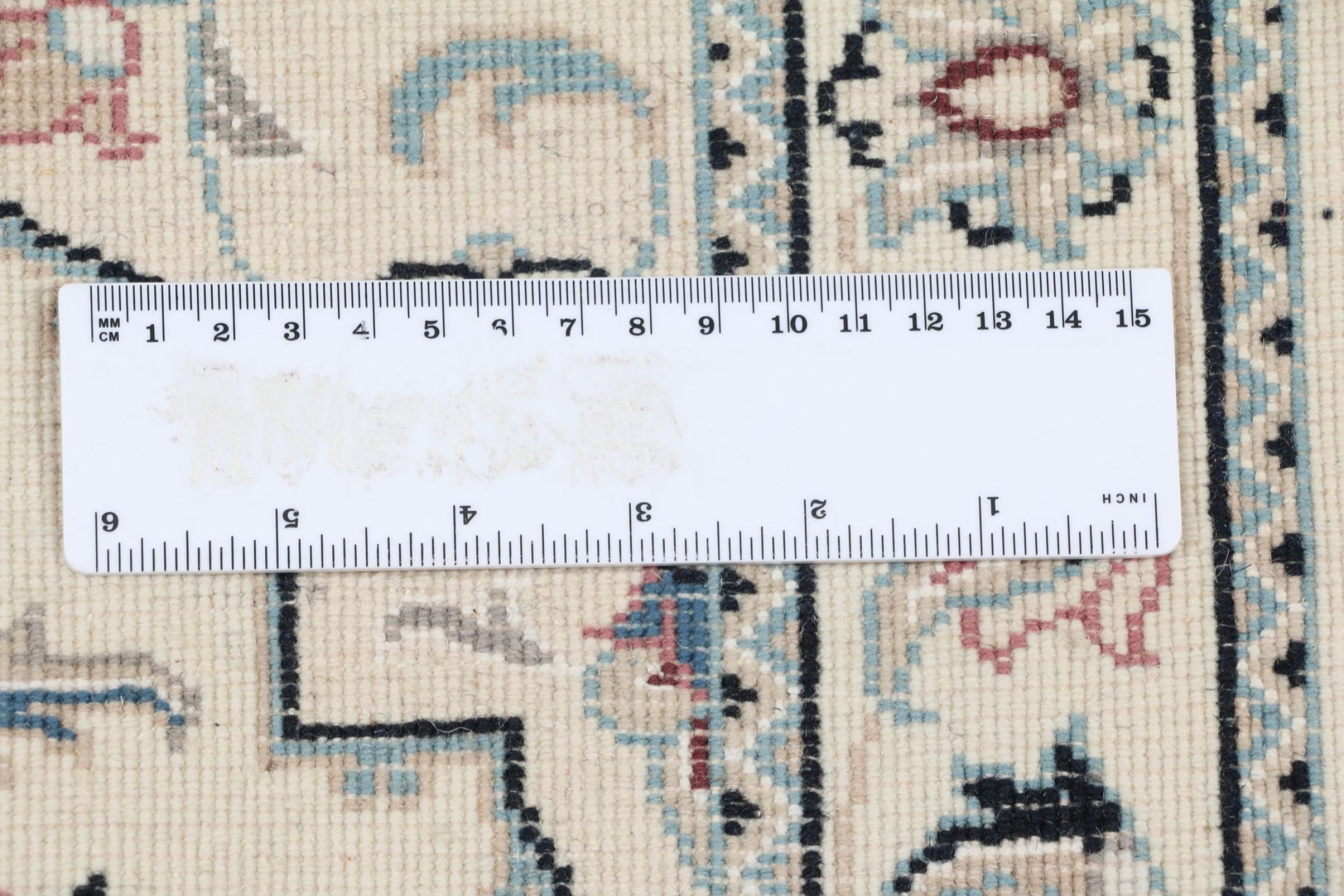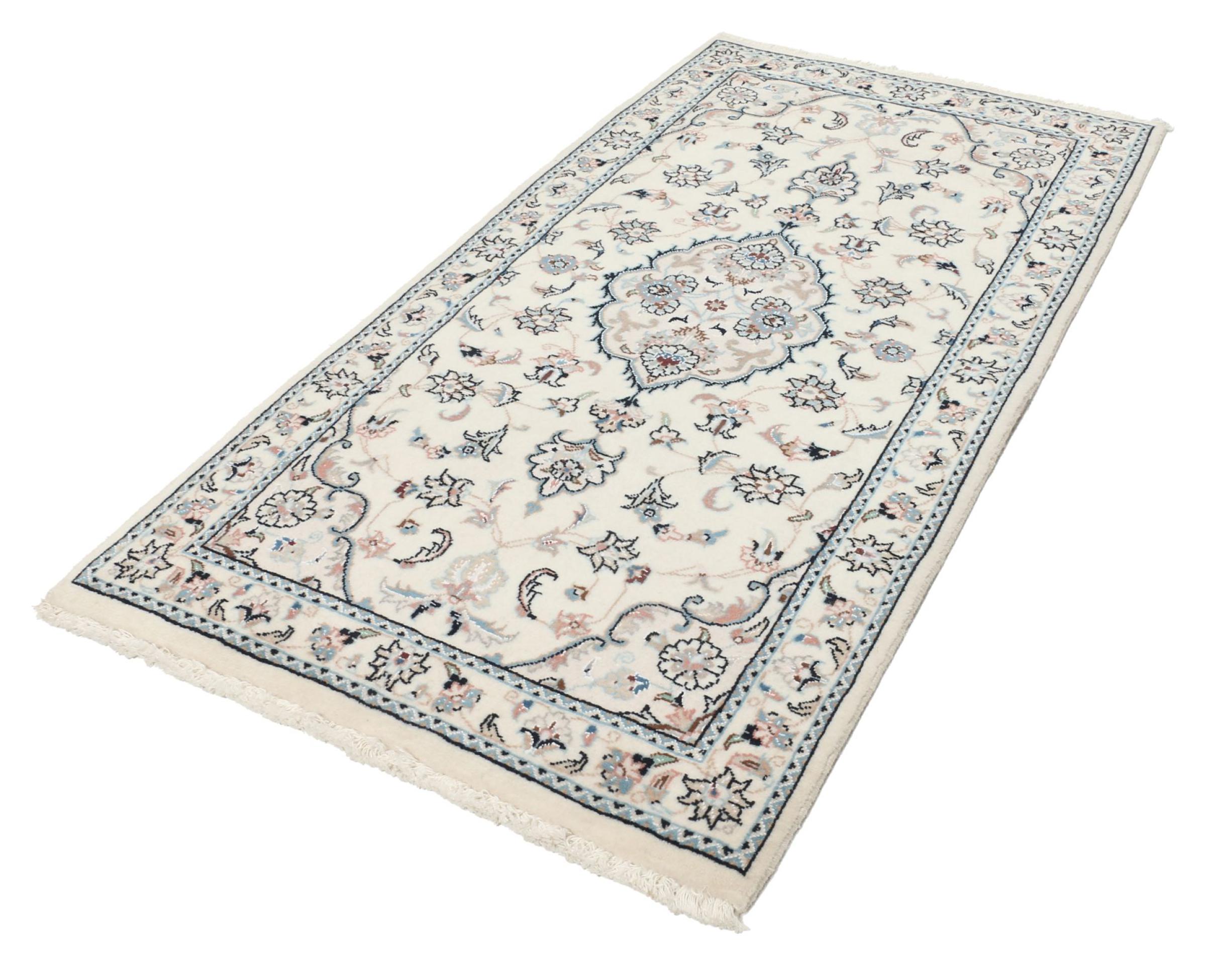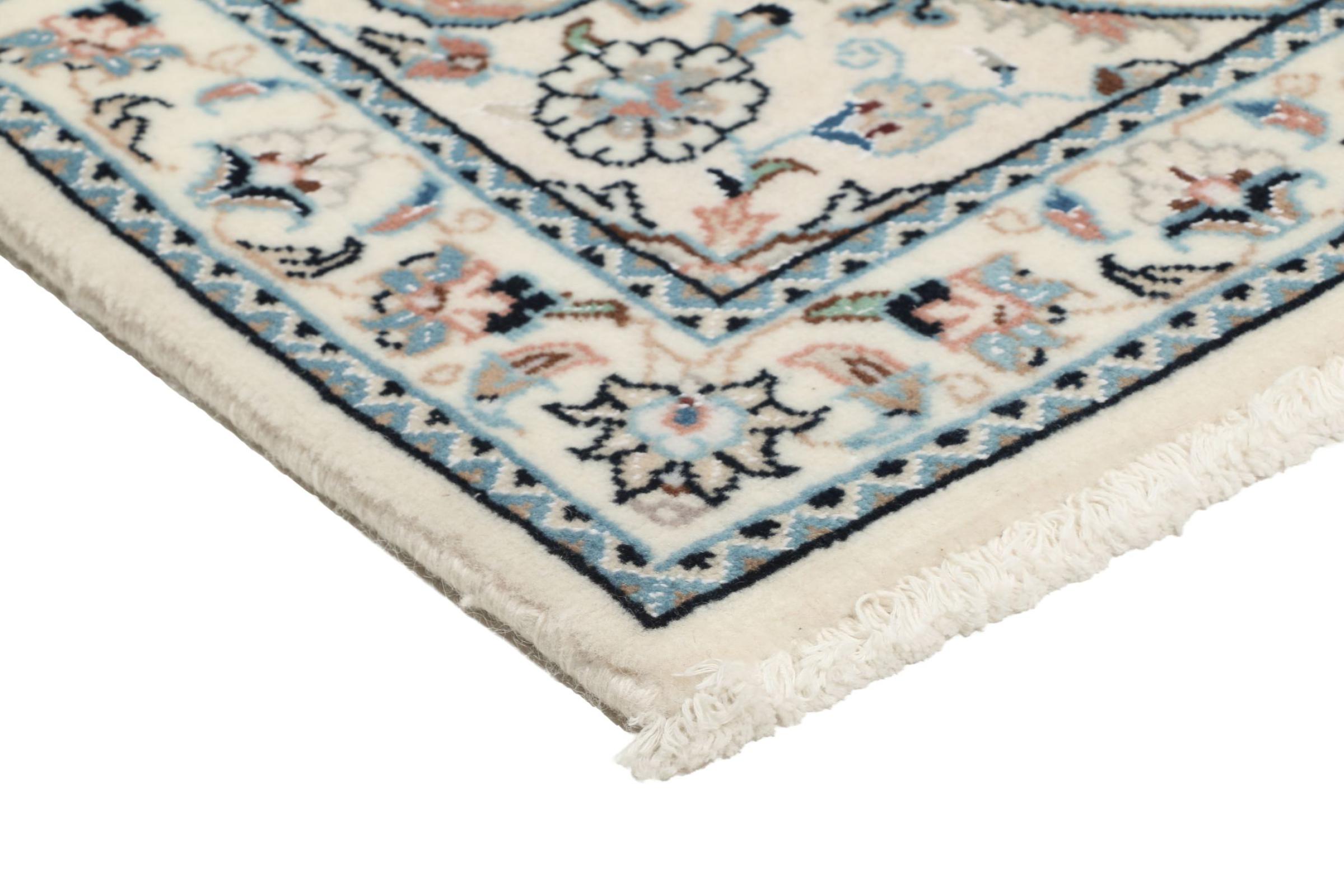 Dette Nain-tæppe er klassificeret 9La. Den fremragende kvalitet, det smukke orientalske design med sine buede mønstre glæder enhver køber. Dette persiske tæppe blev håndknyttet af højkvalitets uld og natursilke i byen Nain, som ligger i den vestlige udkant af Dasht-e-Kavir-ørkenen. 9La Nain er væsentligt finere end en 12La og viser allerede smukke detaljer.