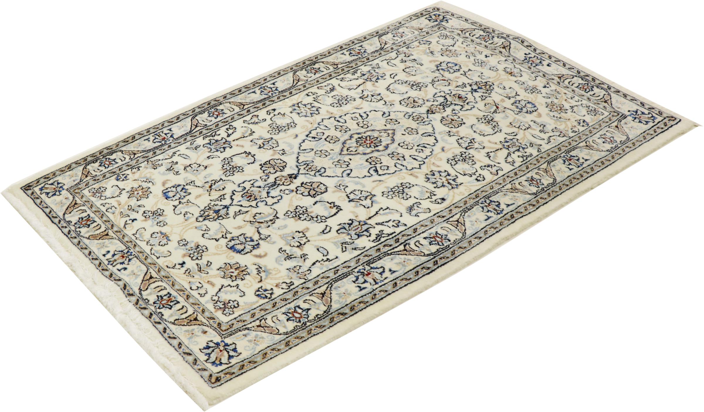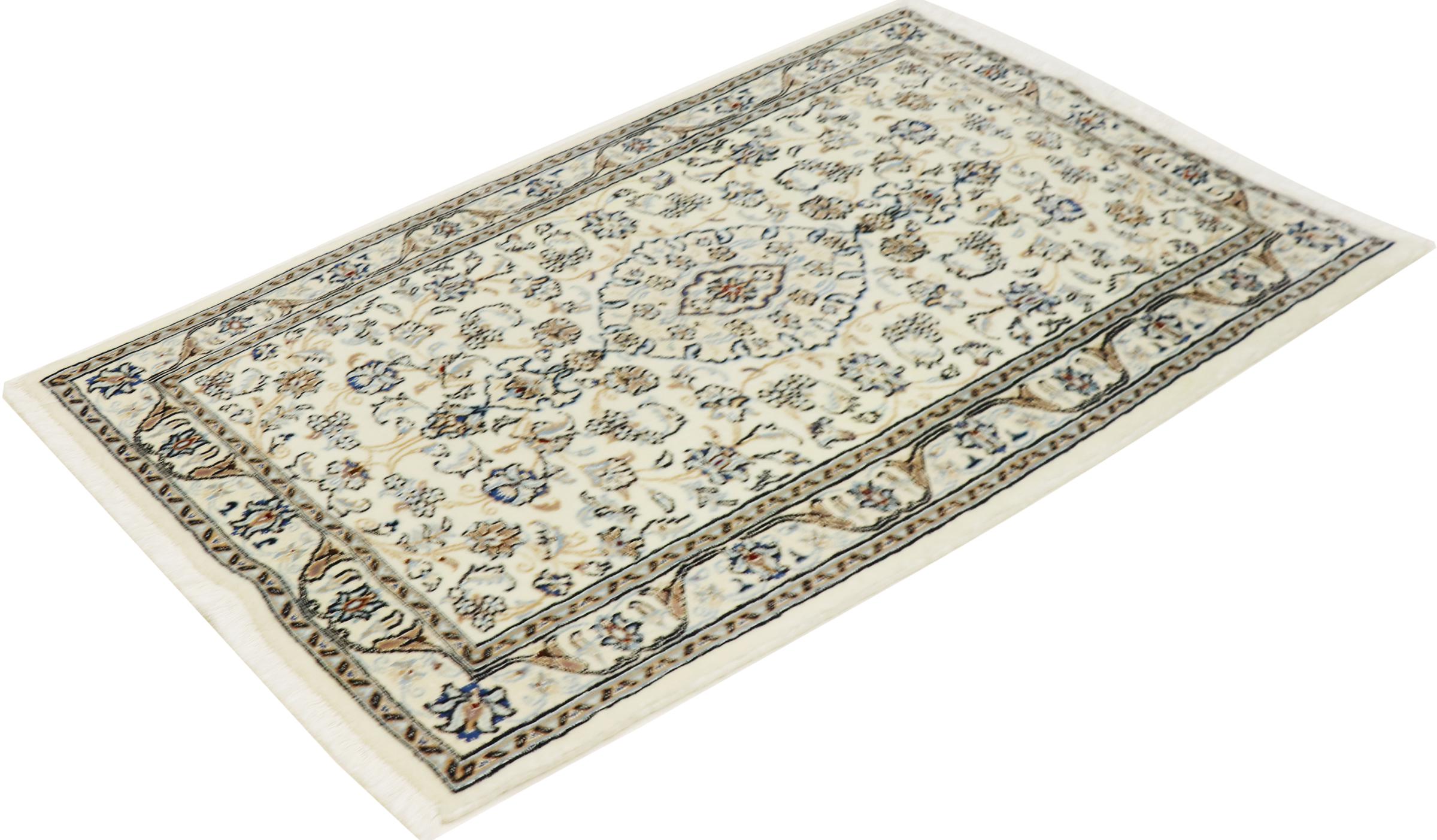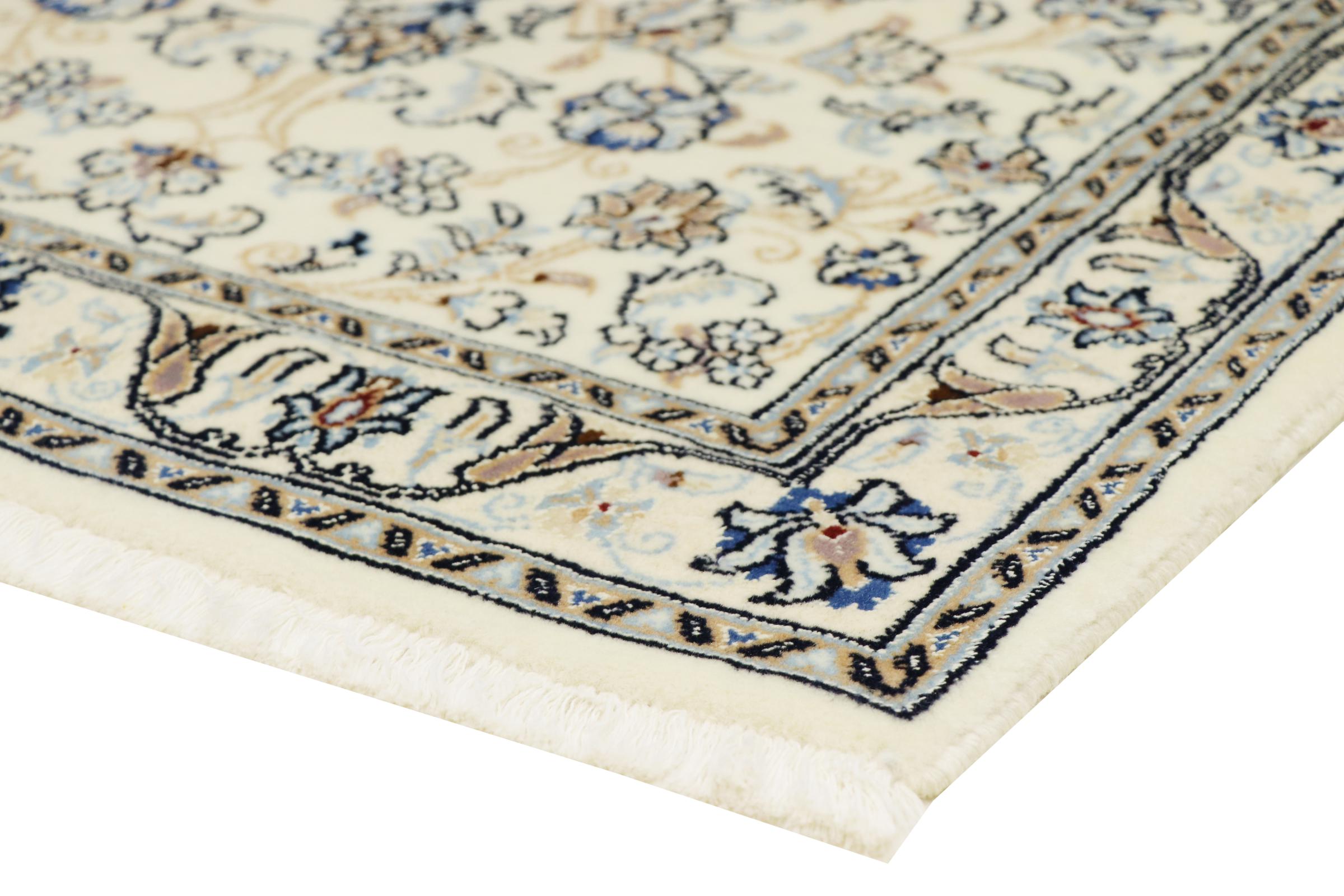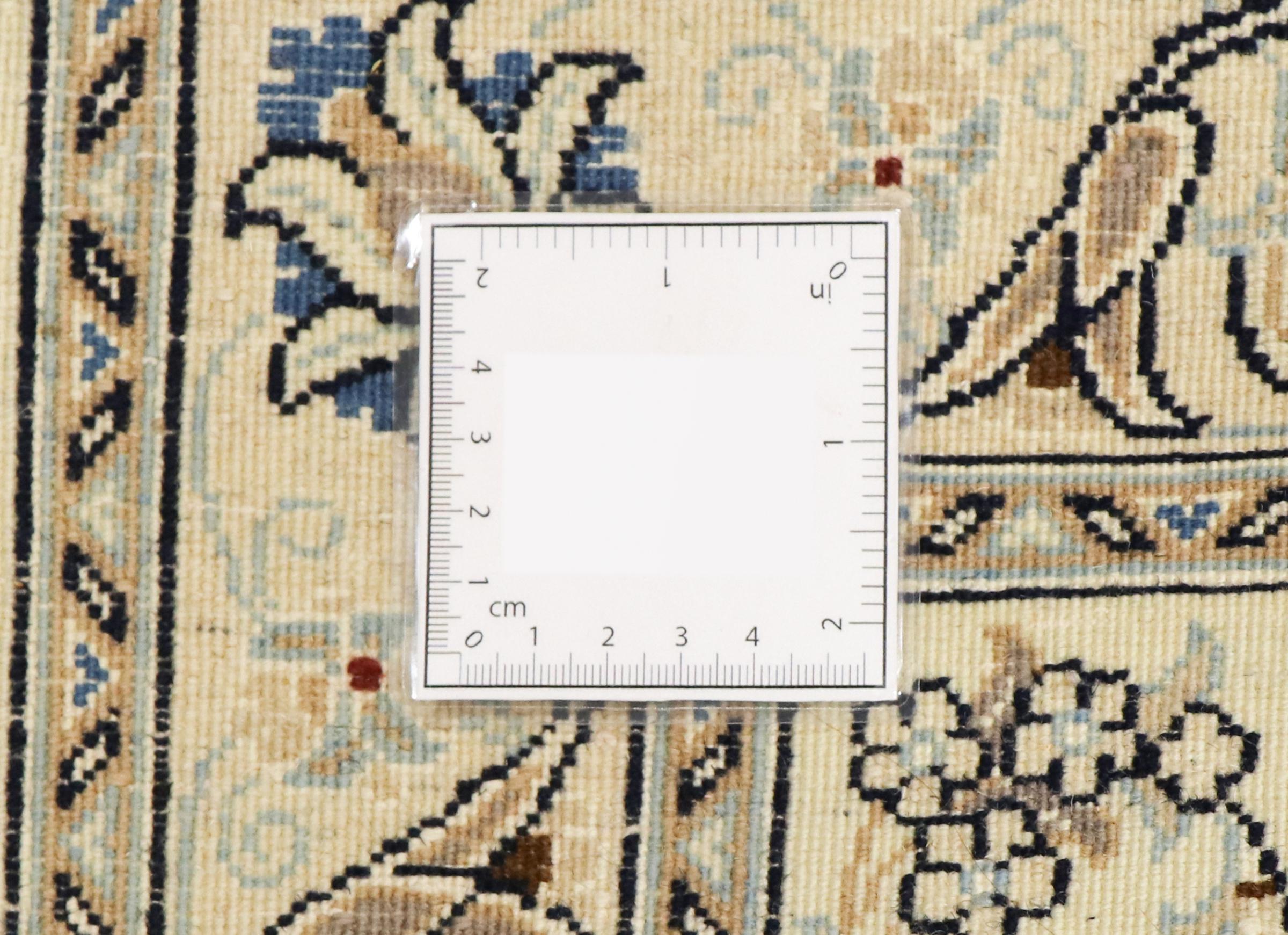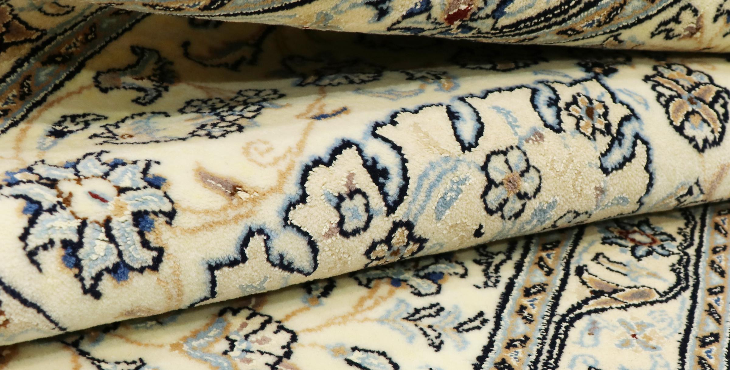 Dette Nain-tæppe er klassificeret 9La. Den fremragende kvalitet, det smukke orientalske design med sine buede mønstre glæder enhver køber. Dette persiske tæppe blev håndknyttet af højkvalitets uld og natursilke i byen Nain, som ligger i den vestlige udkant af Dasht-e-Kavir-ørkenen. 9La Nain er væsentligt finere end en 12La og viser allerede smukke detaljer.