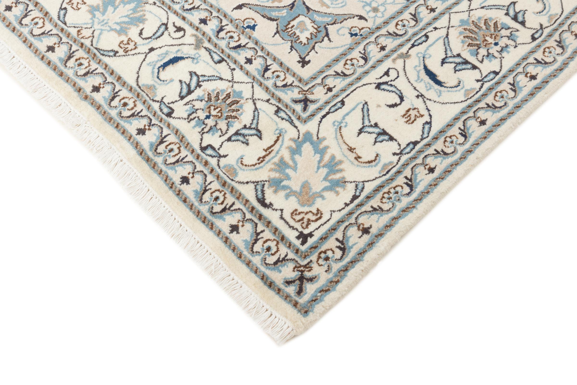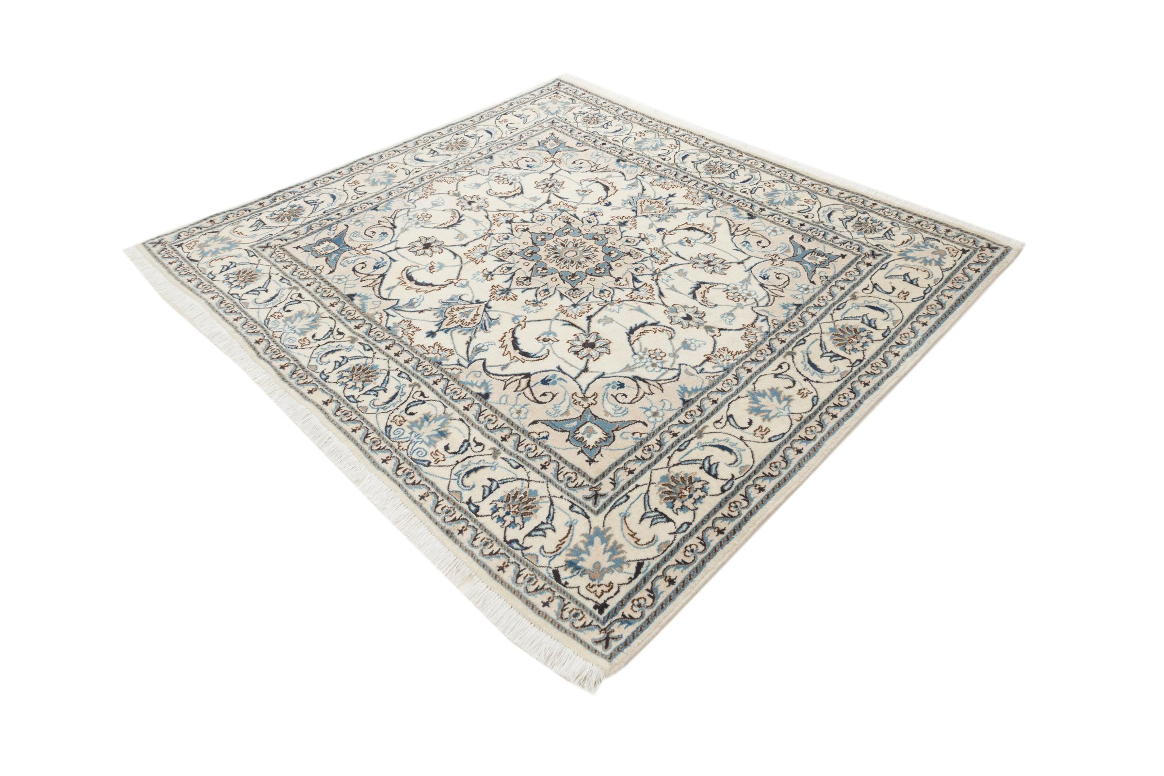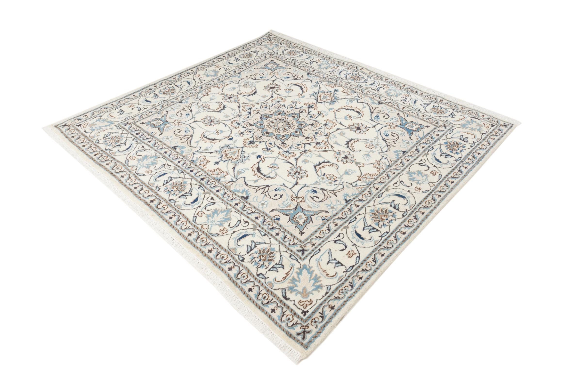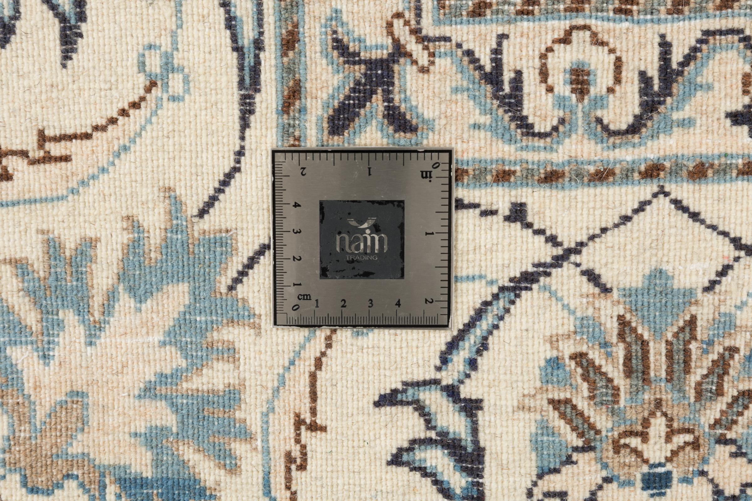 Dette Nain tæppe er vurderet til 12La. Det ser elegant og ædelt ud i sit typiske Nain-farveskema. Dette persiske tæppe blev håndknyttet af højkvalitets uld og natursilke i byen Nain, som ligger i den vestlige udkant af Dasht-e-Kavir-ørkenen. Med 12La er den ikke så fint og detaljeret udsmykket som en Nain 9La eller 6La.