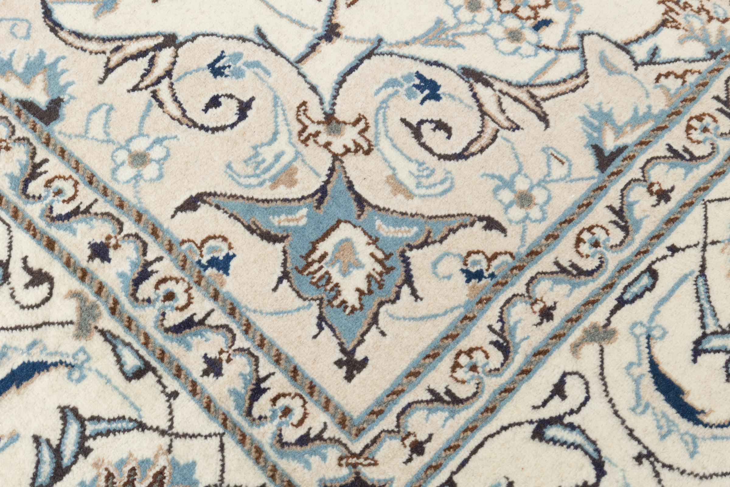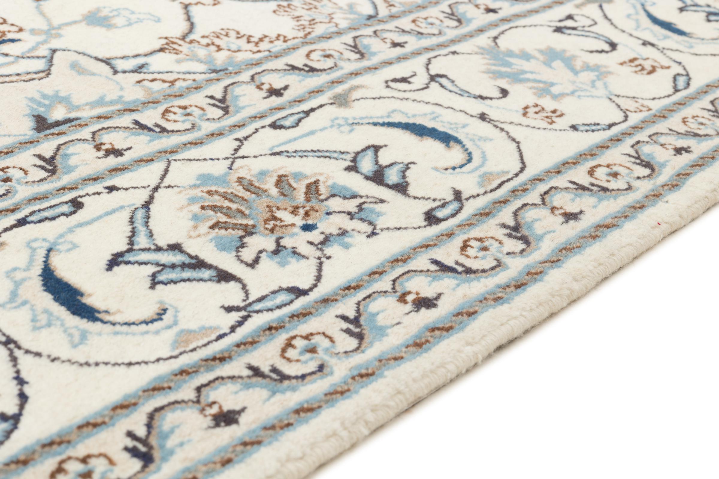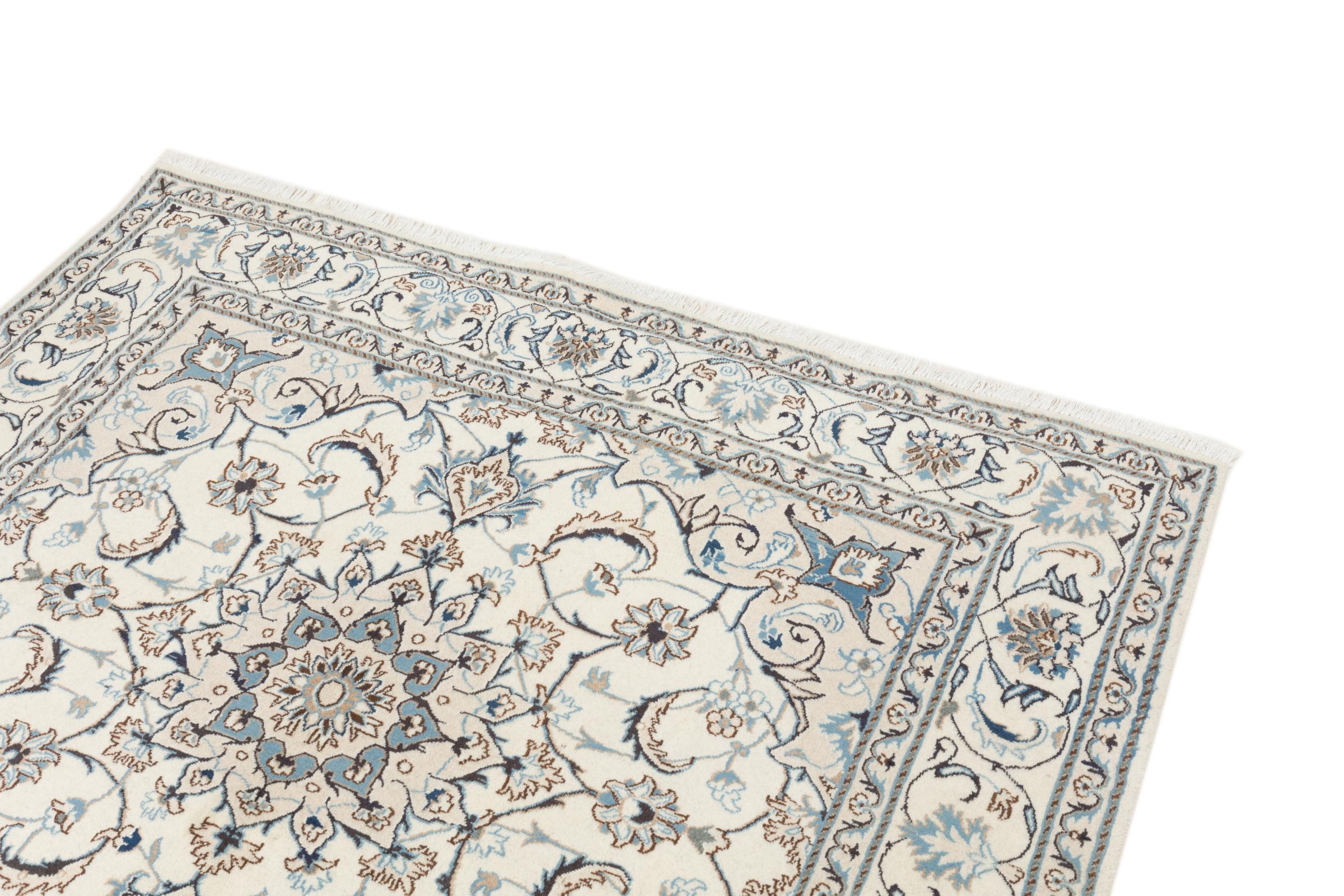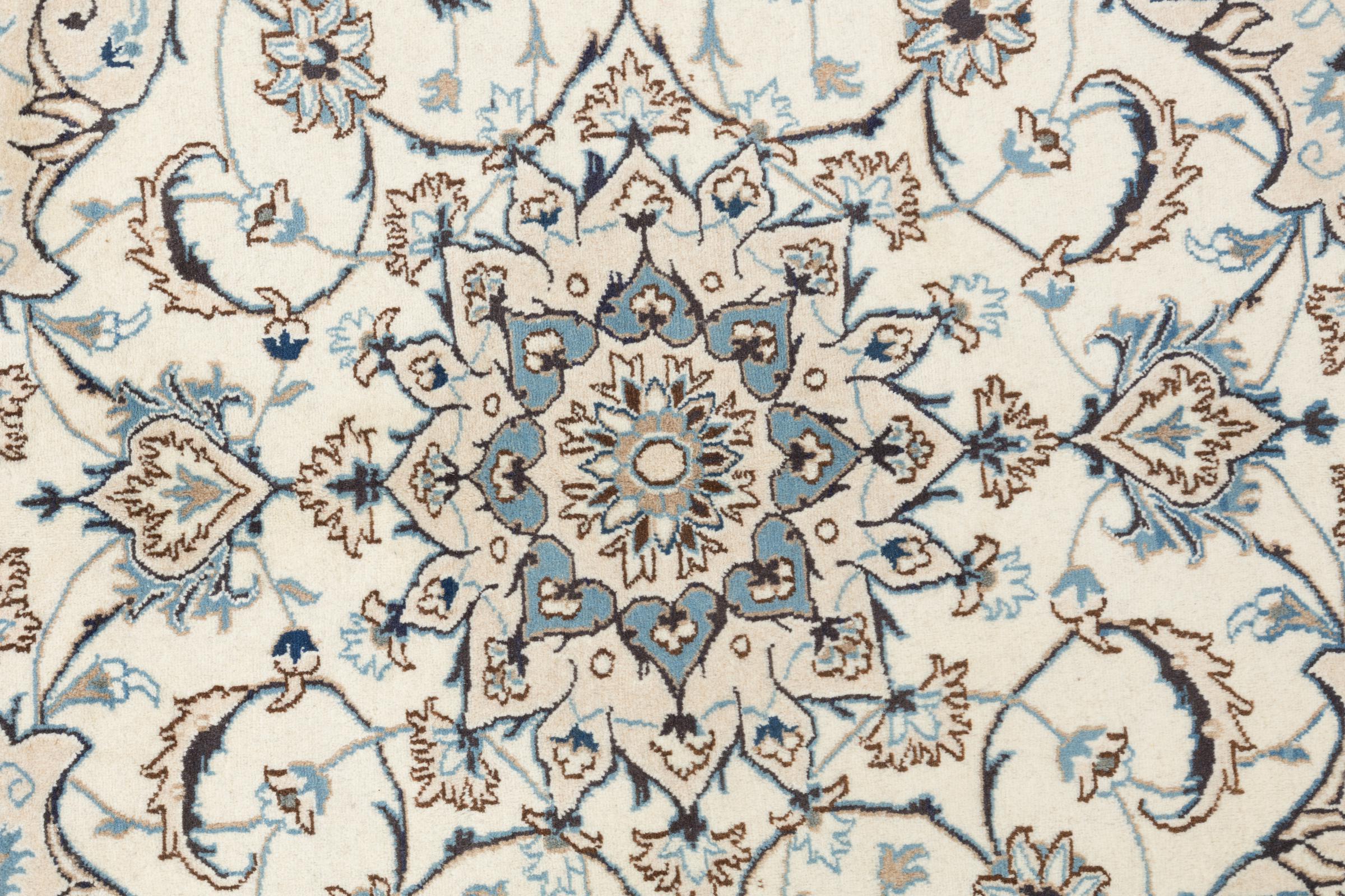 Dette Nain tæppe er vurderet til 12La. Det ser elegant og ædelt ud i sit typiske Nain-farveskema. Dette persiske tæppe blev håndknyttet af højkvalitets uld og natursilke i byen Nain, som ligger i den vestlige udkant af Dasht-e-Kavir-ørkenen. Med 12La er den ikke så fint og detaljeret udsmykket som en Nain 9La eller 6La.