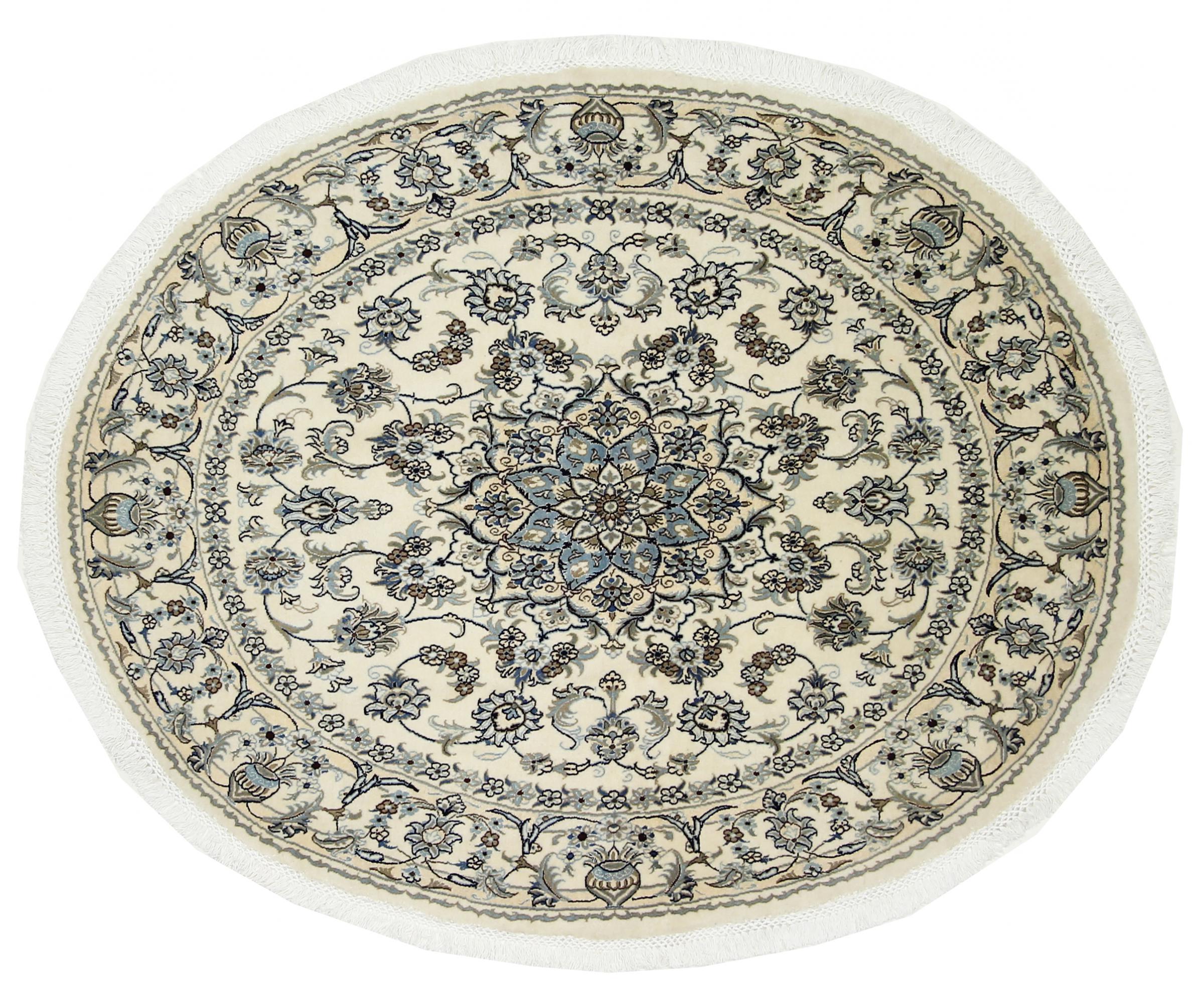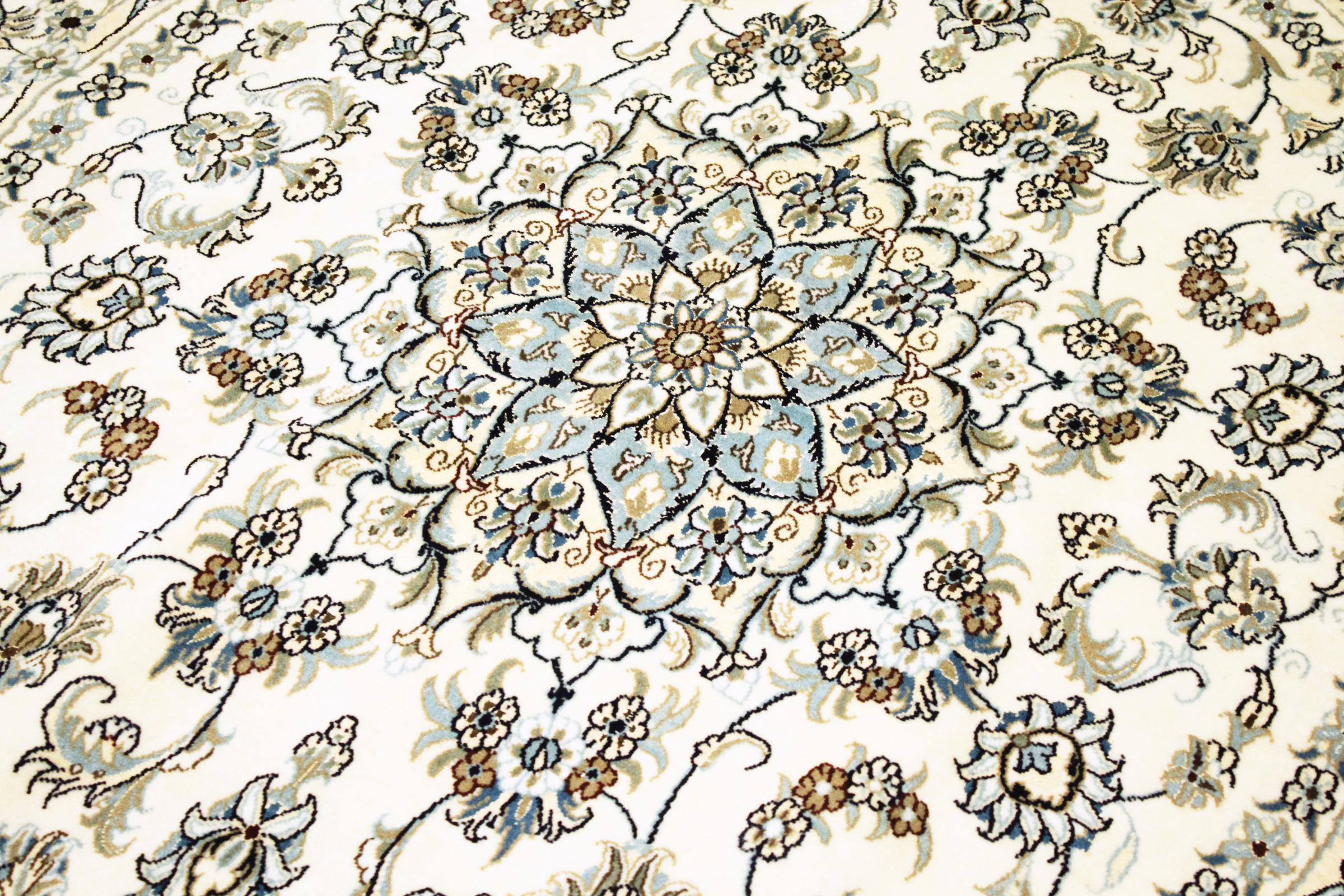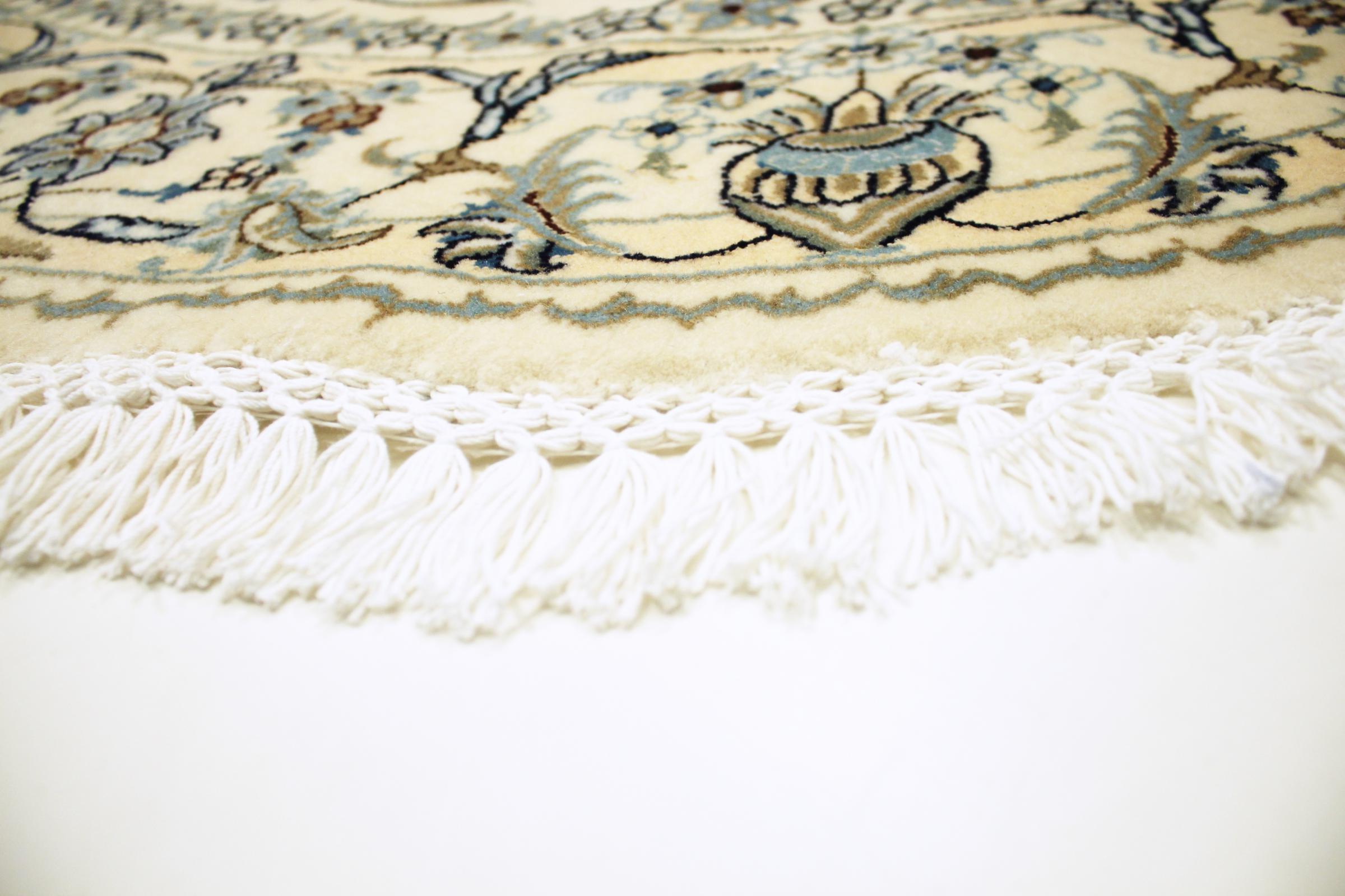 Dette Nain-tæppe er klassificeret 9La. Den fremragende kvalitet, det smukke orientalske design med sine buede mønstre glæder enhver køber. Dette persiske tæppe blev håndknyttet af højkvalitets uld og natursilke i byen Nain, som ligger i den vestlige udkant af Dasht-e-Kavir-ørkenen. 9La Nain er væsentligt finere end en 12La og viser allerede smukke detaljer.