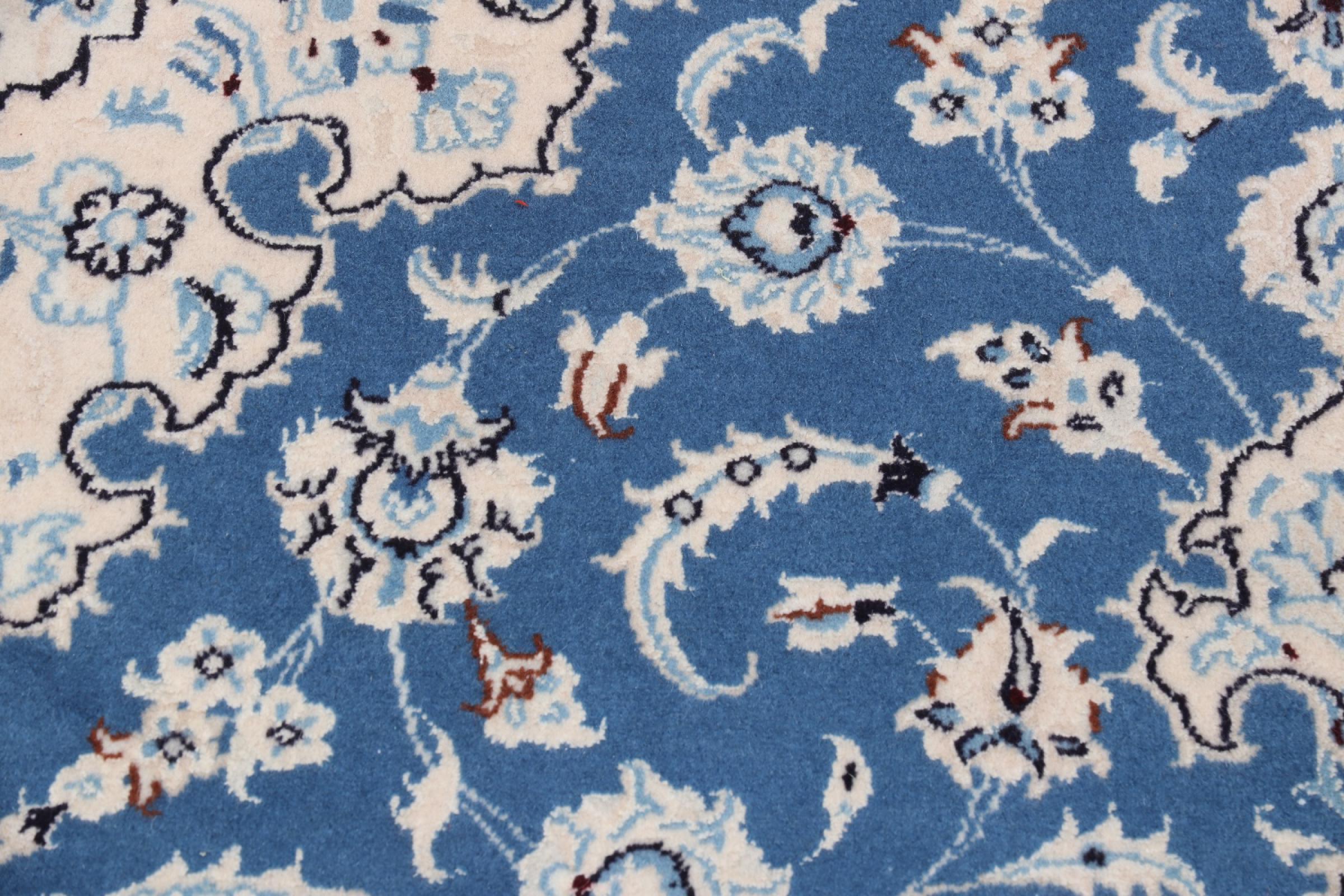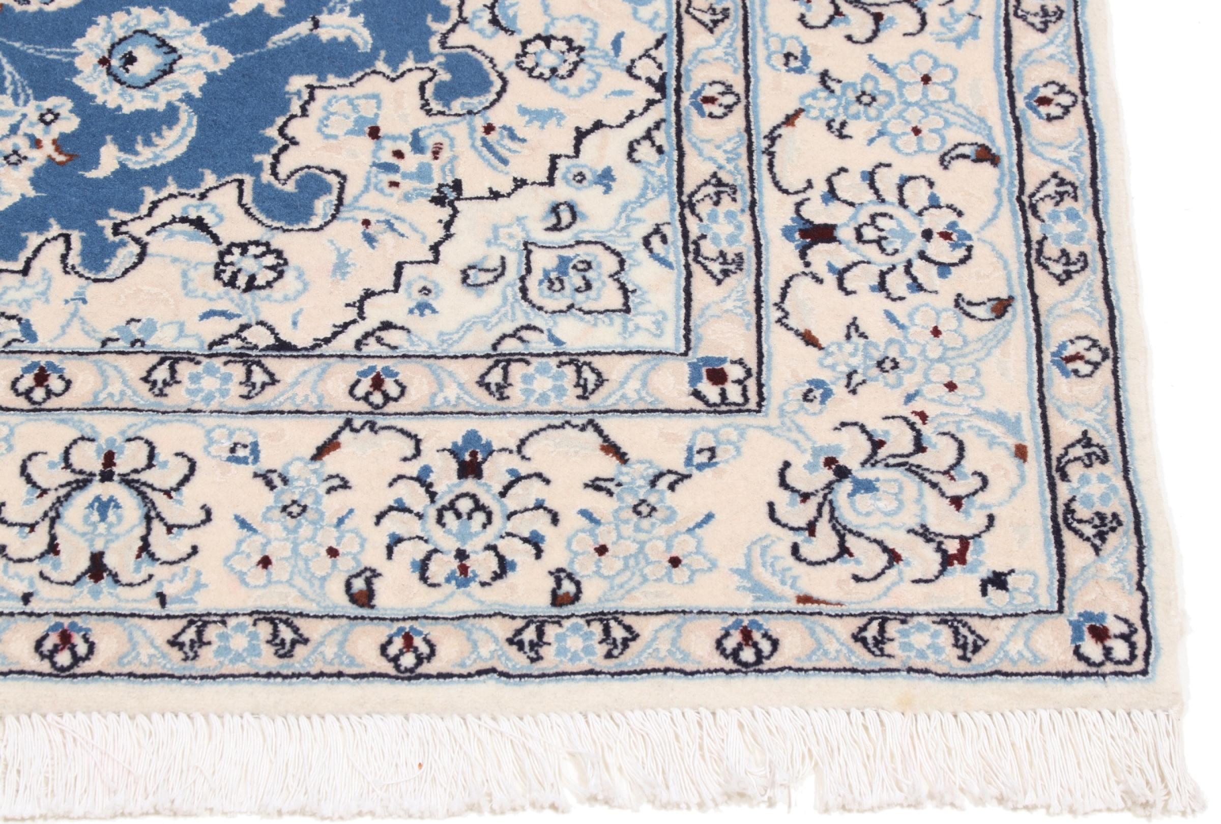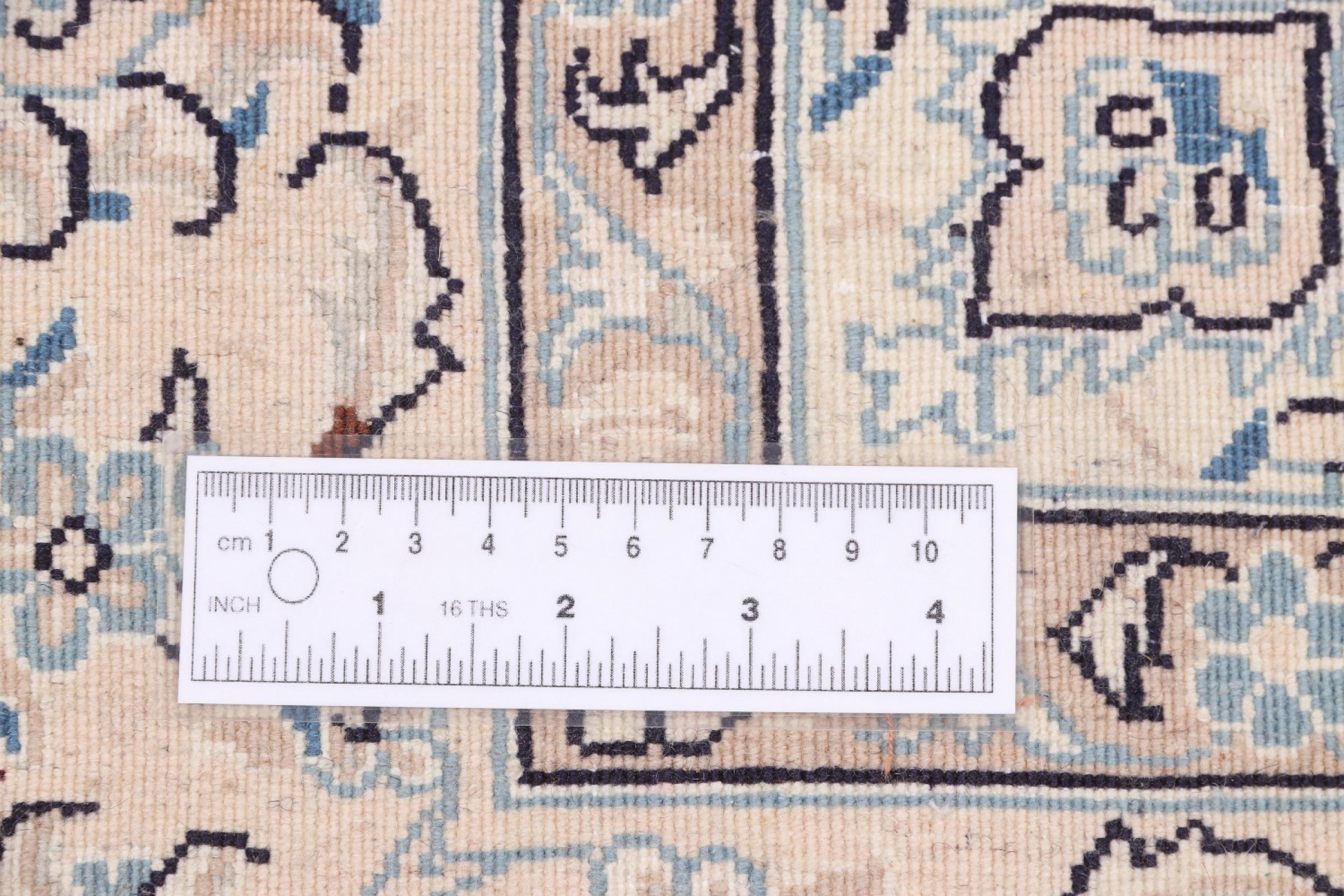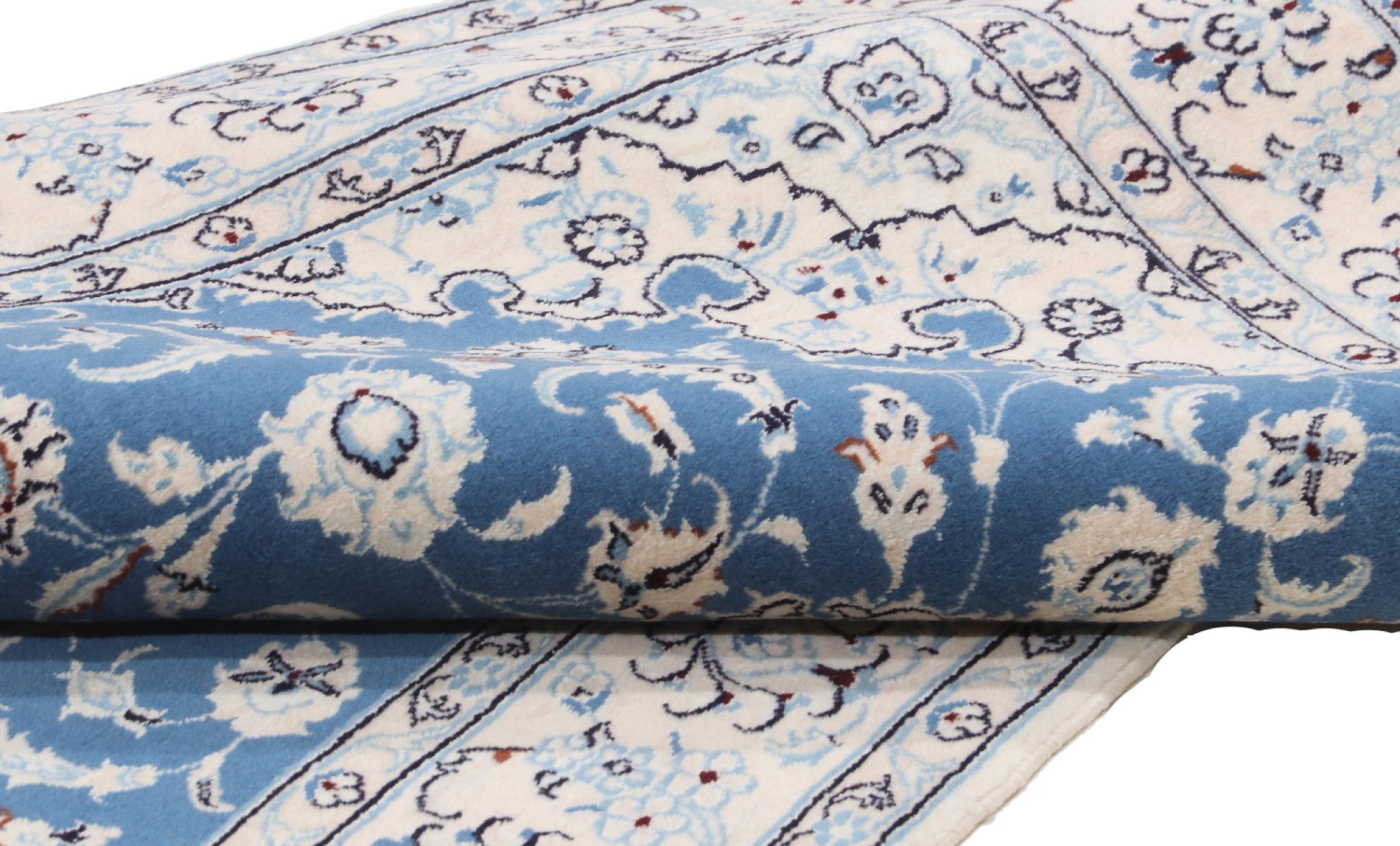 Dette Nain-tæppe er klassificeret 9La. Den fremragende kvalitet, det smukke orientalske design med sine buede mønstre glæder enhver køber. Dette persiske tæppe blev håndknyttet af højkvalitets uld og natursilke i byen Nain, som ligger i den vestlige udkant af Dasht-e-Kavir-ørkenen. 9La Nain er væsentligt finere end en 12La og viser allerede smukke detaljer.