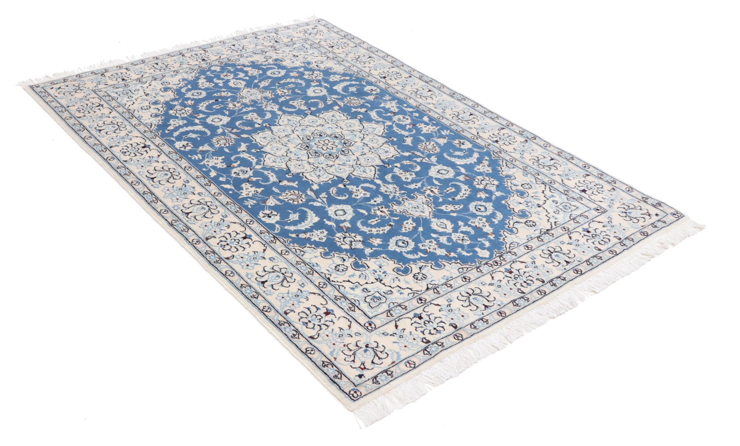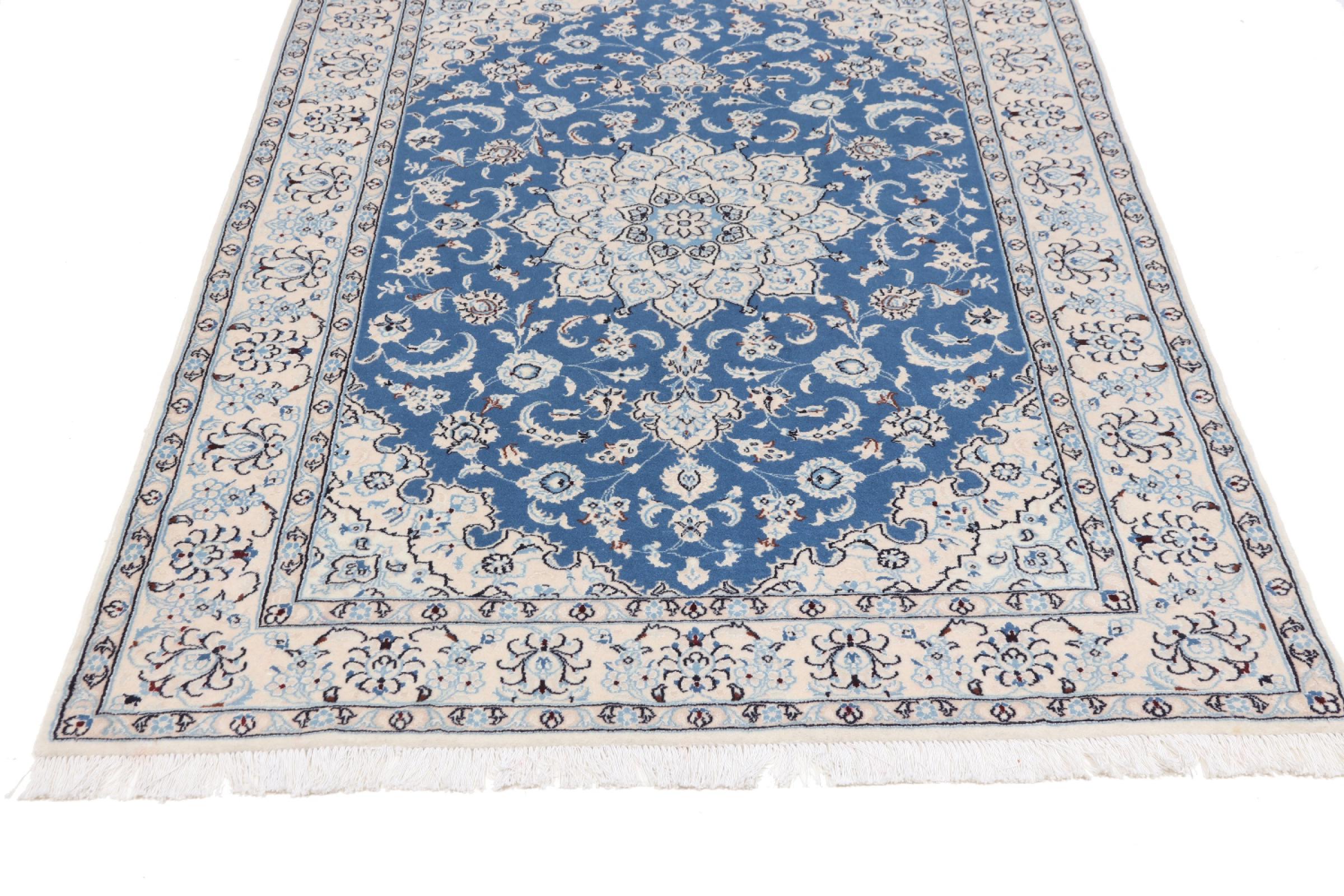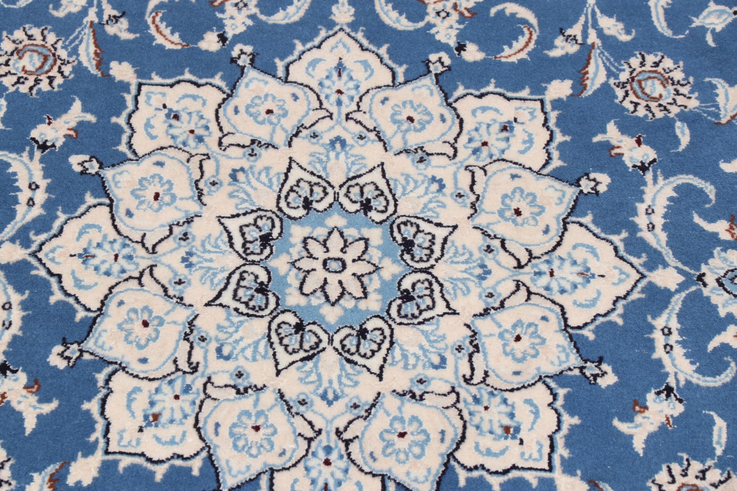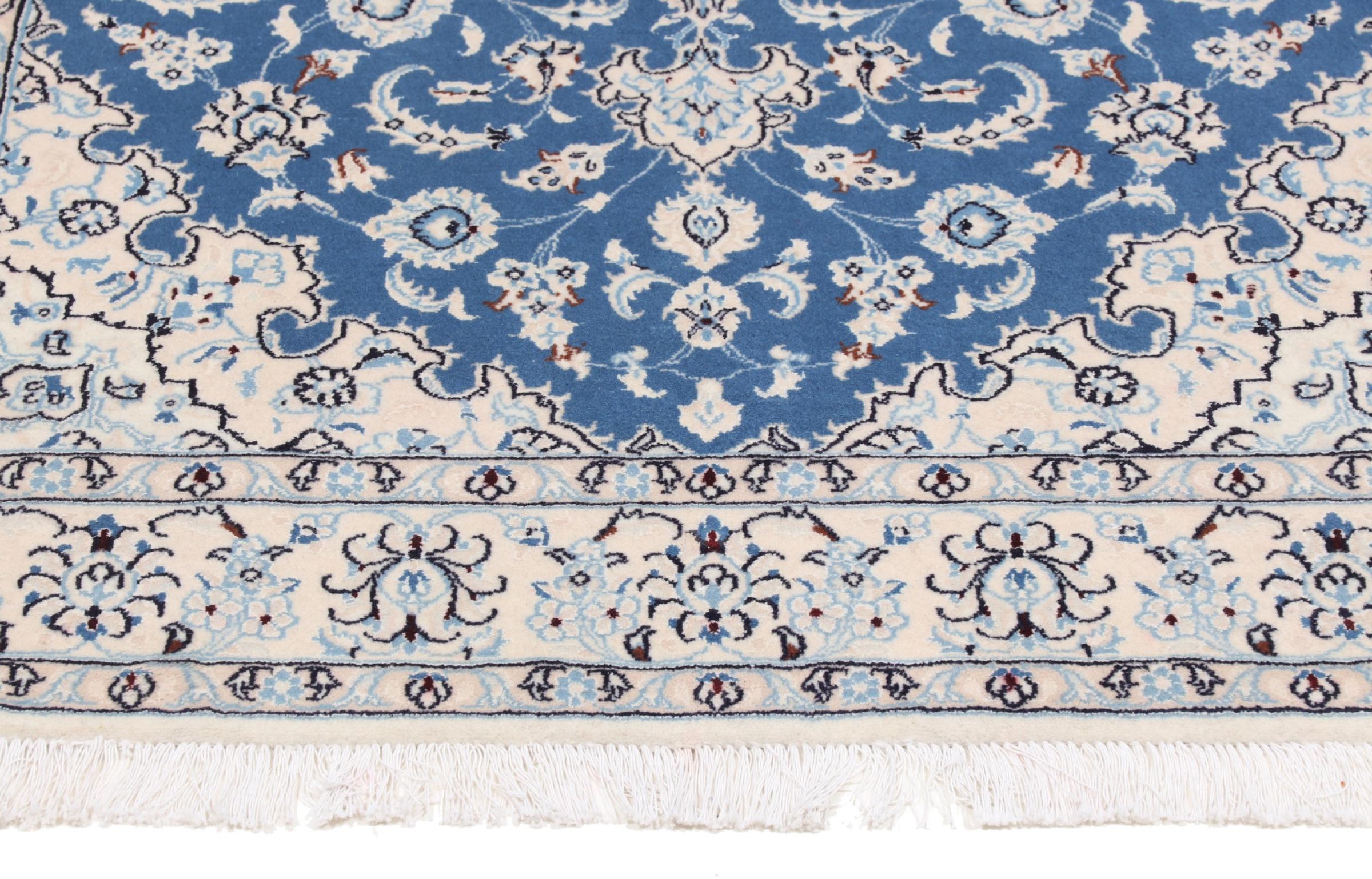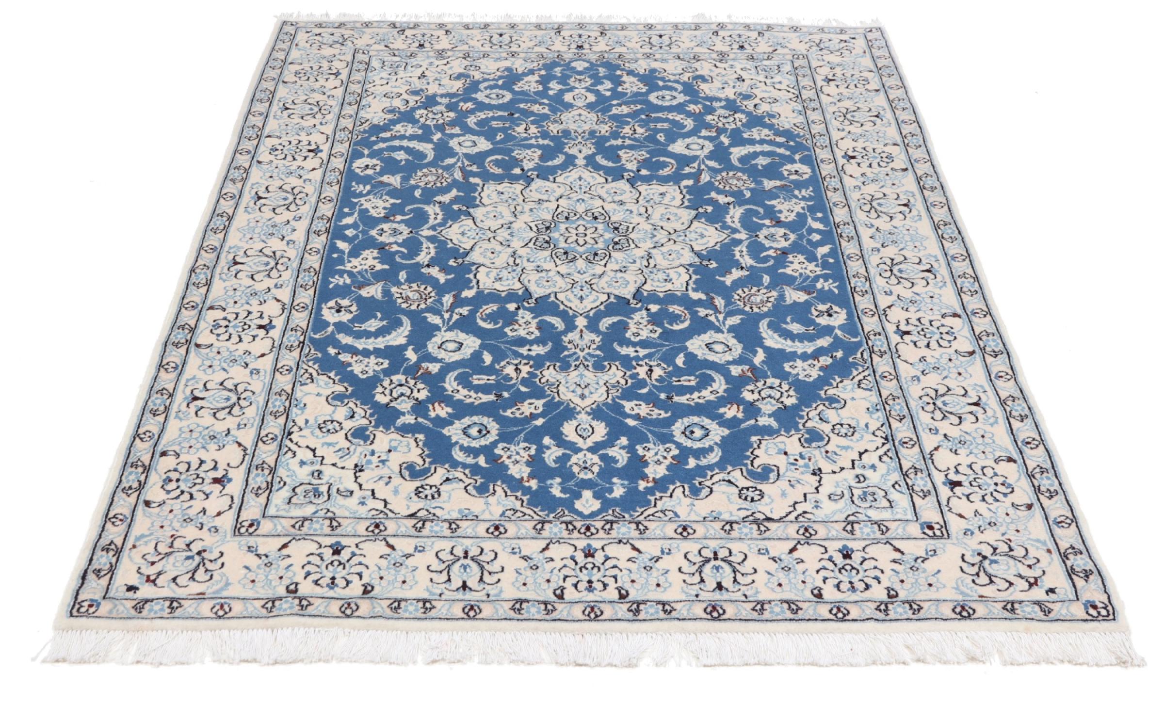 Dette Nain-tæppe er klassificeret 9La. Den fremragende kvalitet, det smukke orientalske design med sine buede mønstre glæder enhver køber. Dette persiske tæppe blev håndknyttet af højkvalitets uld og natursilke i byen Nain, som ligger i den vestlige udkant af Dasht-e-Kavir-ørkenen. 9La Nain er væsentligt finere end en 12La og viser allerede smukke detaljer.