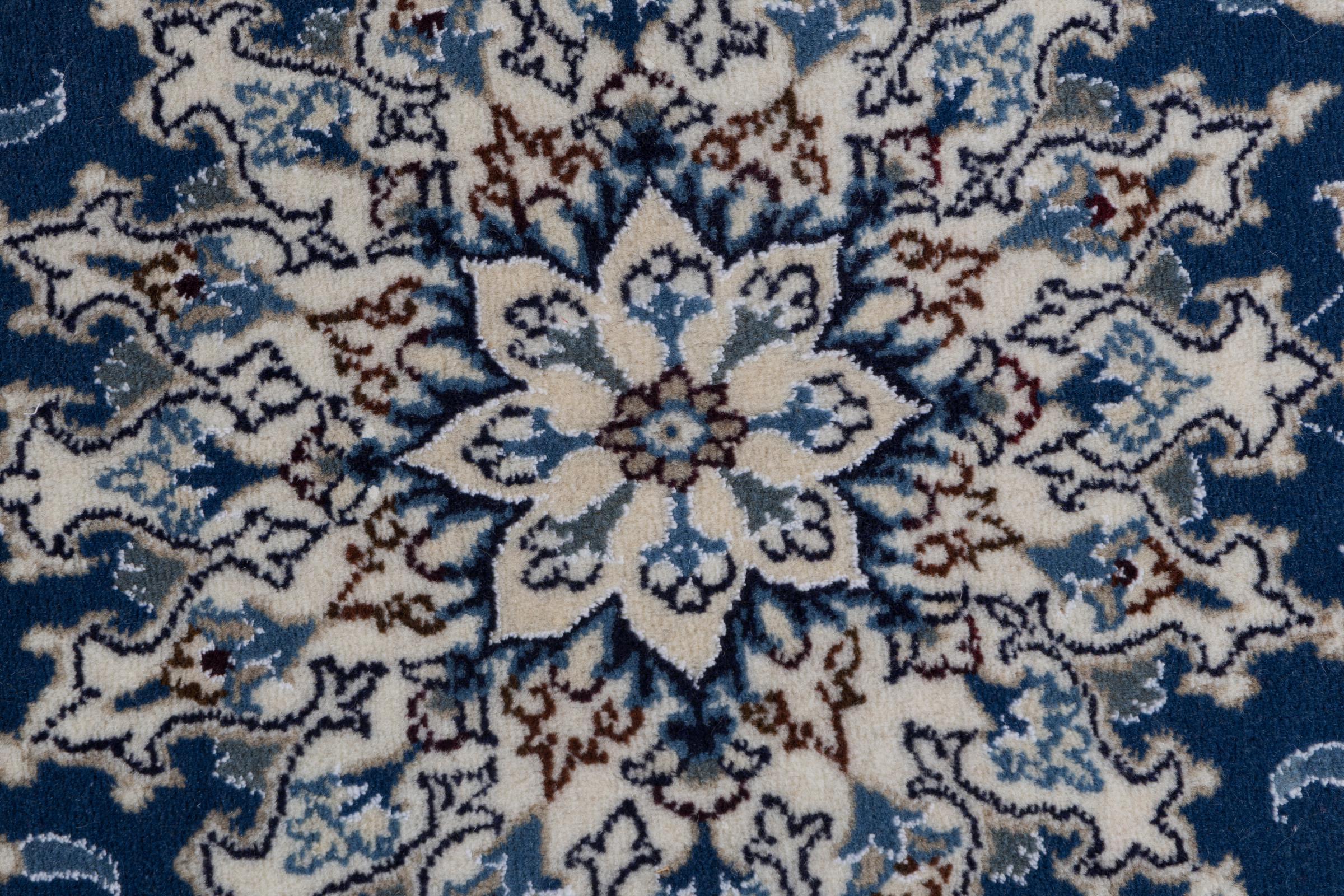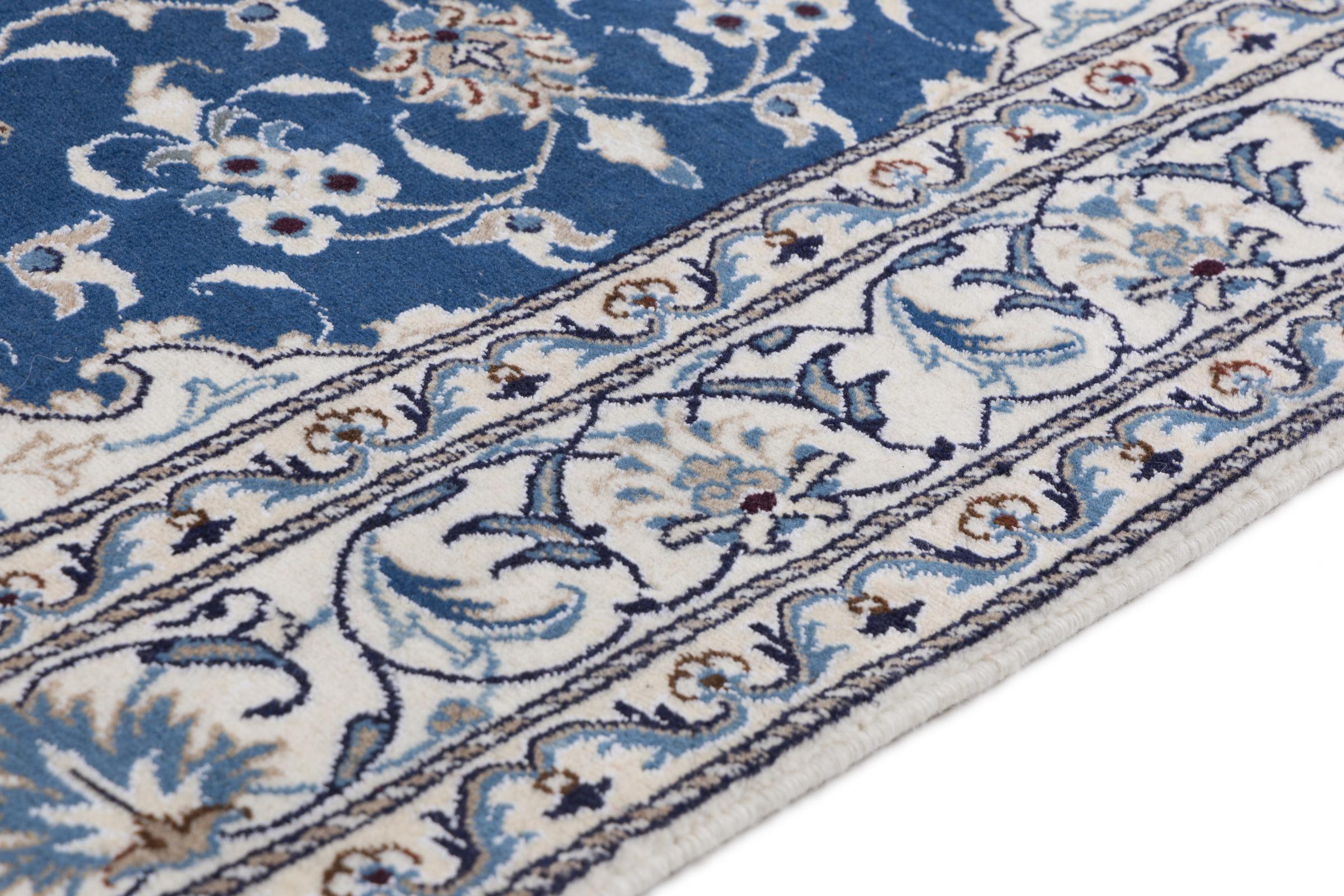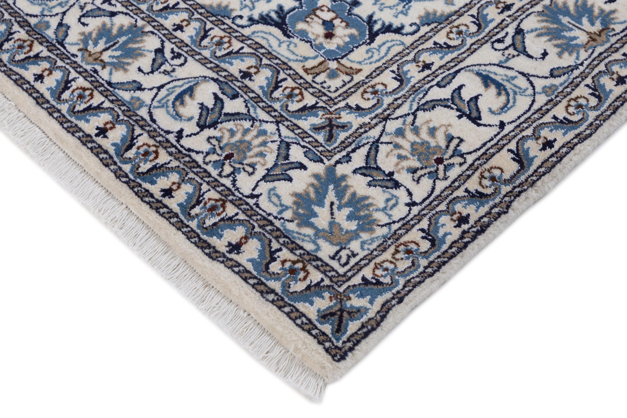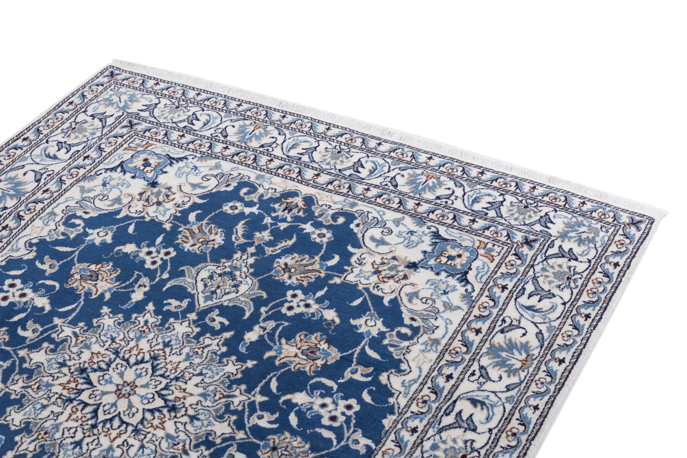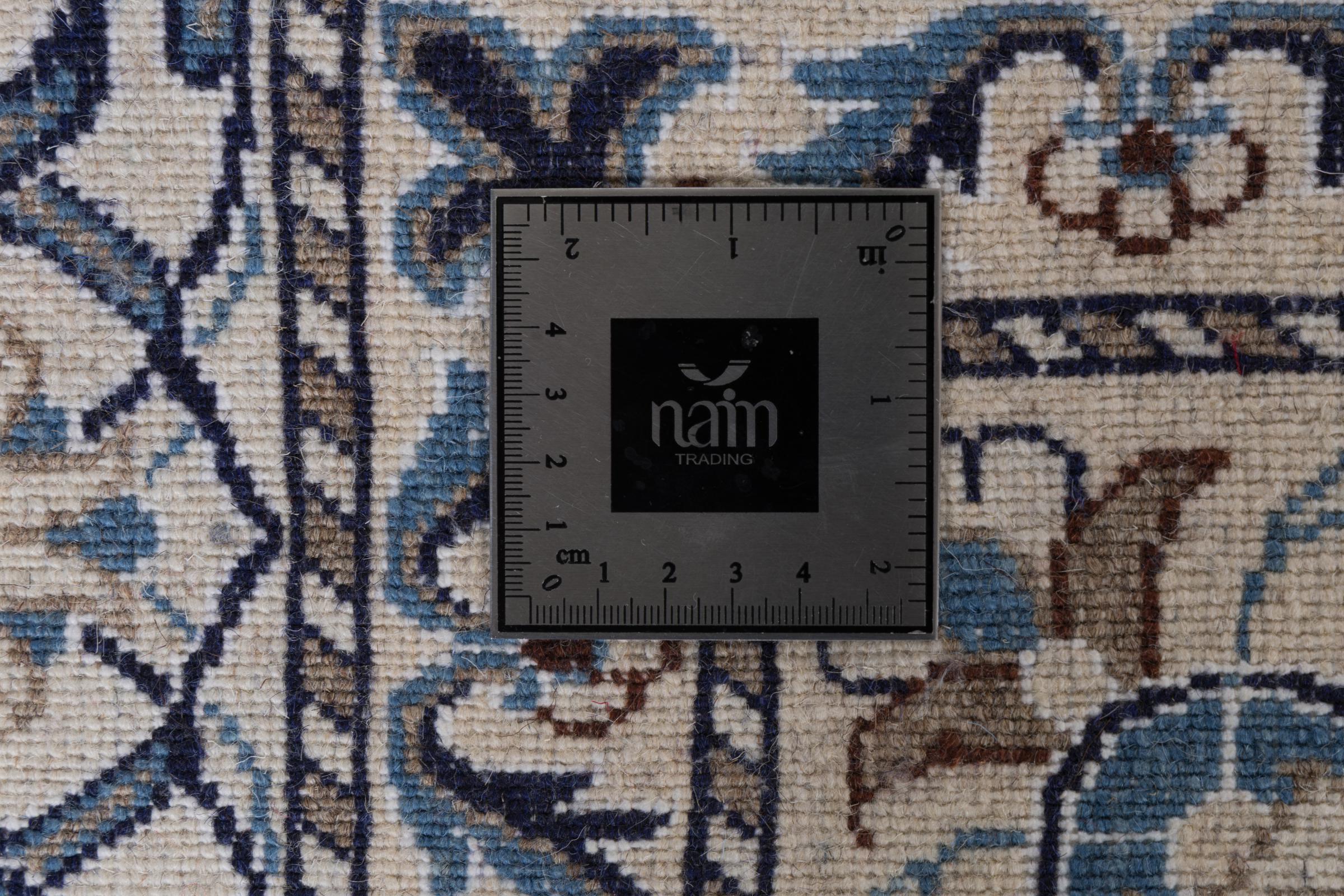Dette Nain tæppe er vurderet til 12La. Det ser elegant og ædelt ud i sit typiske Nain-farveskema. Dette persiske tæppe blev håndknyttet af højkvalitets uld og natursilke i byen Nain, som ligger i den vestlige udkant af Dasht-e-Kavir-ørkenen. Med 12La er den ikke så fint og detaljeret udsmykket som en Nain 9La eller 6La.