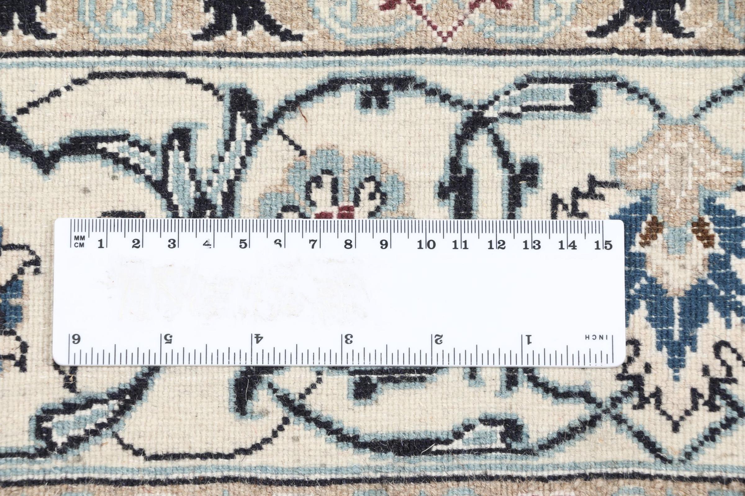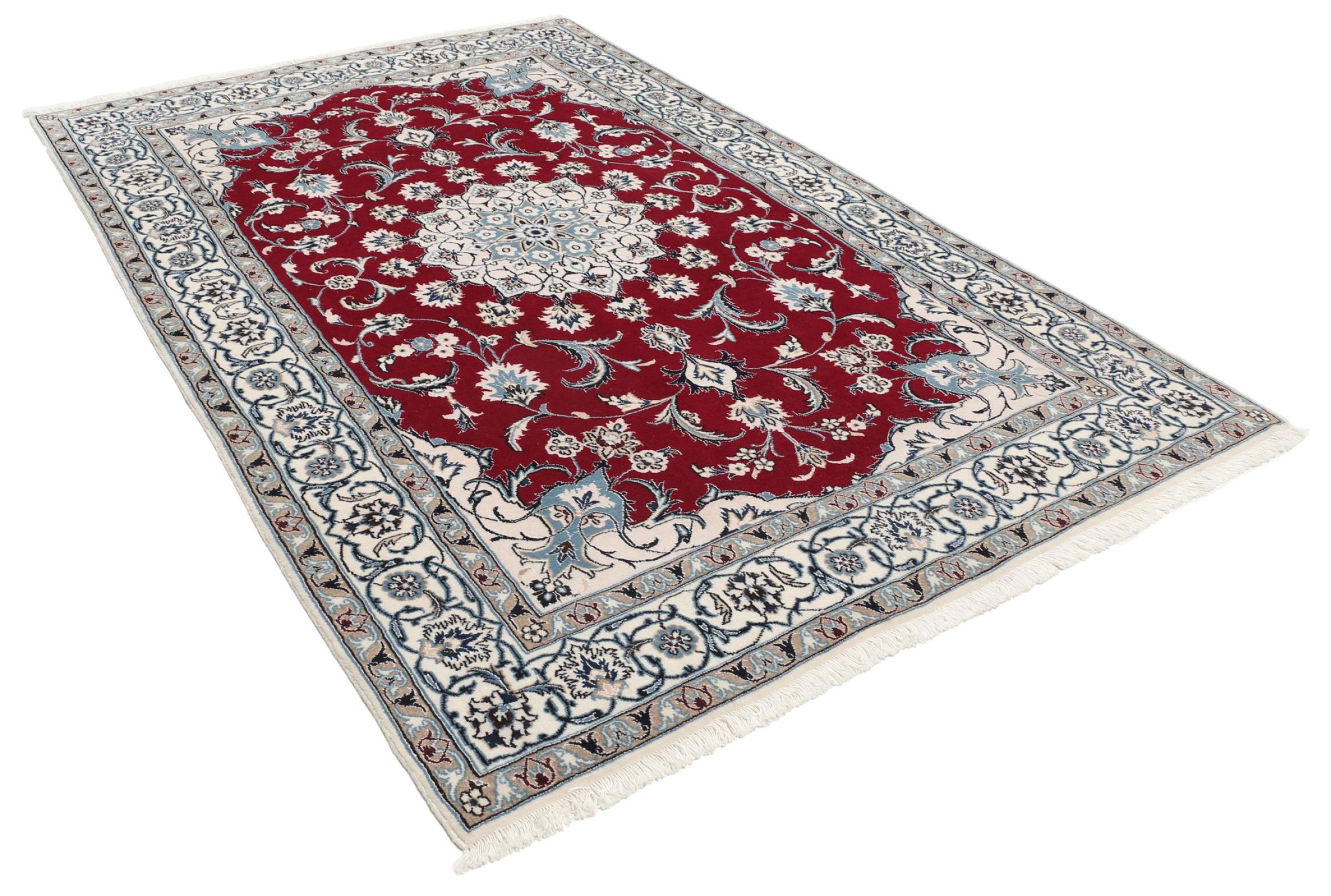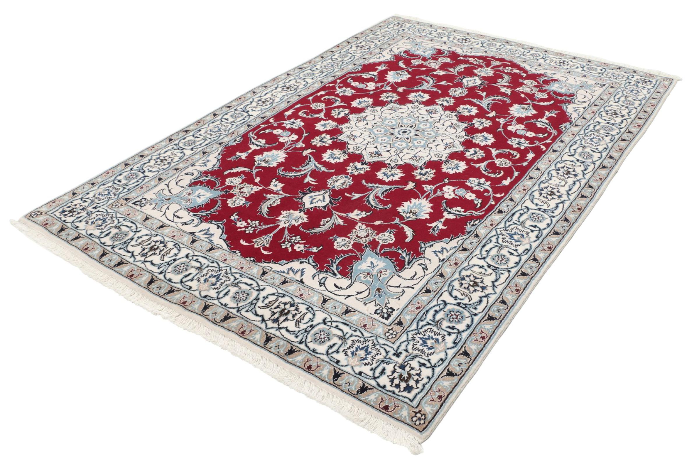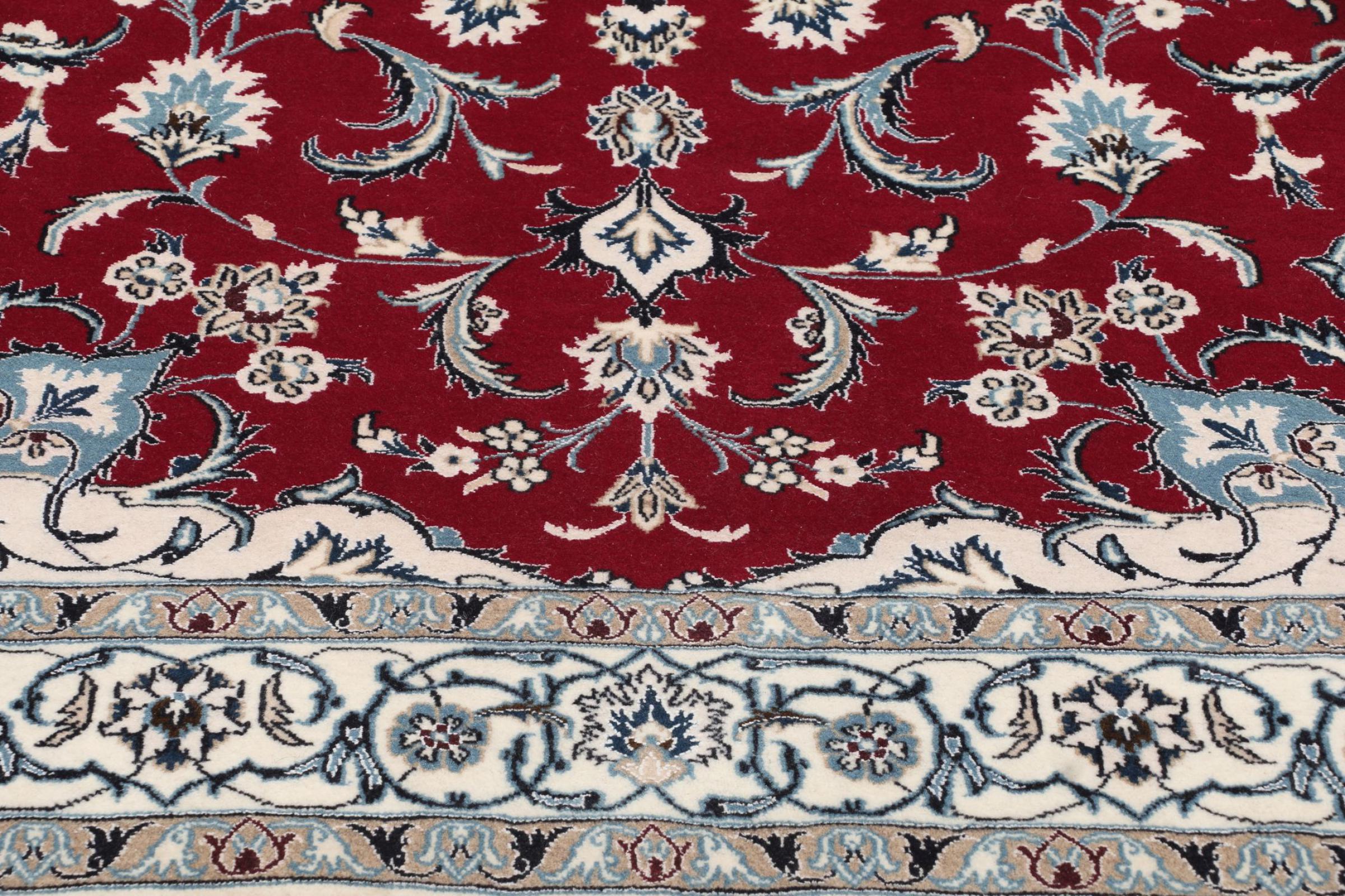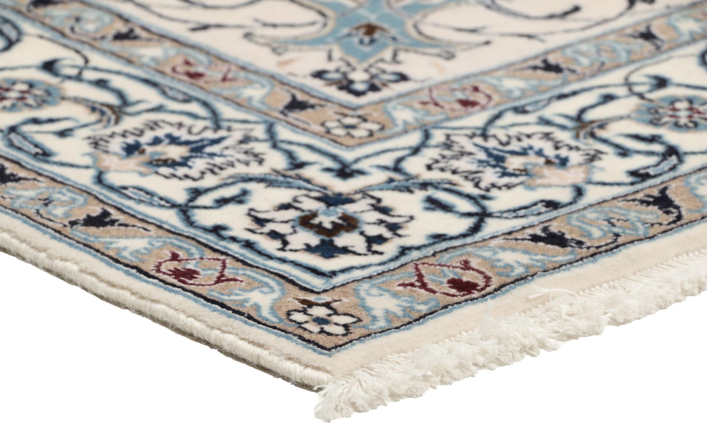 Dette Nain-tæppe er klassificeret 9La. Den fremragende kvalitet, det smukke orientalske design med sine buede mønstre glæder enhver køber. Dette persiske tæppe blev håndknyttet af højkvalitets uld og natursilke i byen Nain, som ligger i den vestlige udkant af Dasht-e-Kavir-ørkenen. 9La Nain er væsentligt finere end en 12La og viser allerede smukke detaljer.
