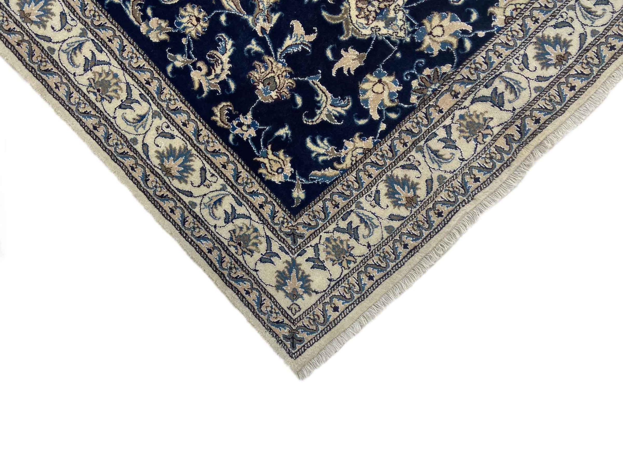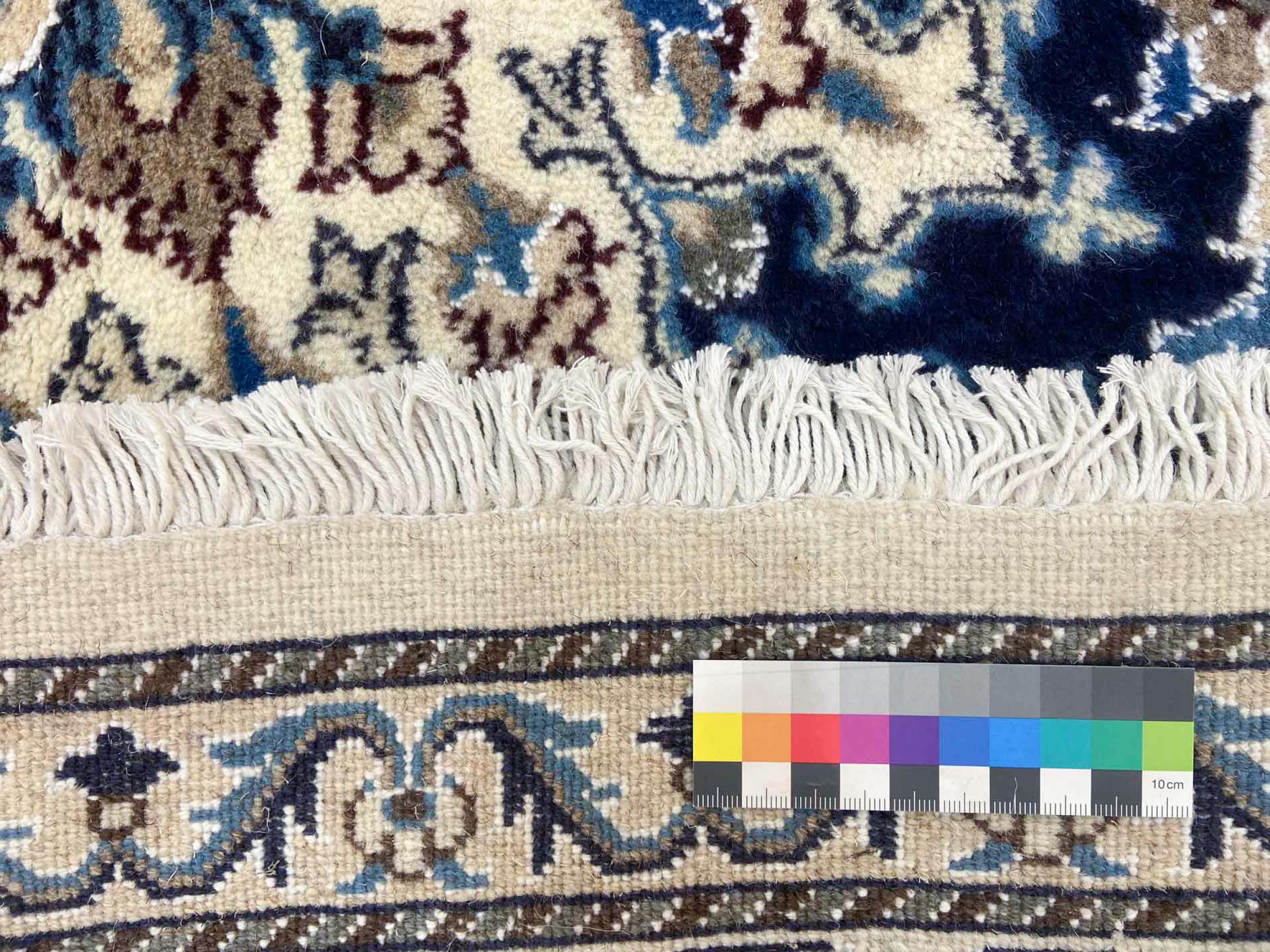 Dette Nain tæppe er vurderet til 12La. Det ser elegant og ædelt ud i sit typiske Nain-farveskema. Dette persiske tæppe blev håndknyttet af højkvalitets uld og natursilke i byen Nain, som ligger i den vestlige udkant af Dasht-e-Kavir-ørkenen. Med 12La er den ikke så fint og detaljeret udsmykket som en Nain 9La eller 6La.