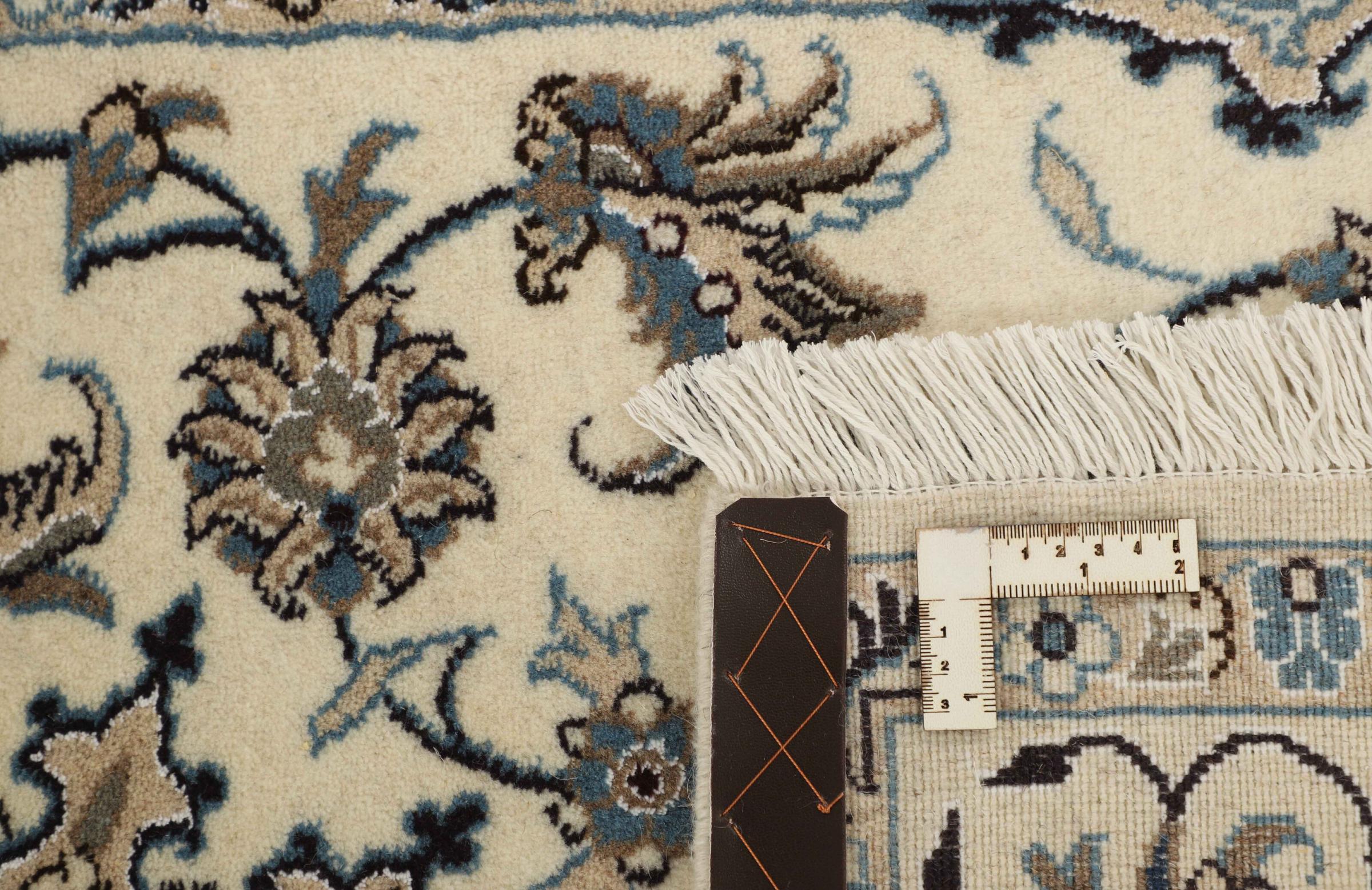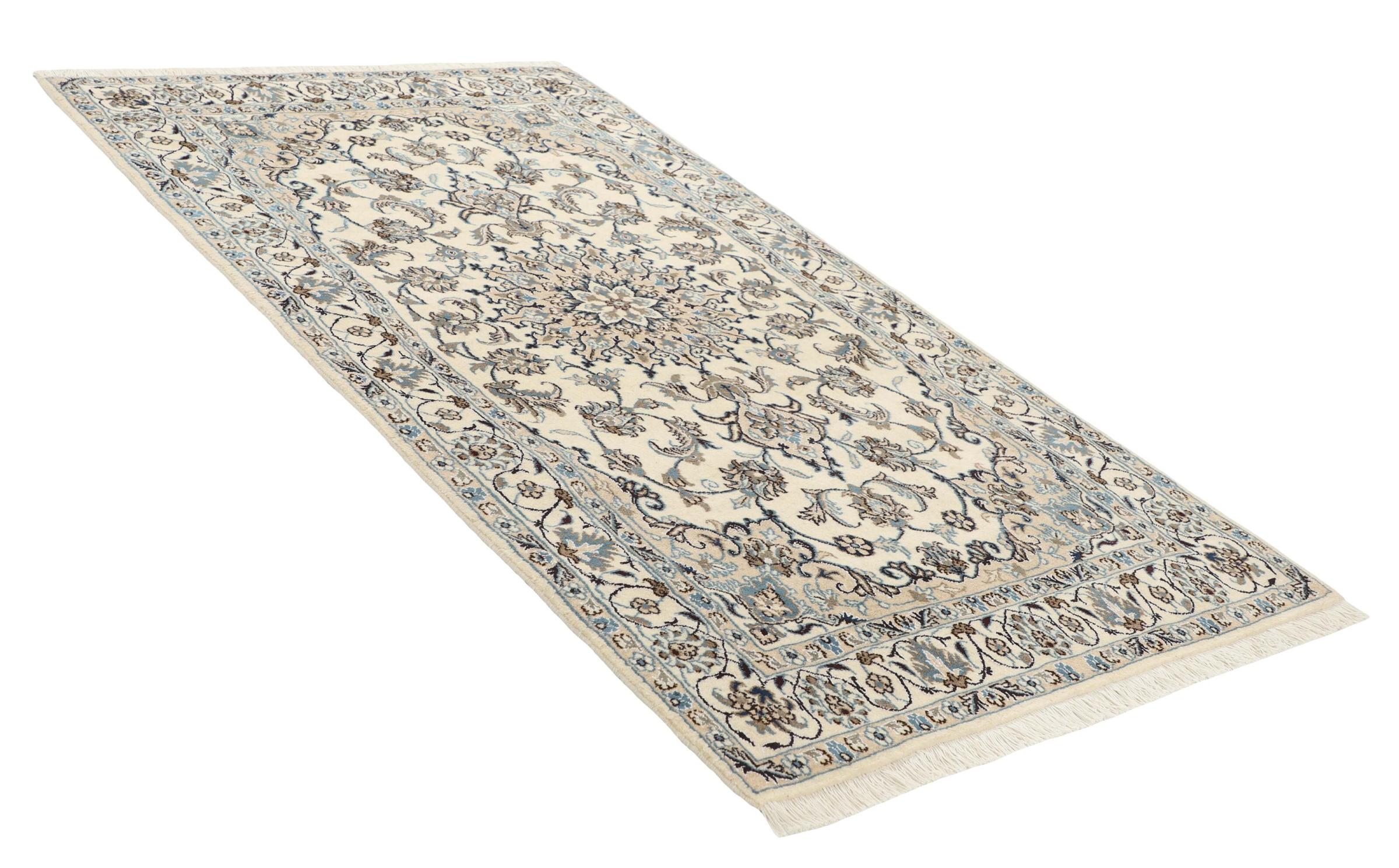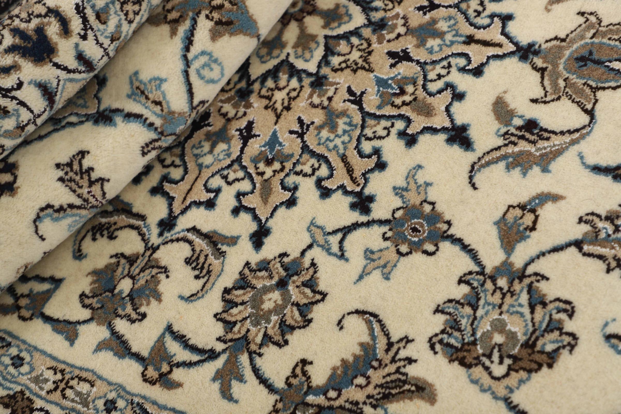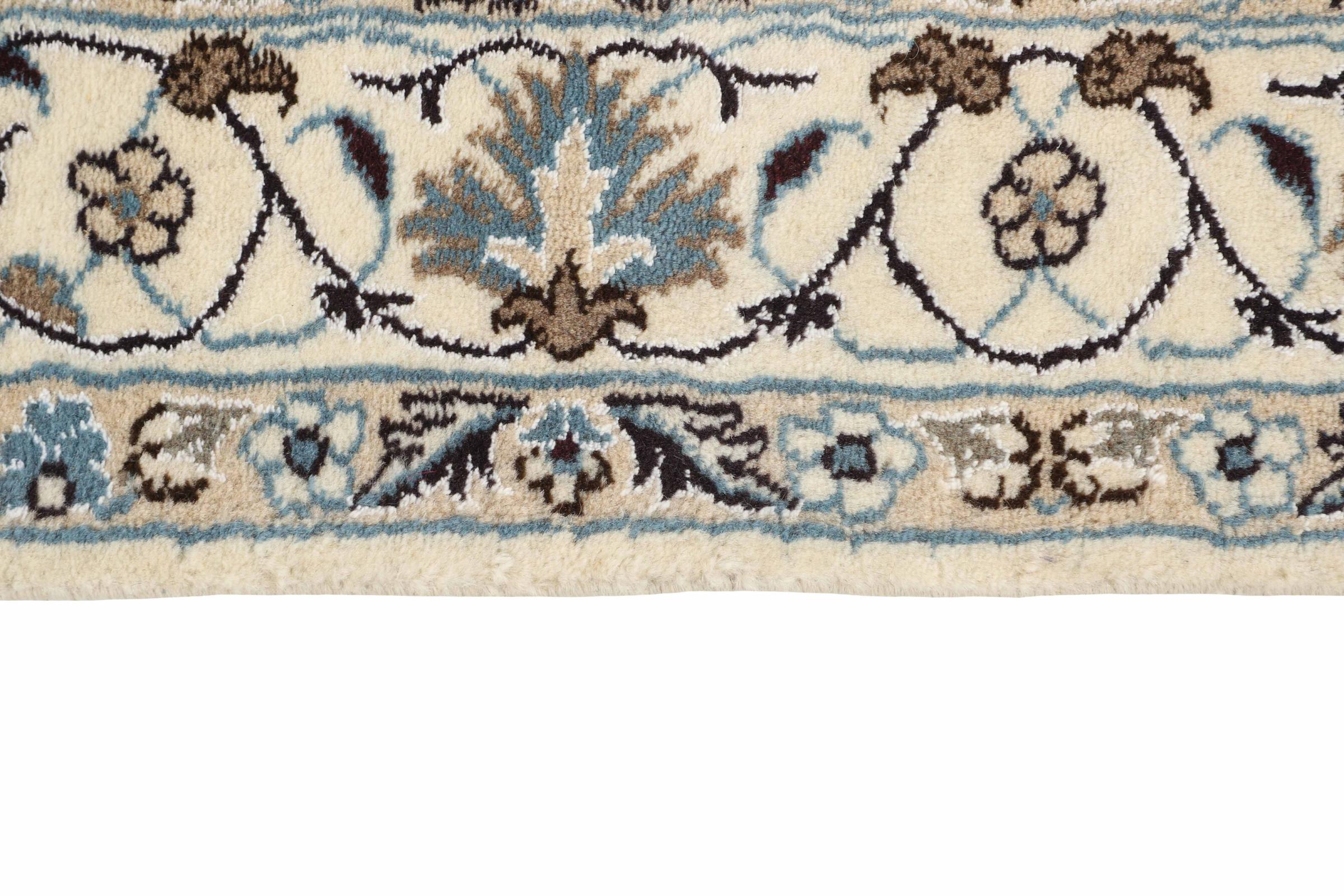 Dette Nain tæppe er vurderet til 12La. Det ser elegant og ædelt ud i sit typiske Nain-farveskema. Dette persiske tæppe blev håndknyttet af højkvalitets uld og natursilke i byen Nain, som ligger i den vestlige udkant af Dasht-e-Kavir-ørkenen. Med 12La er den ikke så fint og detaljeret udsmykket som en Nain 9La eller 6La.