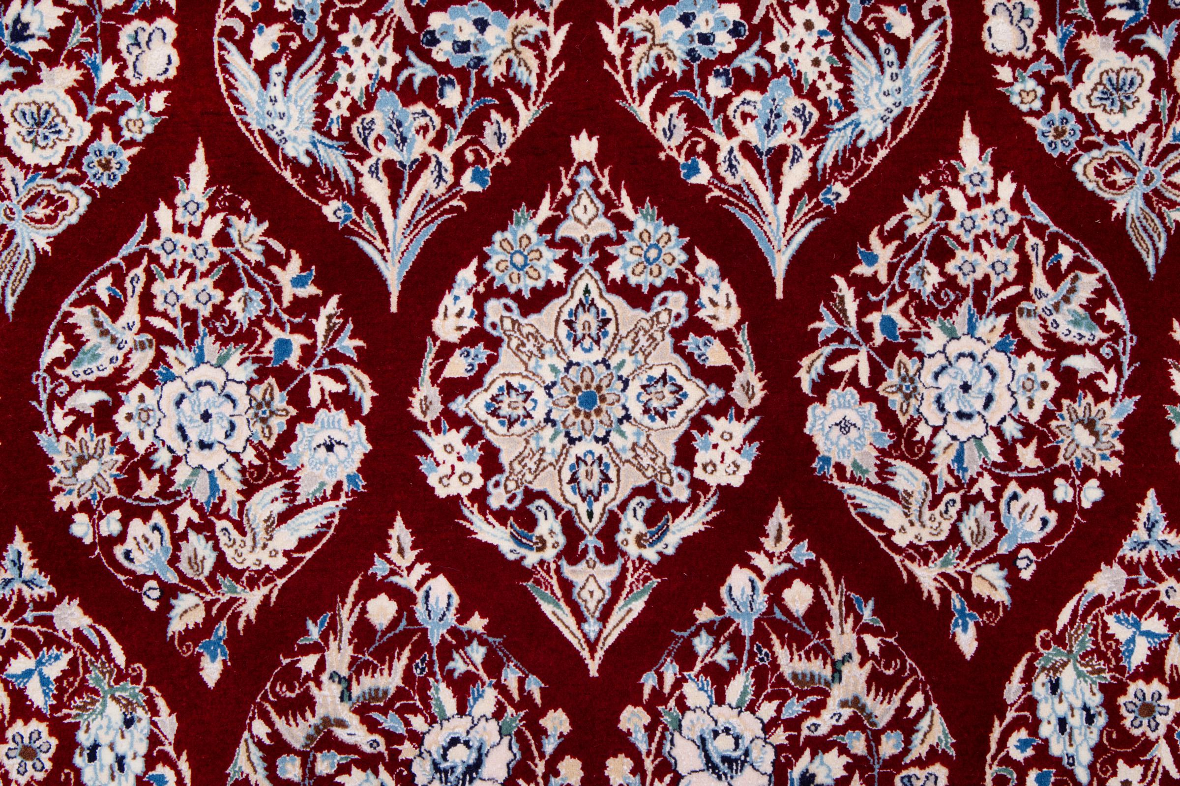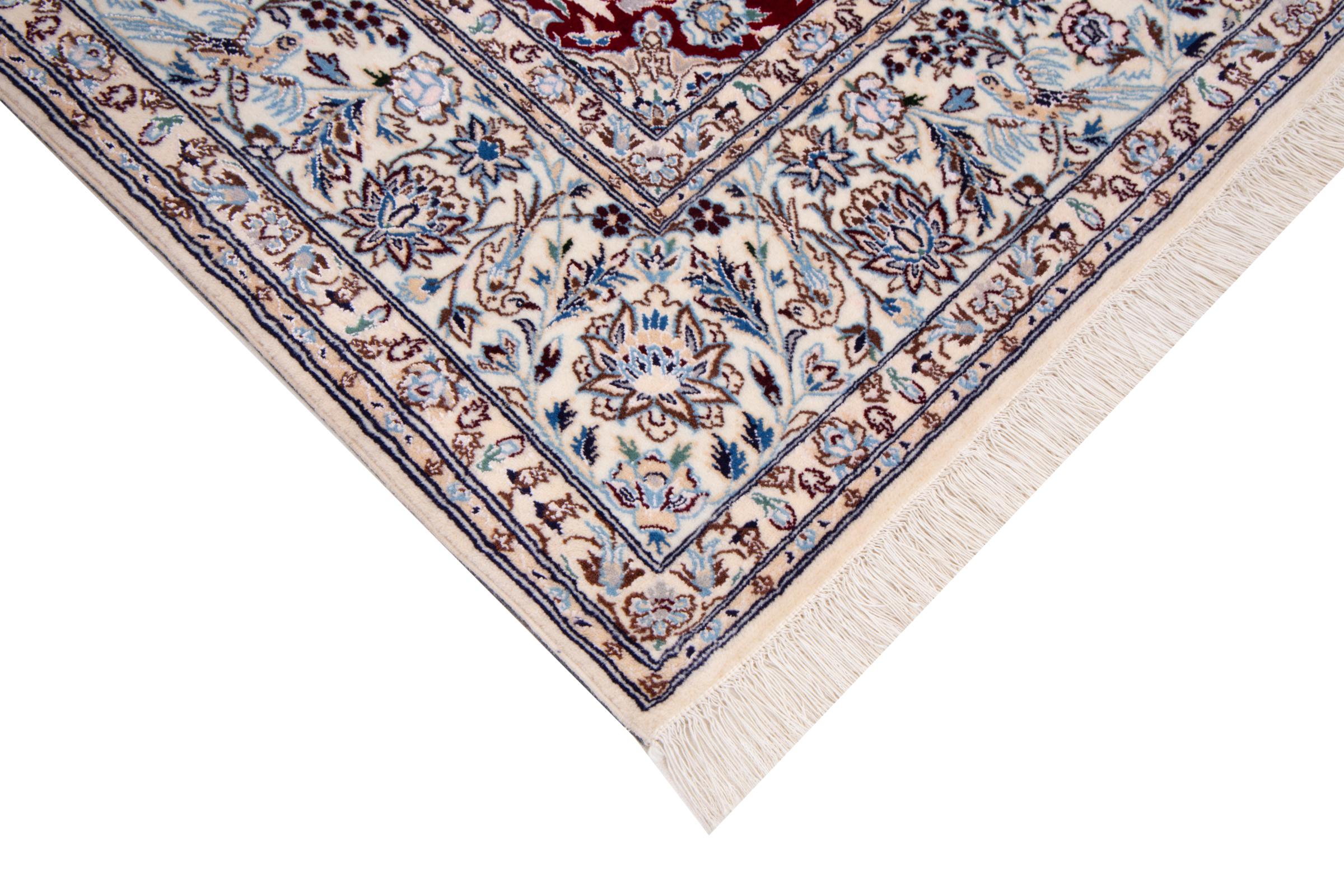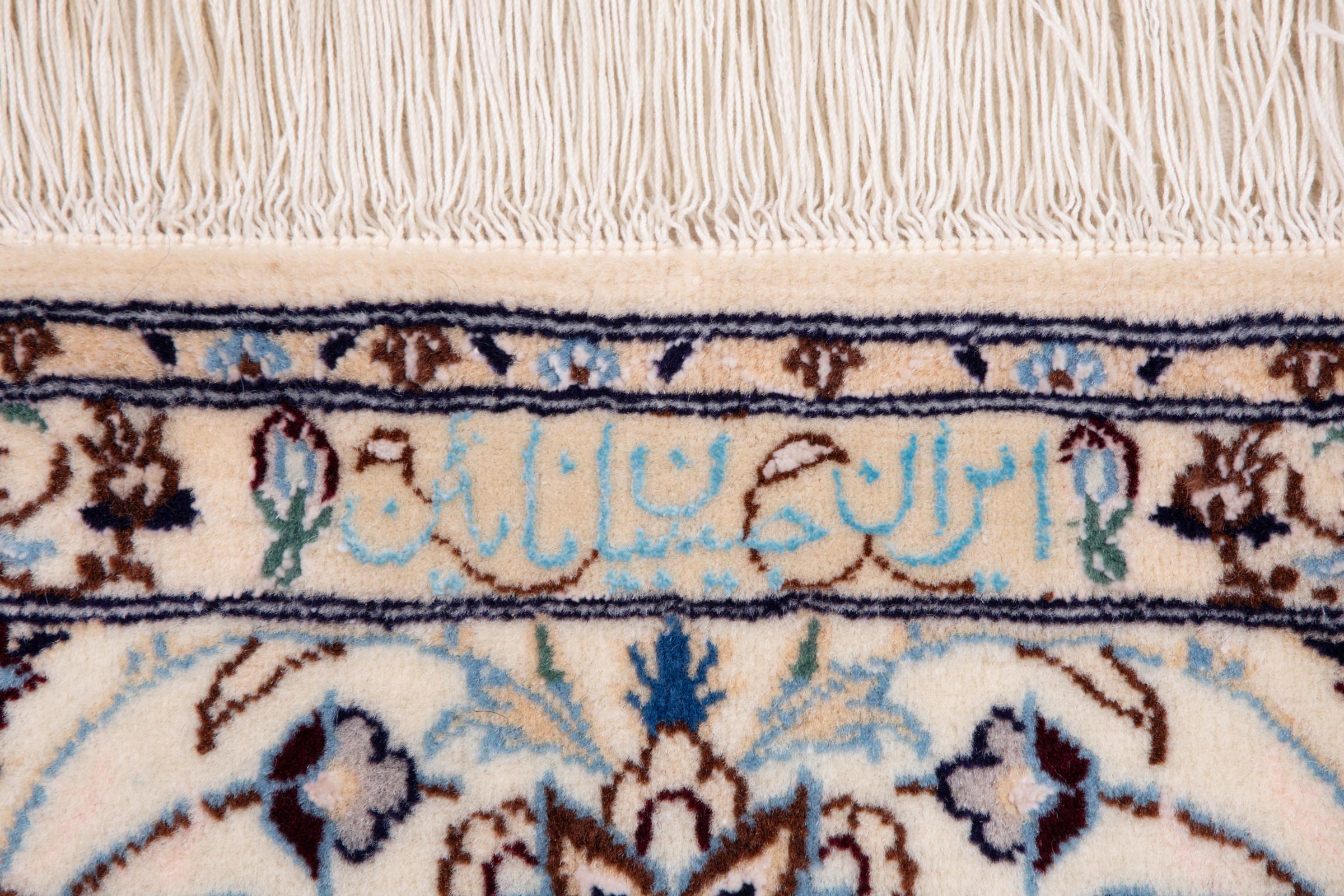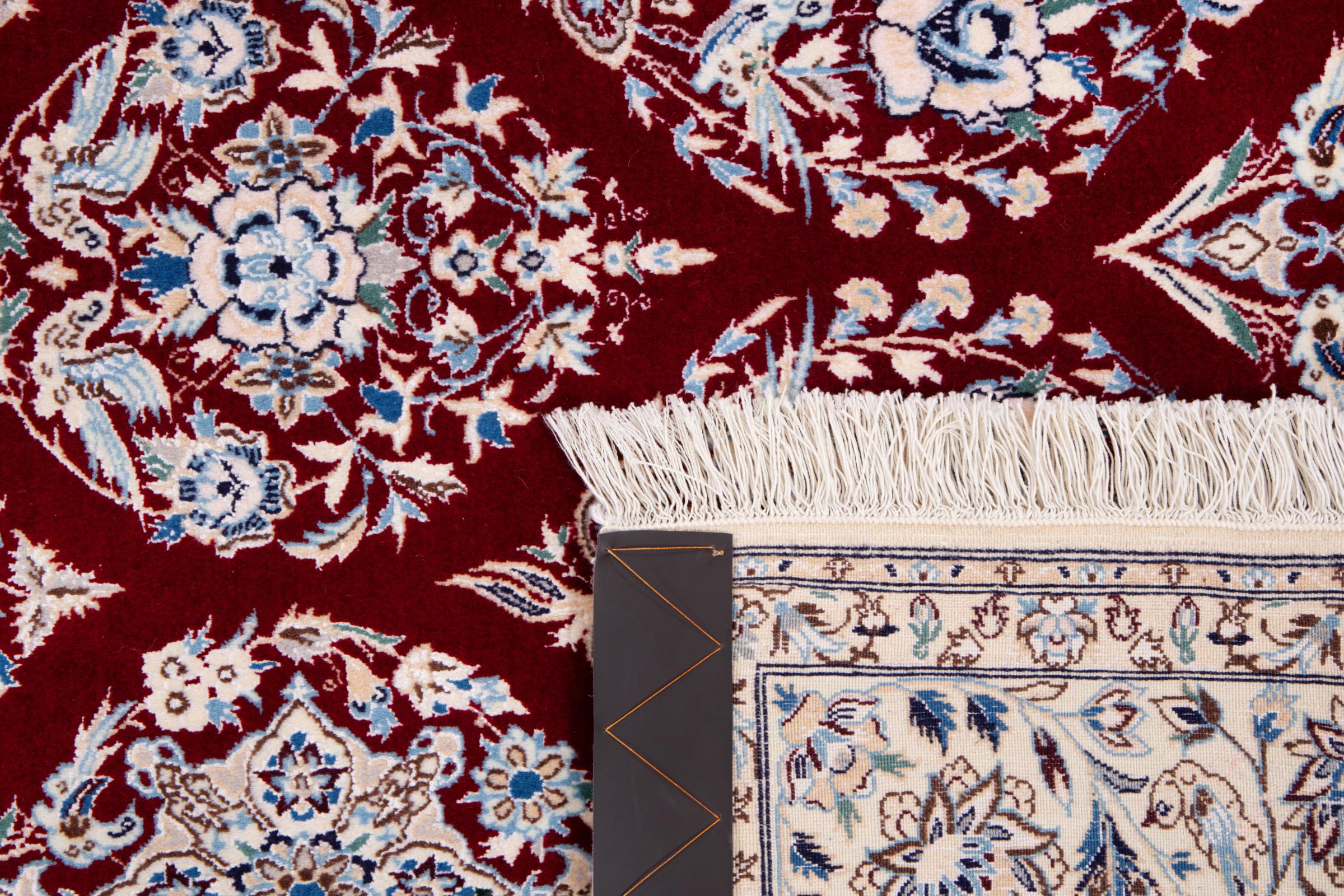 Dette Nain-tæppe kombinerer kvalitet, tradition og et umiskendeligt design. Den blev håndknyttet i ørkenbyen af ​​samme navn, Nain, af højkvalitets korkuld og natursilke. Elskere af værdifulde tæpper fra Iran vil kunne lide dette persiske tæppe. Med Nain-tæpper i 6La og 4La-klassificeringen har du et rigtigt kunstværk med et utroligt detaljeringsniveau, som du bogstaveligt talt kan fare vild. Nain 4La-tæpper er svære at finde i dag, fordi de er ekstremt komplekse at producere.