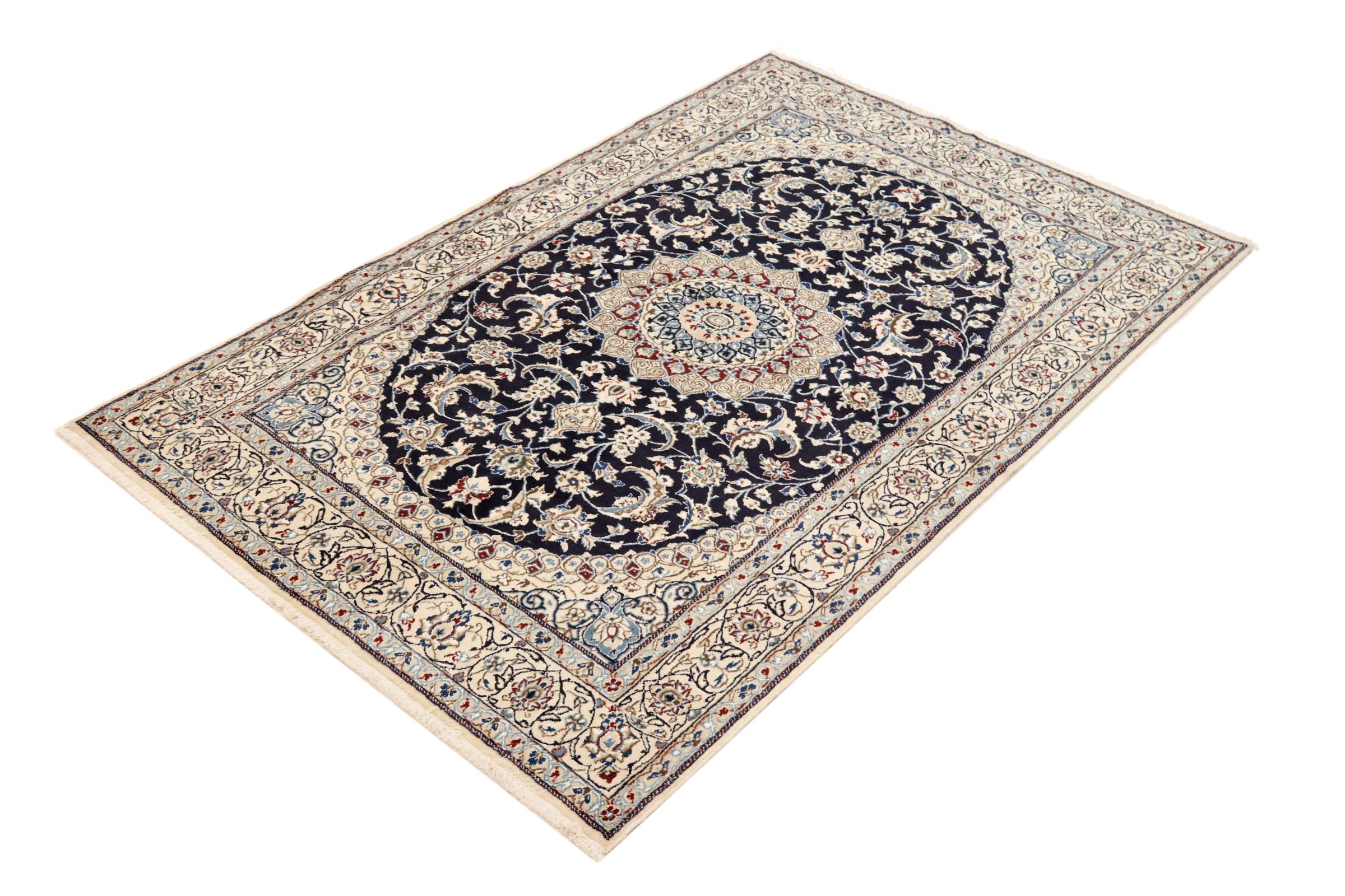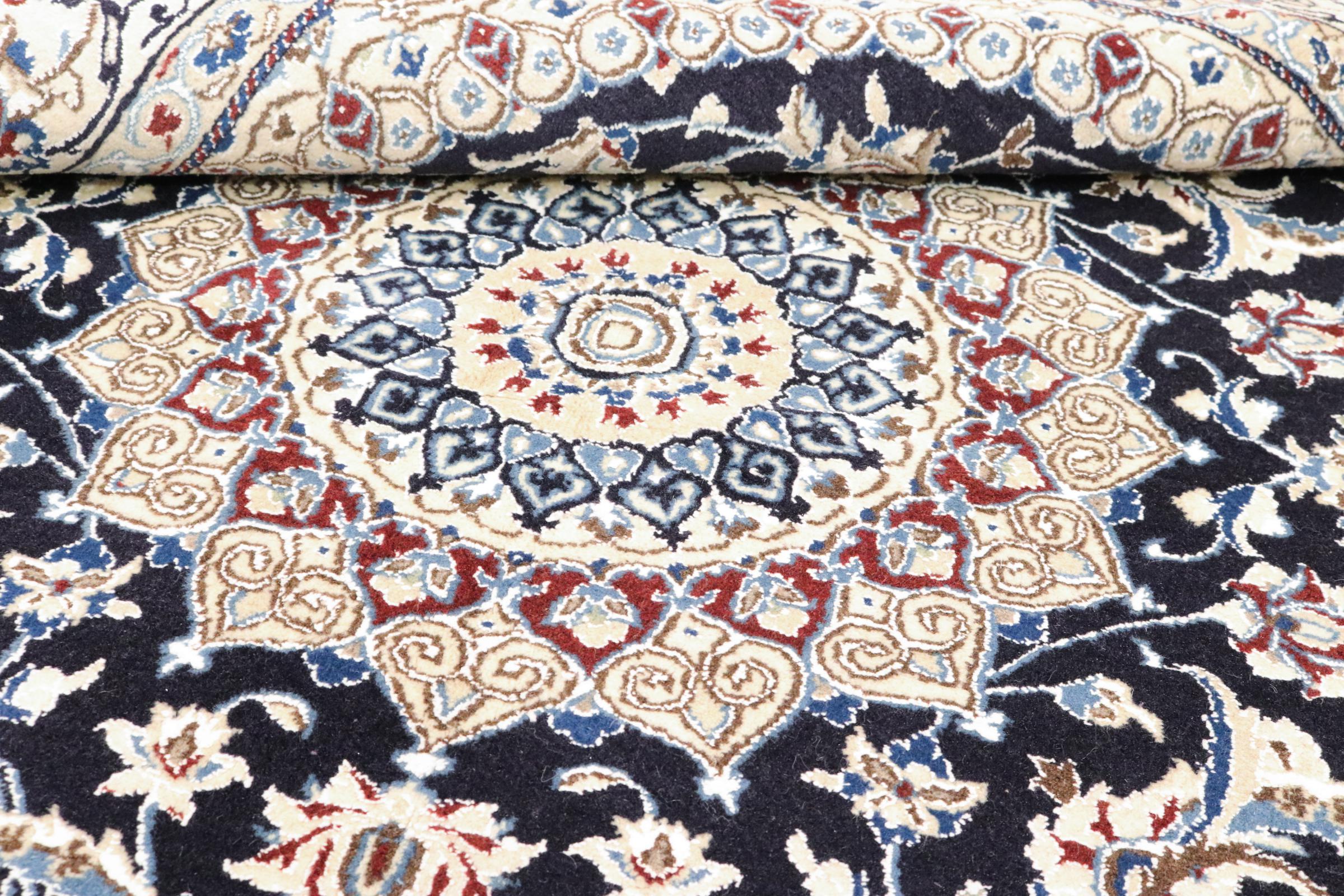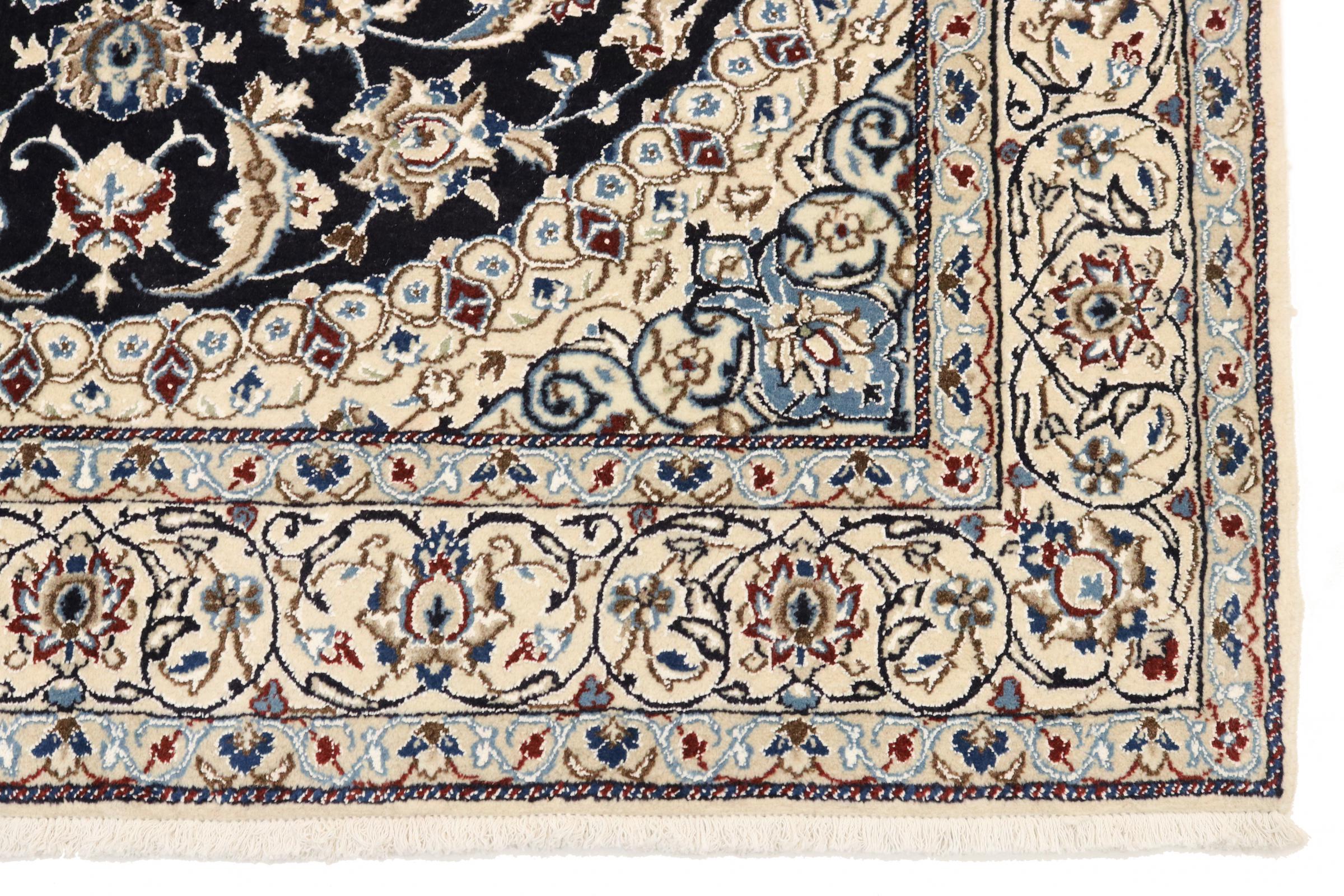 Dette Nain-tæppe er klassificeret 9La. Den fremragende kvalitet, det smukke orientalske design med sine buede mønstre glæder enhver køber. Dette persiske tæppe blev håndknyttet af højkvalitets uld og natursilke i byen Nain, som ligger i den vestlige udkant af Dasht-e-Kavir-ørkenen. 9La Nain er væsentligt finere end en 12La og viser allerede smukke detaljer.