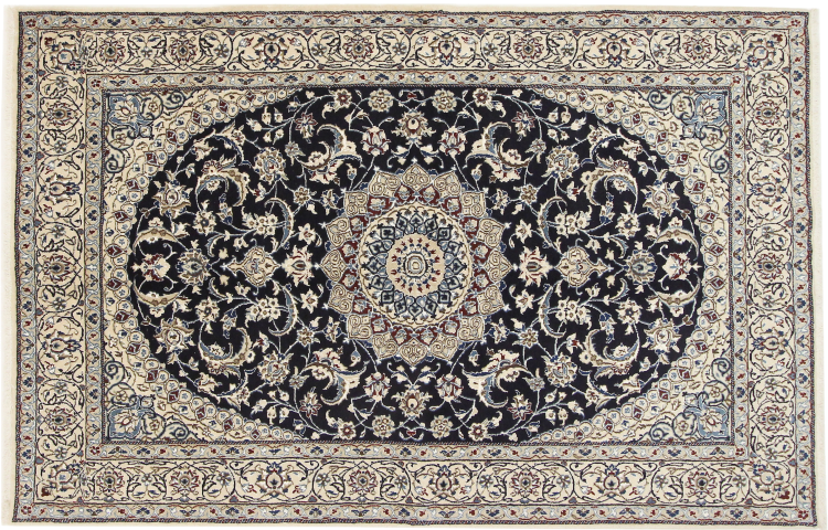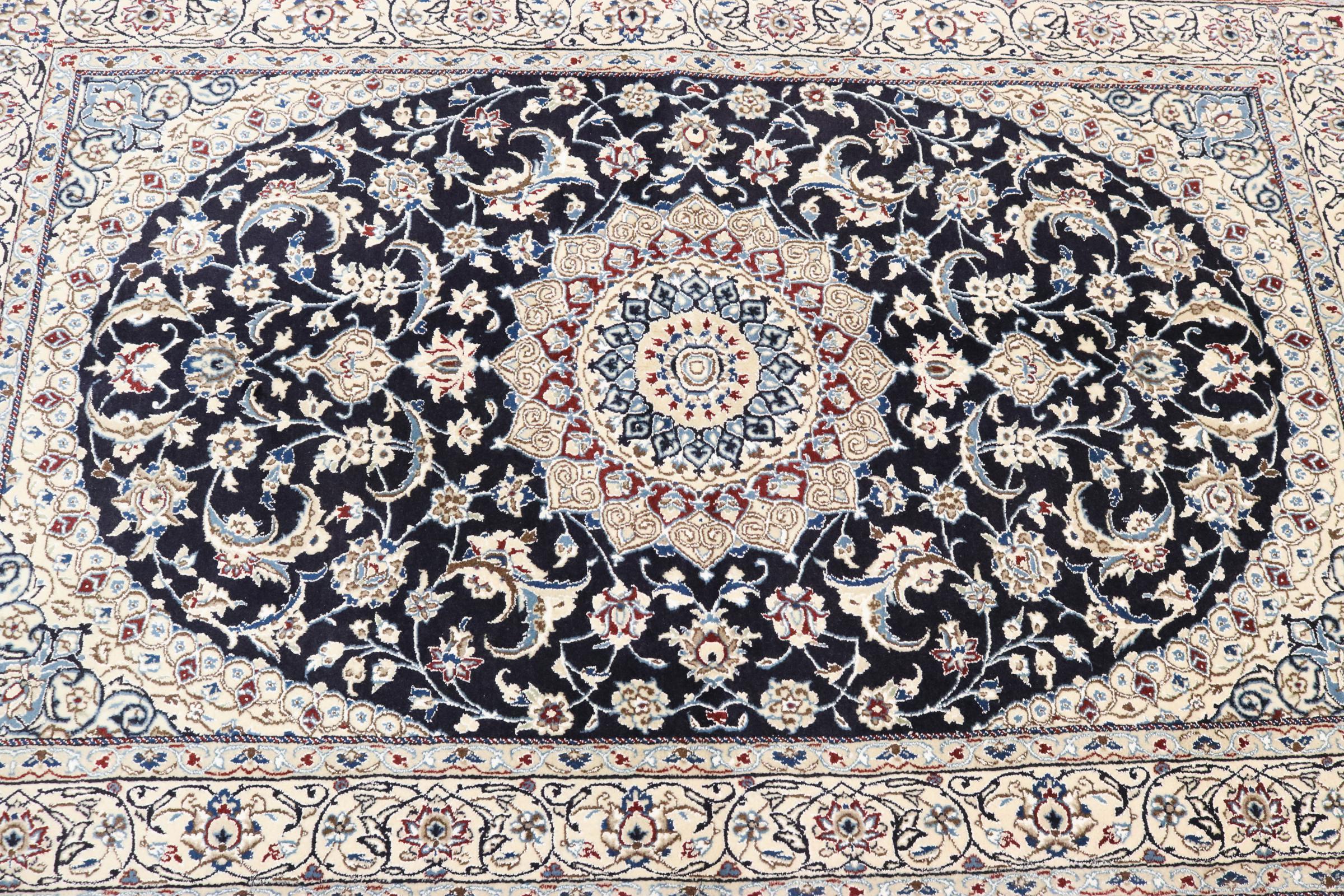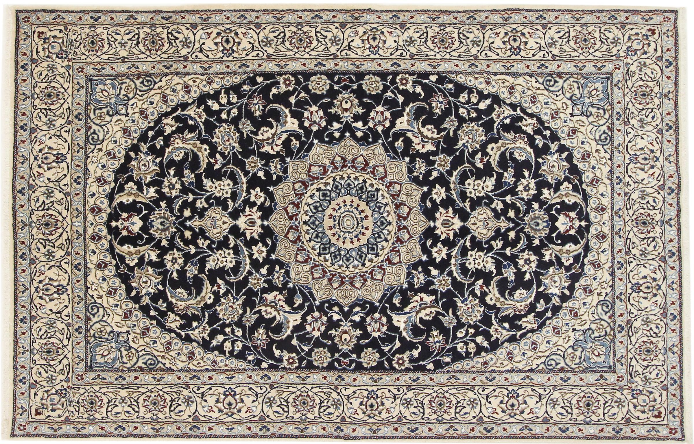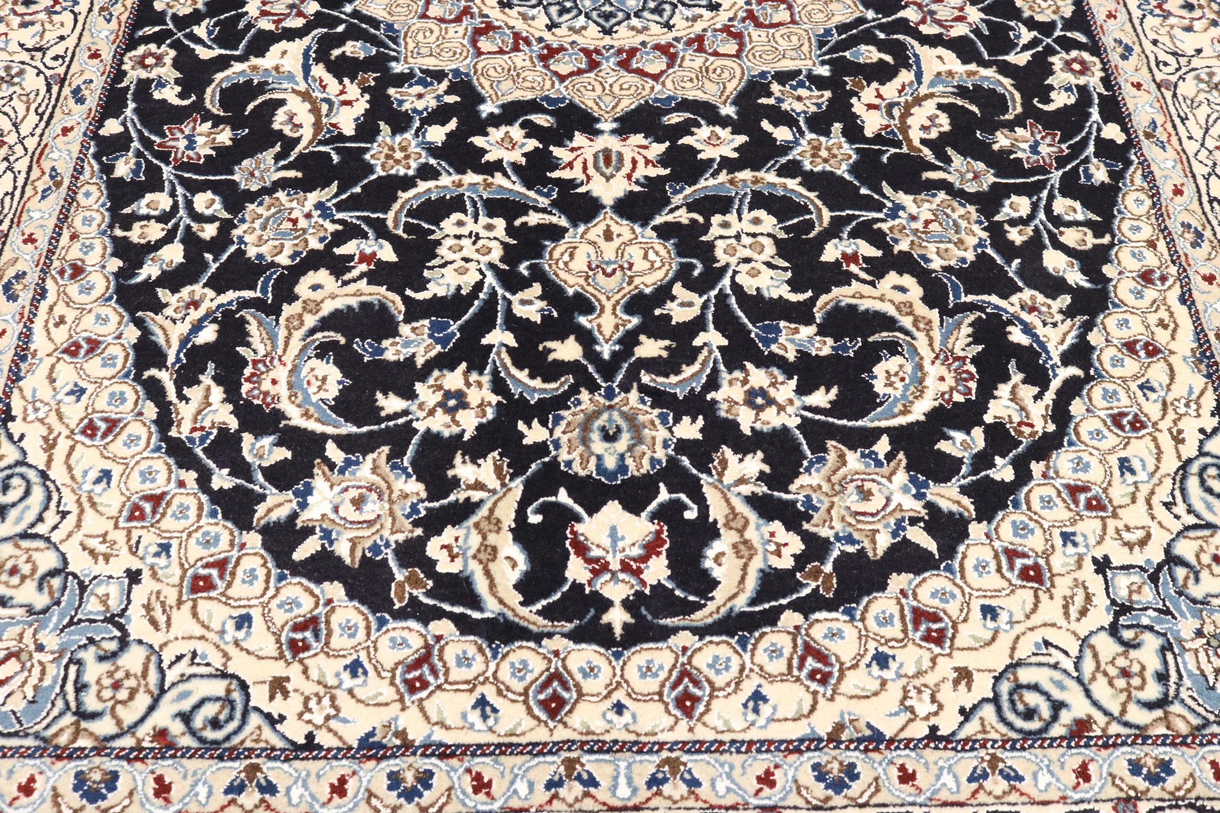 Dette Nain-tæppe er klassificeret 9La. Den fremragende kvalitet, det smukke orientalske design med sine buede mønstre glæder enhver køber. Dette persiske tæppe blev håndknyttet af højkvalitets uld og natursilke i byen Nain, som ligger i den vestlige udkant af Dasht-e-Kavir-ørkenen. 9La Nain er væsentligt finere end en 12La og viser allerede smukke detaljer.