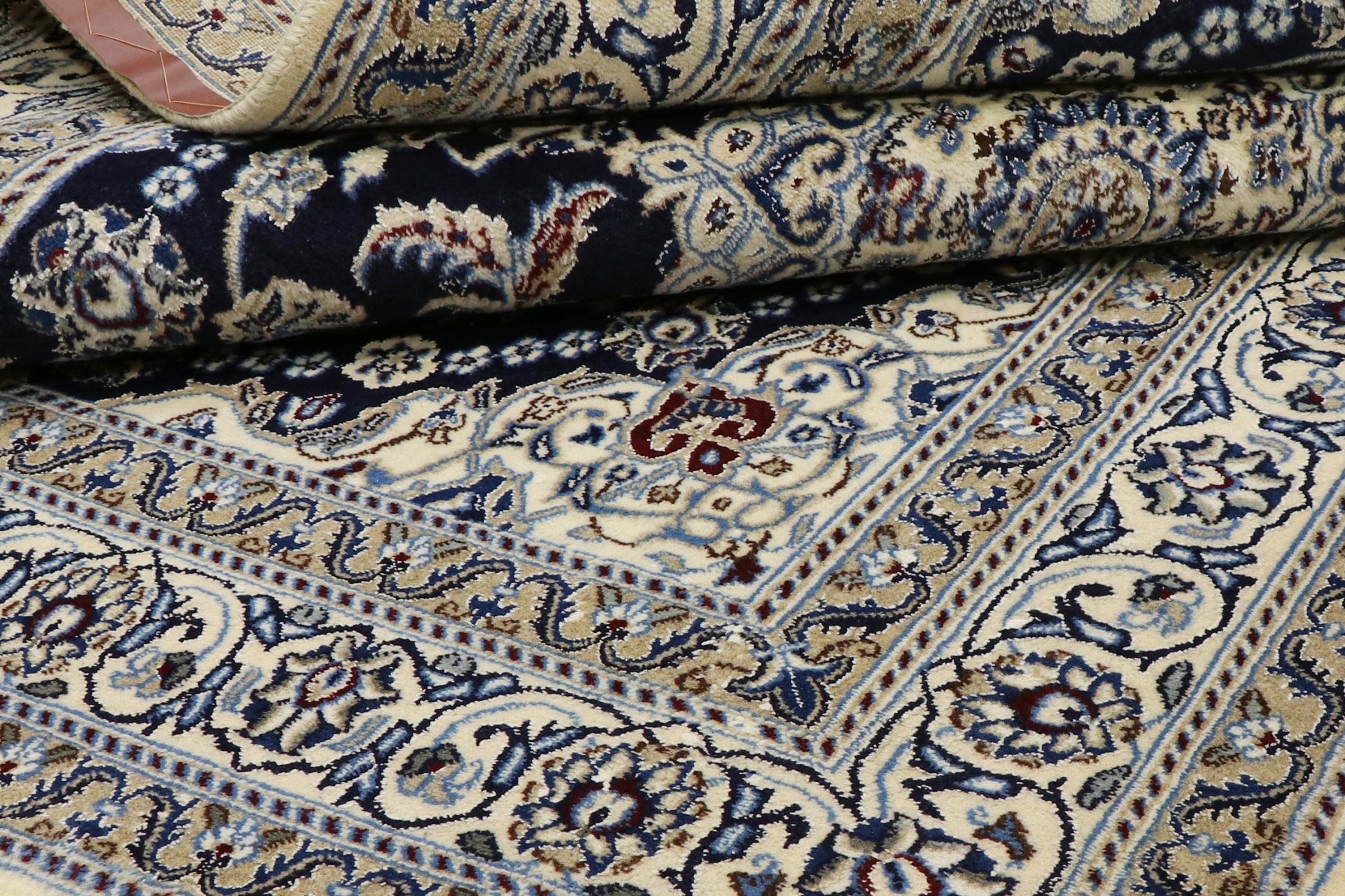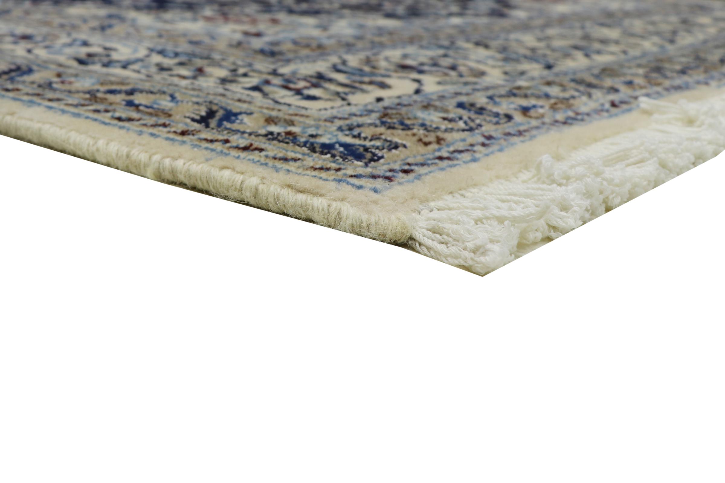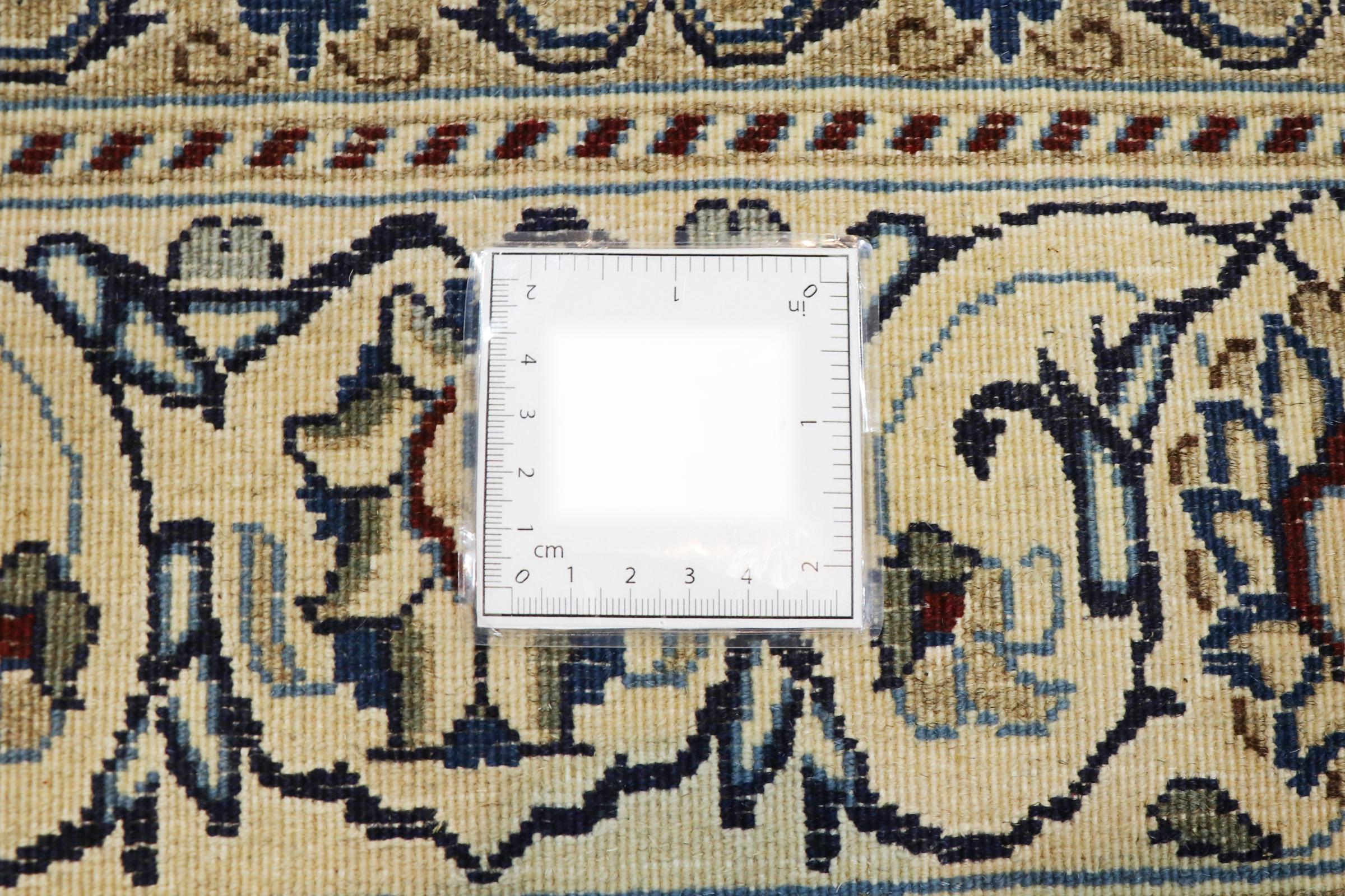 Dette Nain tæppe er vurderet til 12La. Det ser elegant og ædelt ud i sit typiske Nain-farveskema. Dette persiske tæppe blev håndknyttet af højkvalitets uld og natursilke i byen Nain, som ligger i den vestlige udkant af Dasht-e-Kavir-ørkenen. Med 12La er den ikke så fint og detaljeret udsmykket som en Nain 9La eller 6La.