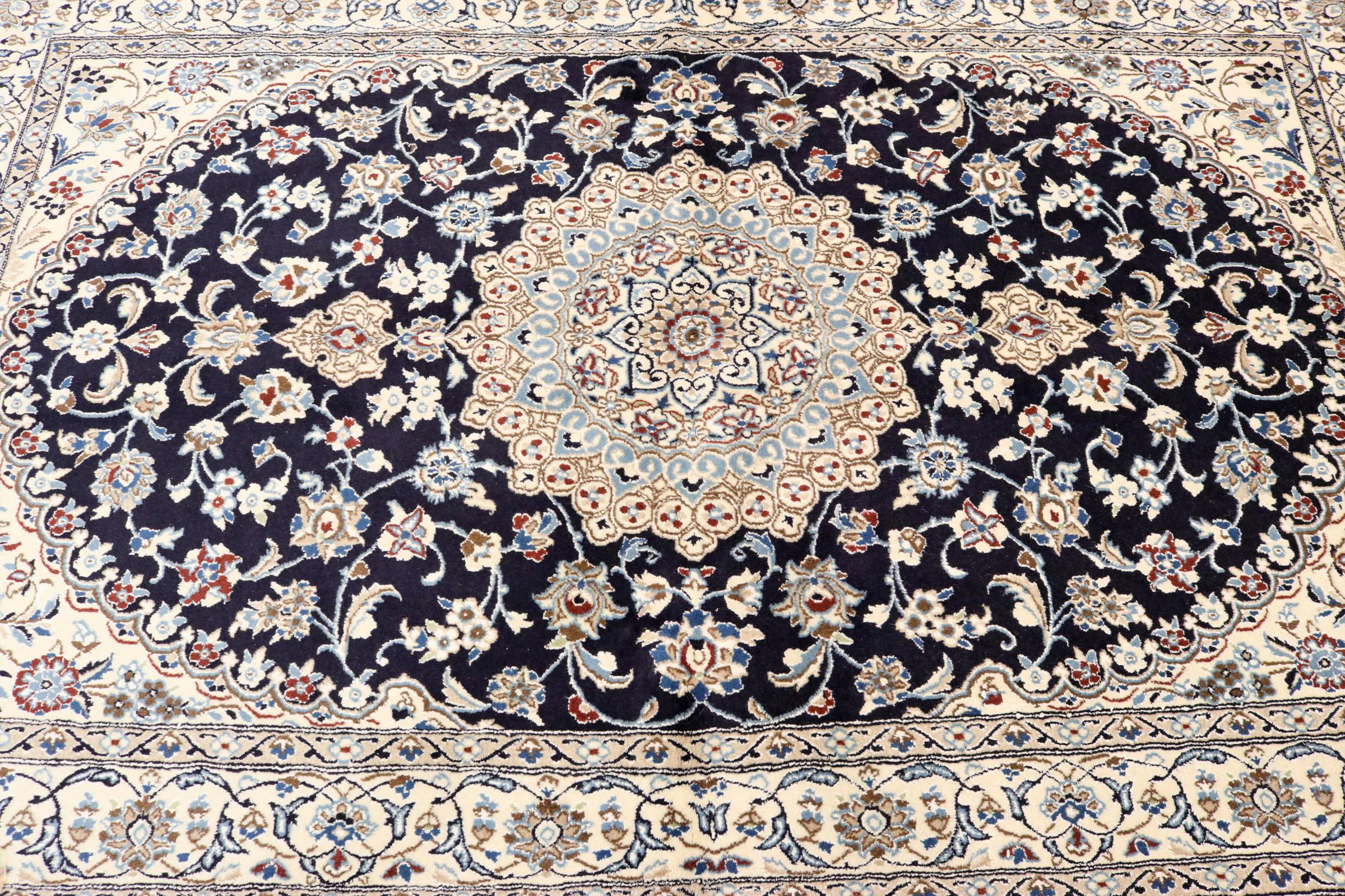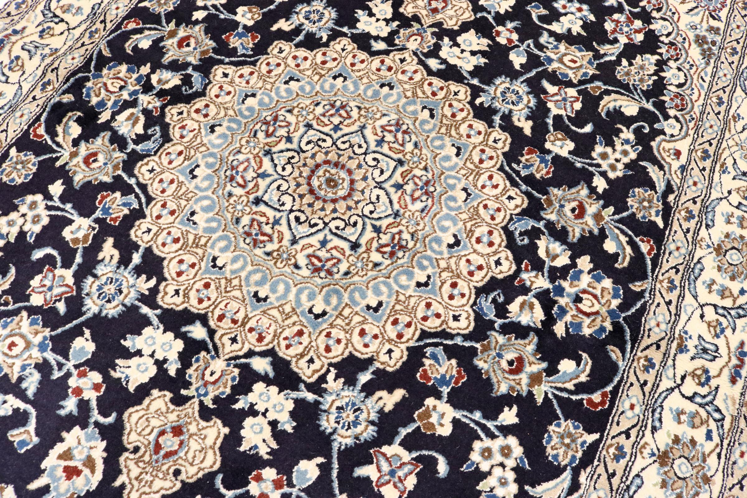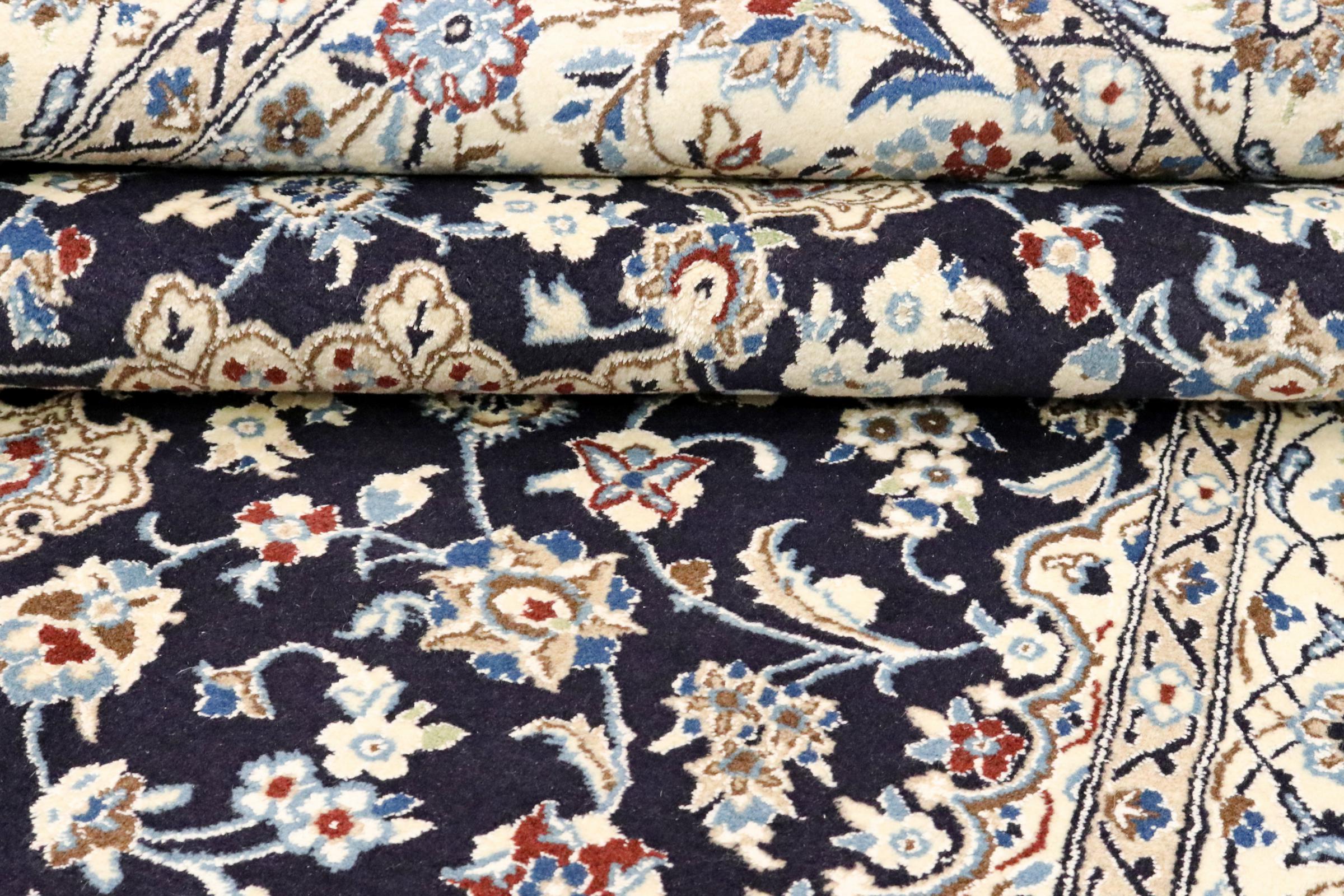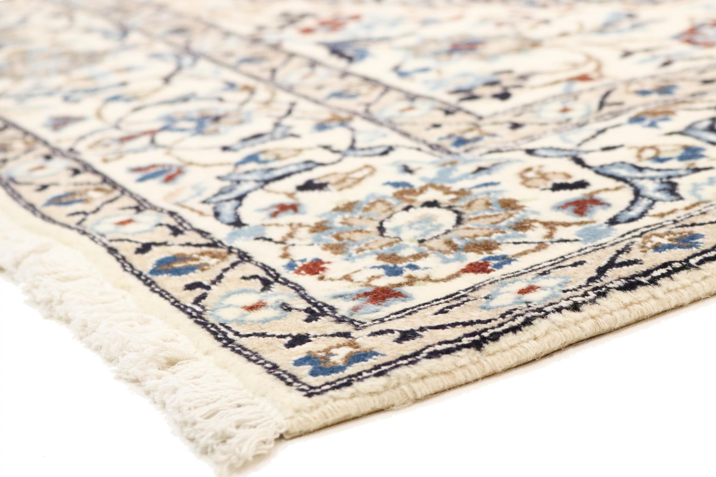 Dette Nain-tæppe er klassificeret 9La. Den fremragende kvalitet, det smukke orientalske design med sine buede mønstre glæder enhver køber. Dette persiske tæppe blev håndknyttet af højkvalitets uld og natursilke i byen Nain, som ligger i den vestlige udkant af Dasht-e-Kavir-ørkenen. 9La Nain er væsentligt finere end en 12La og viser allerede smukke detaljer.