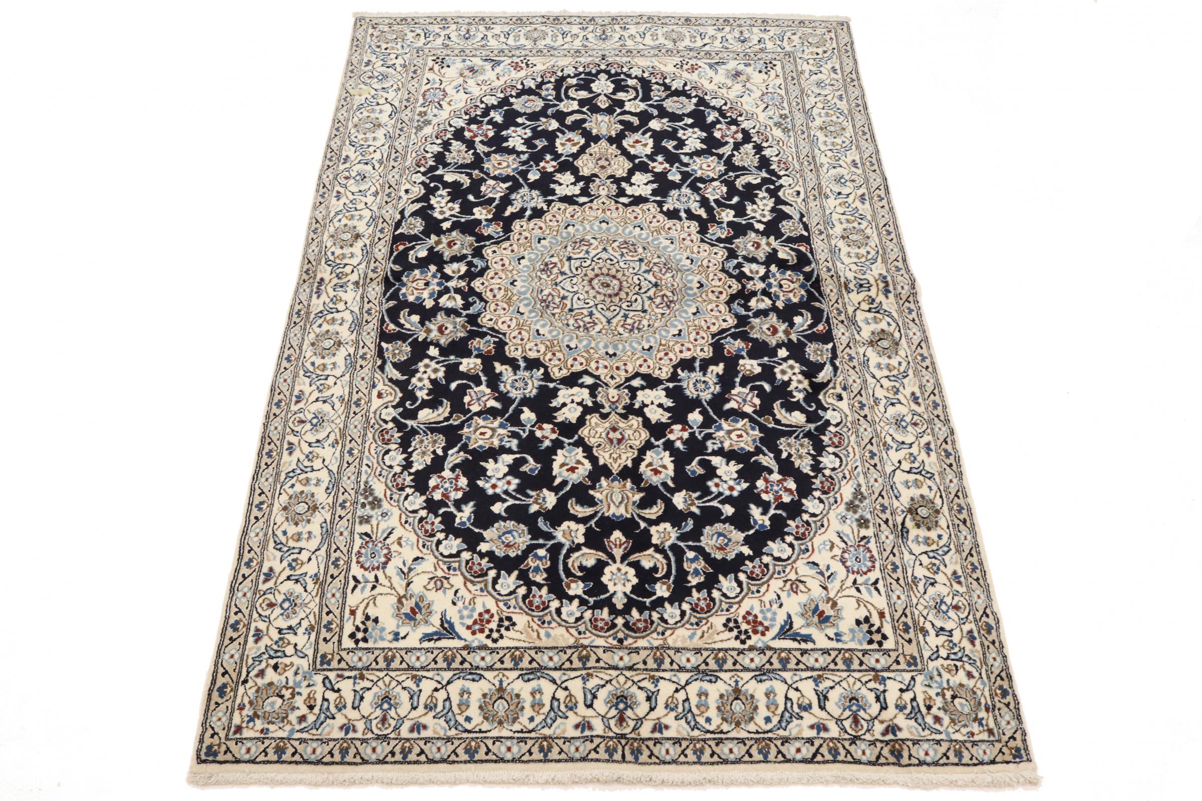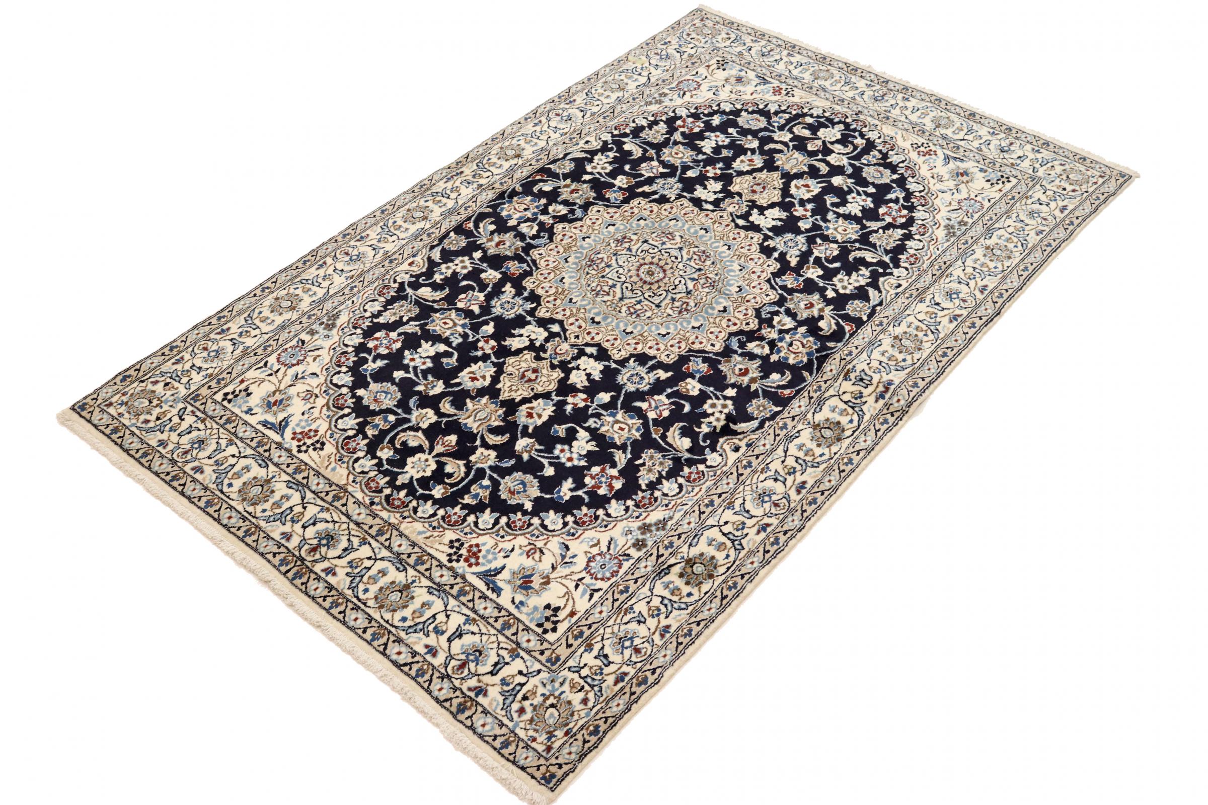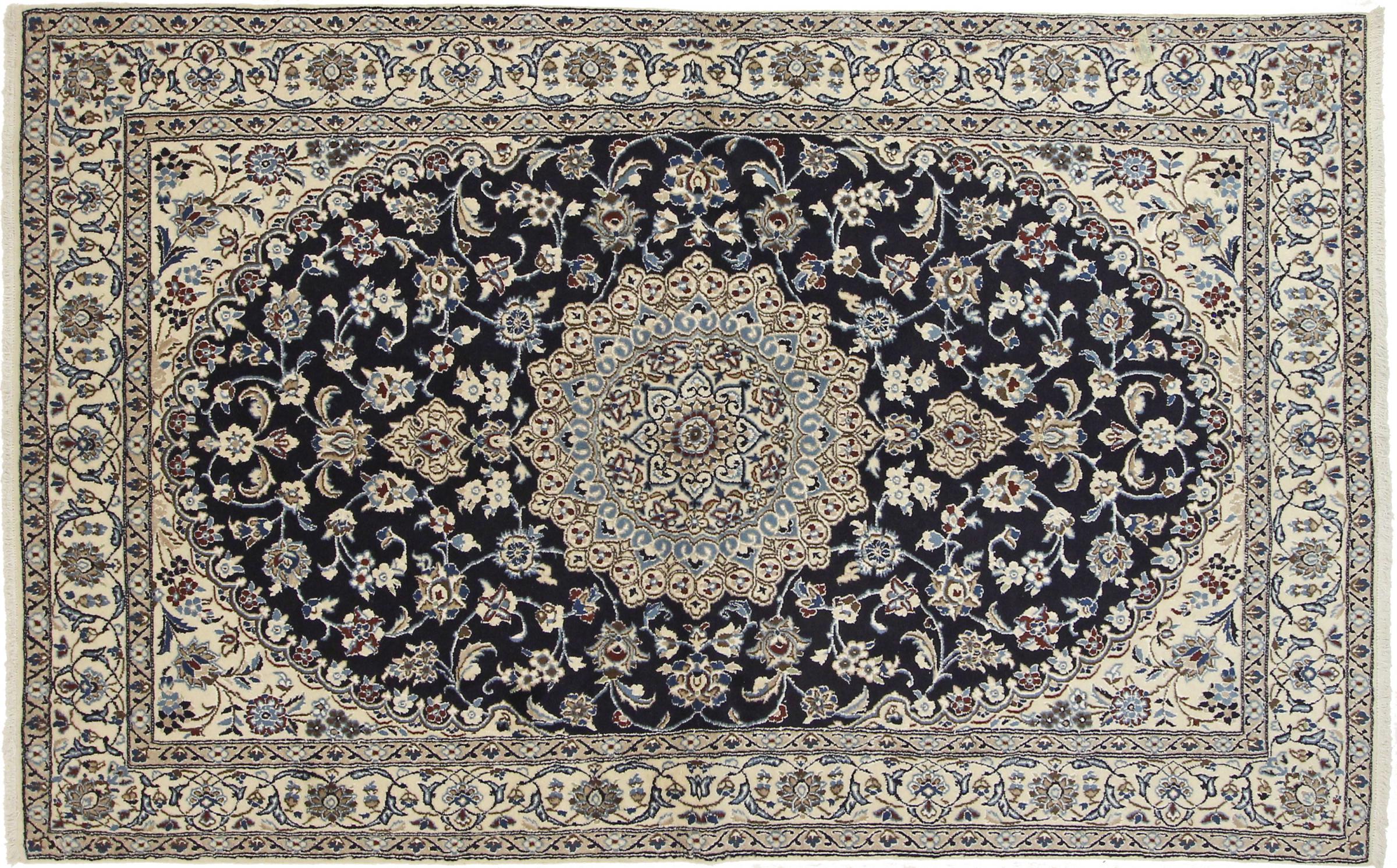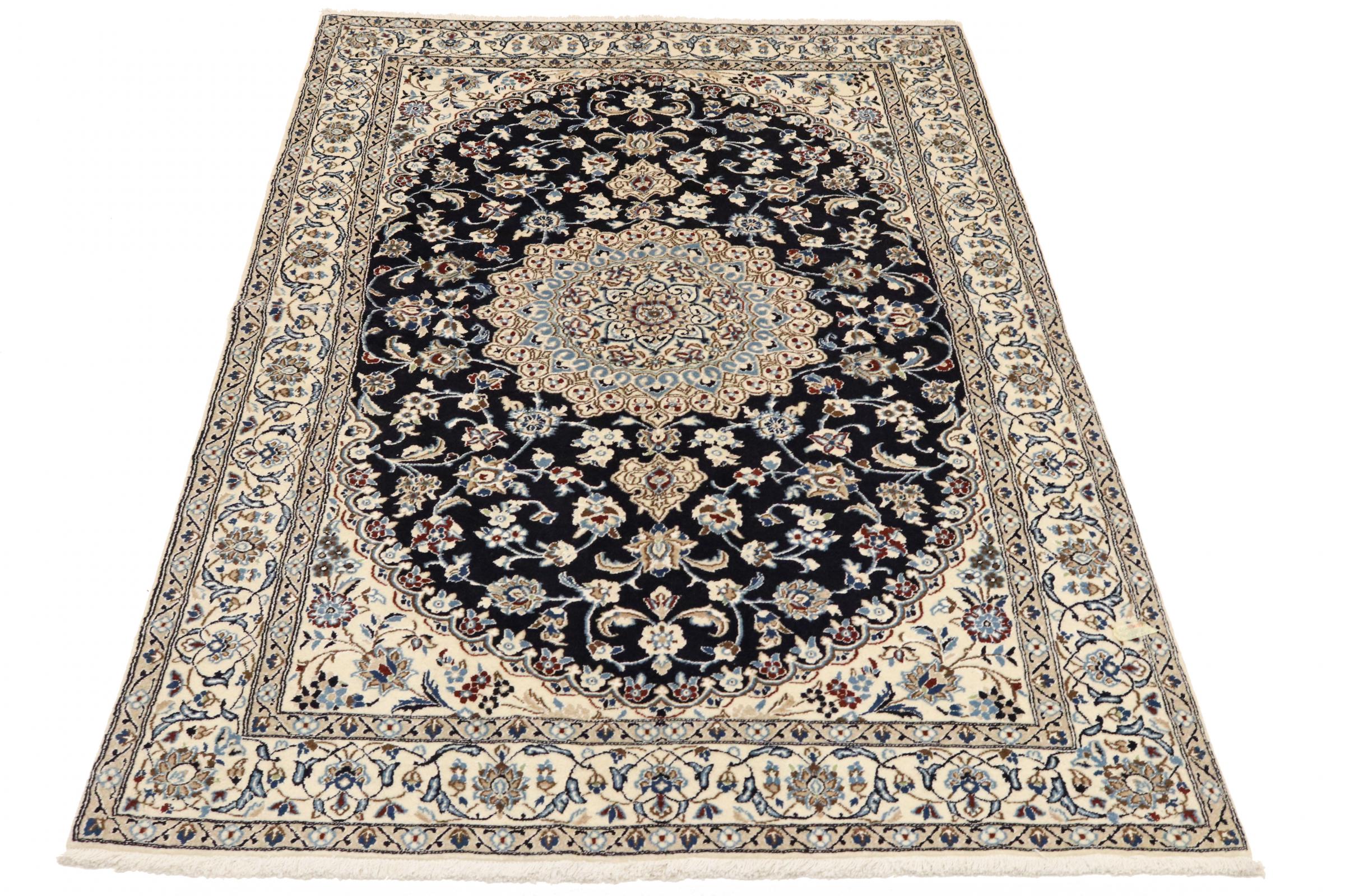 Dette Nain-tæppe er klassificeret 9La. Den fremragende kvalitet, det smukke orientalske design med sine buede mønstre glæder enhver køber. Dette persiske tæppe blev håndknyttet af højkvalitets uld og natursilke i byen Nain, som ligger i den vestlige udkant af Dasht-e-Kavir-ørkenen. 9La Nain er væsentligt finere end en 12La og viser allerede smukke detaljer.