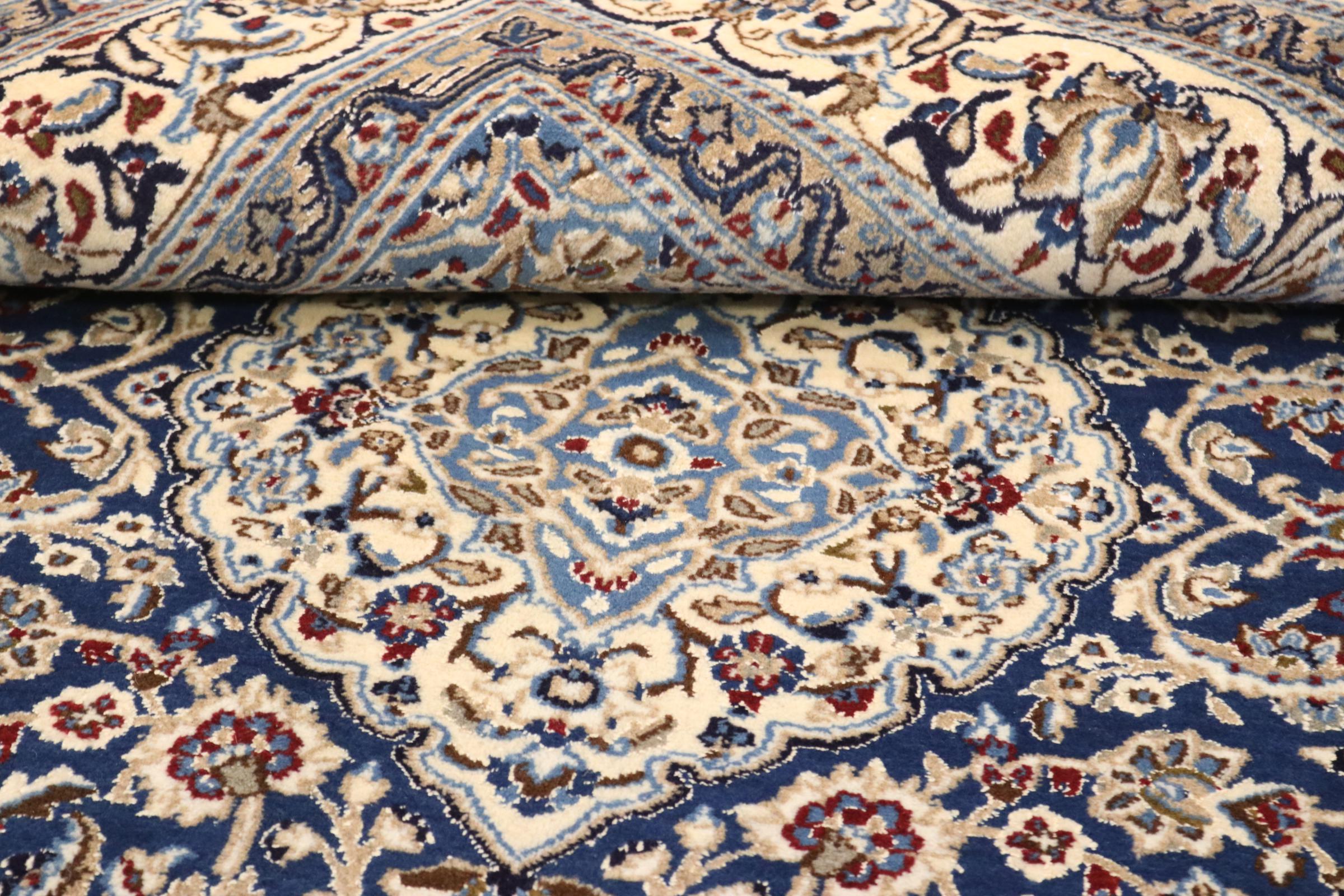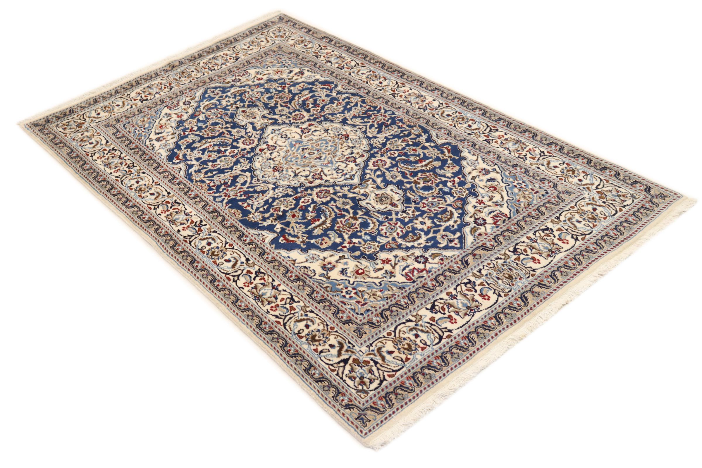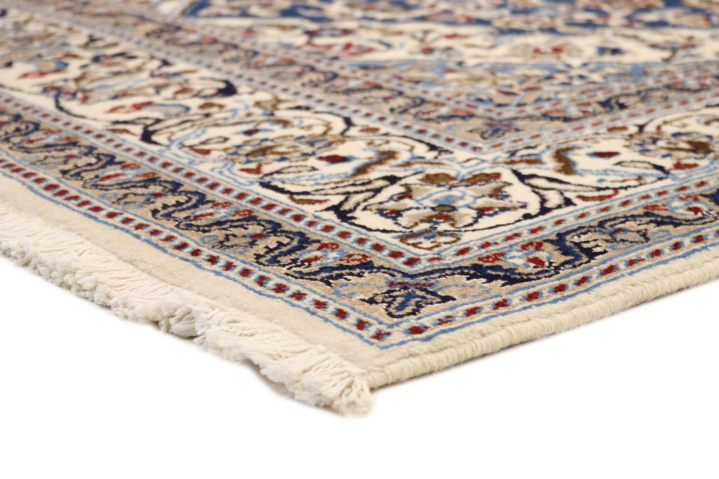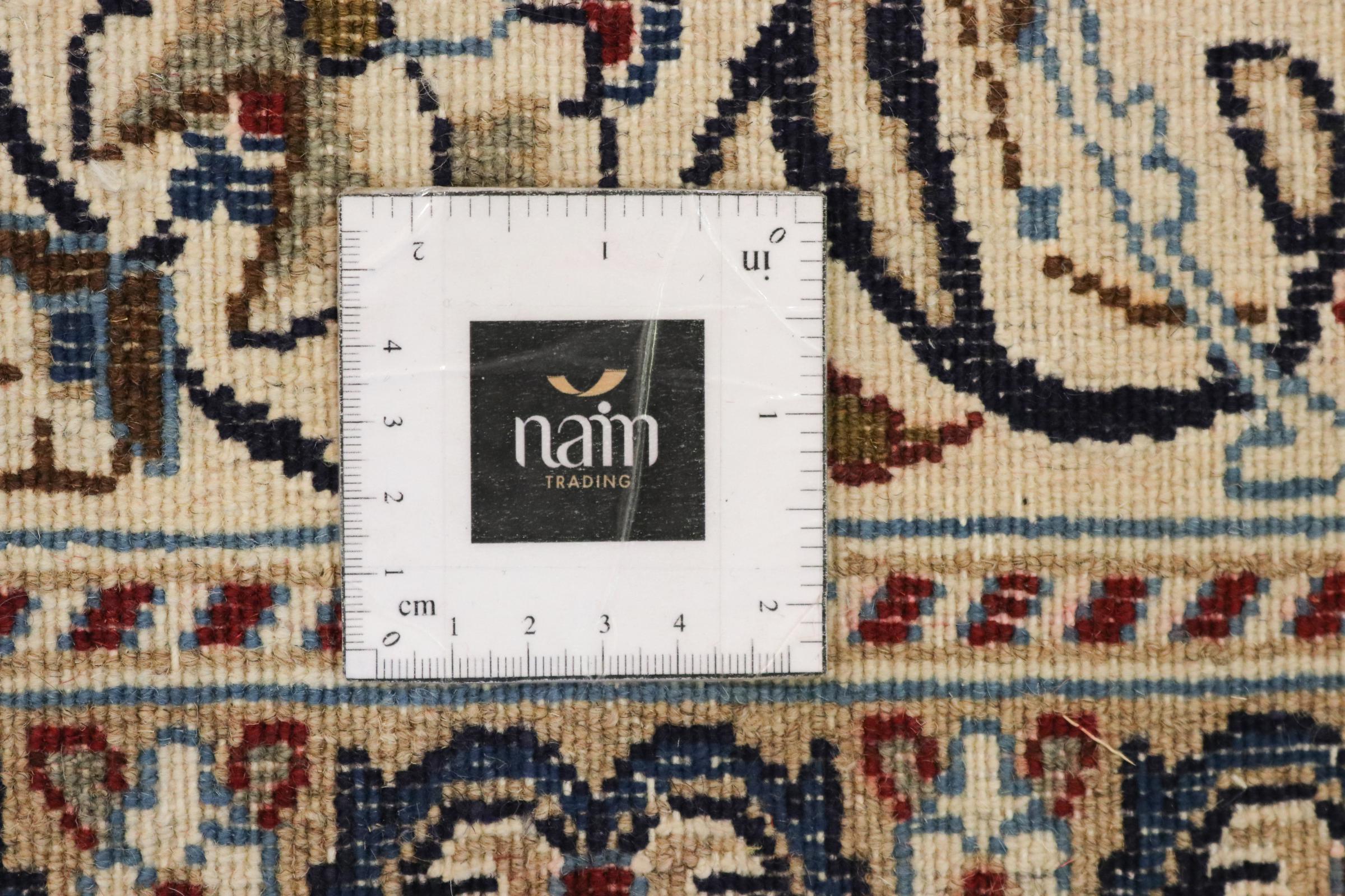 Dette Nain tæppe er vurderet til 12La. Det ser elegant og ædelt ud i sit typiske Nain-farveskema. Dette persiske tæppe blev håndknyttet af højkvalitets uld og natursilke i byen Nain, som ligger i den vestlige udkant af Dasht-e-Kavir-ørkenen. Med 12La er den ikke så fint og detaljeret udsmykket som en Nain 9La eller 6La.