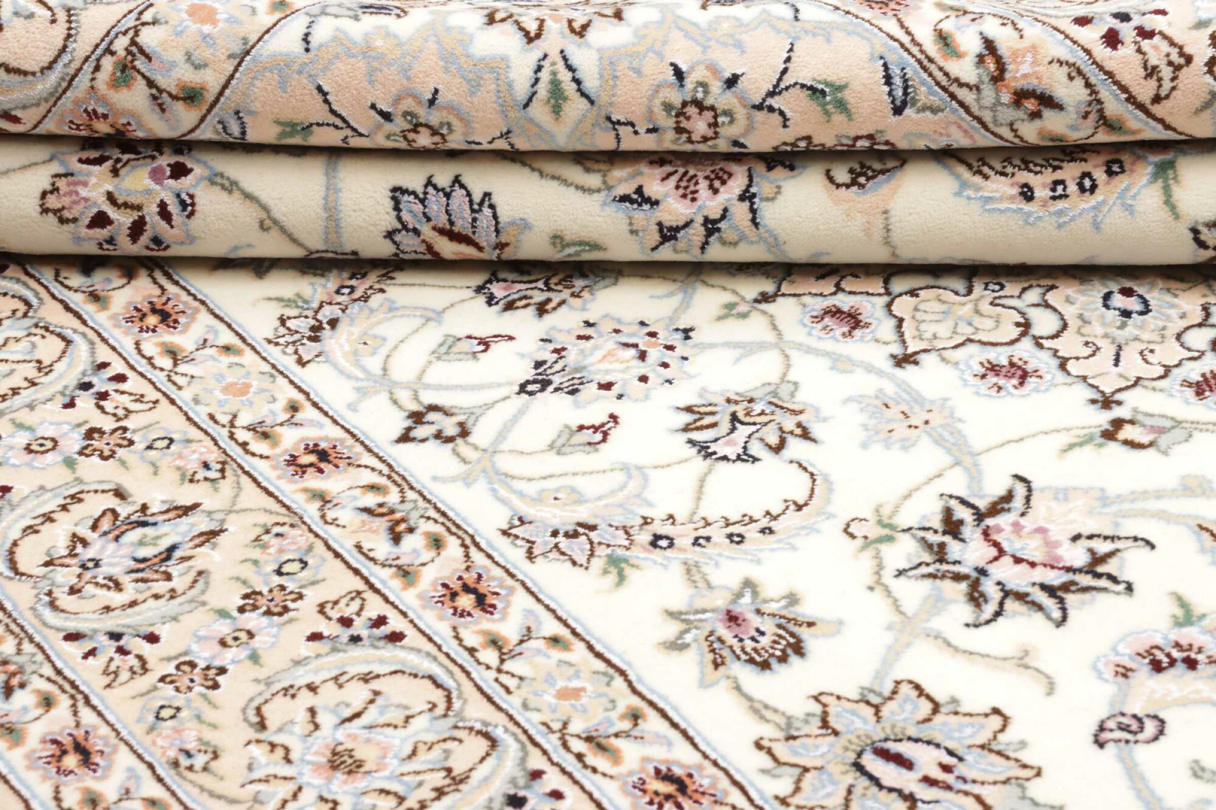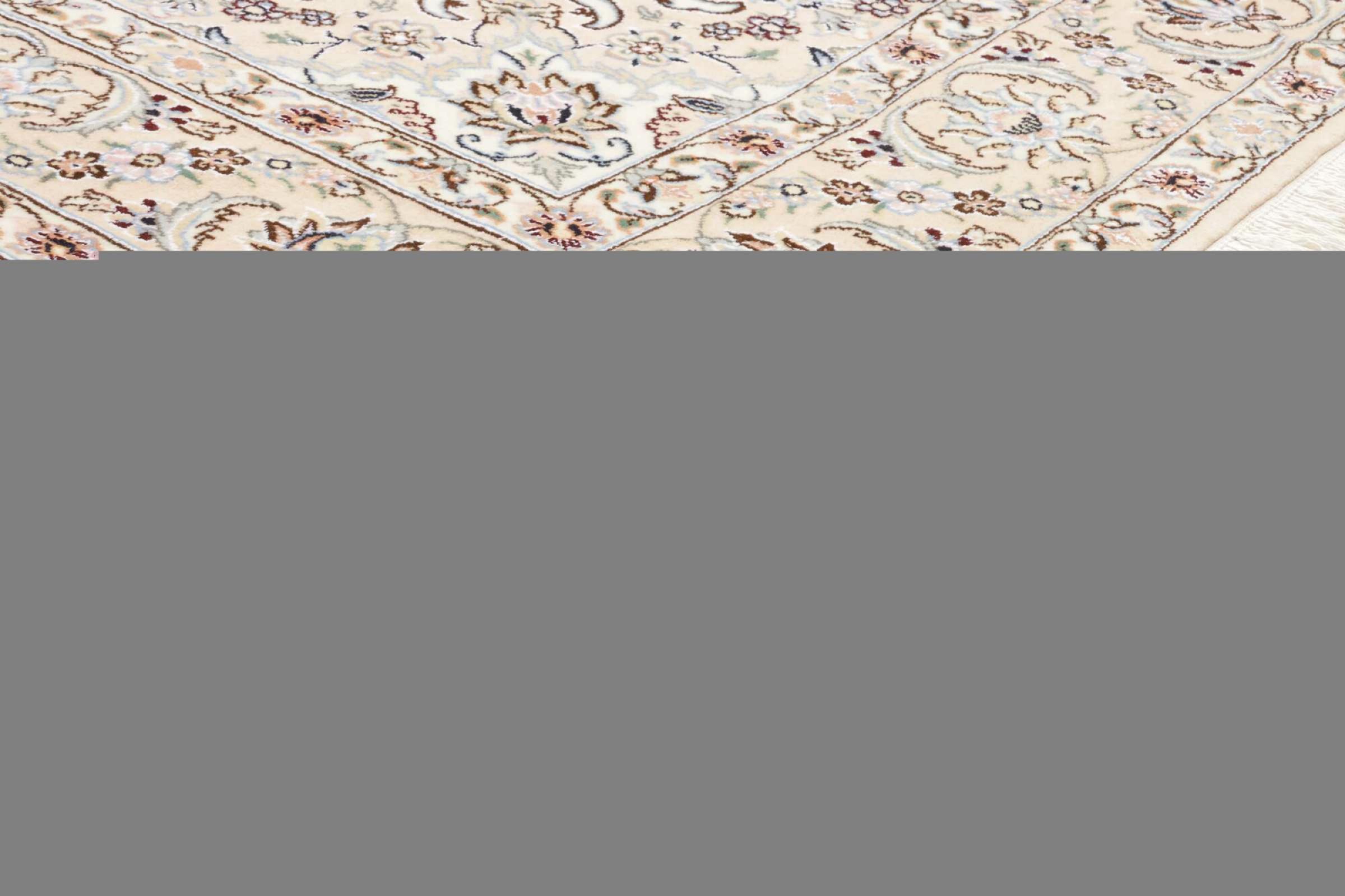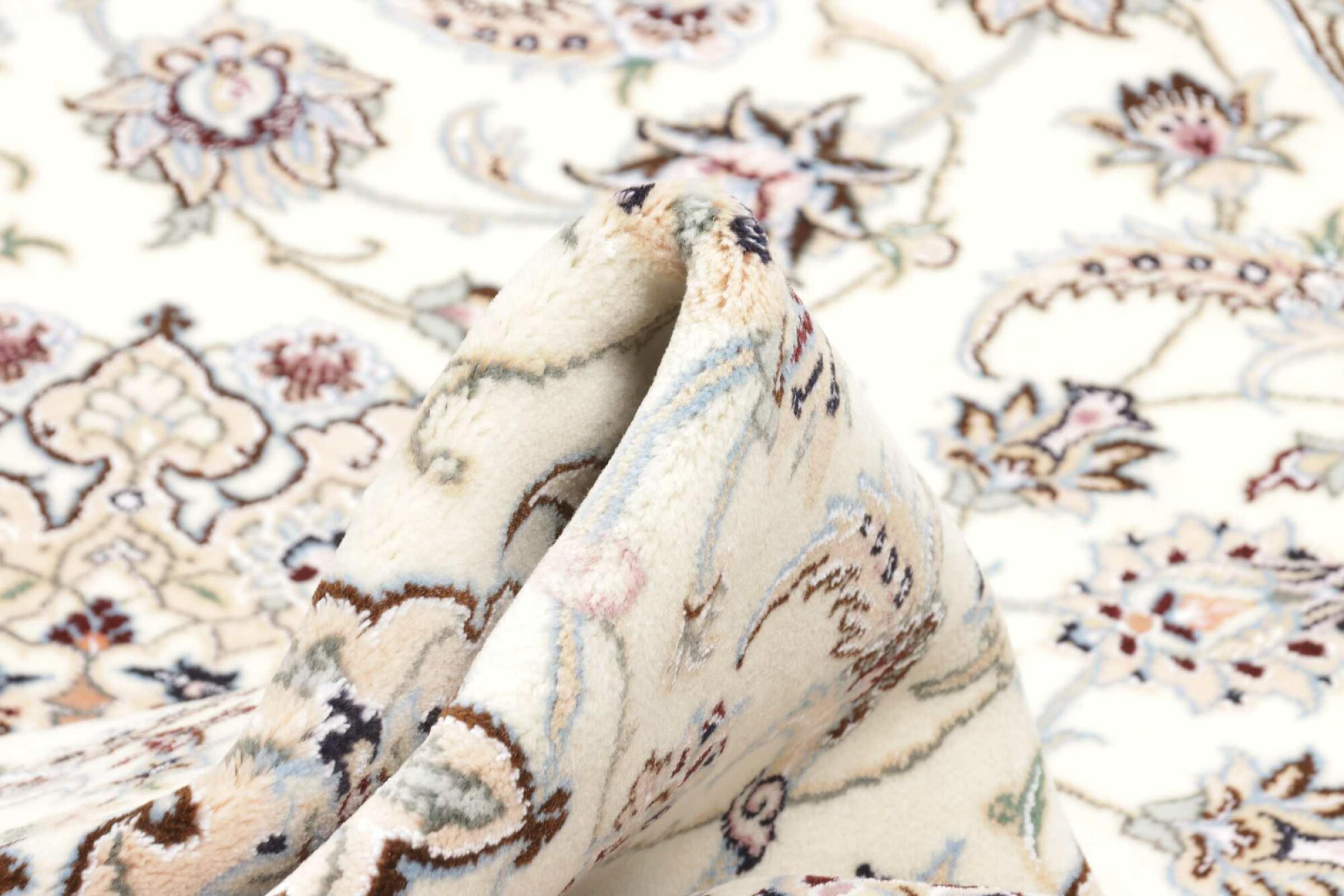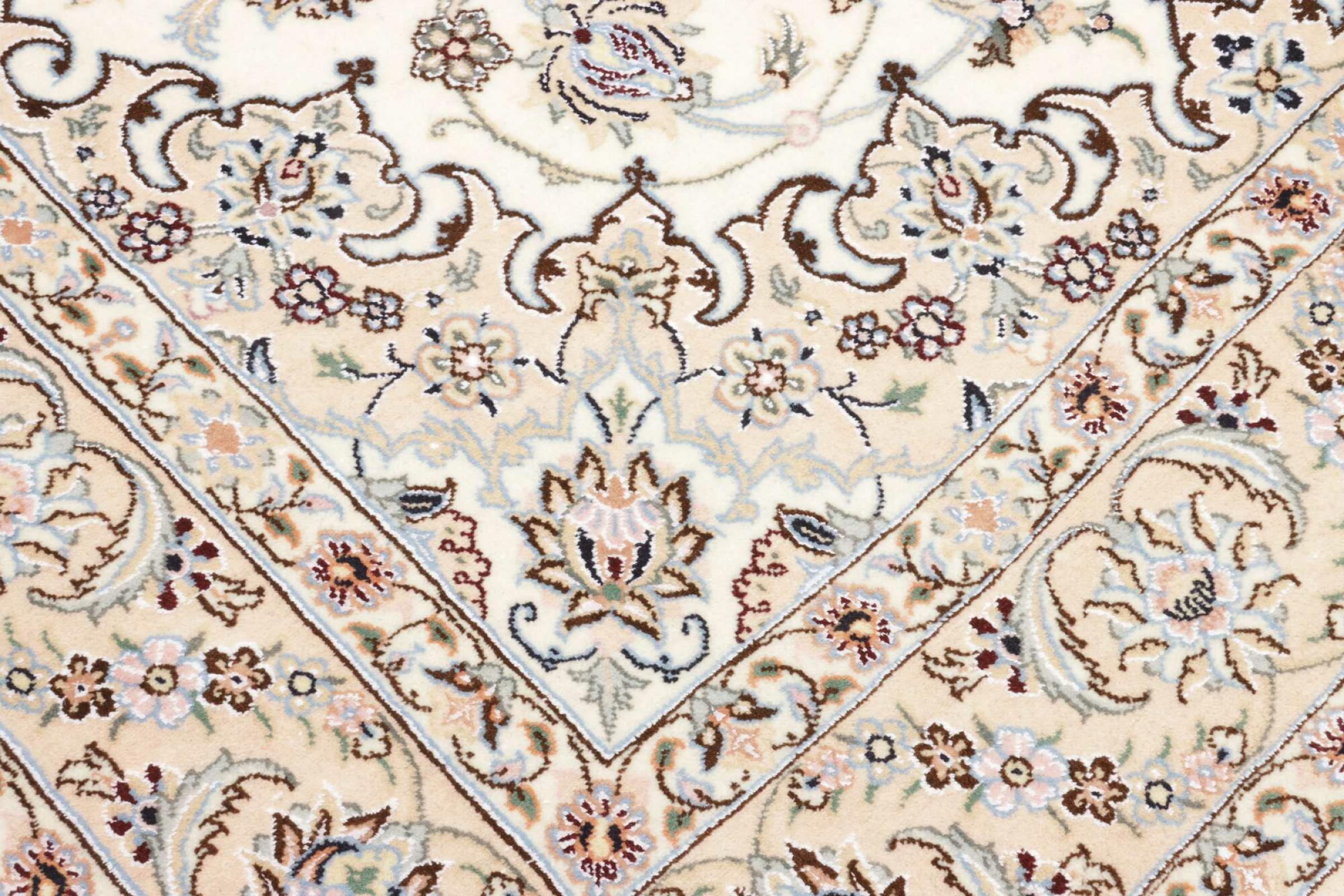Dette Nain-tæppe er klassificeret 9La. Den fremragende kvalitet, det smukke orientalske design med sine buede mønstre glæder enhver køber. Dette persiske tæppe blev håndknyttet af højkvalitets uld og natursilke i byen Nain, som ligger i den vestlige udkant af Dasht-e-Kavir-ørkenen. 9La Nain er væsentligt finere end en 12La og viser allerede smukke detaljer.